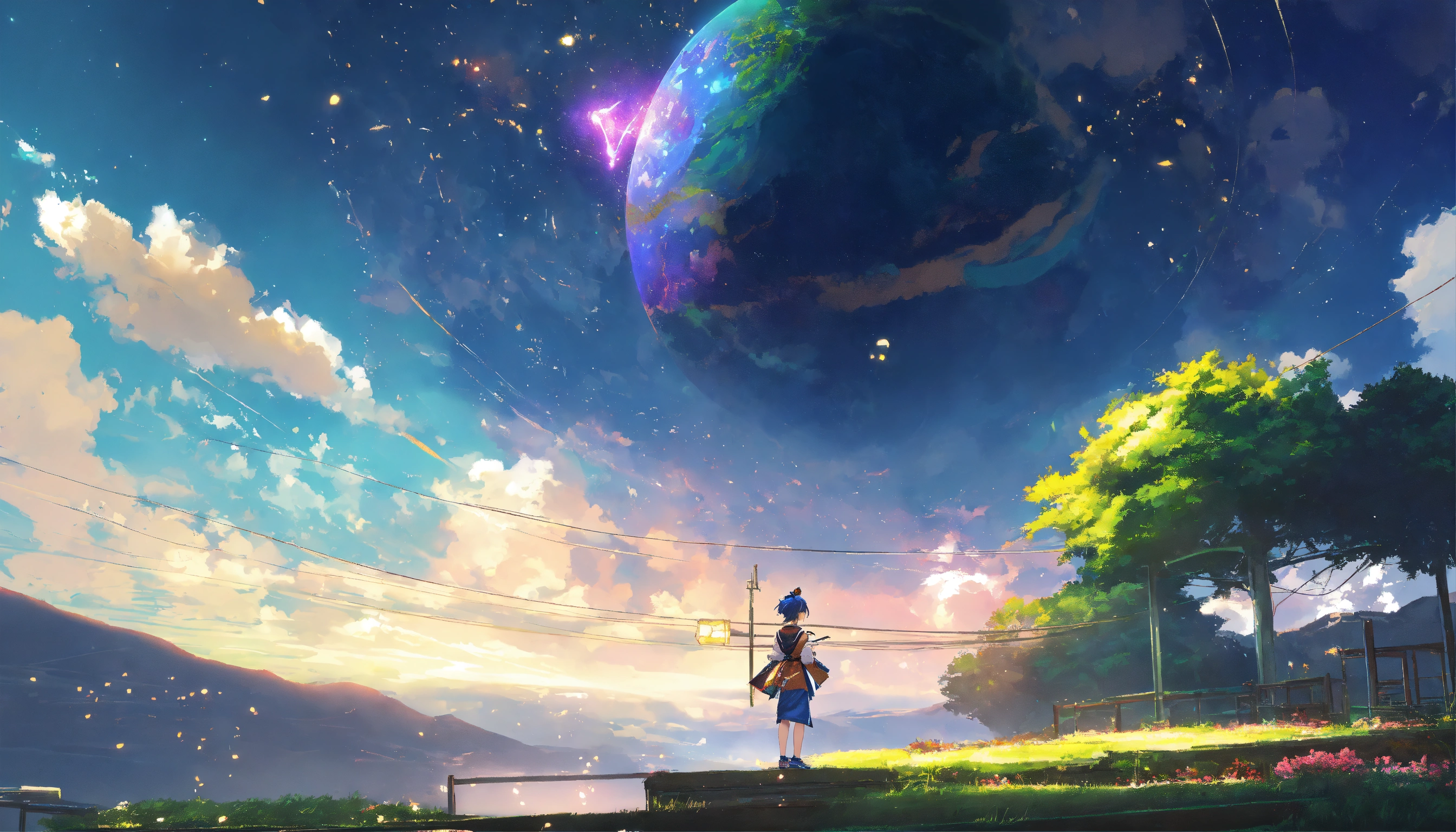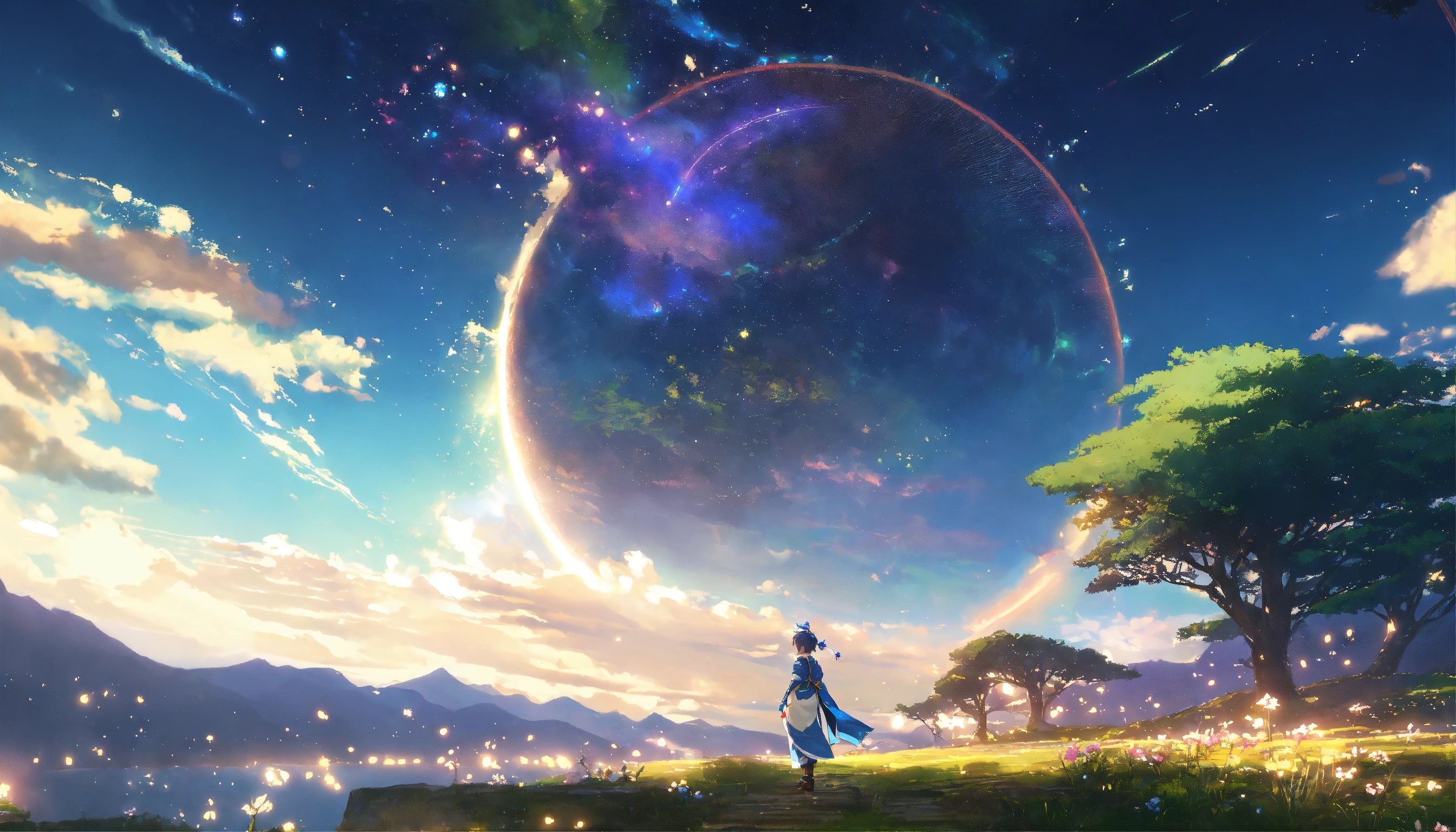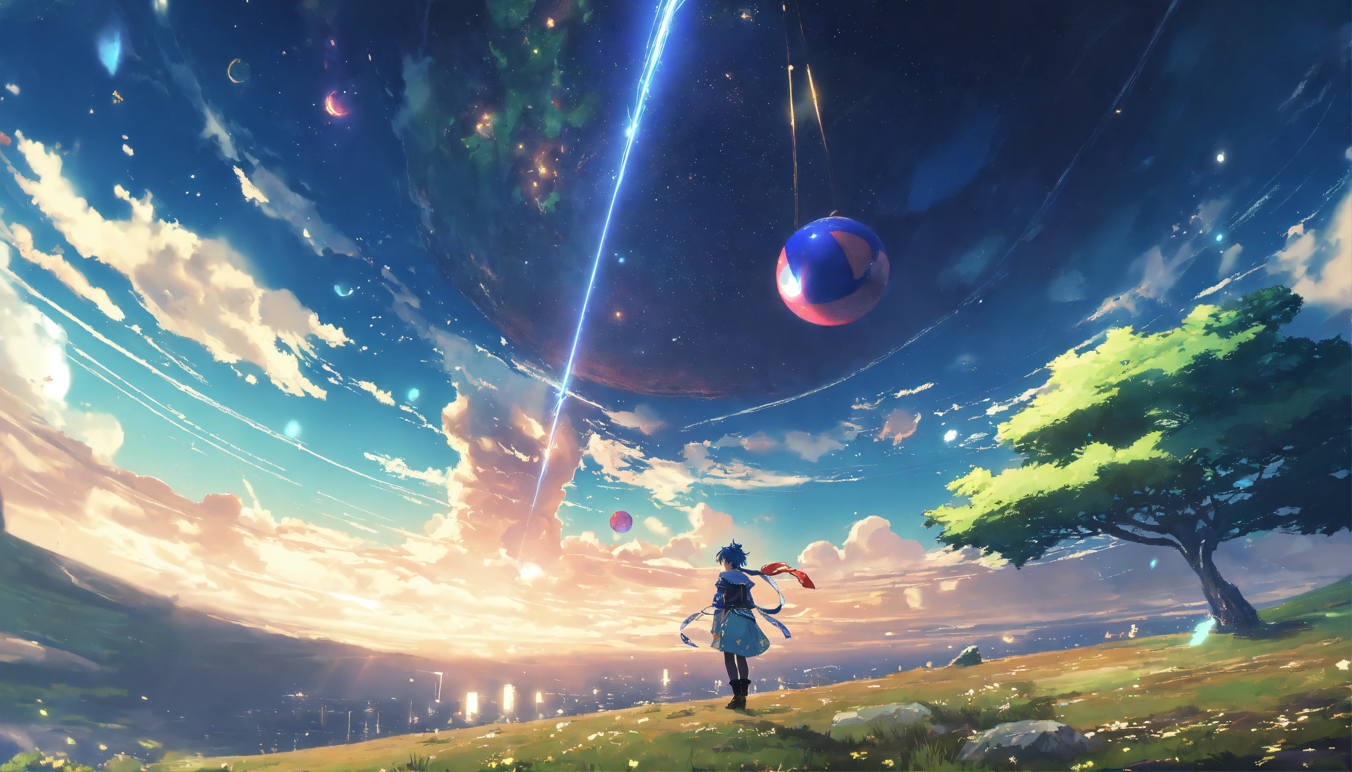 Generate an artwork featuring a lv120 jester character from flyff universe, beautifully crafted in the enchanting style of makoto shinkai. infuse the character with shinkai's trademark aesthetics, focusing on cosmic galaxies, soft, luminous lighting, and a serene, melancholic atmosphere. emulate shinkai's mastery of creating emotionally resonant scenes and backgrounds, elevating the flyff universe character's story and presence. the artwork should capture the character's grace and depth within shinkai's visual storytelling style, resulting in a captivating and emotionally rich piece.