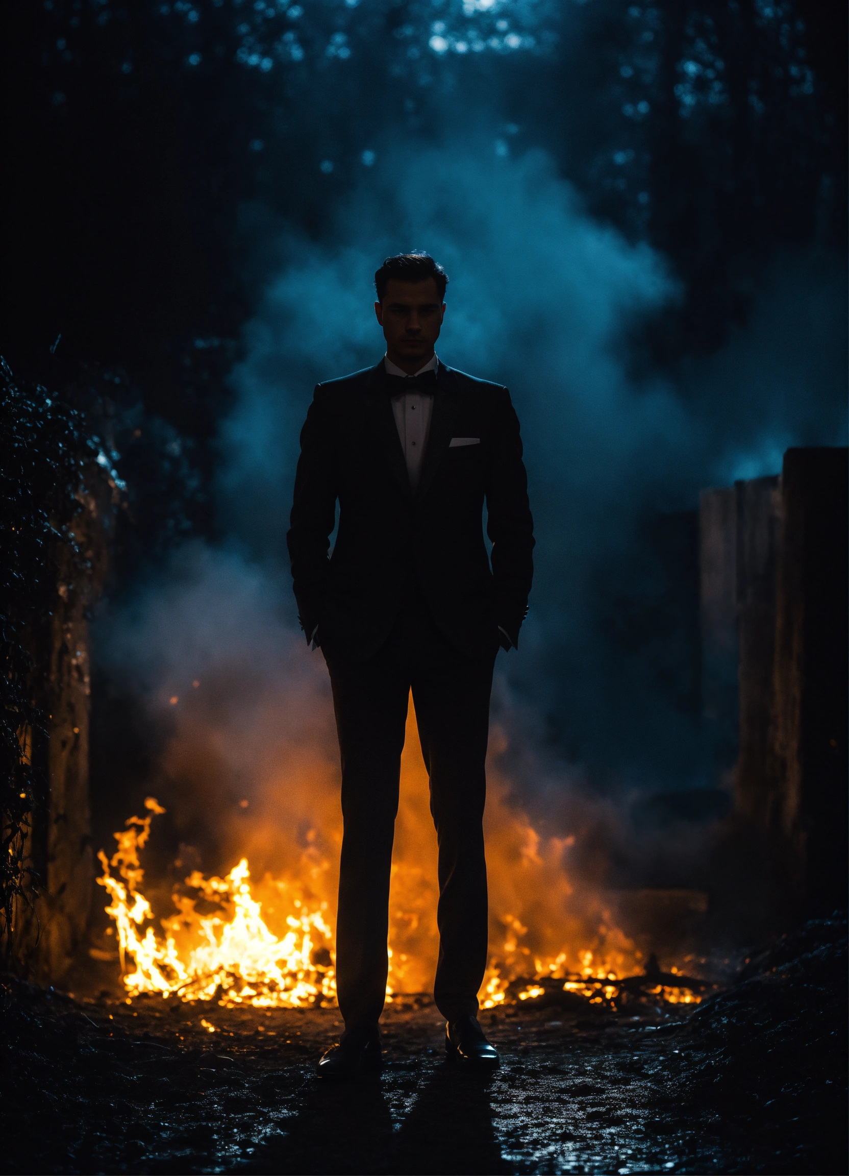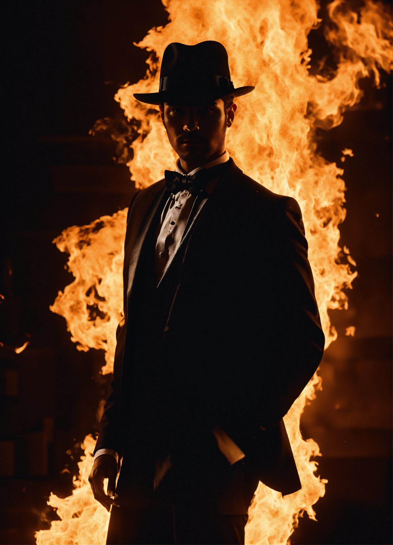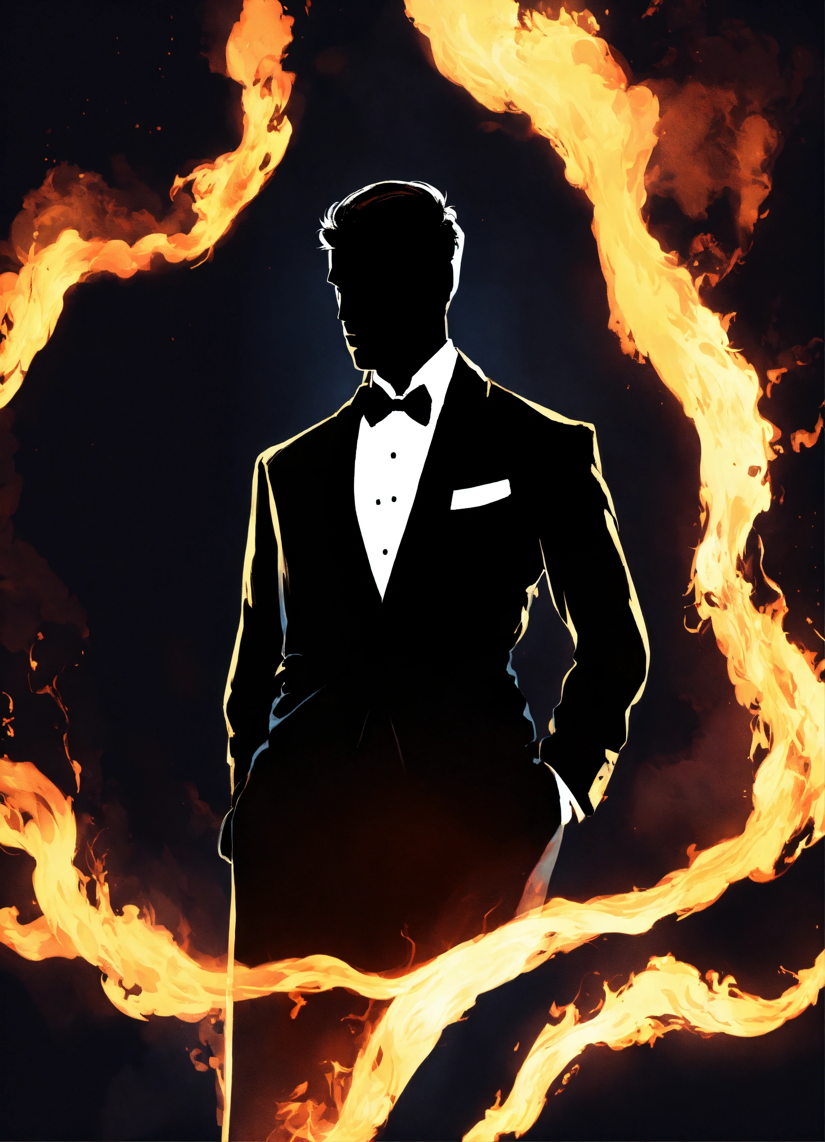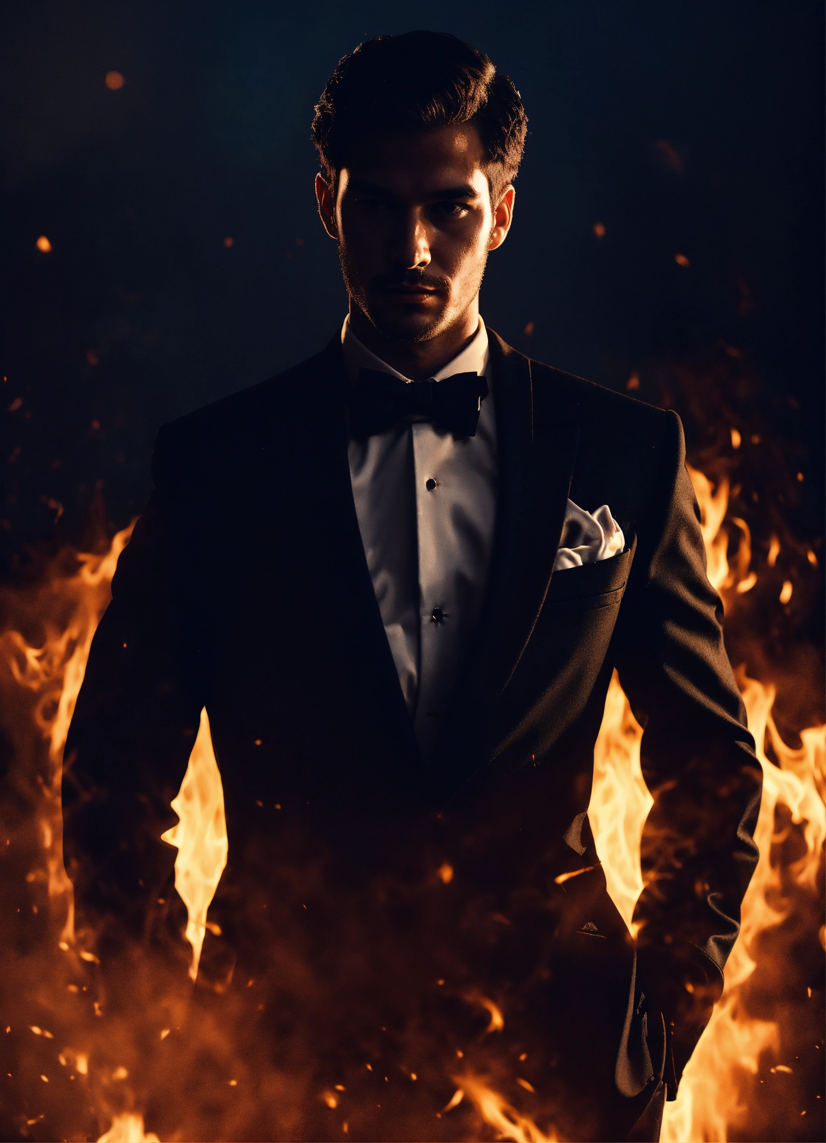 A blaze in the dark background with the silhouette of a man in tuxedo
