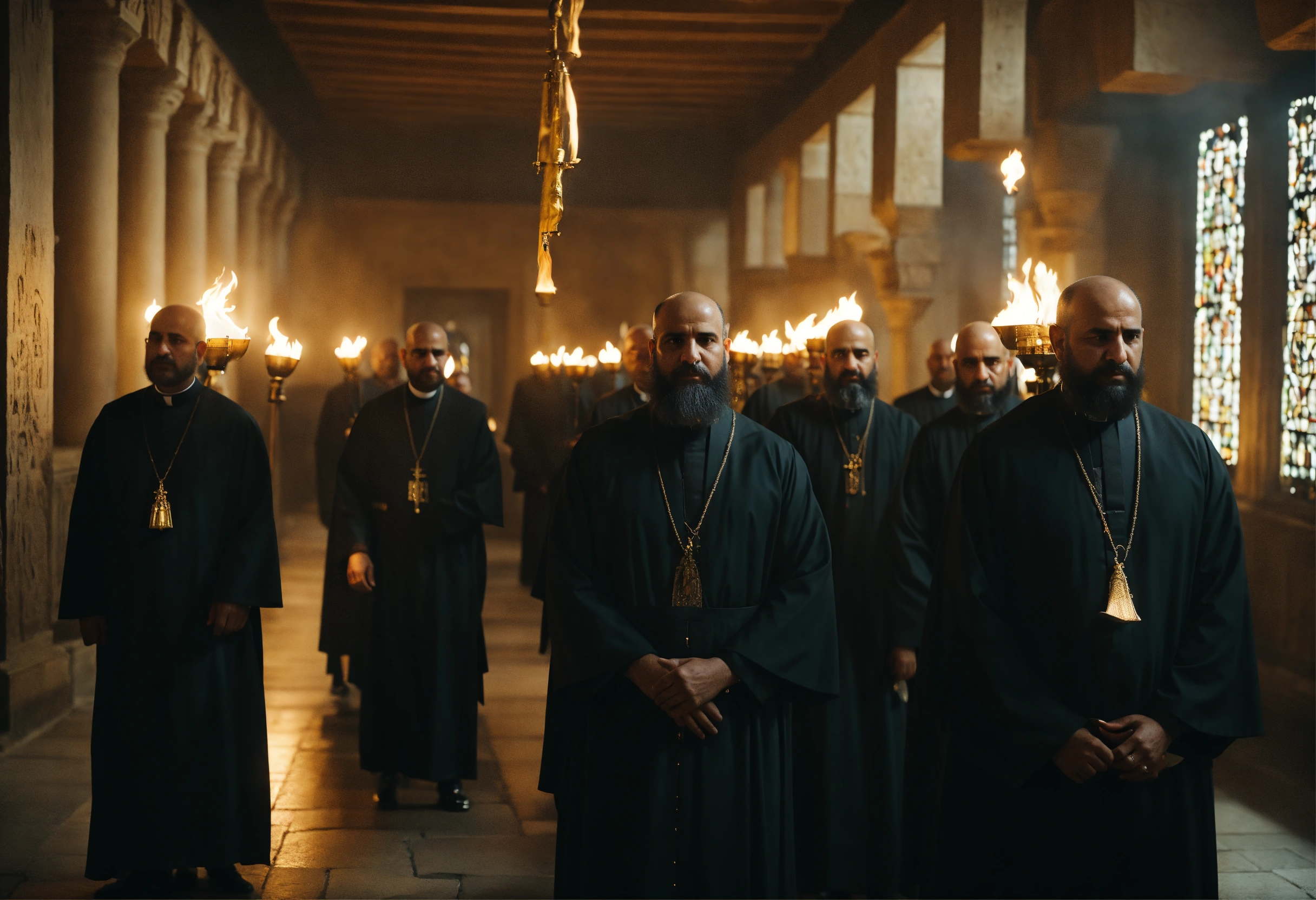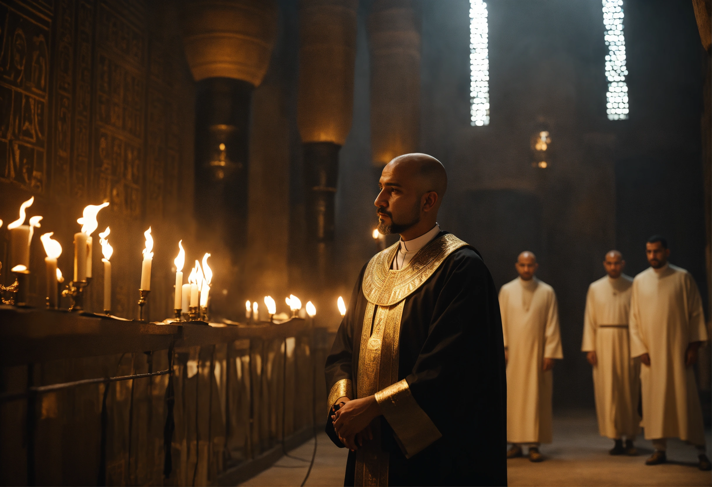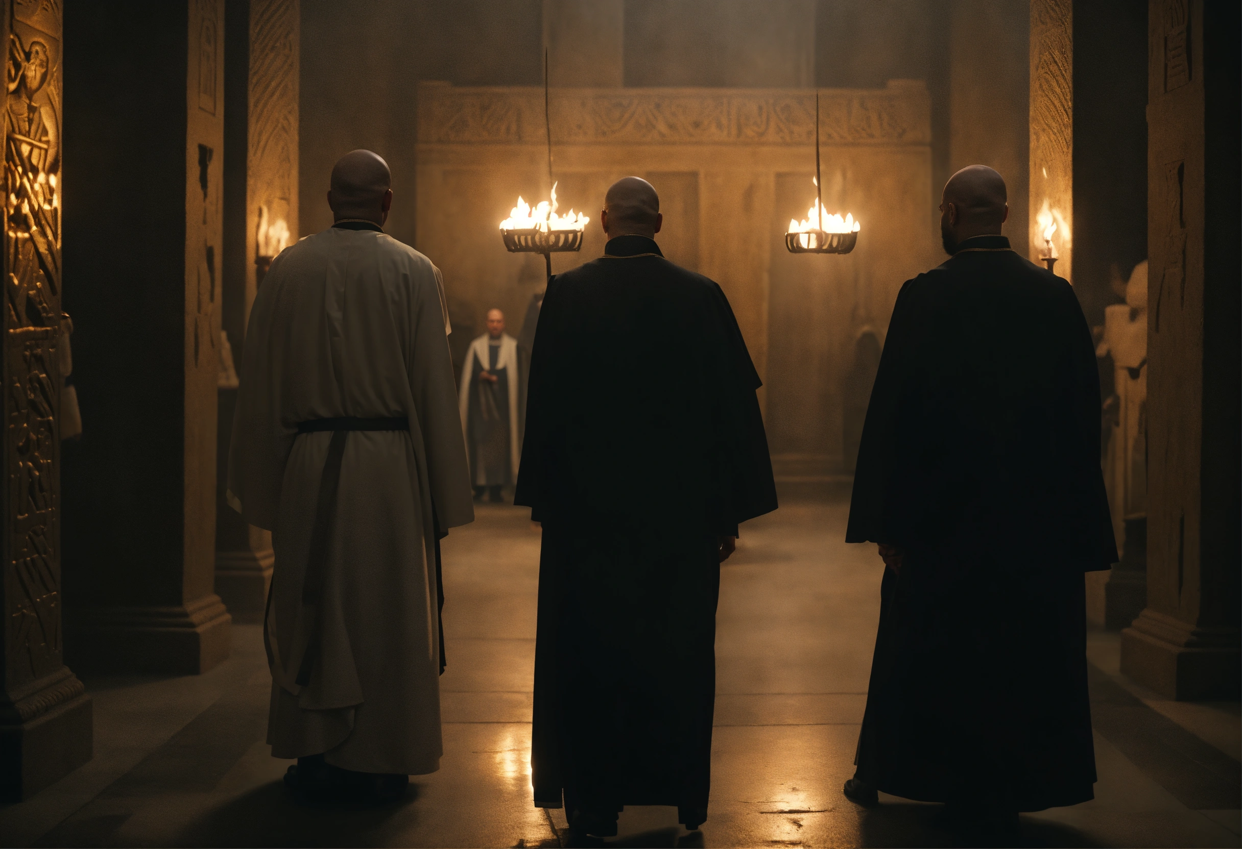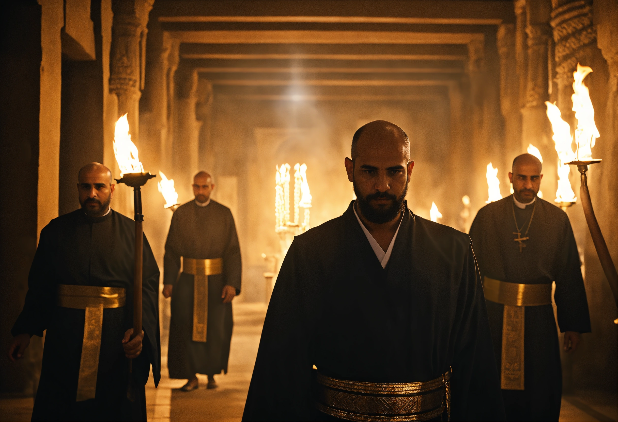 Egyptian priests have no hair or beards, they are new priest candidates and they pass through a dark hall as an exam and there is a very gloomy atmosphere because there are few torches., cinematic, 4k