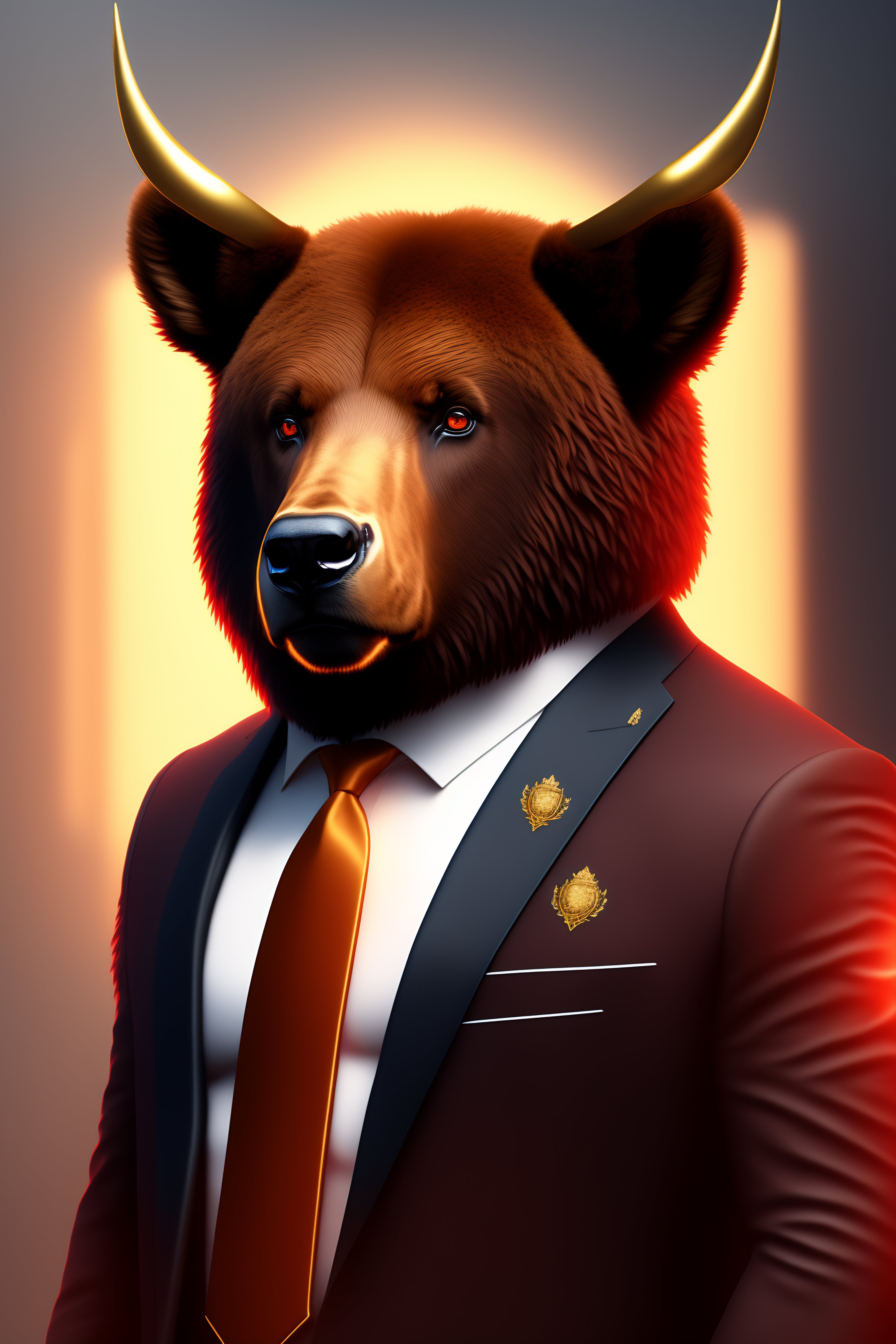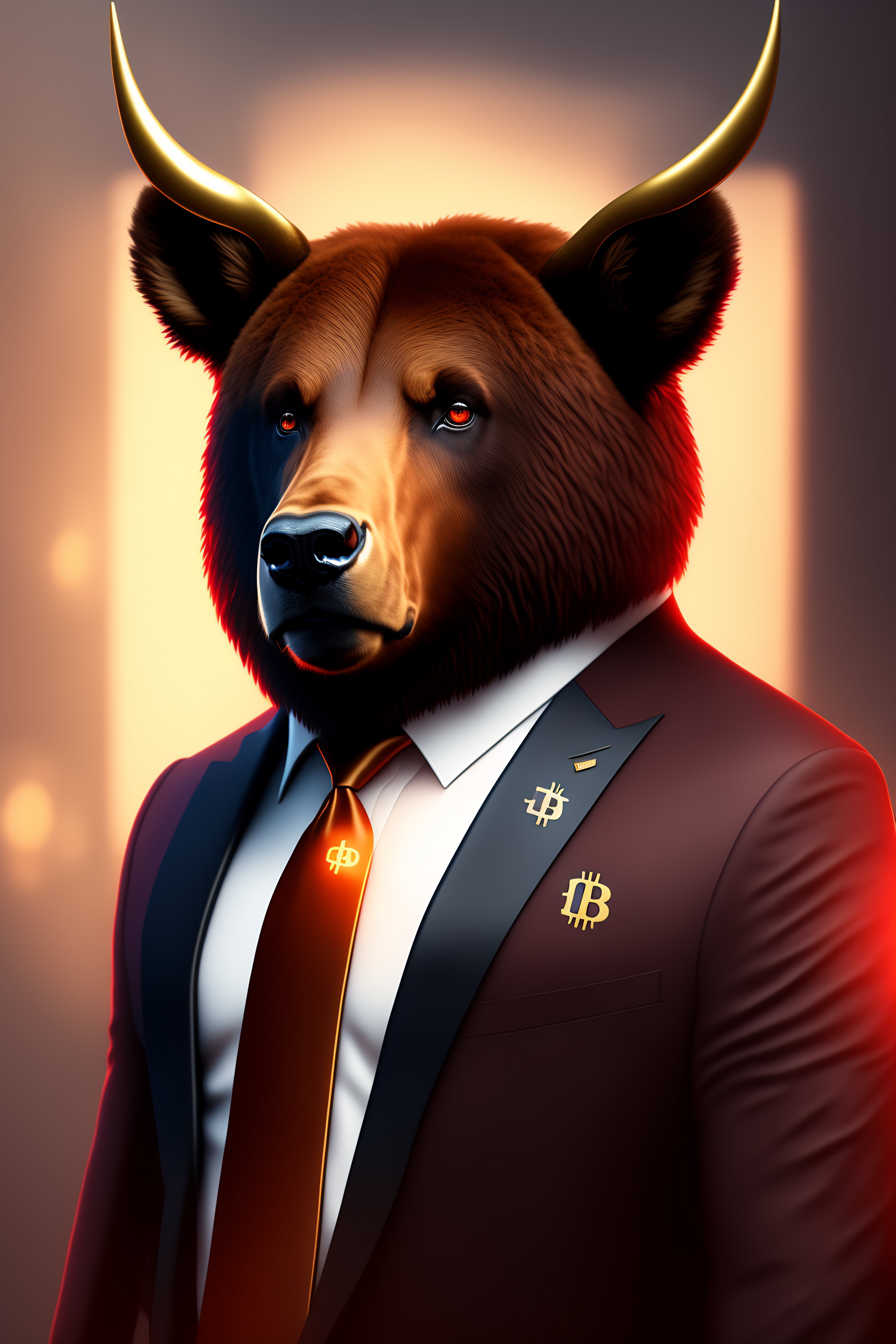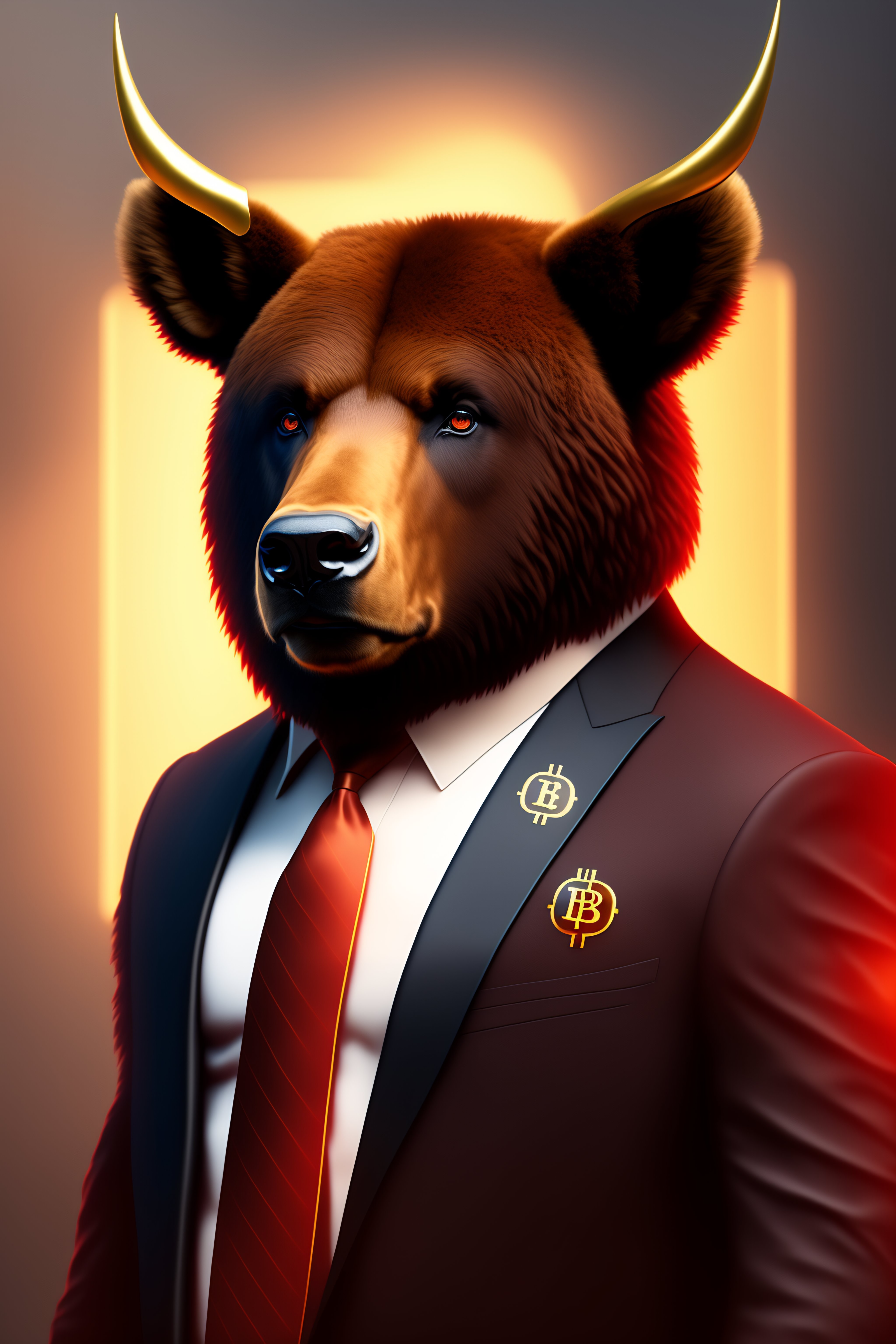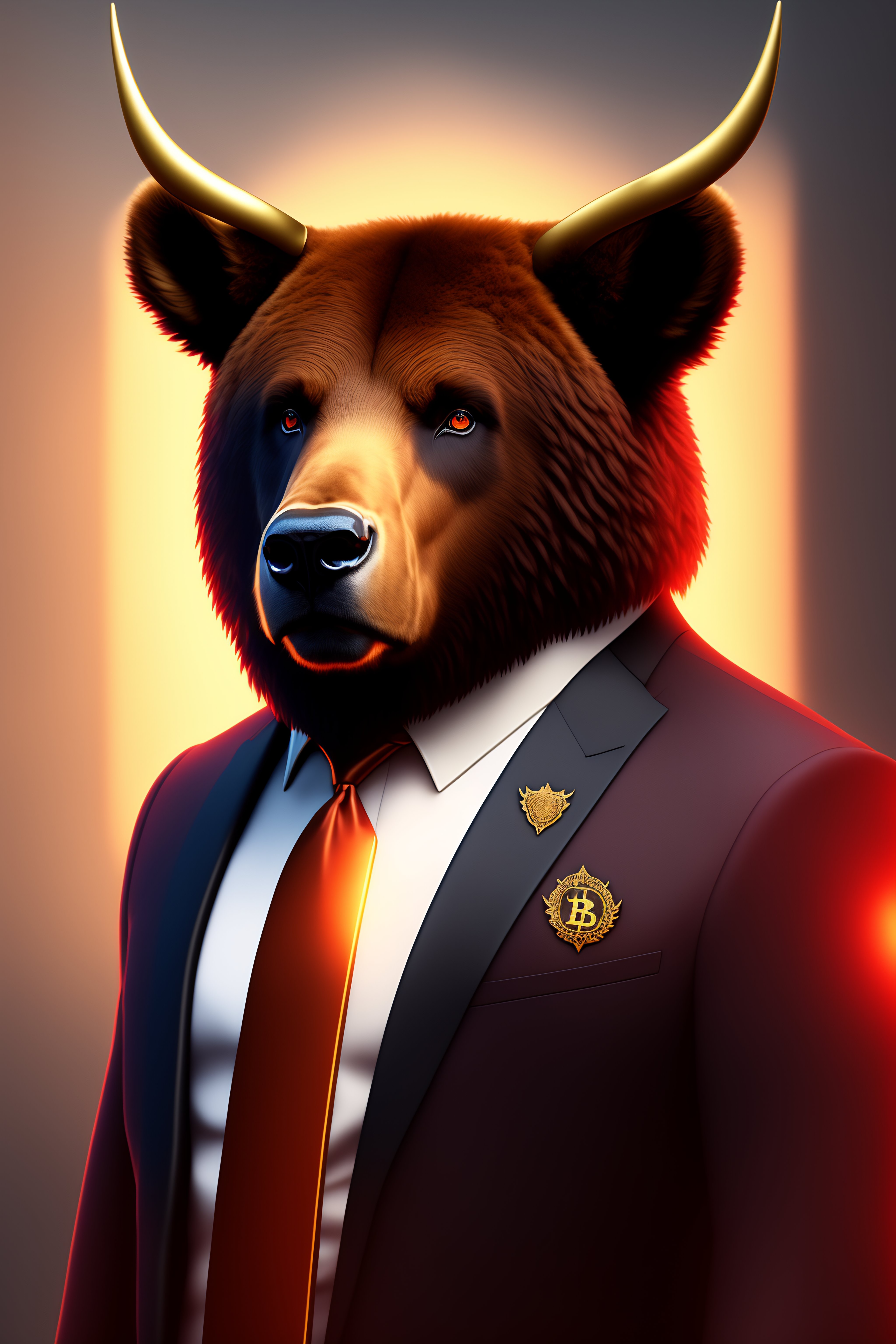 Anthro furry grizzly light brown bear with large highland cow bull horns, bitcoin logo, flashing red laser eyes, three piece dark navy suit, bear claws fixing gold tie, checking watch, 8k, fine detail, character concept design, painting, detailed, vivid, trending on artstation