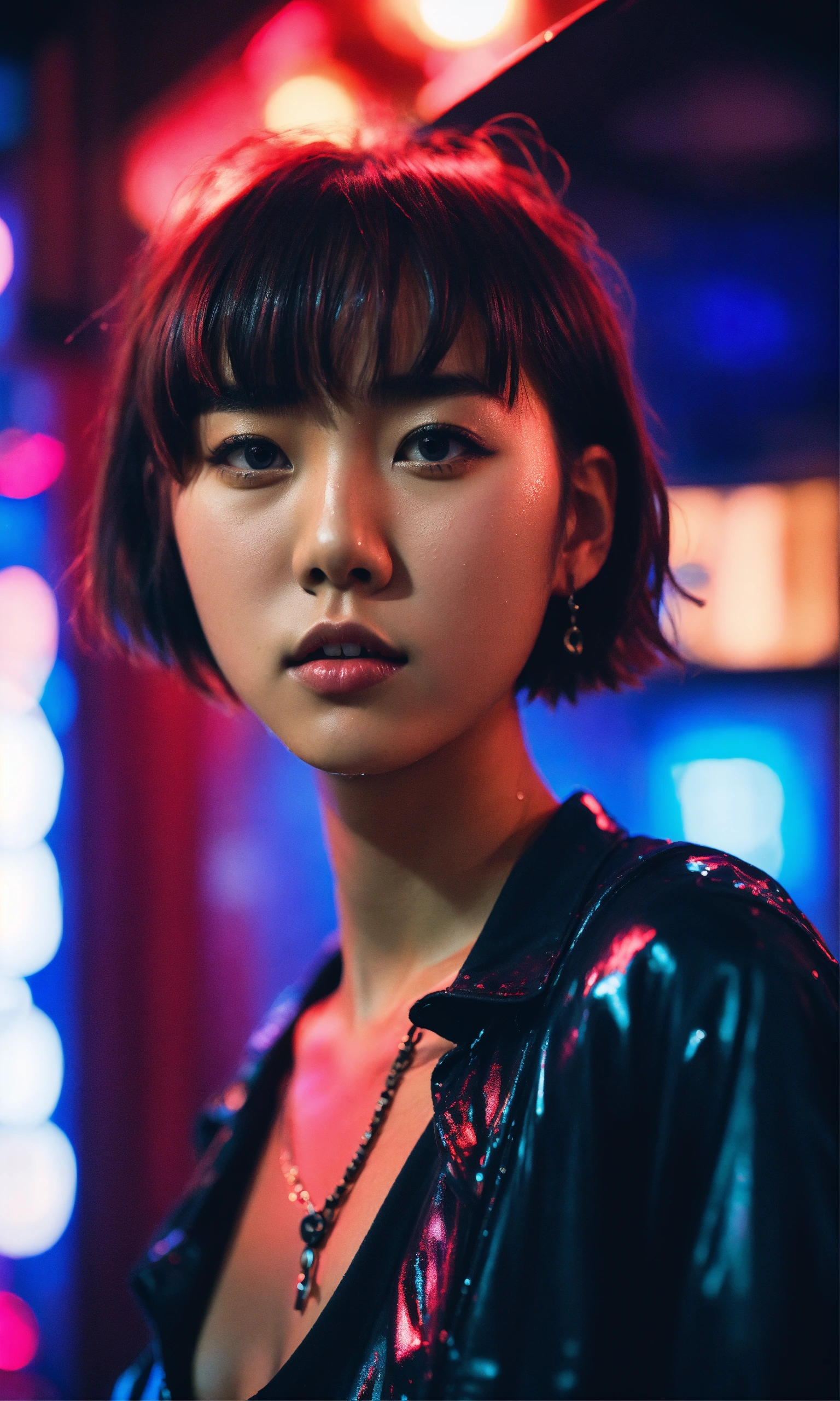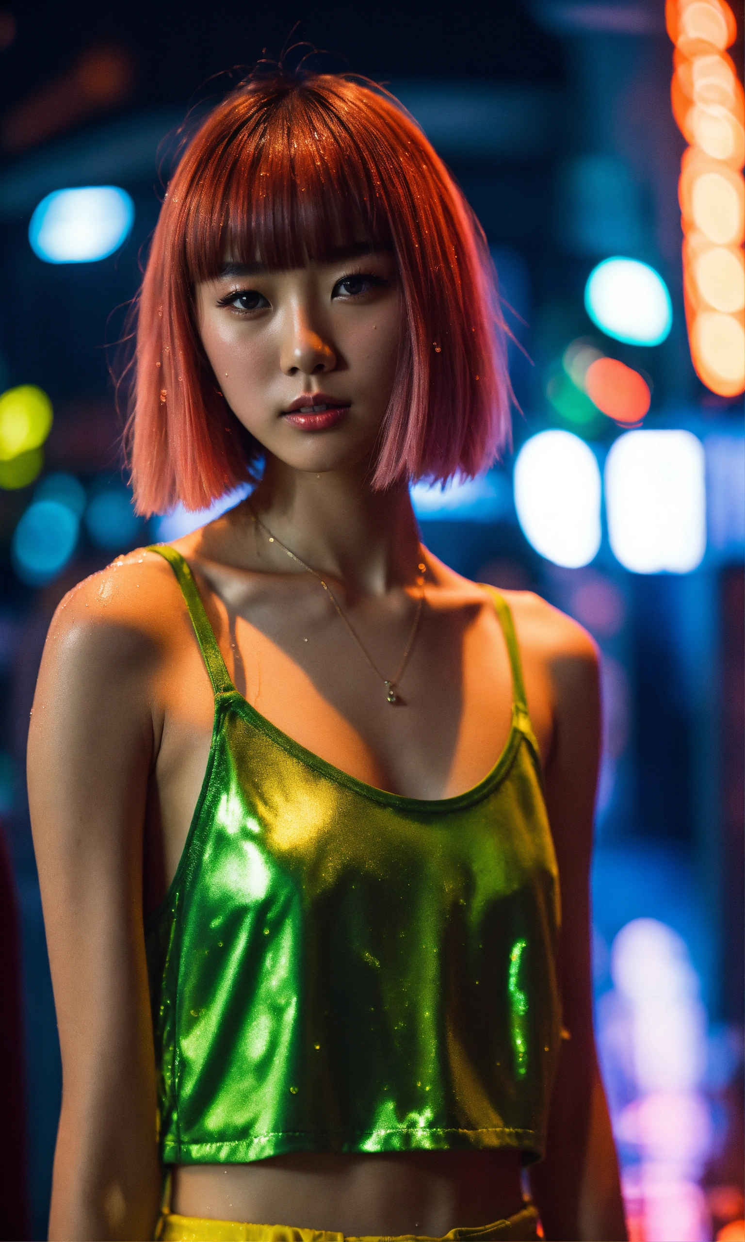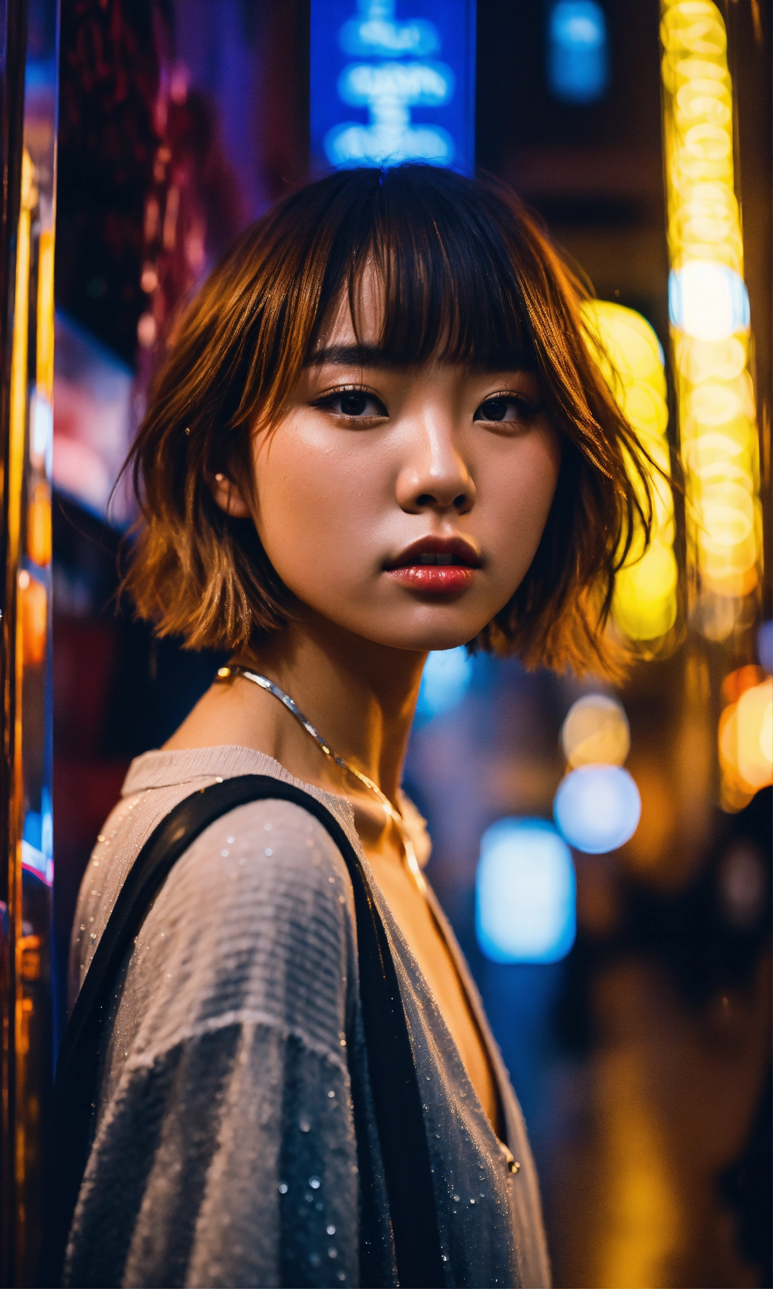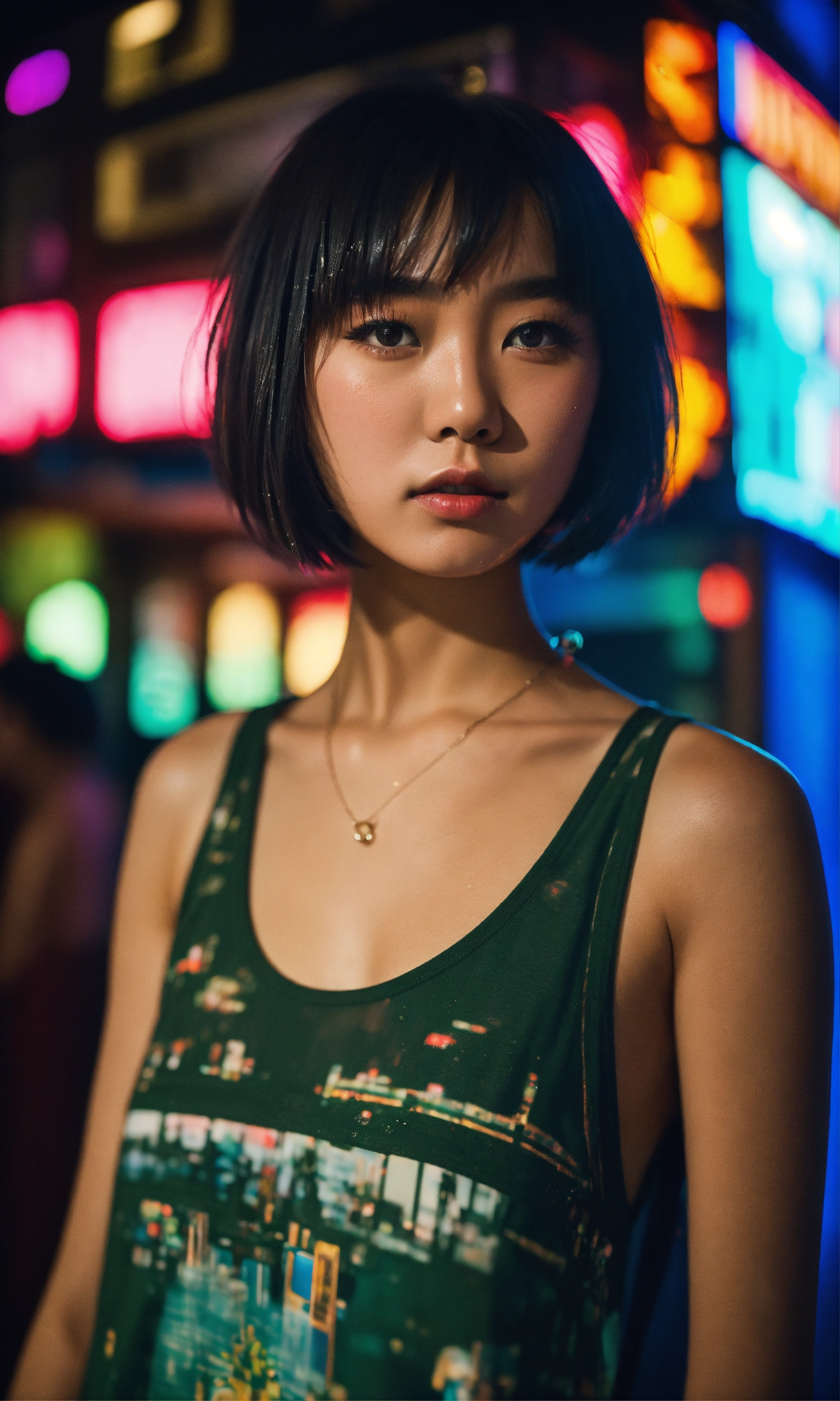 8k photo portrait of a cute japanese young fashion model in a tanktop with bobcut hair, entering a club in ny, highly detailed, vibrant, production cinematic, reflections on a wet street, 8k, film grain