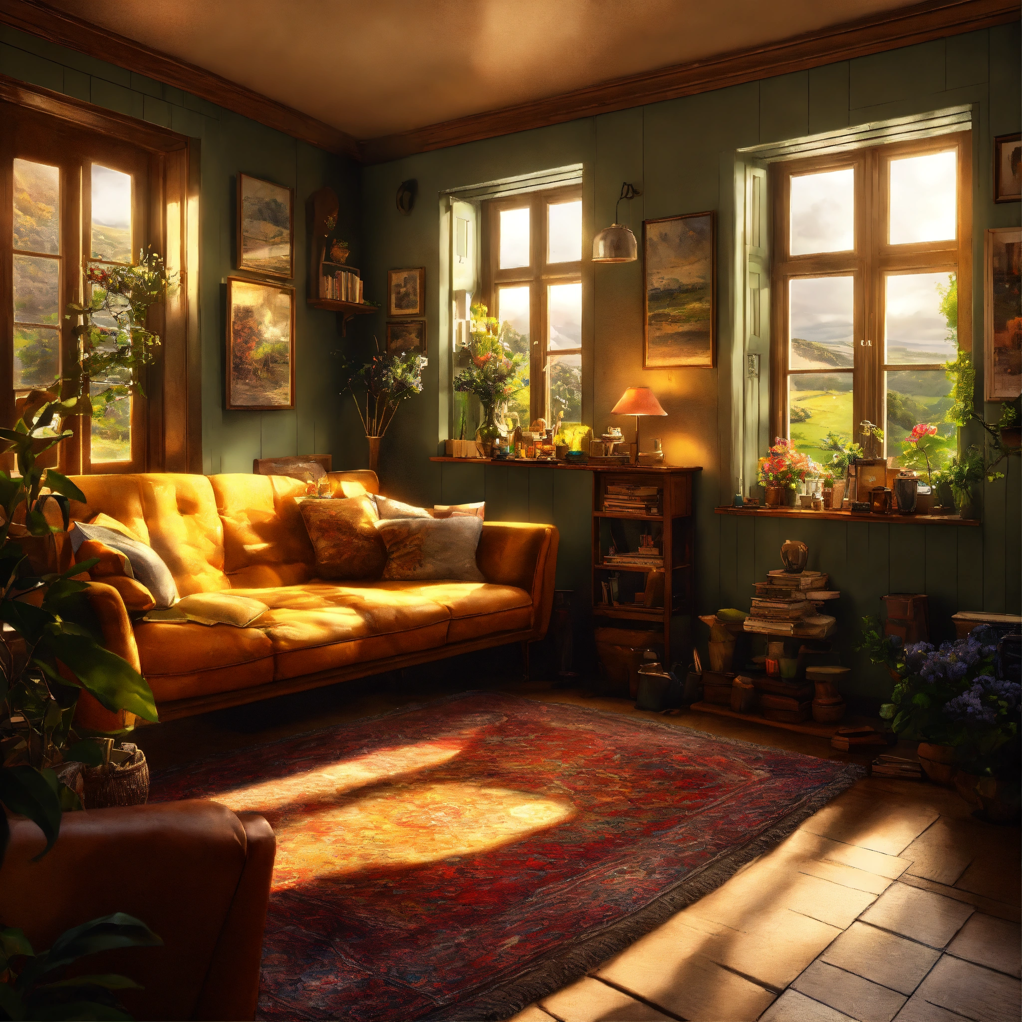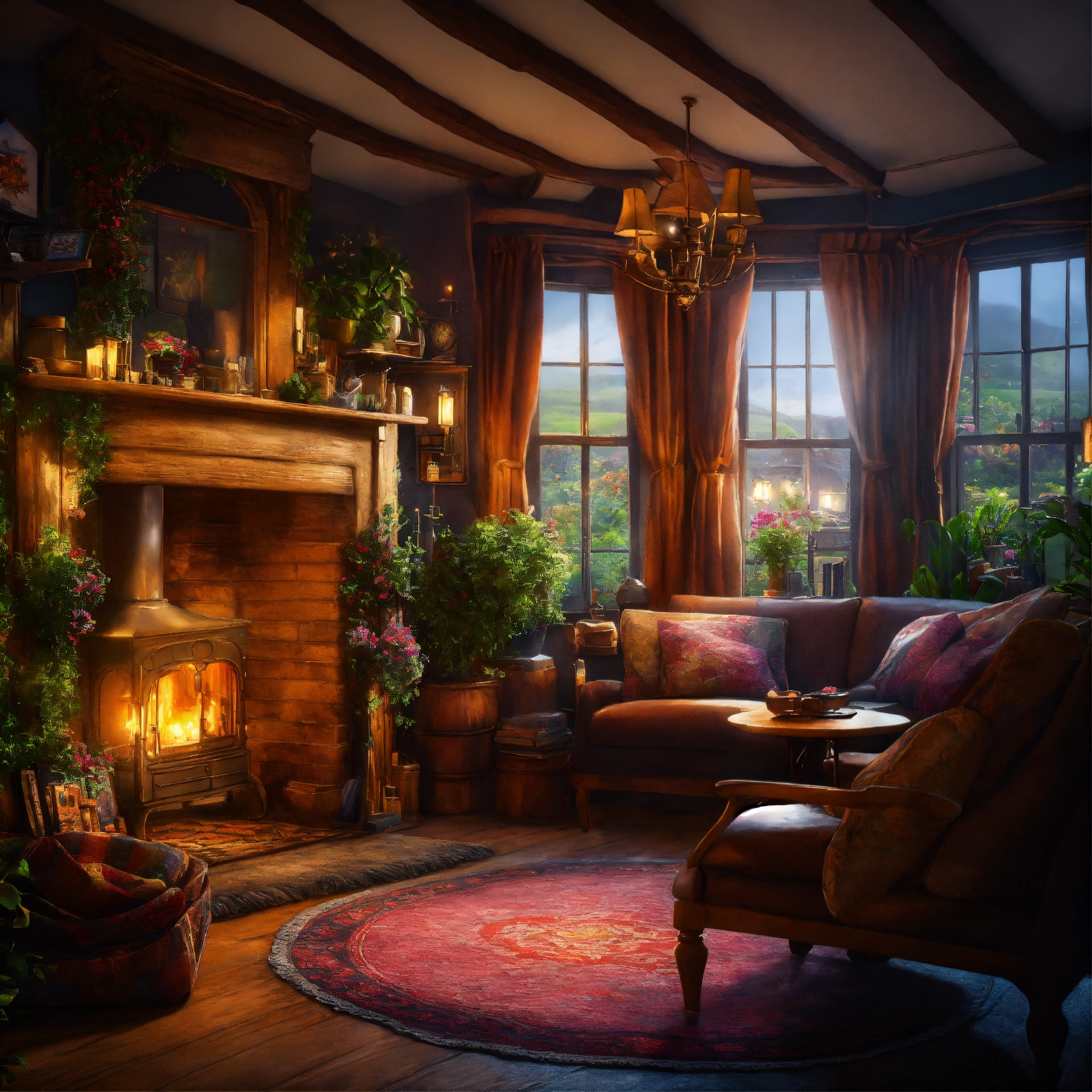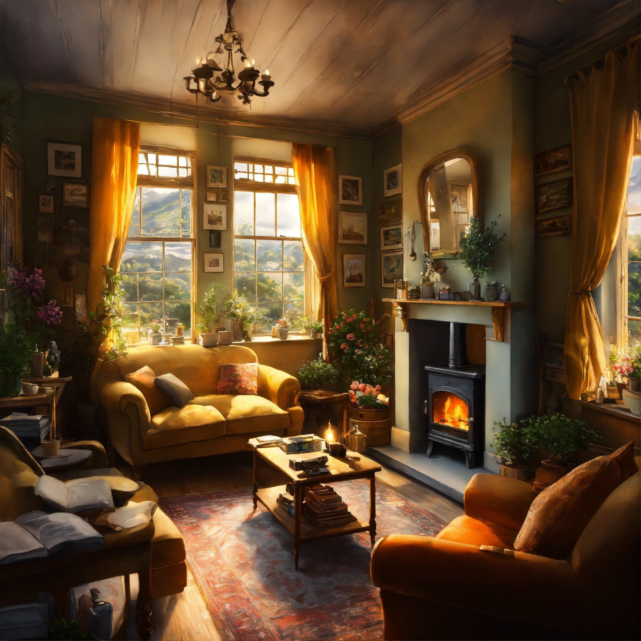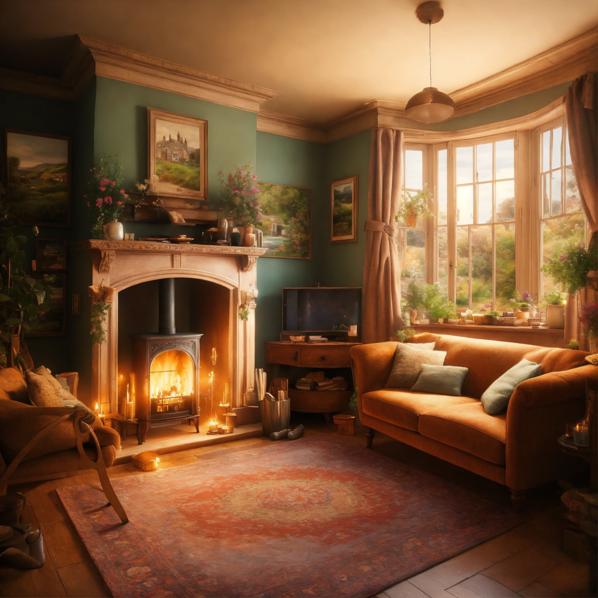 Epic shot of a ultra detailed cozy living room in england, in cornwall, digital painting, little photorealistic, sharp focus, magical place. luminous. ultra cozy and inviting place, wish to be there. very detailed, arty, should rank high on youtube for a dream trip.