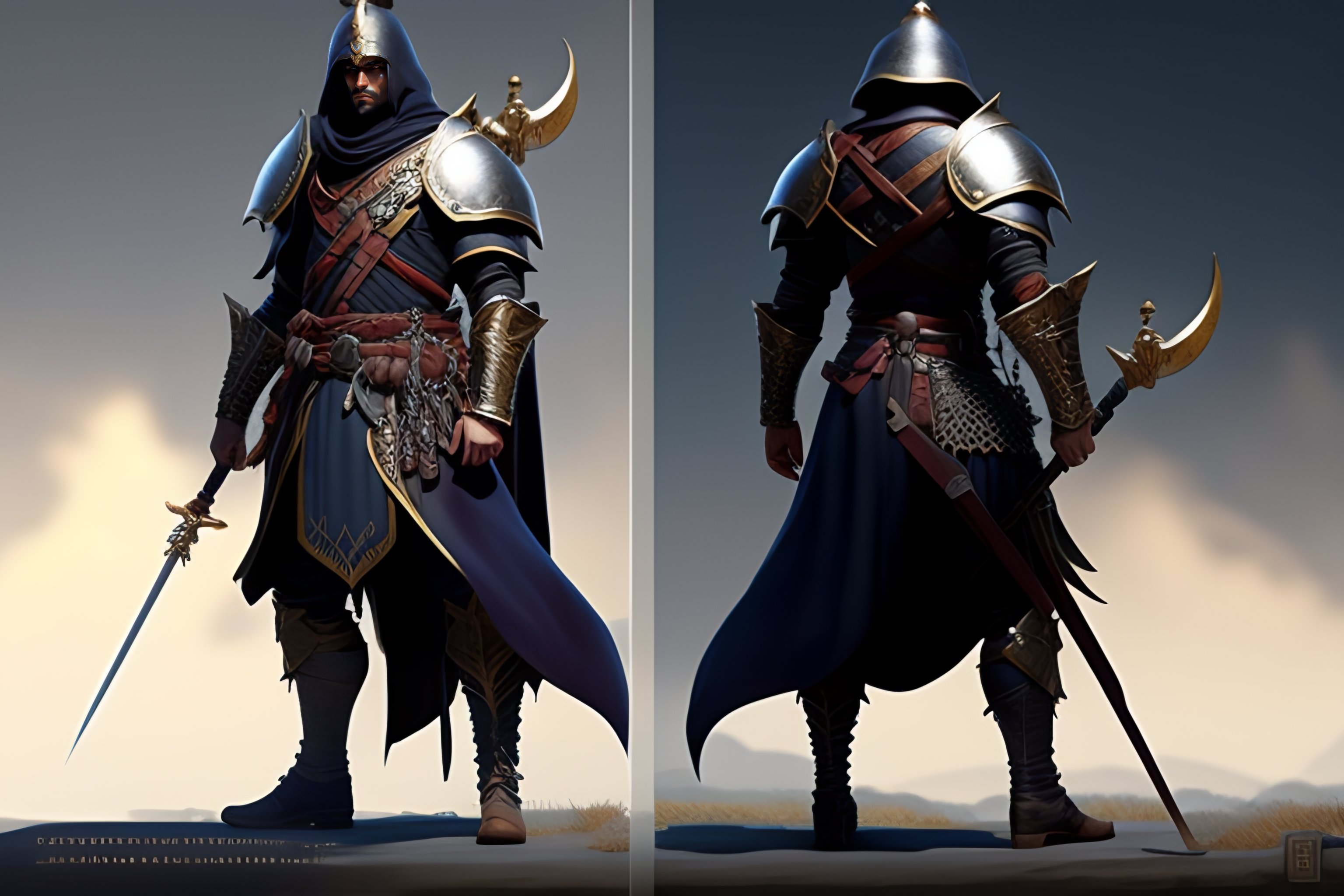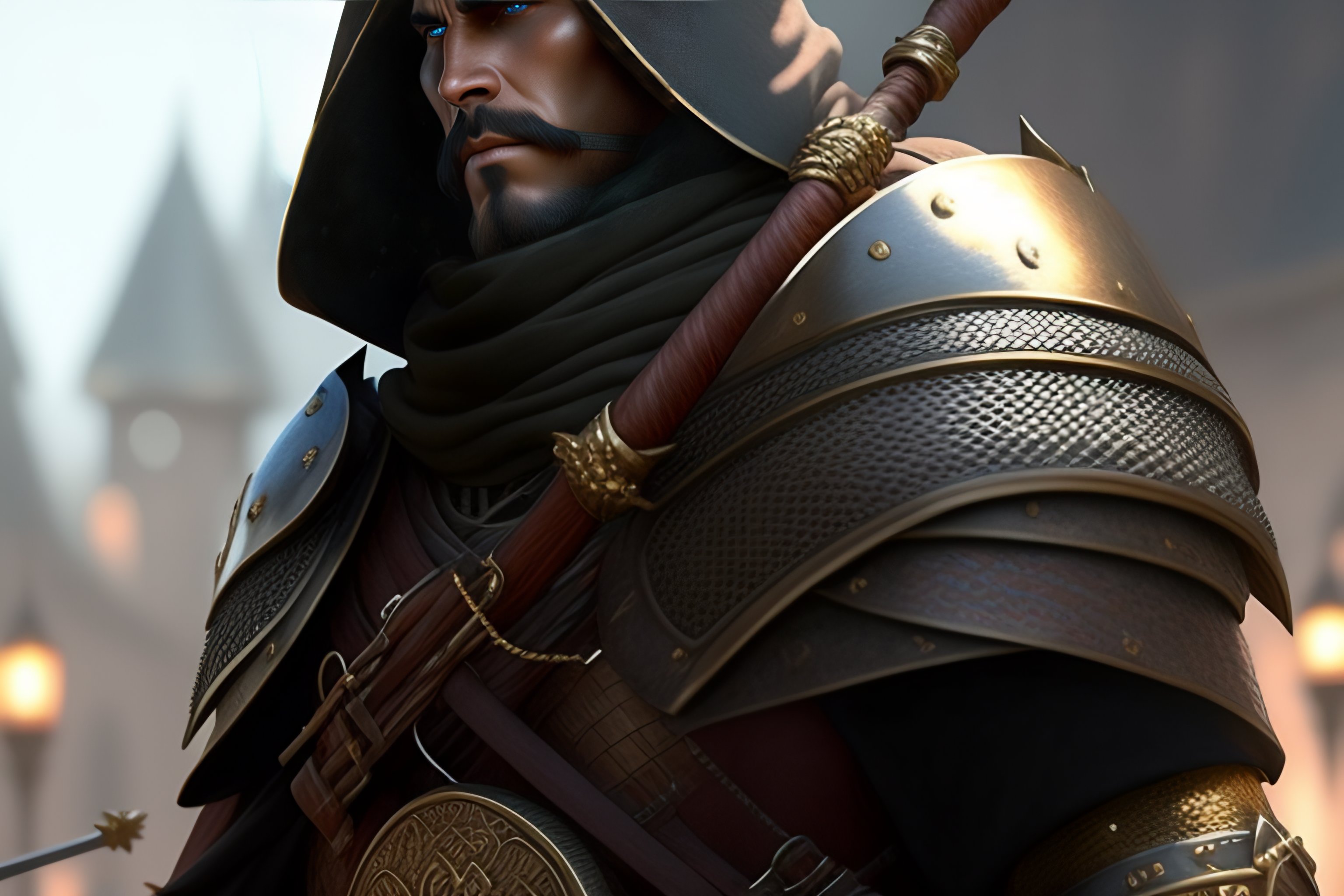 Medieval fantasy sentry guard with big crossbow and round metal hat and chainmail, greg rutkowski, ultra detailed, volumetric lighting