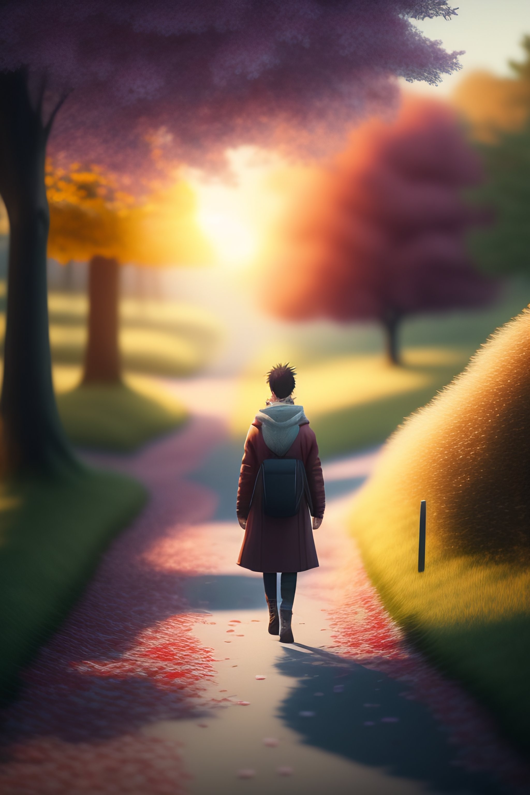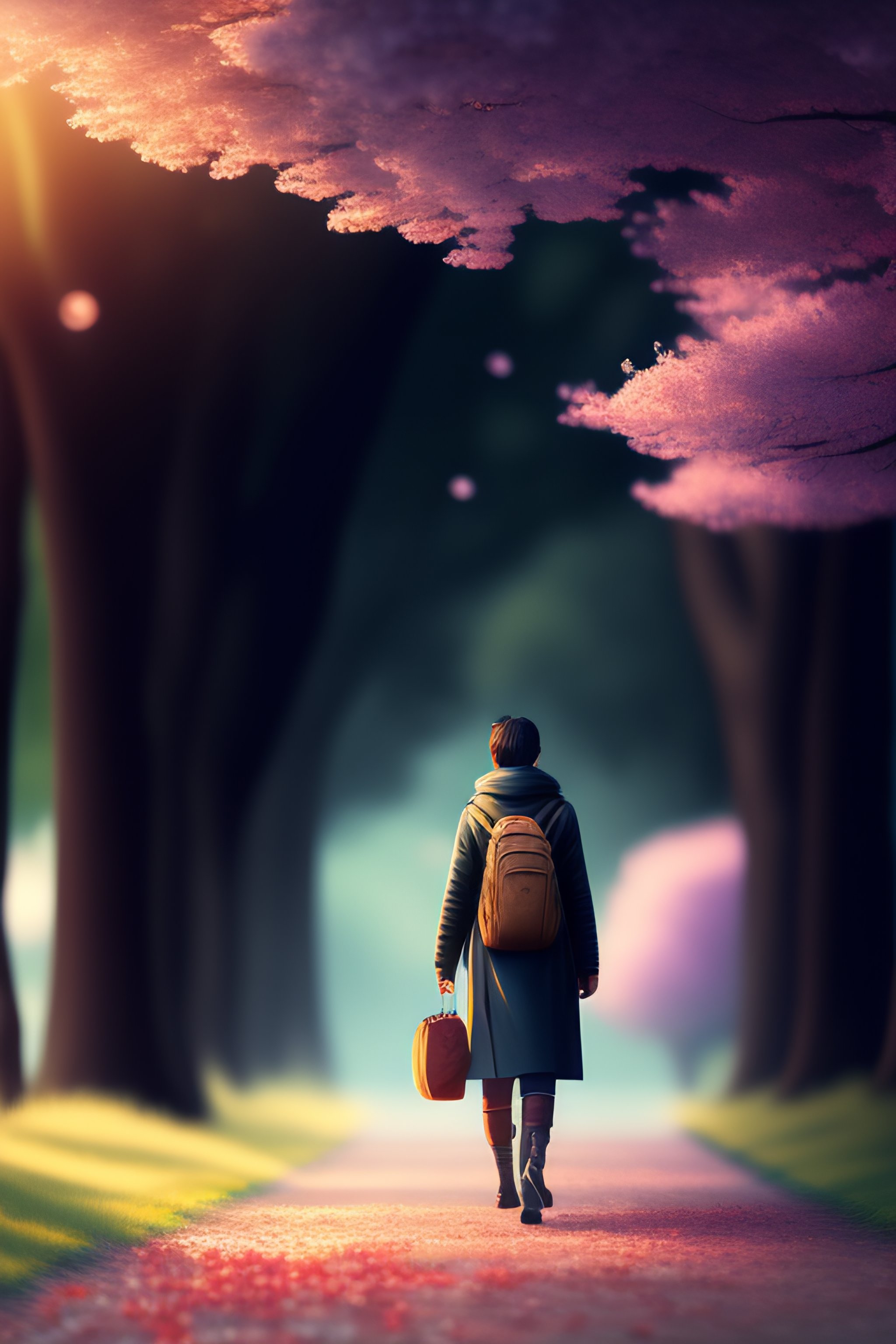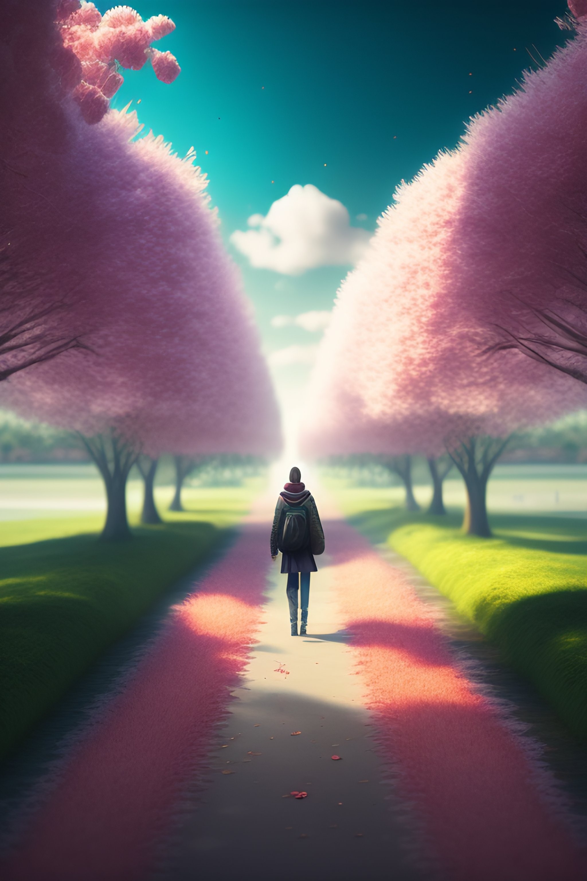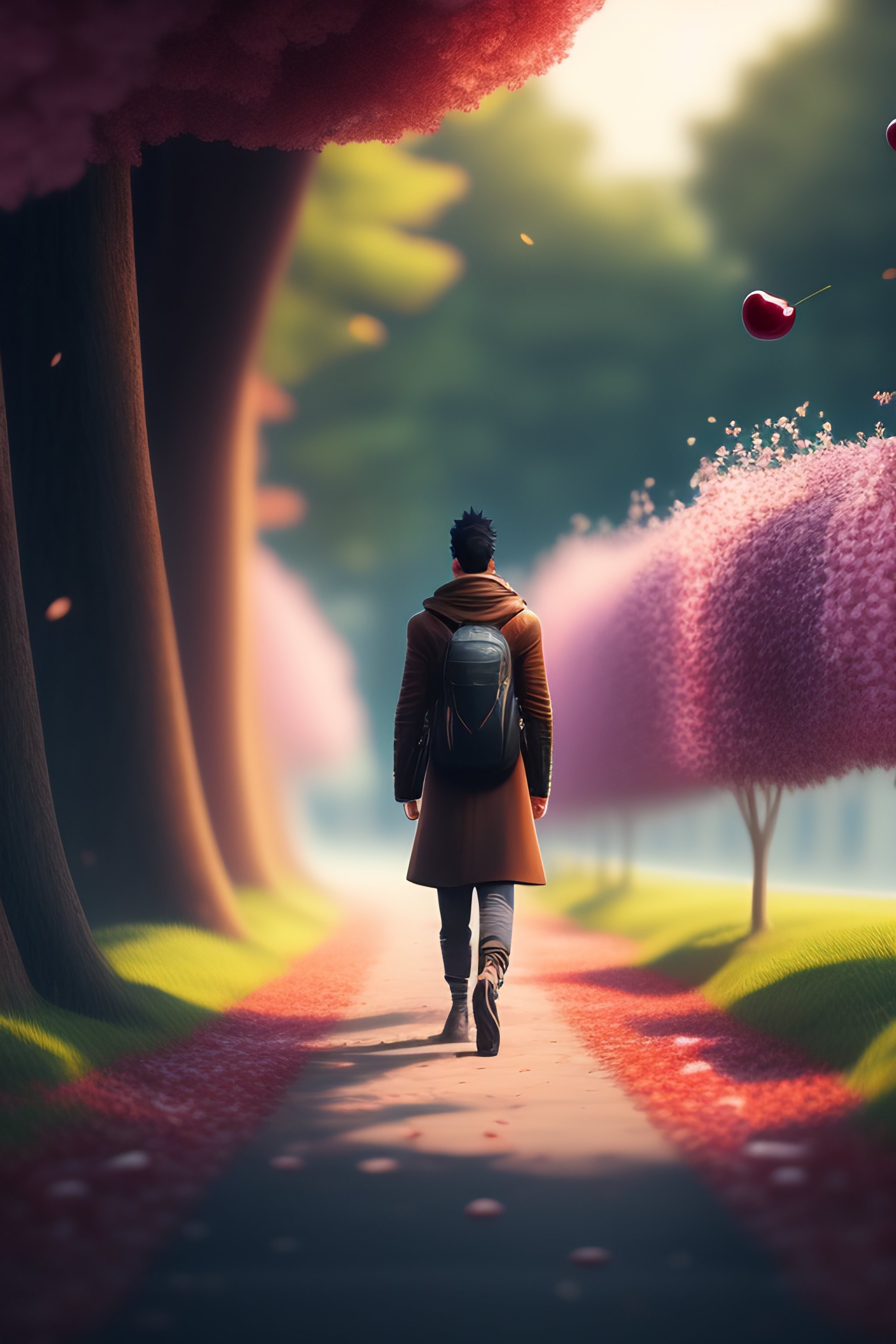 Anime scene with cherry tree shedding, a character walking on footpath, realistic, 4k, cinematic environment