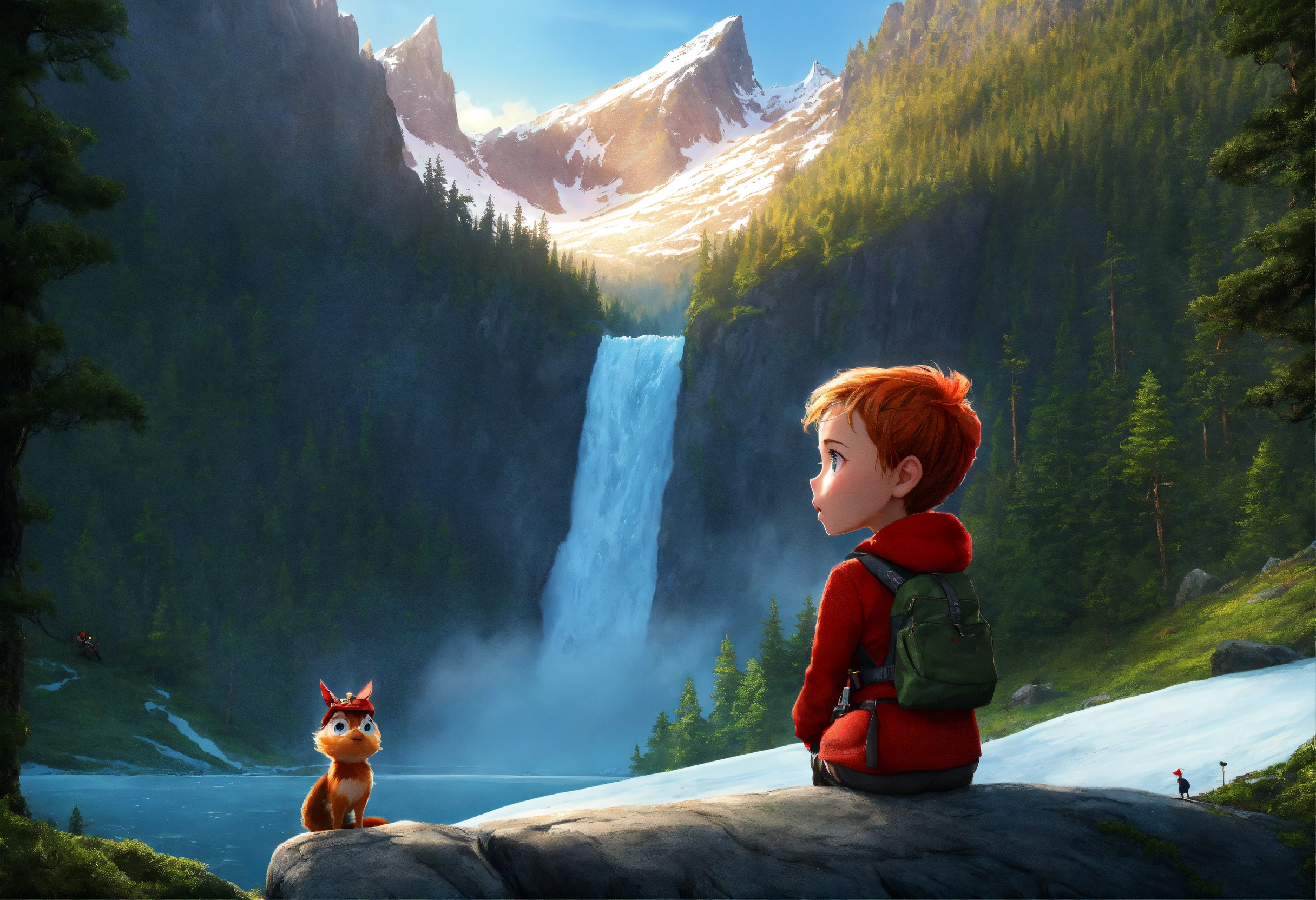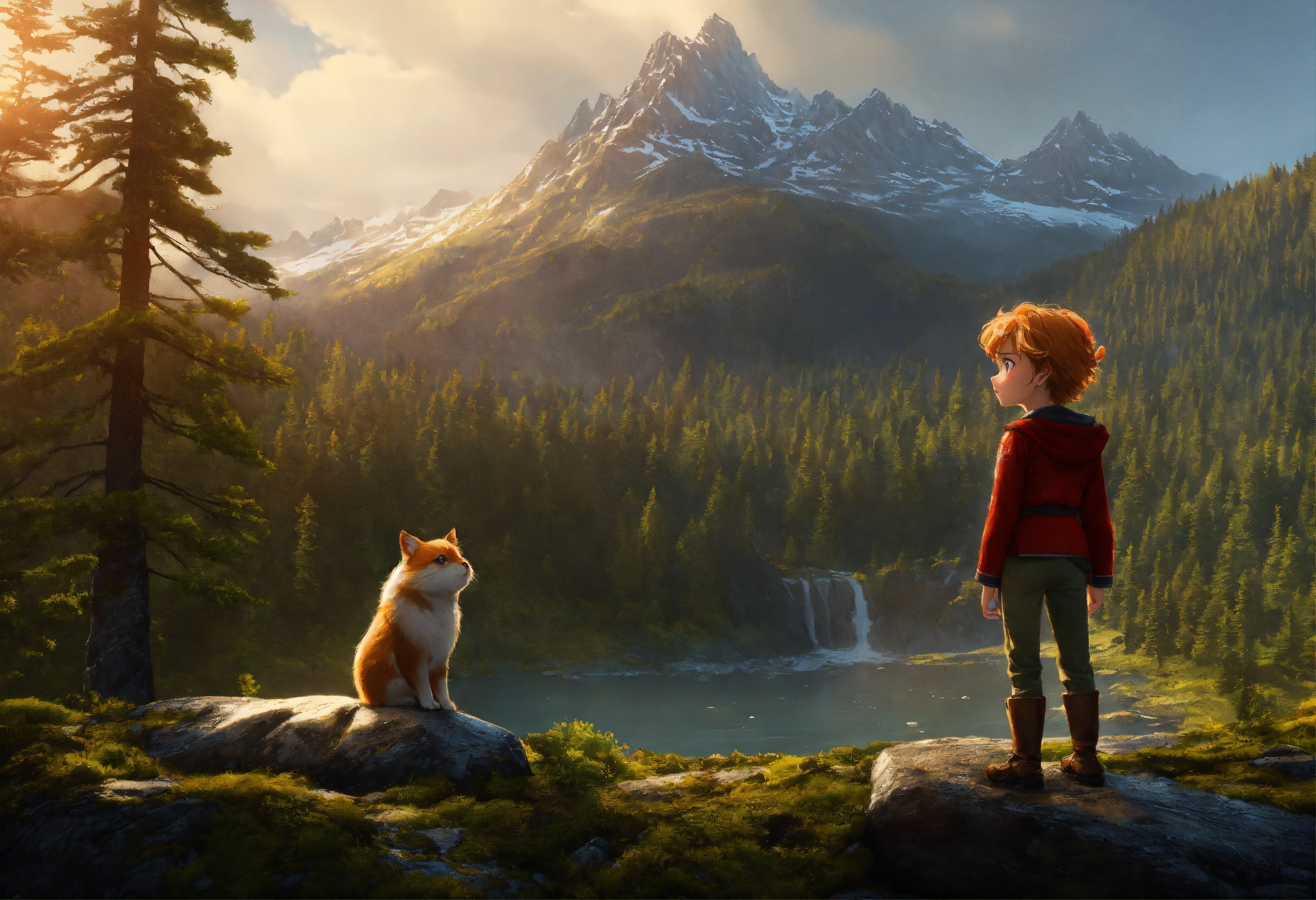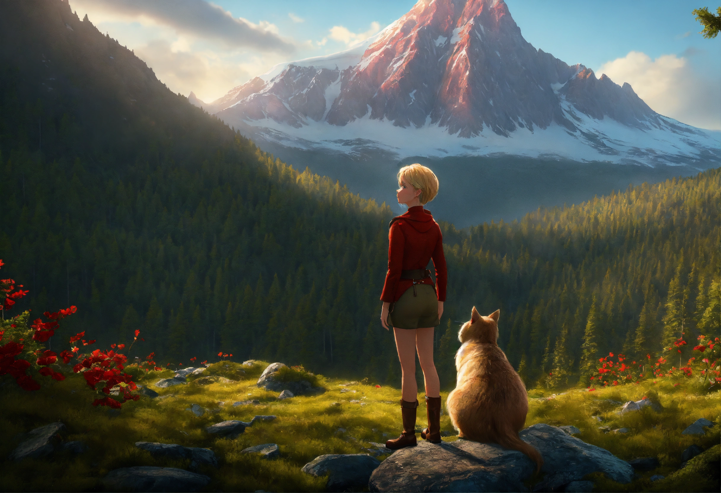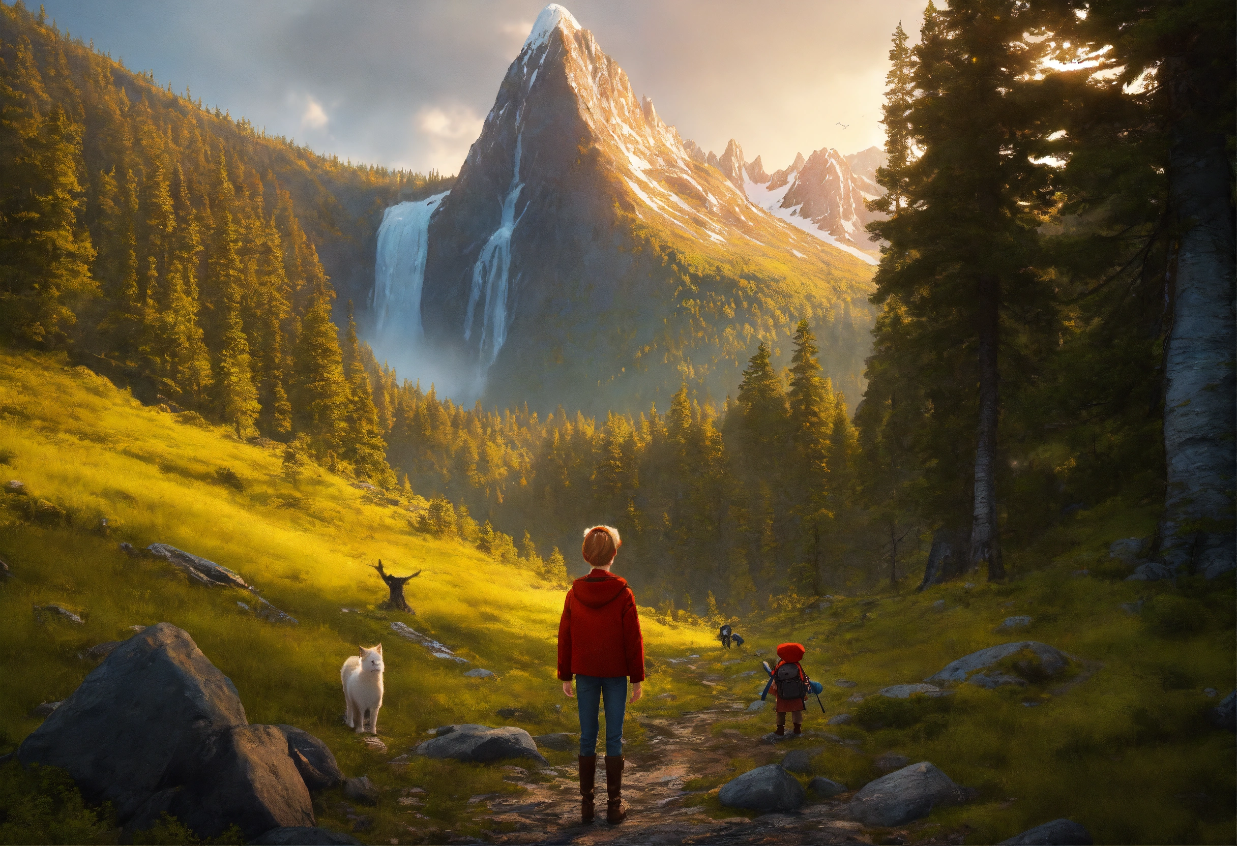 Charlize theron as a norwegian 13 year old and a tiny, red-capped creature standing at the edge of a forest clearing, gazing up at a towering mountain with rugged slopes of rock and ice, conveying a sense of awe and the beginning of a grand adventure, pixar animation style