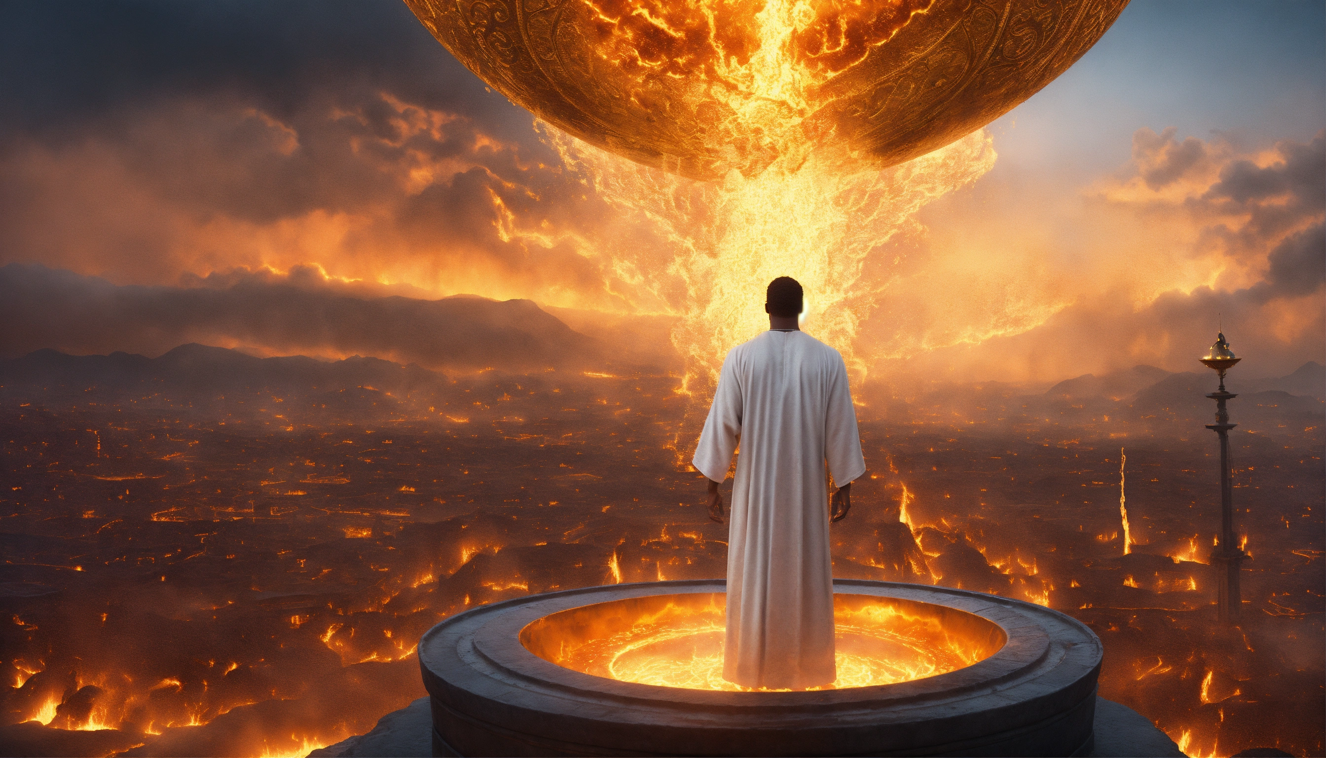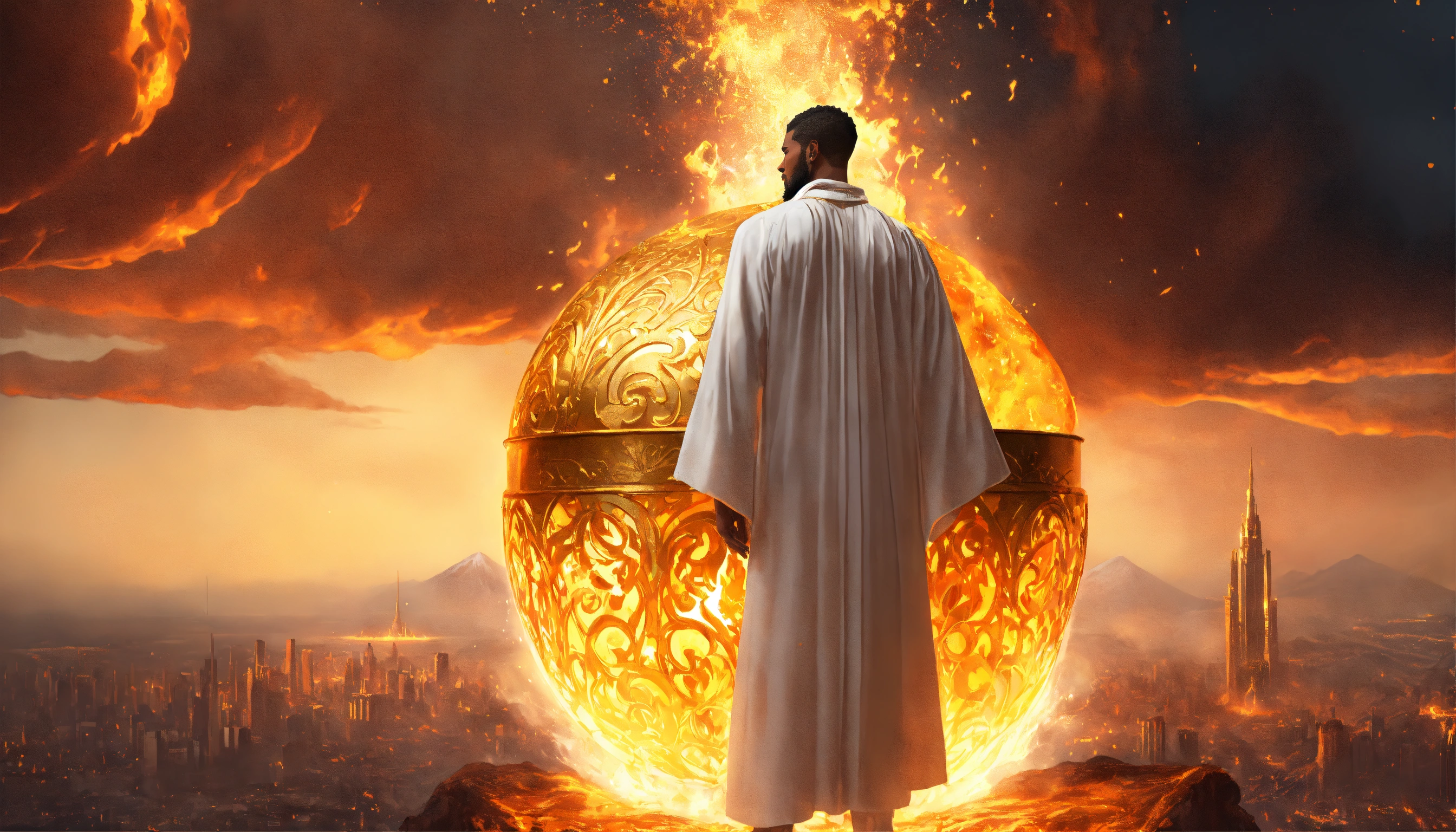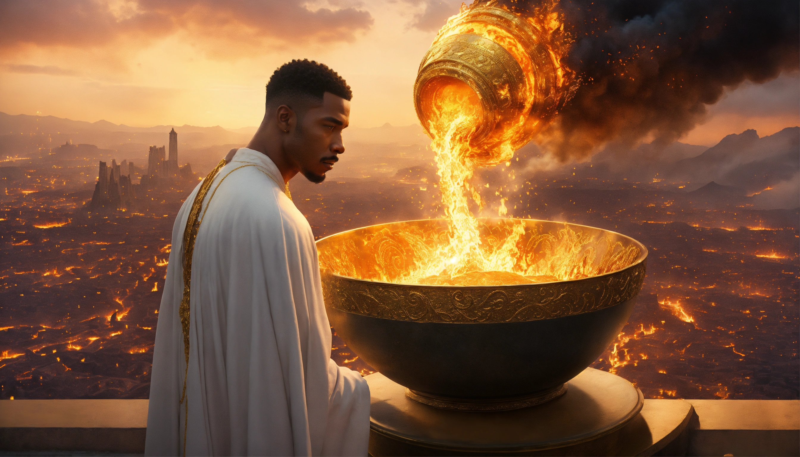 Illustrate a view of a handsome black man wearing a long glorious white robe with gold embroidery, he is pouring out lava from a large golden bowl onto the cities, he stands high in the sky, profile view with a face of righteous indignation, far down below is a world full of chaos and cities on fire, ethereal and fantasy photorealistic 8k