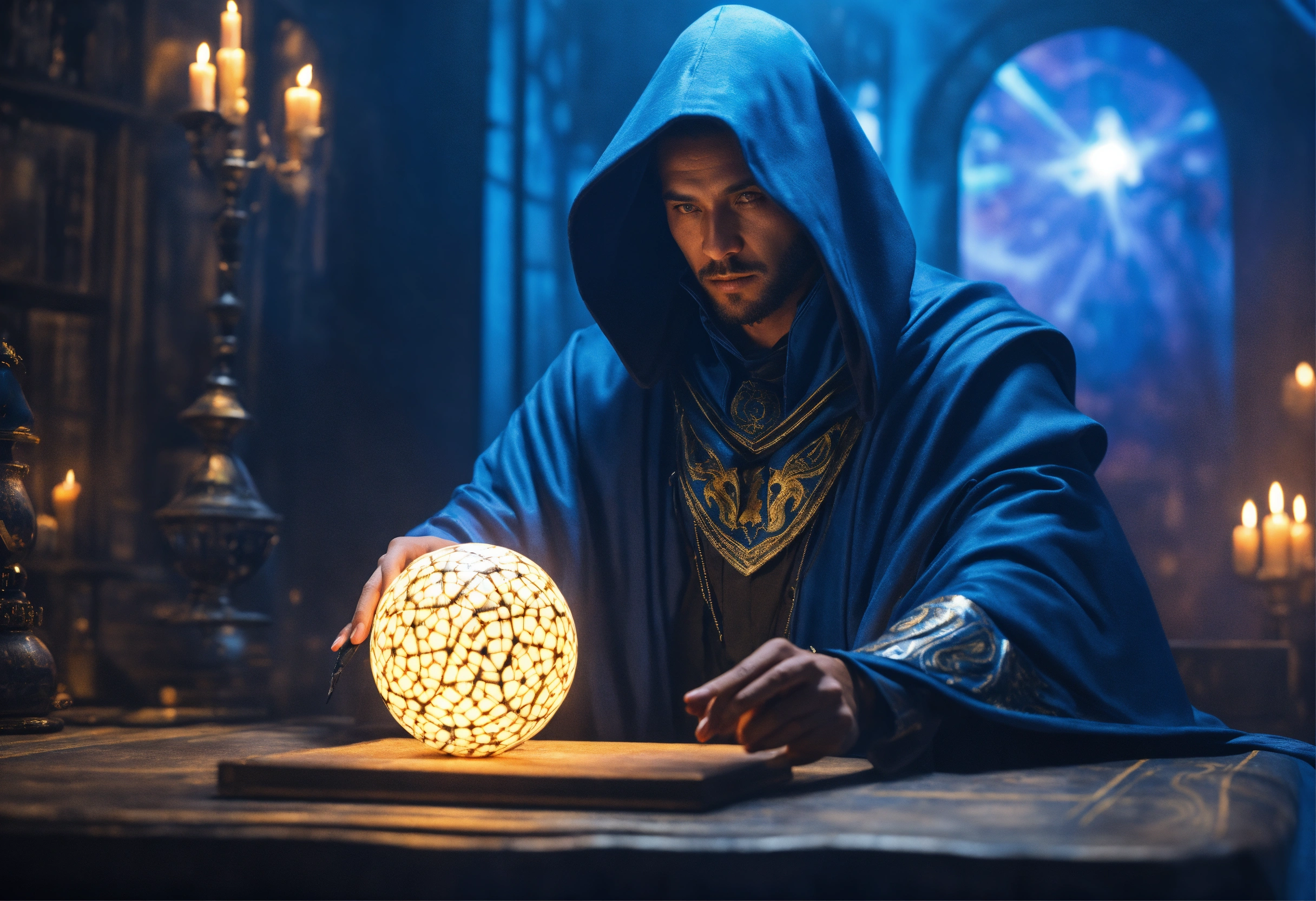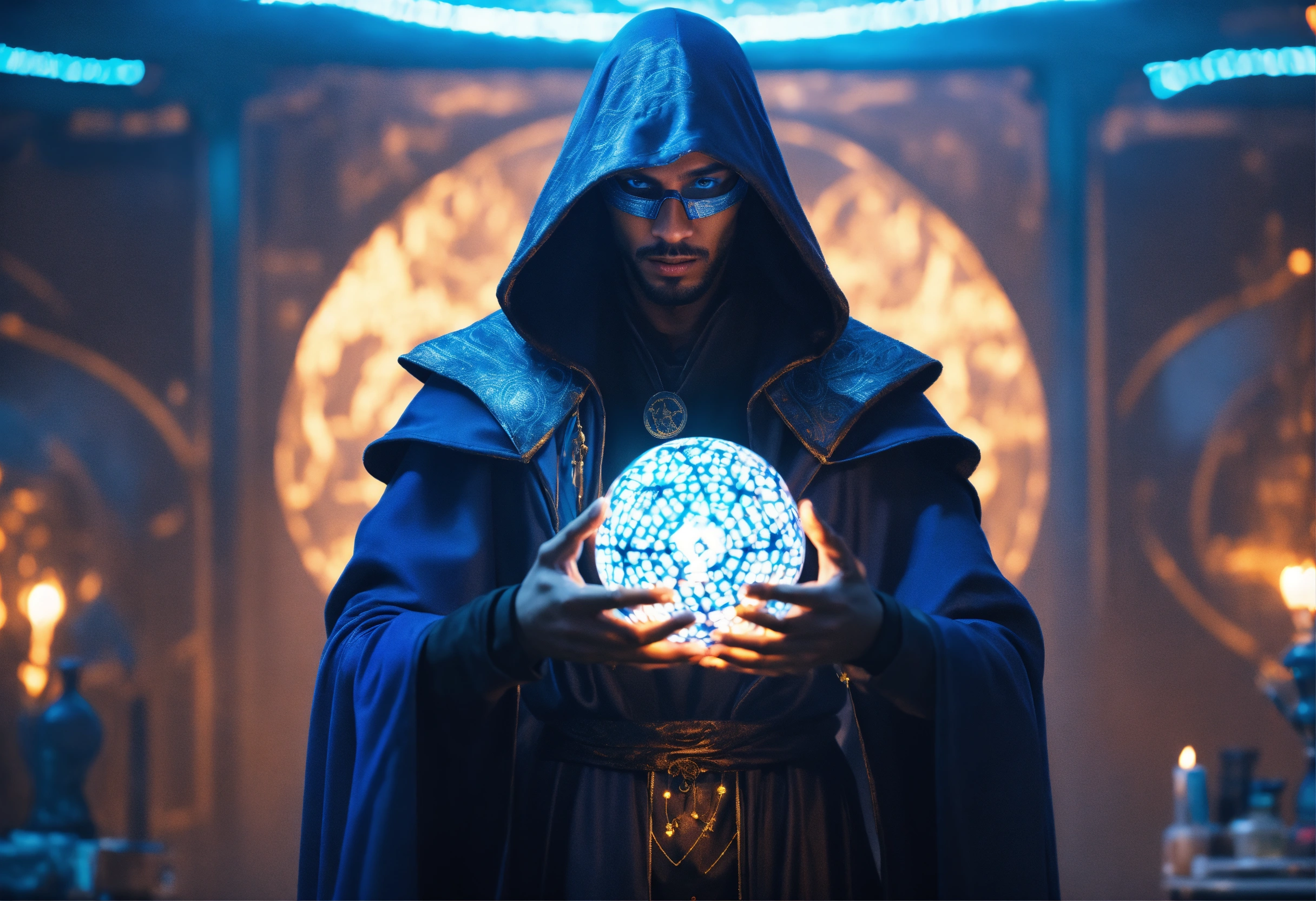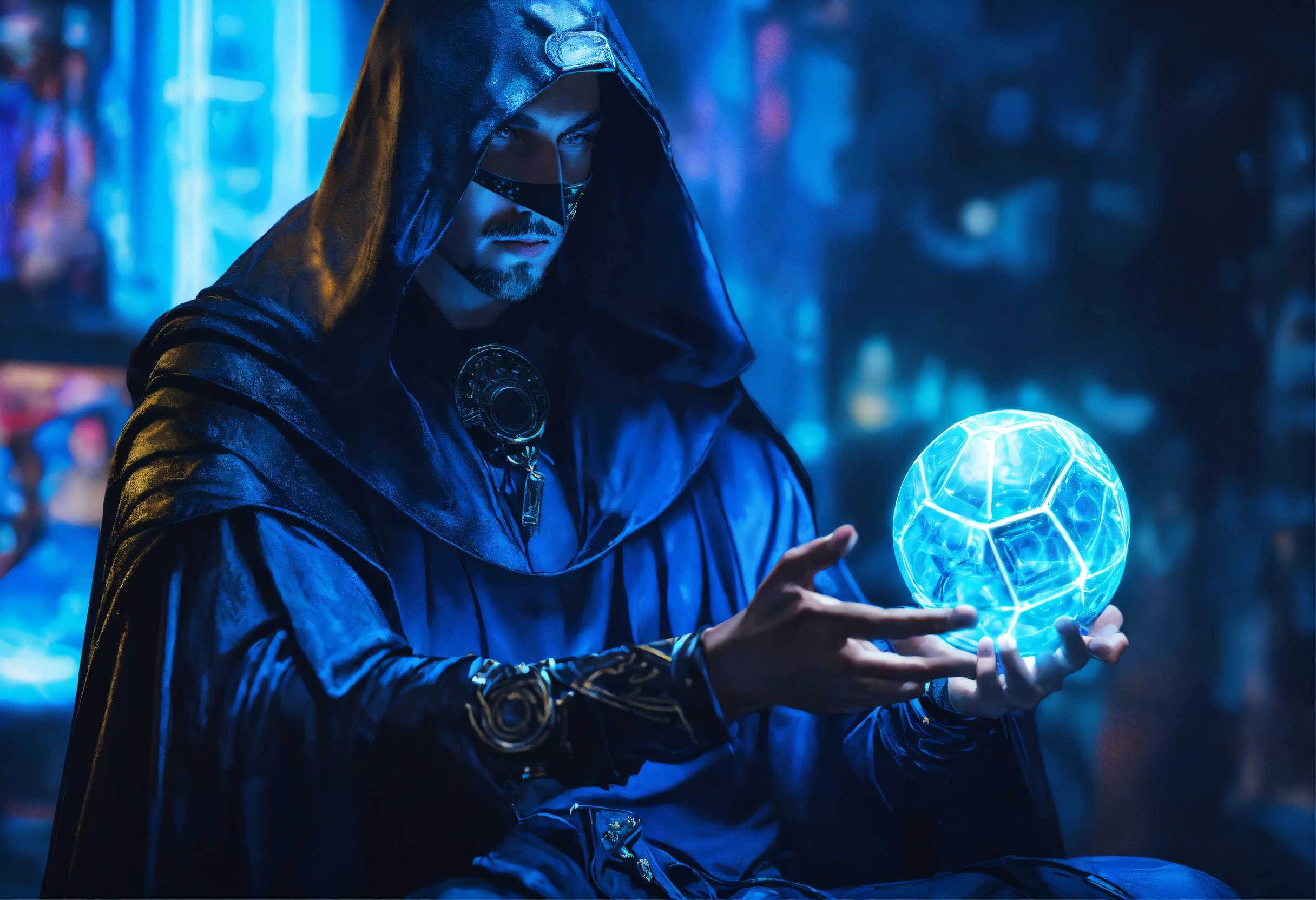 A black and blue cloaked half masked sorcerer casting a spell, soccer betting, fortune teller, psychic, futuristic background, cyberpunk style, 8k, hyper realistic