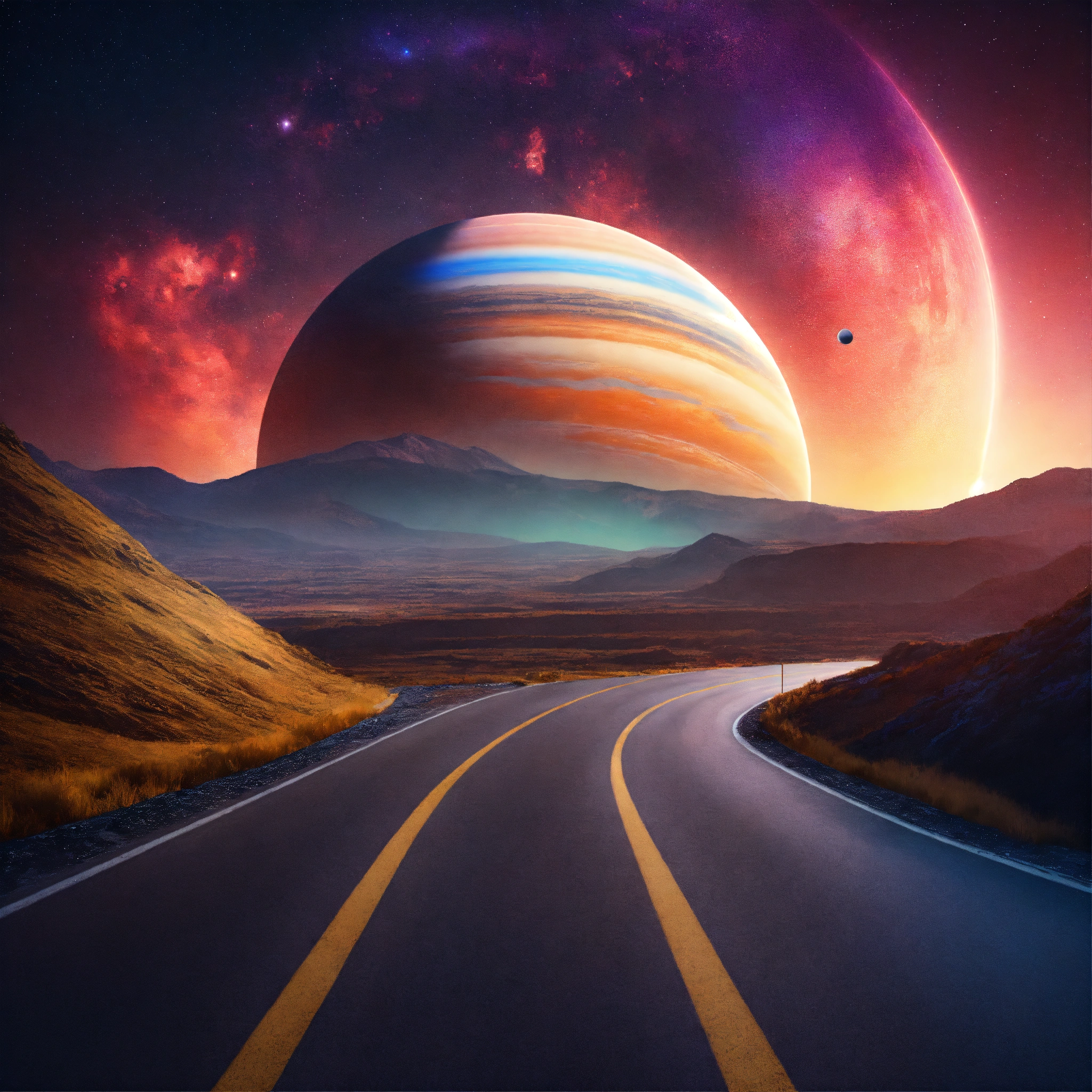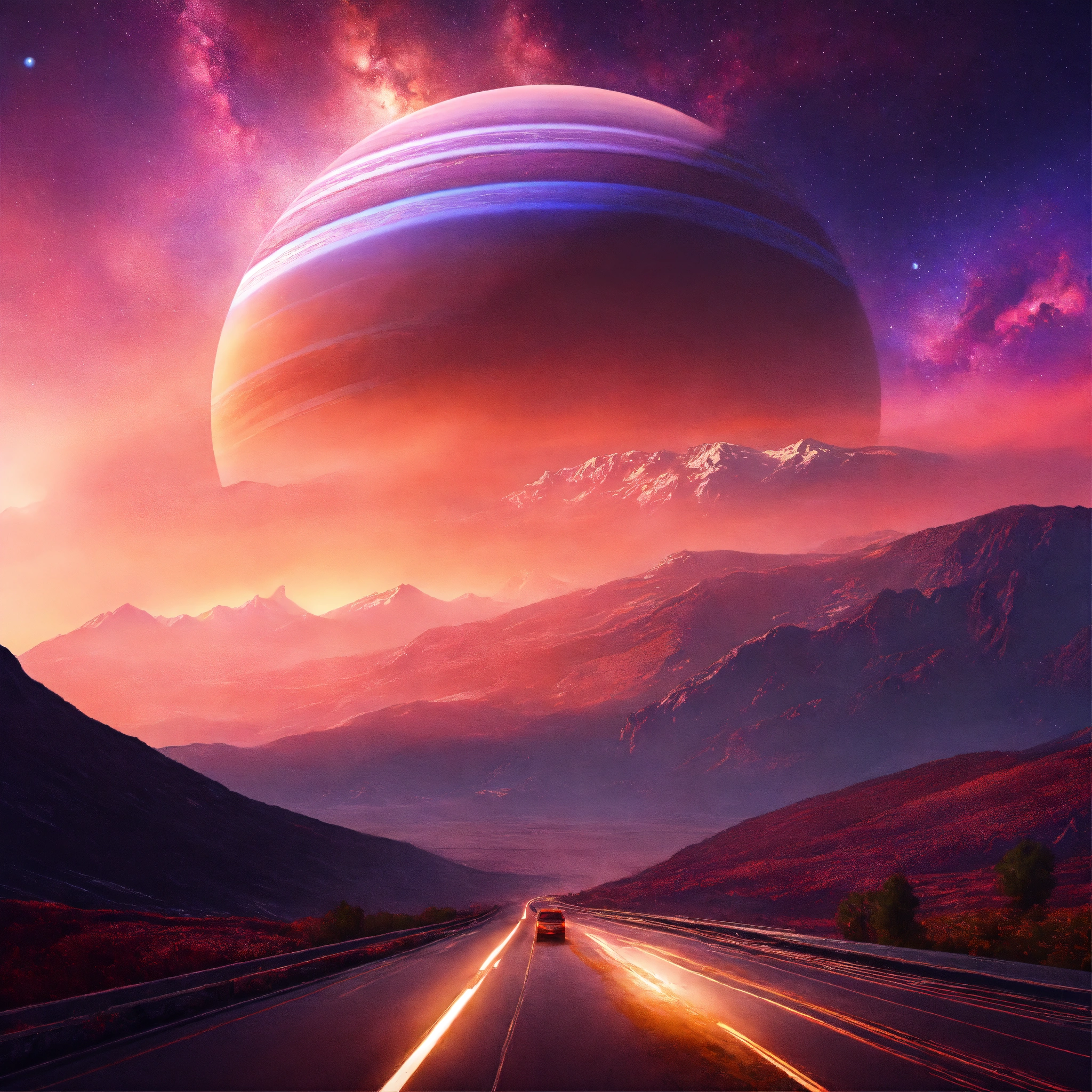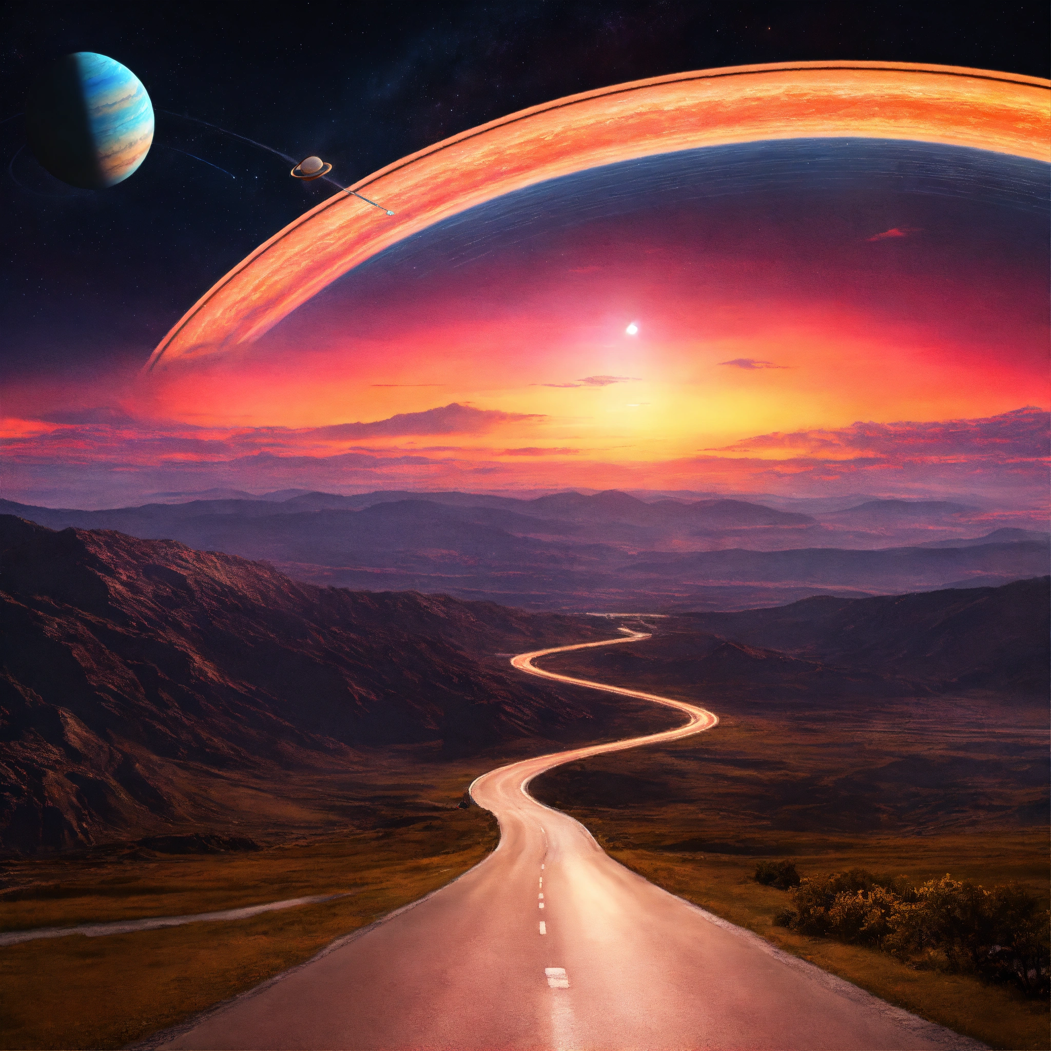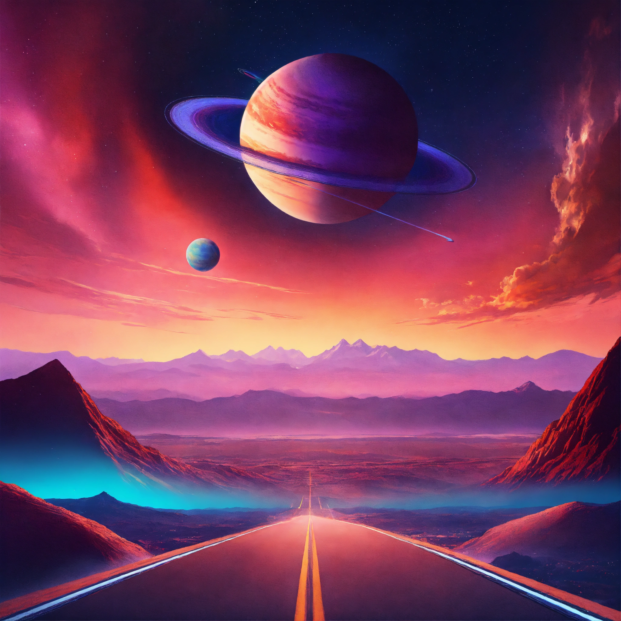 Generates a road and a mountainous space in the background, showing the colorful sky and the planet saturn