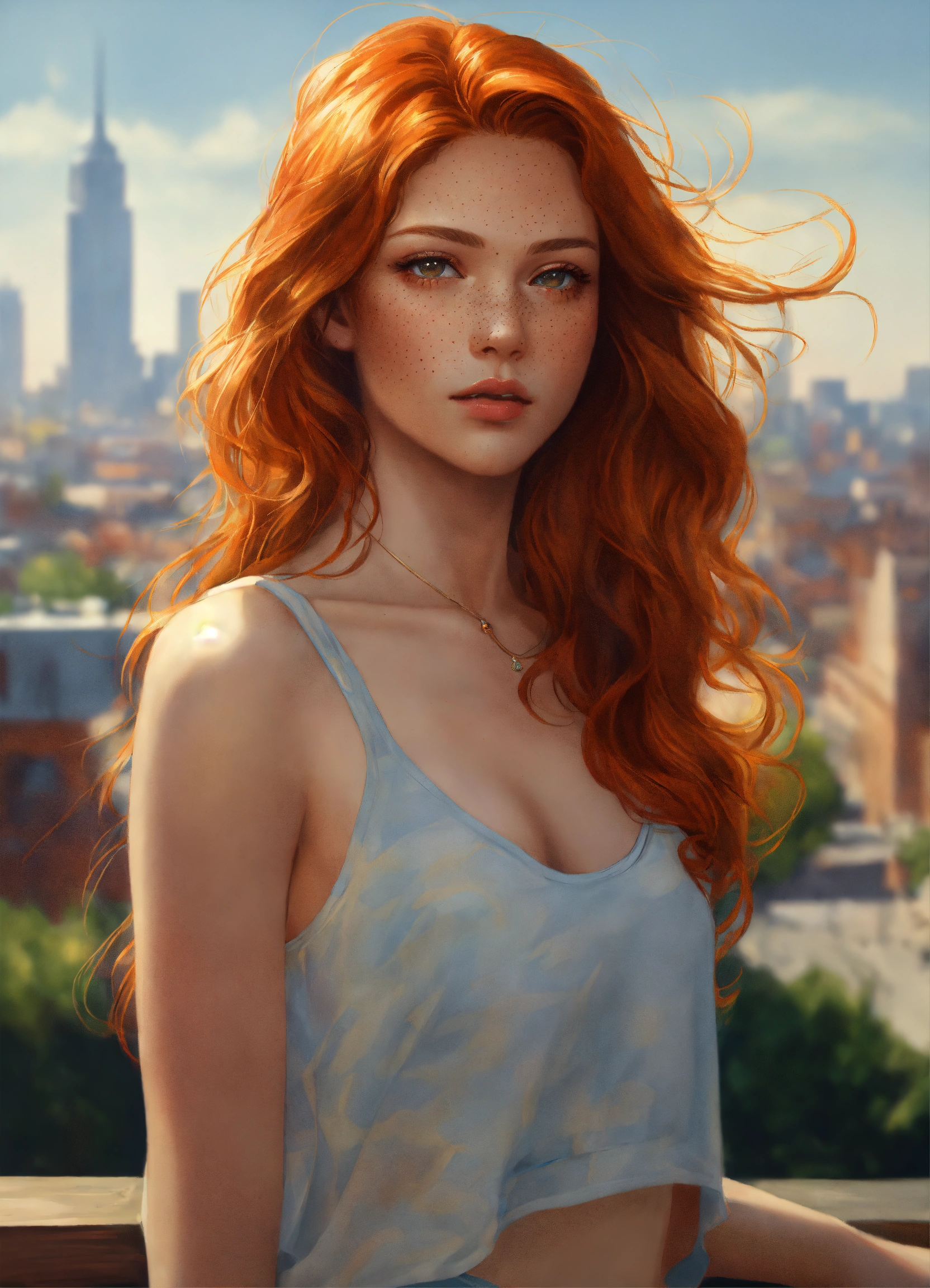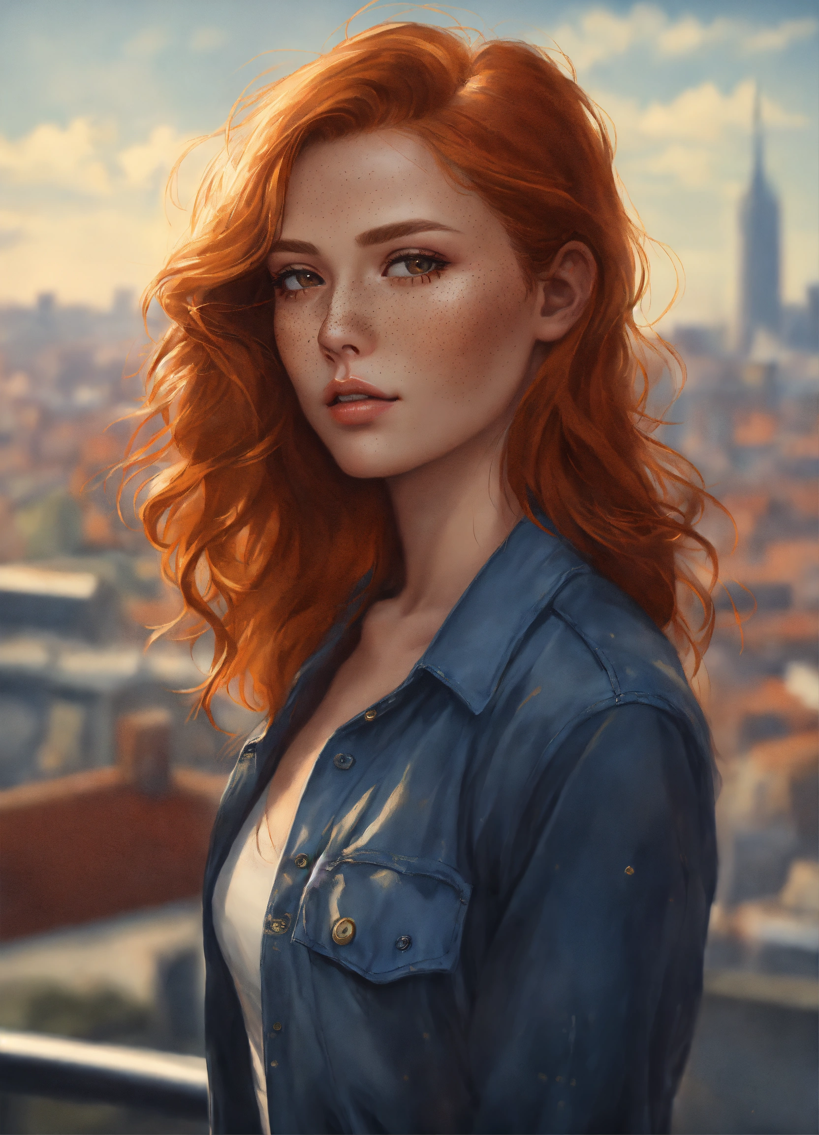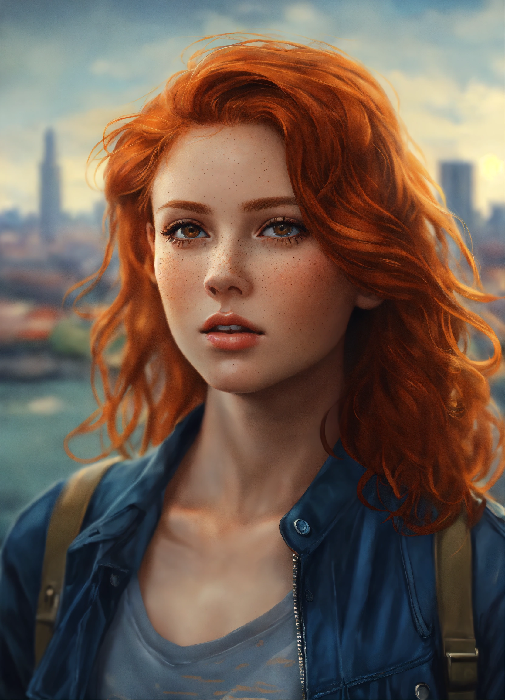 Realistic detailed portrait, stanley artgerm, very coherent. female. 20 years old. modern clothes. city in the background. ginger hair. freckles. cute. nicola cavanis.