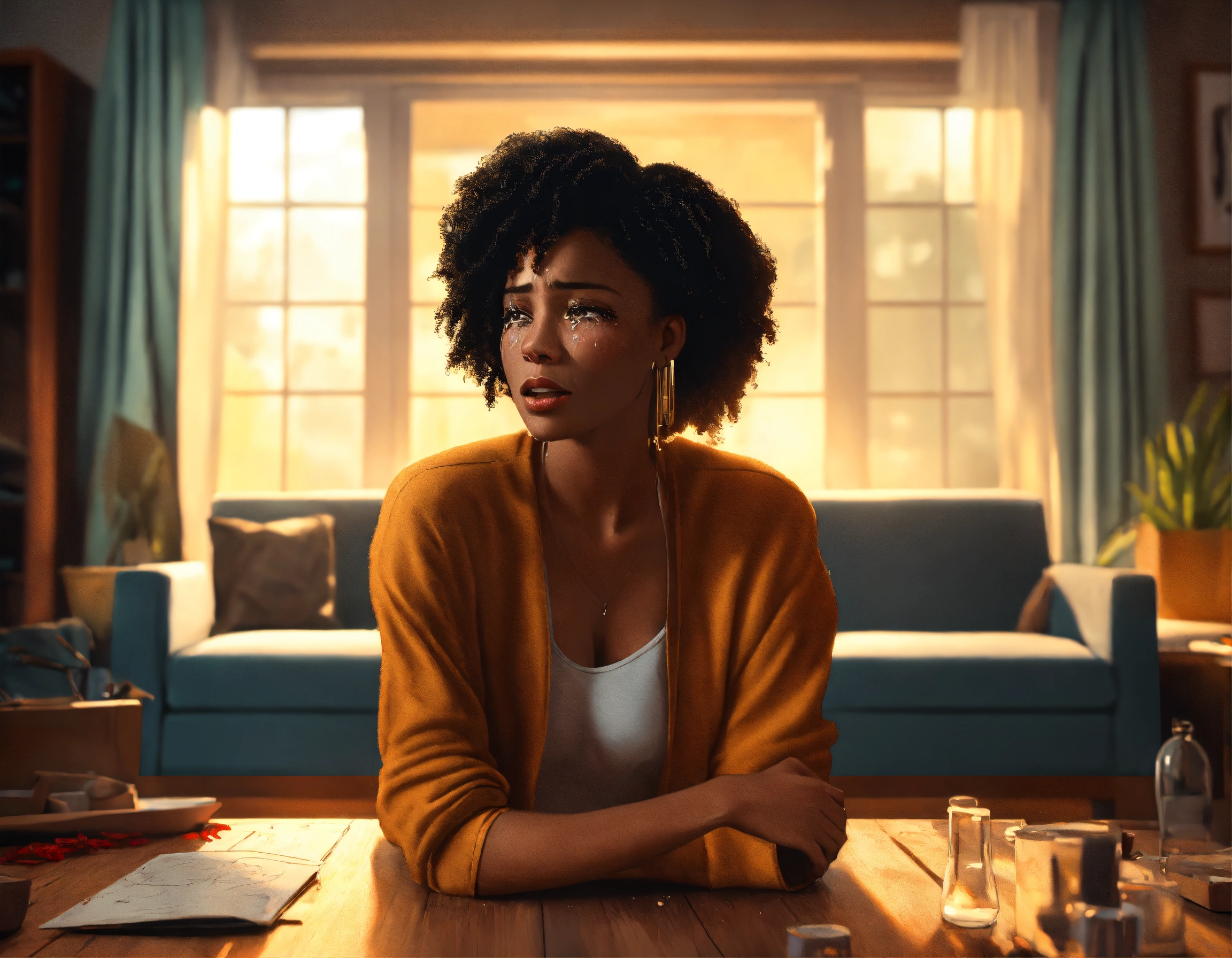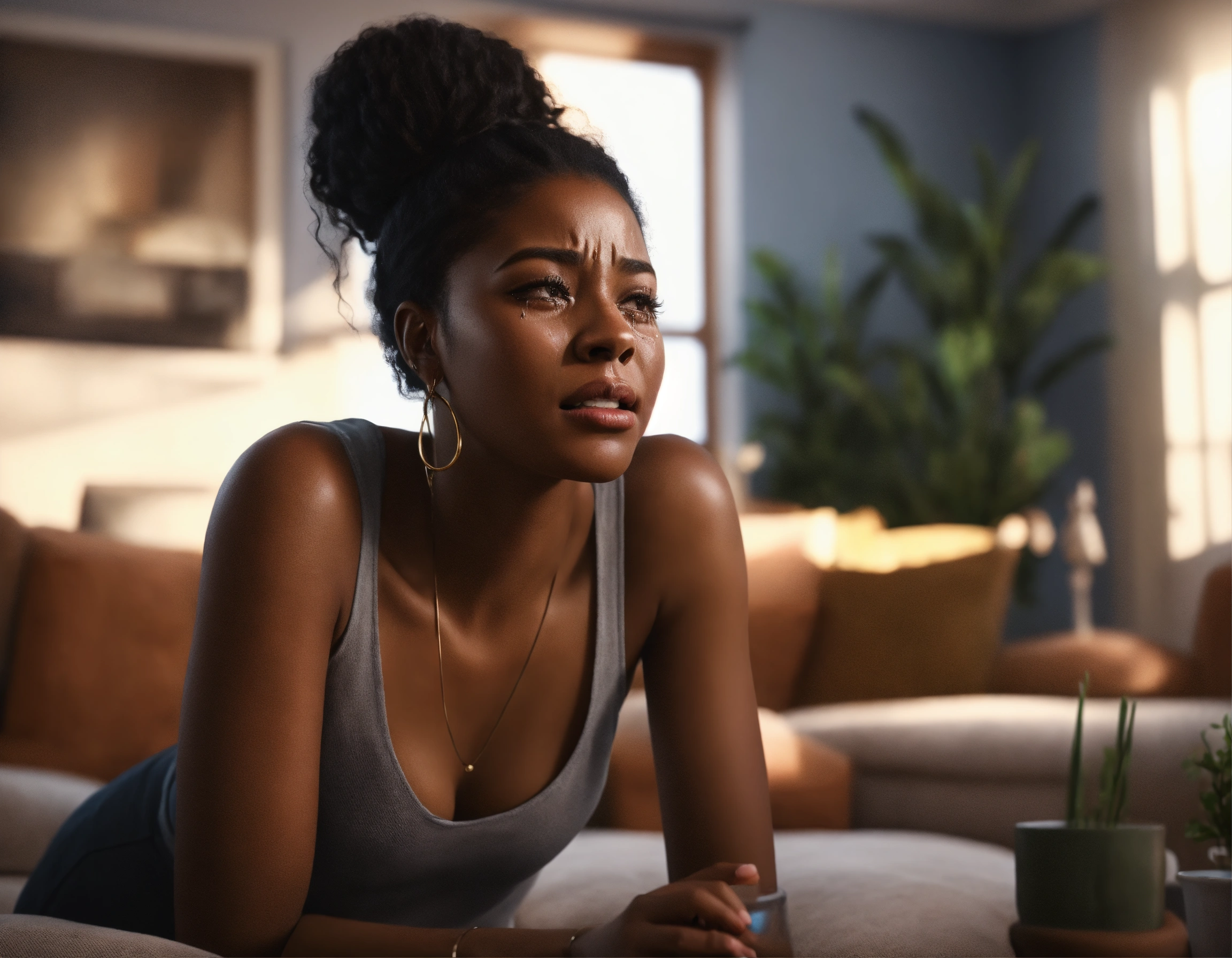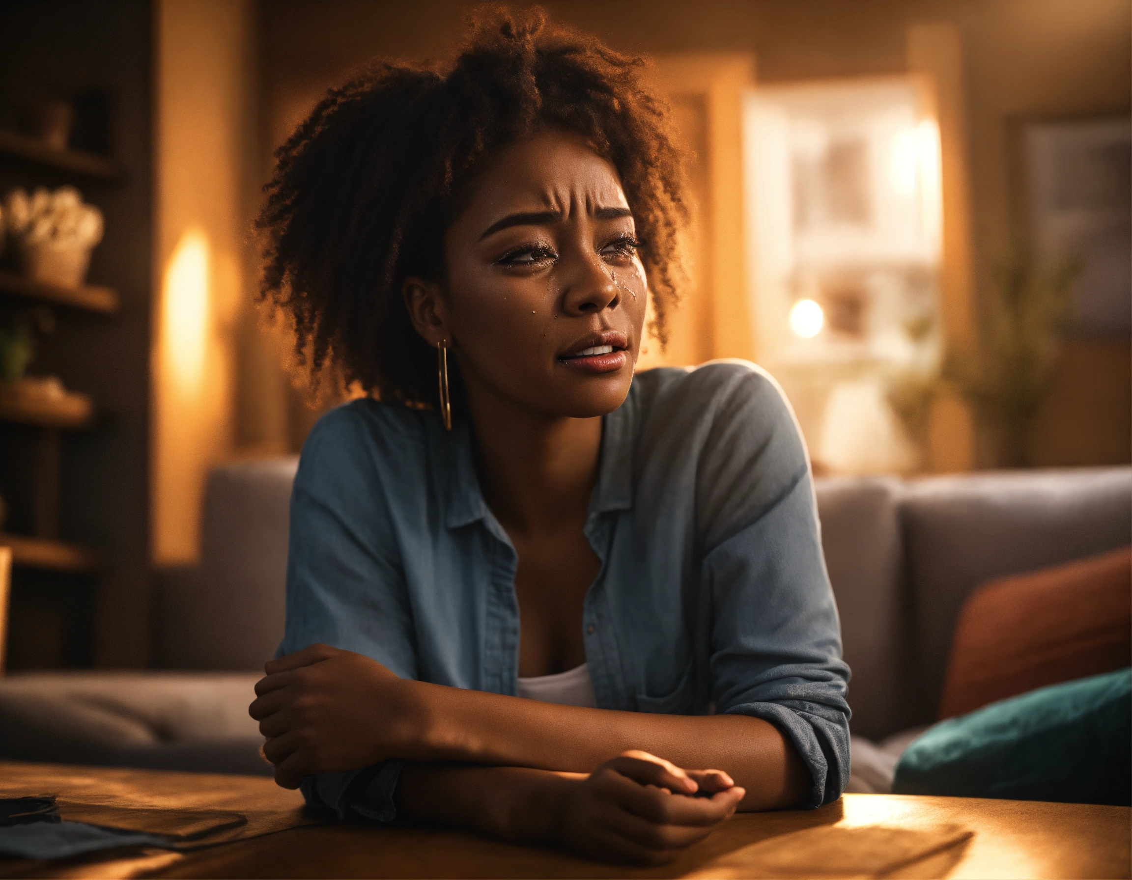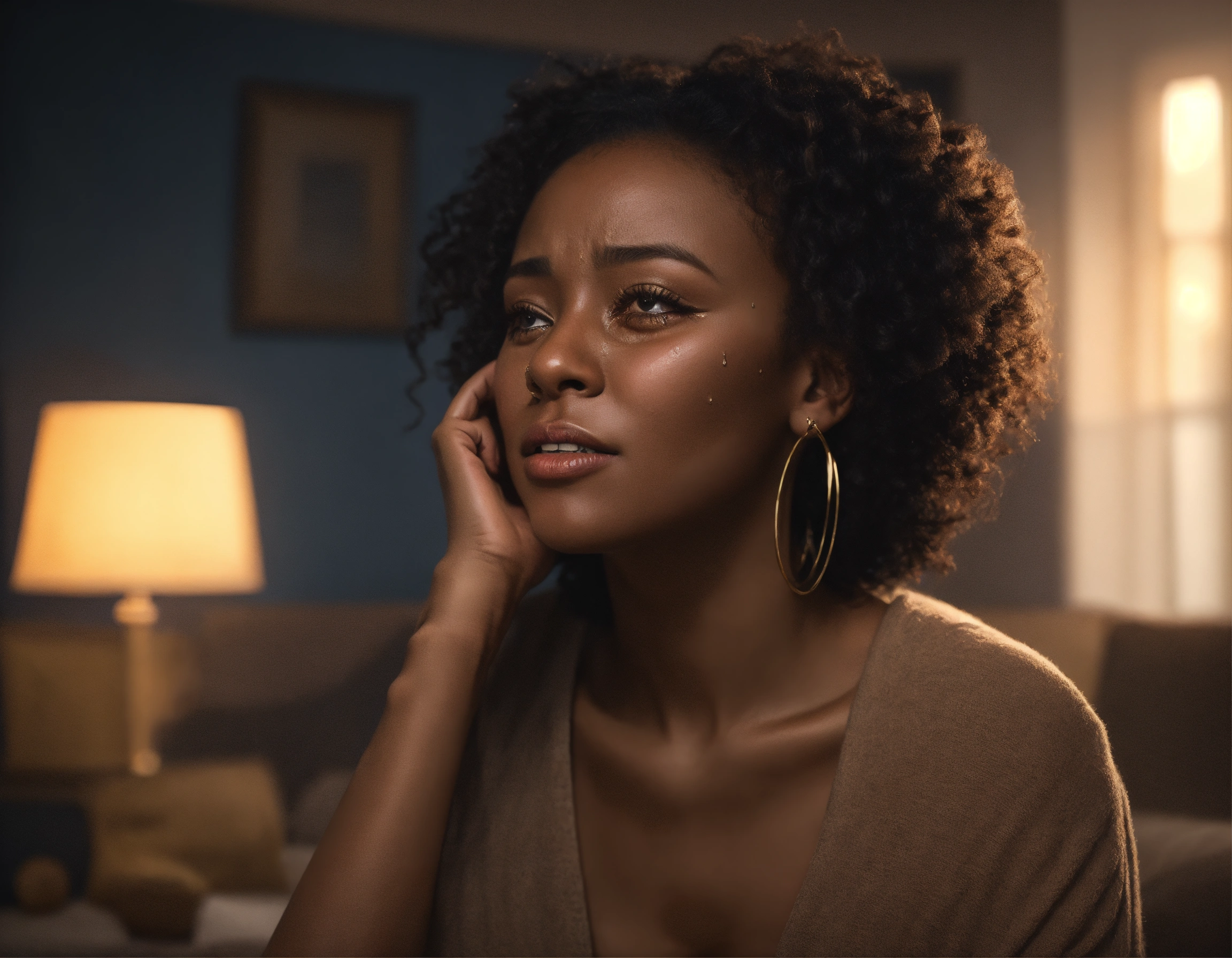 Gorgeous black woman crying in her living room, nice house, 8k rendering, very detailed, real photo, no color painting, no water color, her face is well lit.