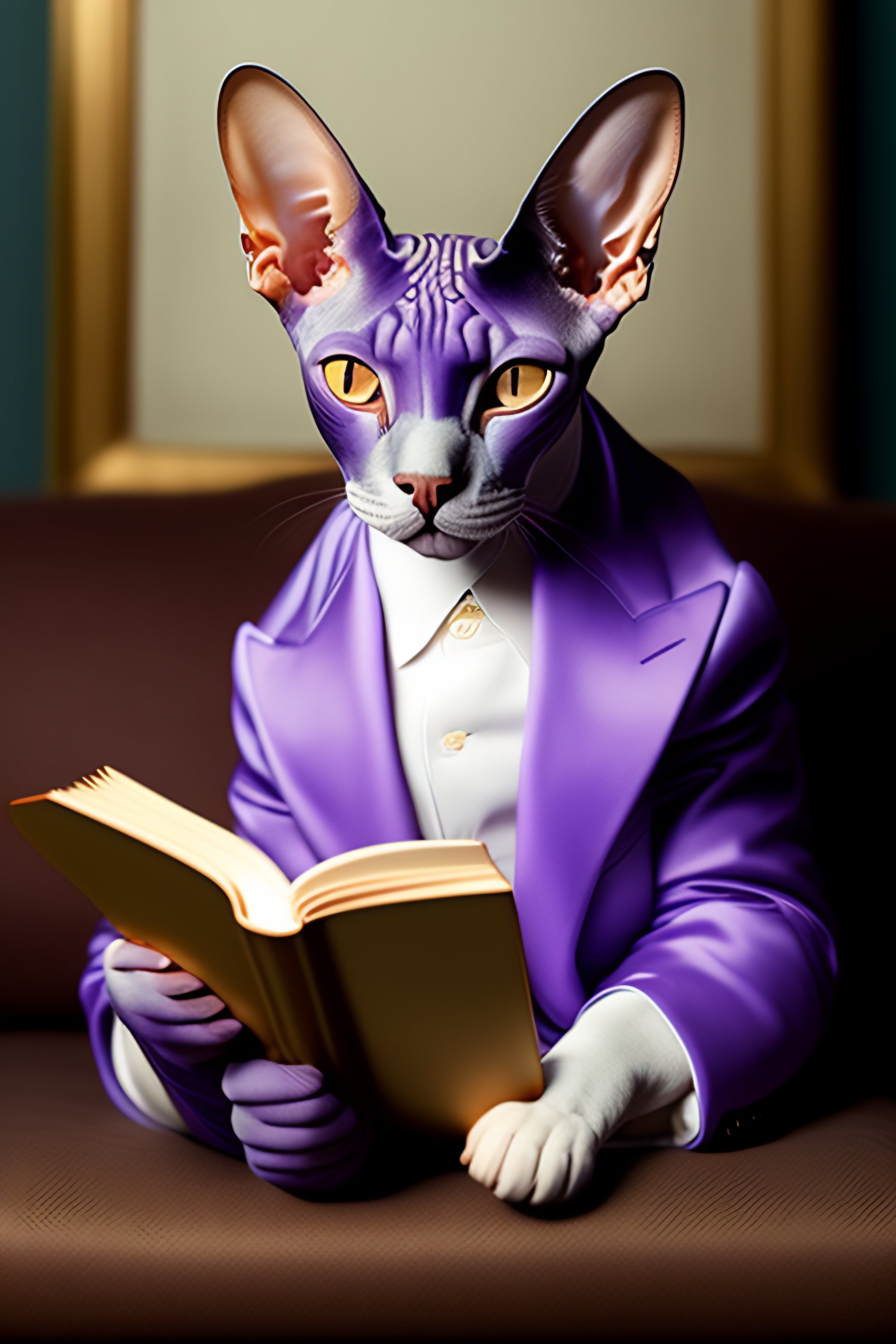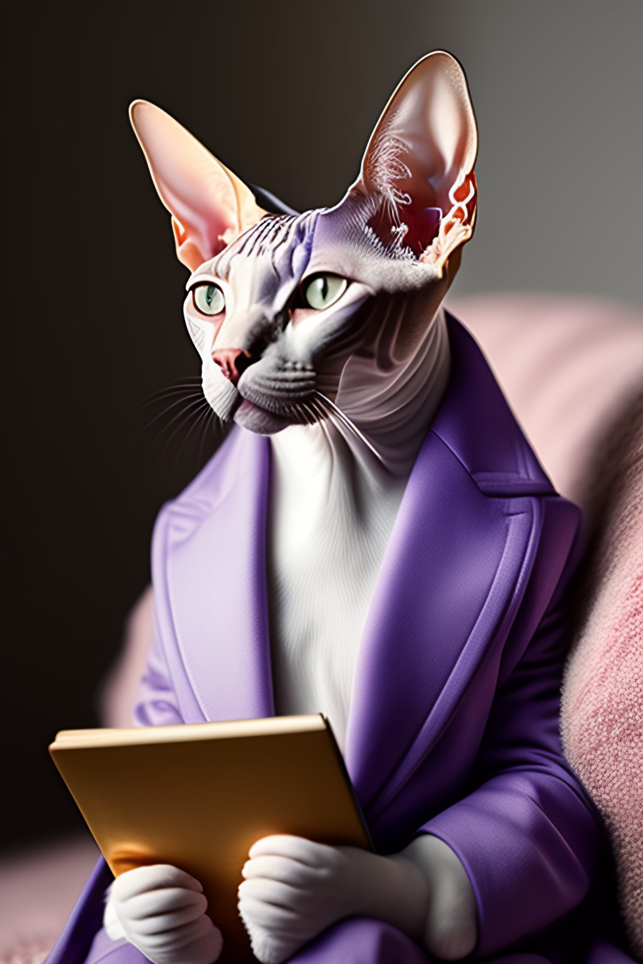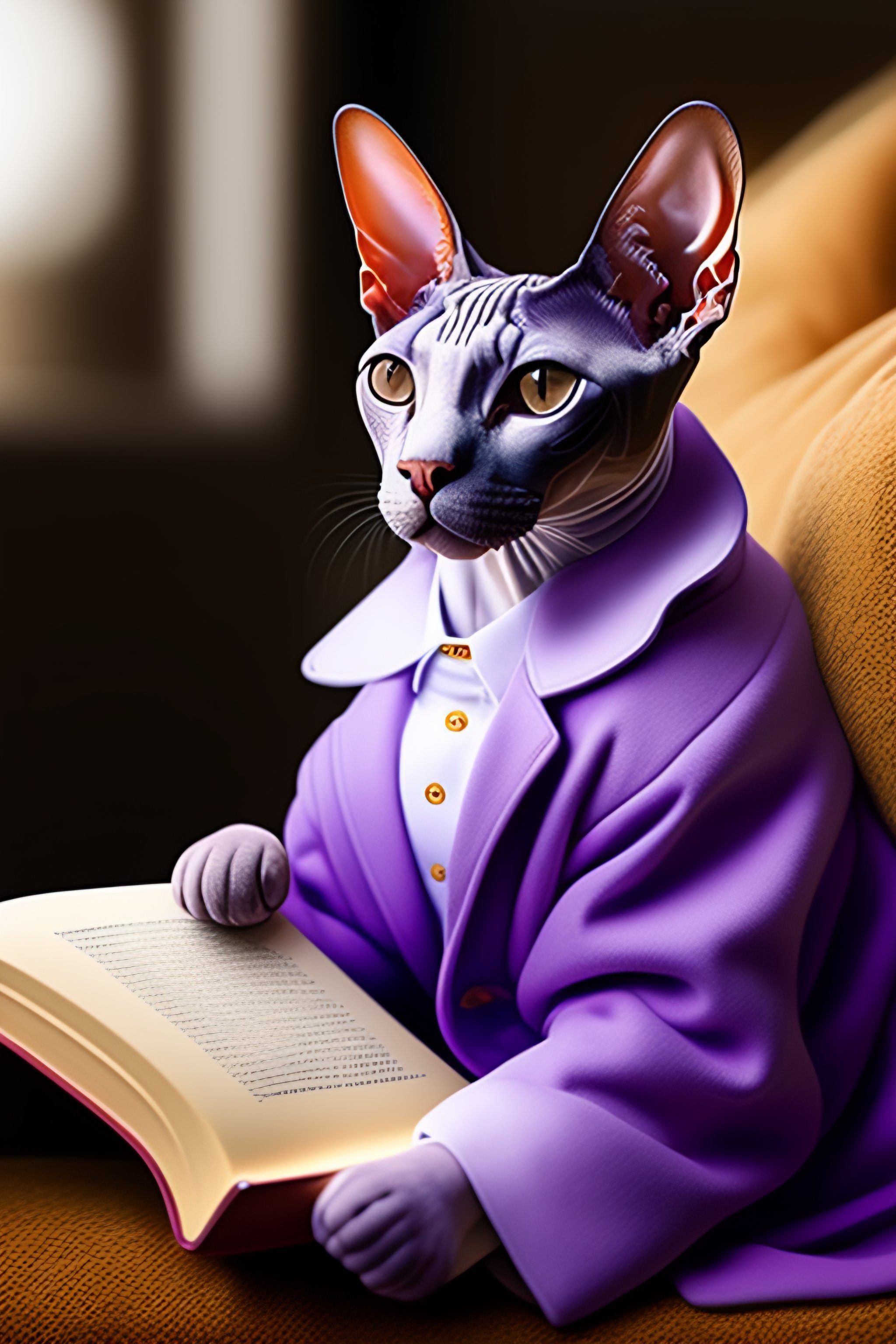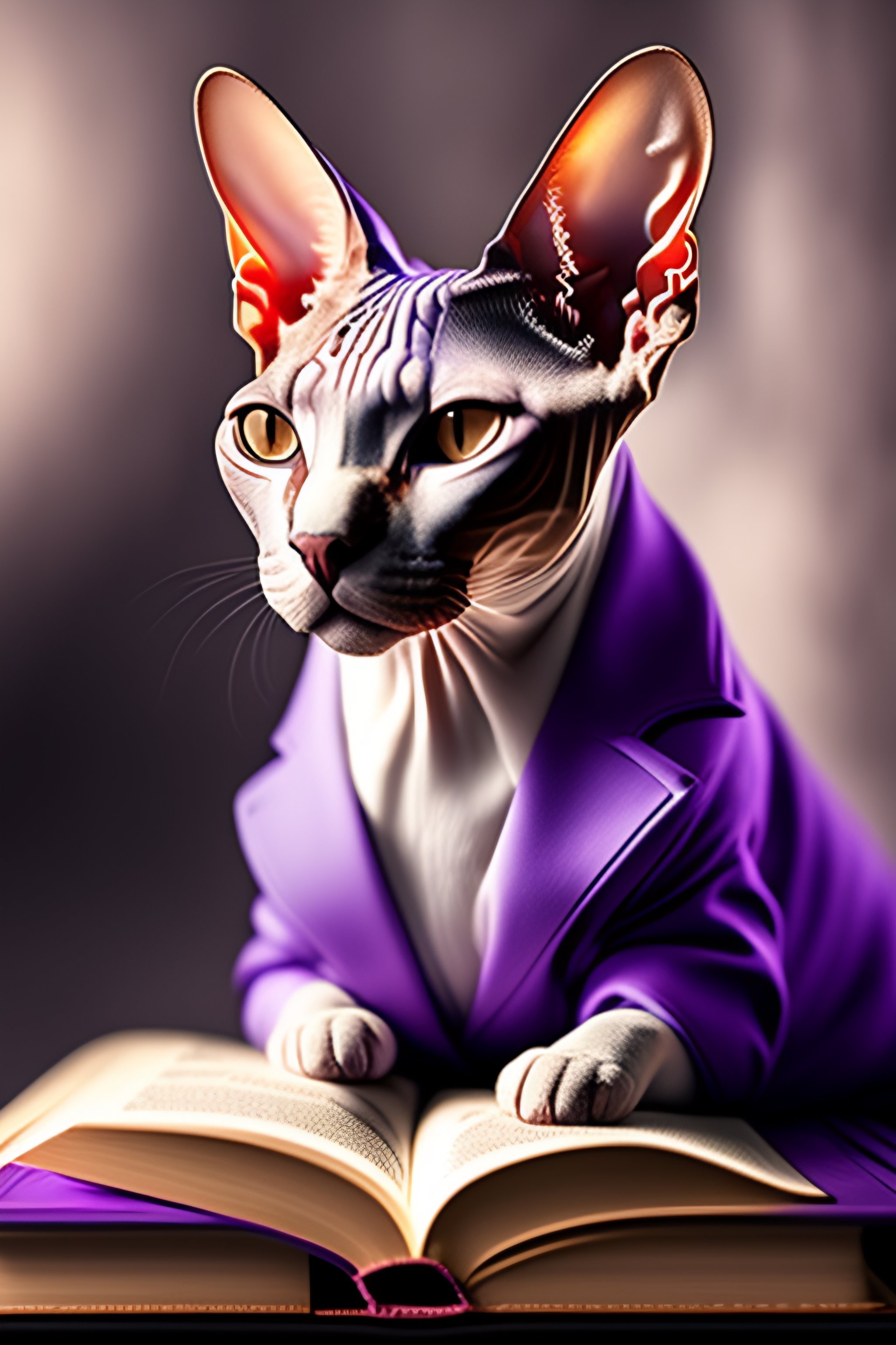 Sphynx cat wearing a lavender jacket reading books