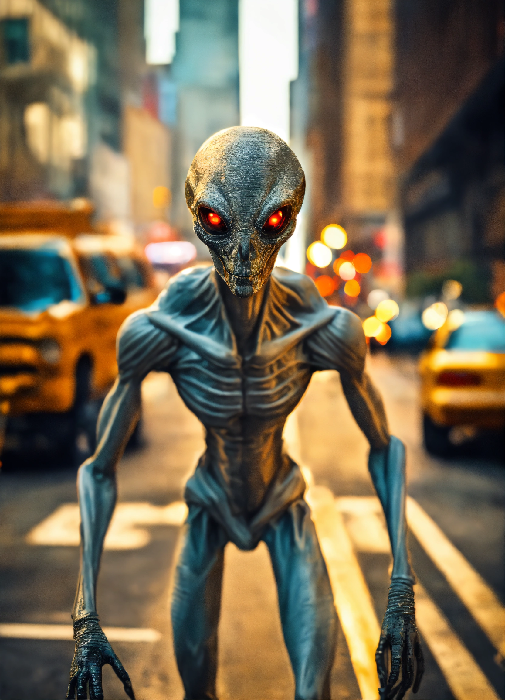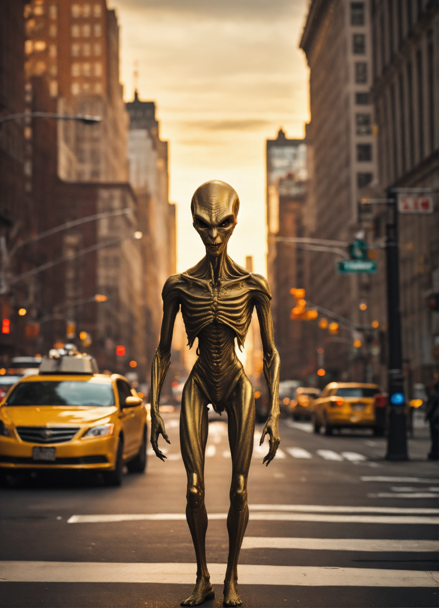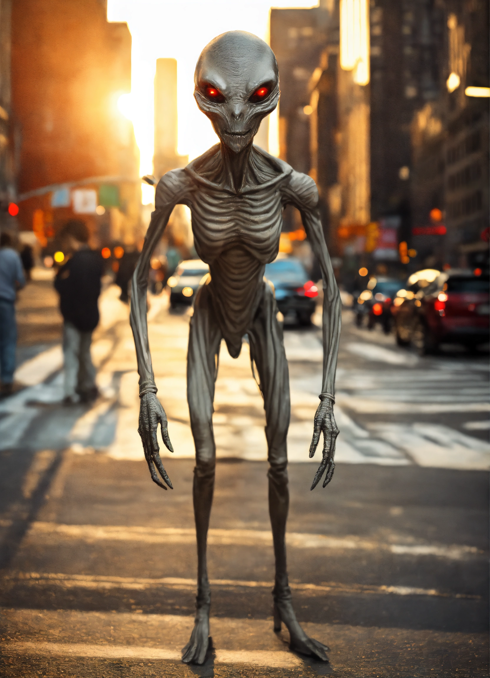 Very creepy evil demonic realistic grey alien standing in the street, new york city, unsettling, wide angle, golden hour, ominous, highly detailed and realistic, inspired by seti