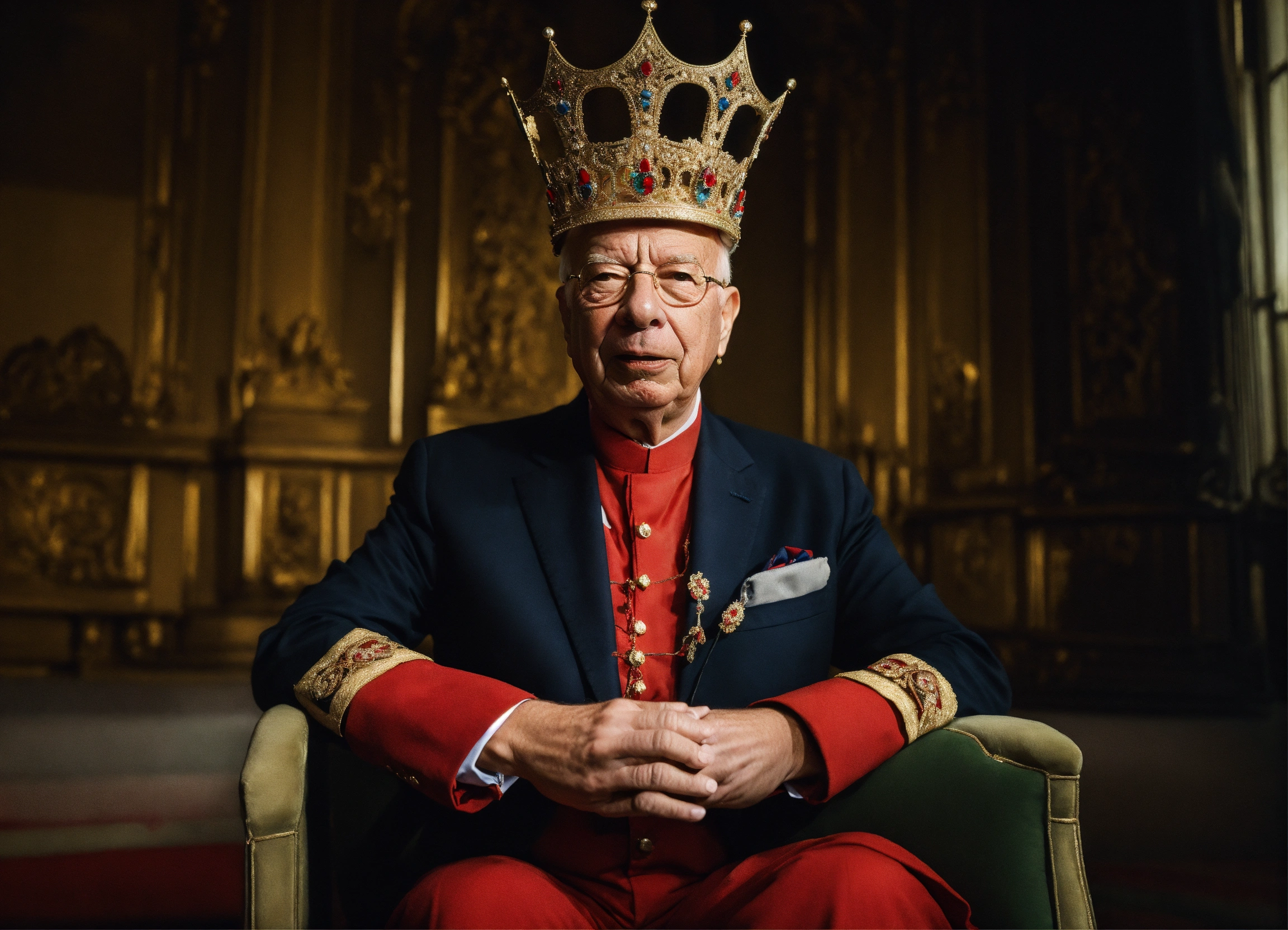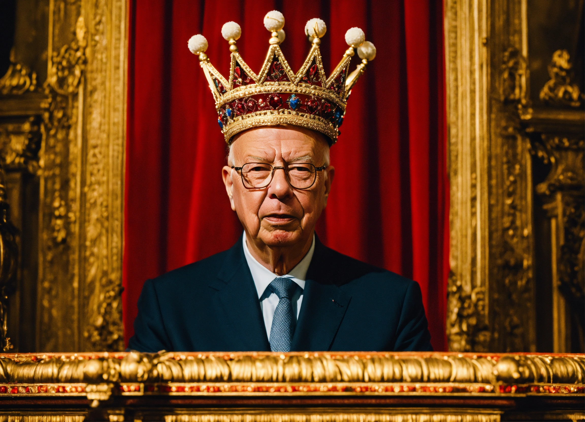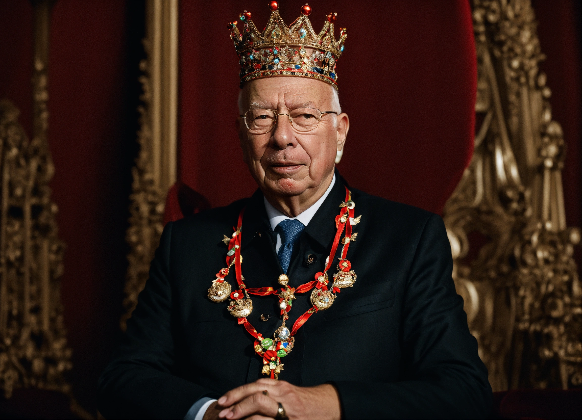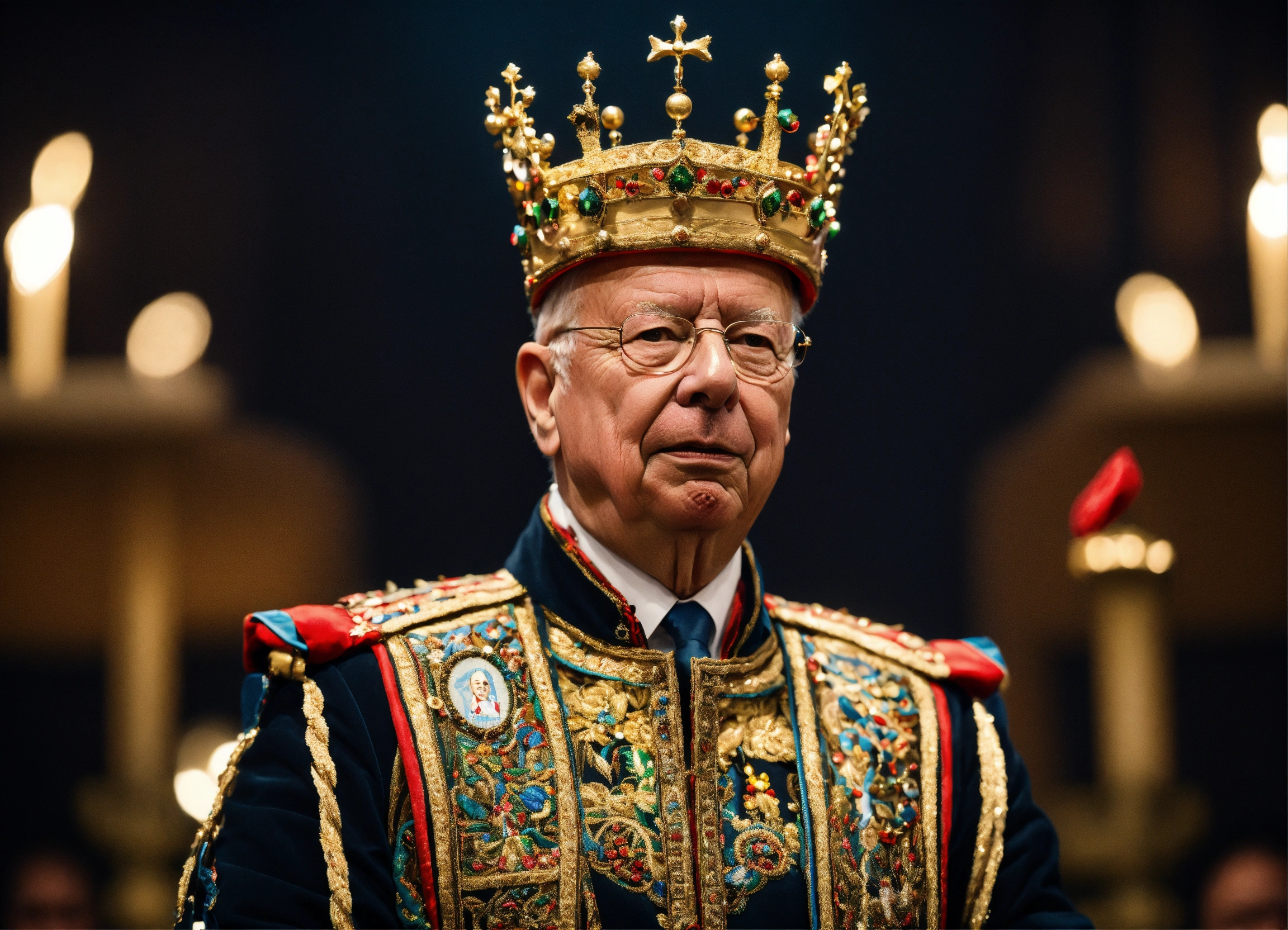 Klaus schwab wearing a crown and holding the strings of marionette's
