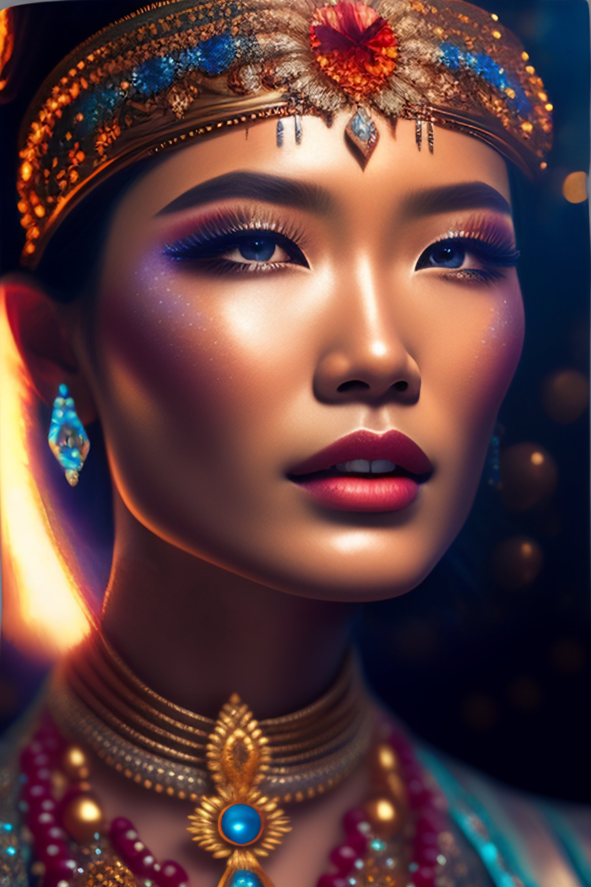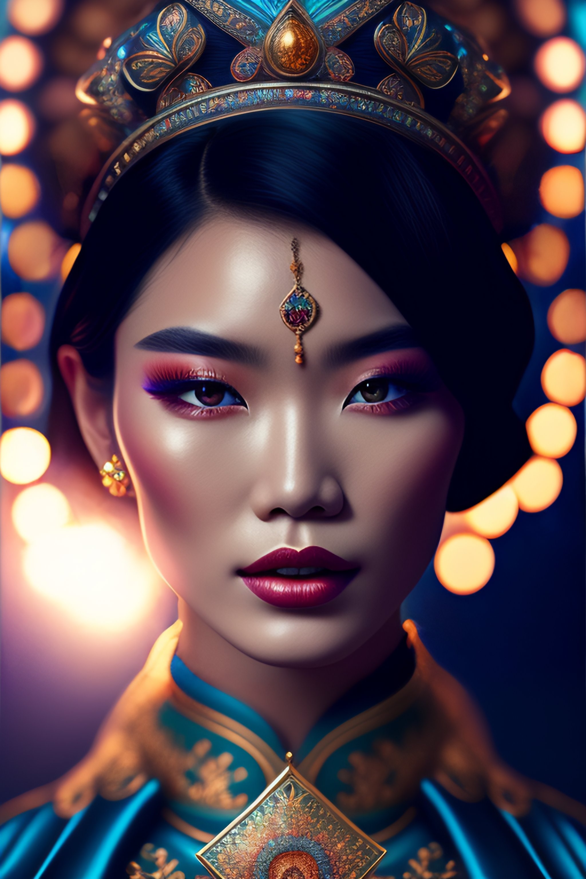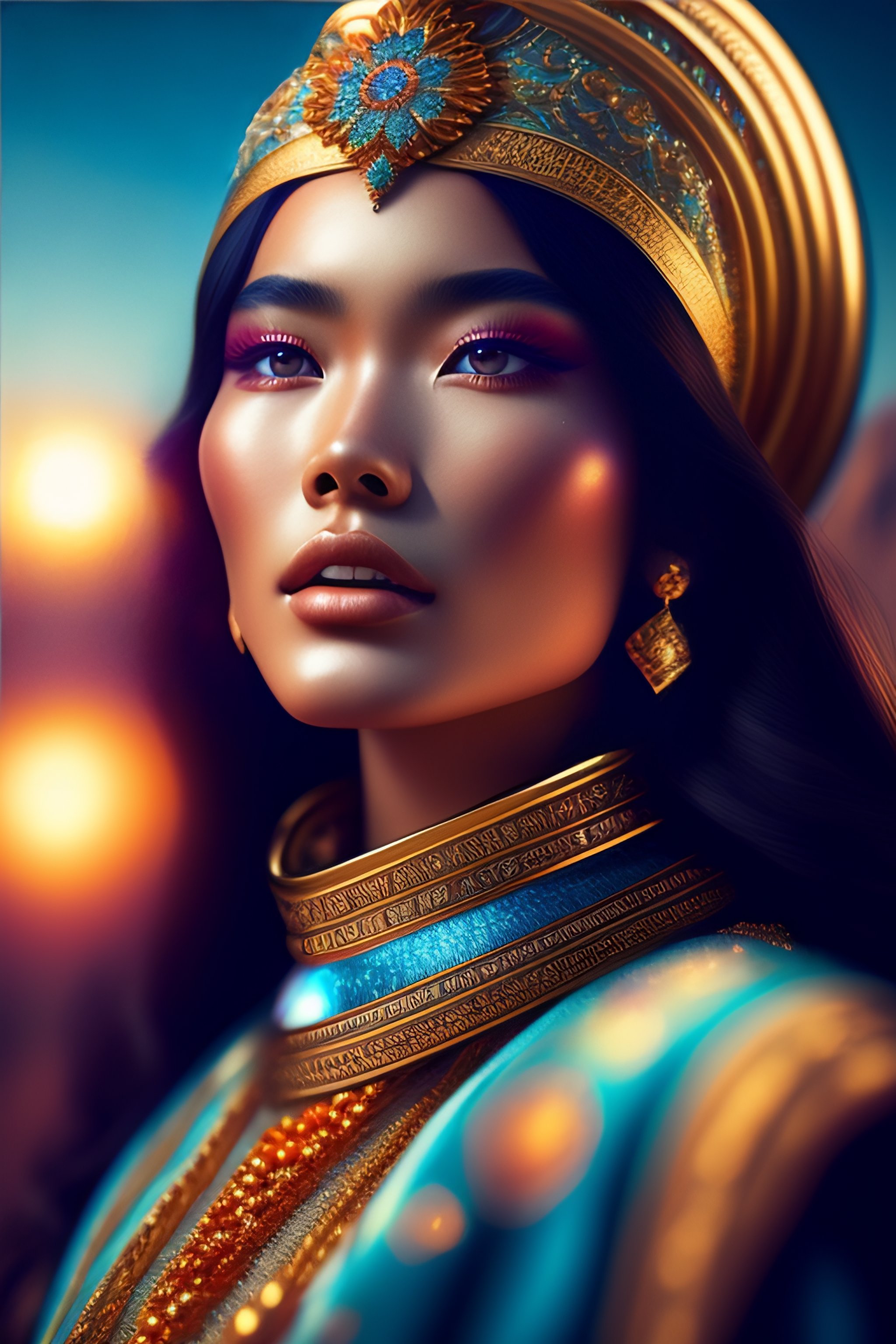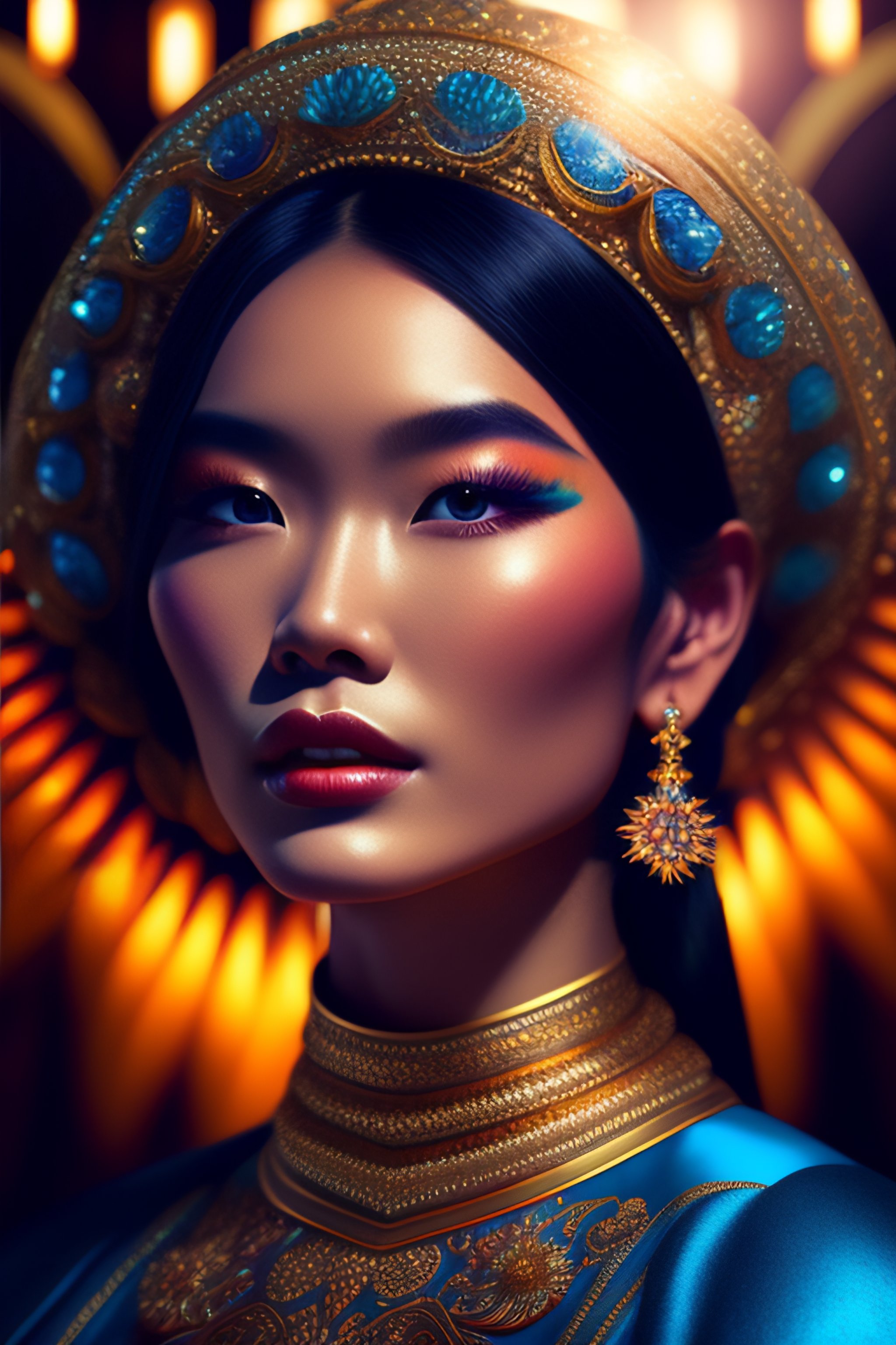 From behind, of a spiritual brunette vietnames girl on a mountain, sunburst arround her head, small cross pendent necklace, happy loyal face, blue eyelashes inside a kitsch church, style of sports illustrated and aldridge, photography, hyperrealistic, cinematic, detailed, 8k, classical, sunburst in heaven, in the style of lachapelle and aldridge: : ornate, dynamic, particulate, rich colors, intricate, elegant, highly detailed, the vogue, harper's bazaar art, fashion magazine, smooth, sharp focus, 8 k, octane render, blue eyelashes