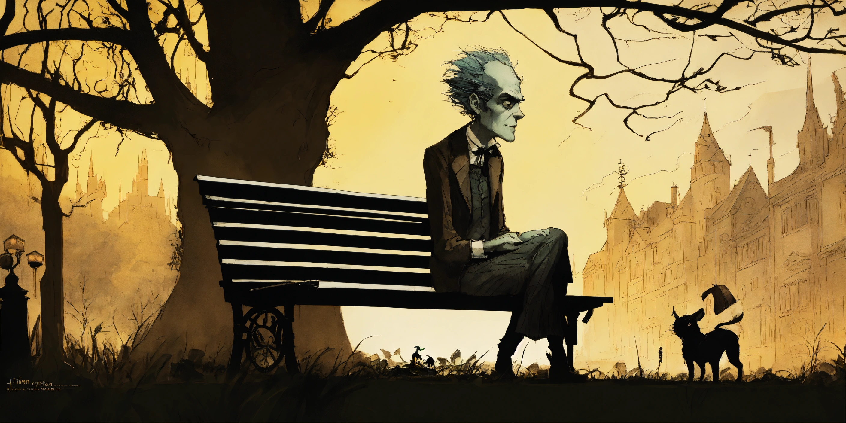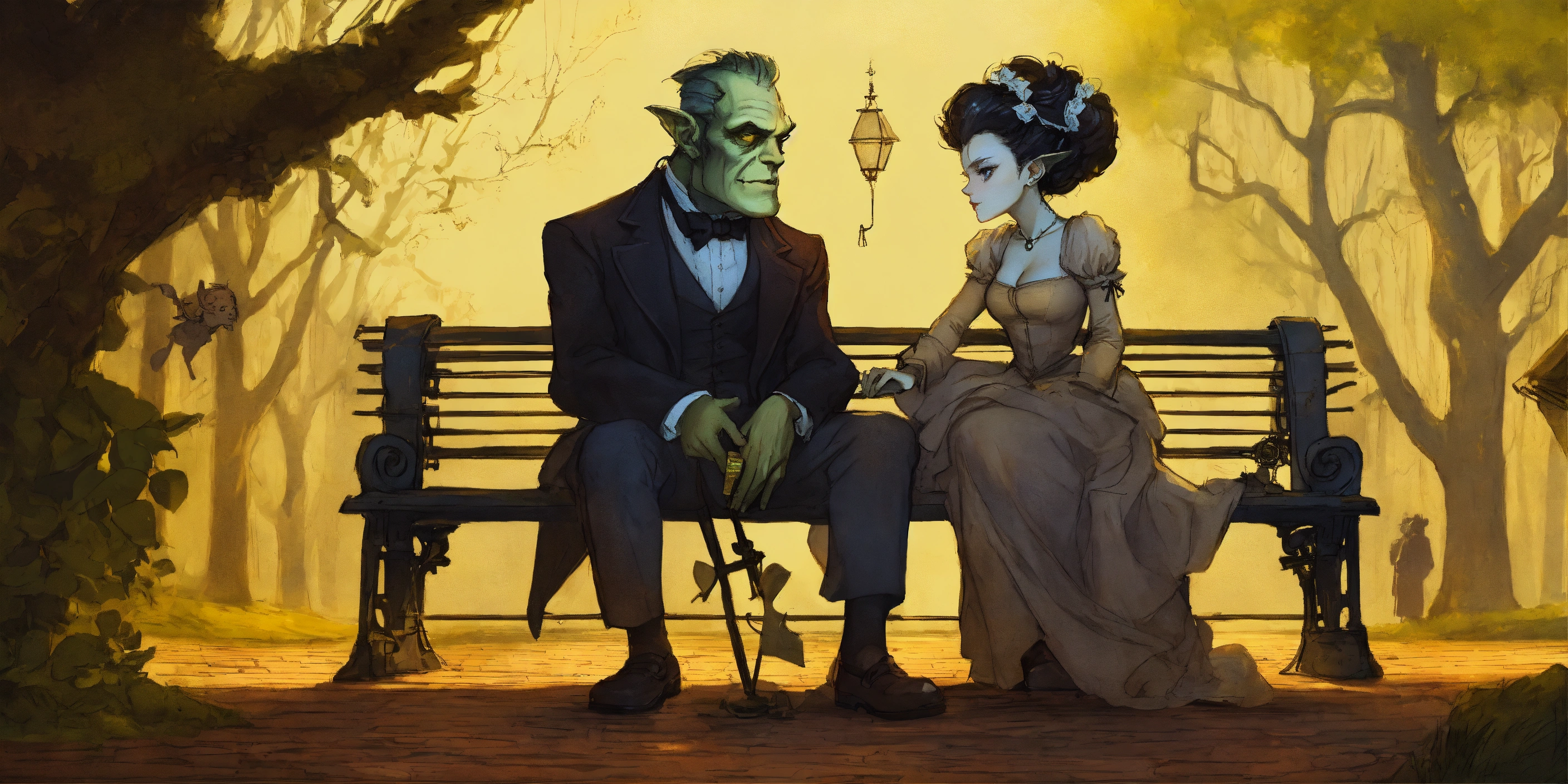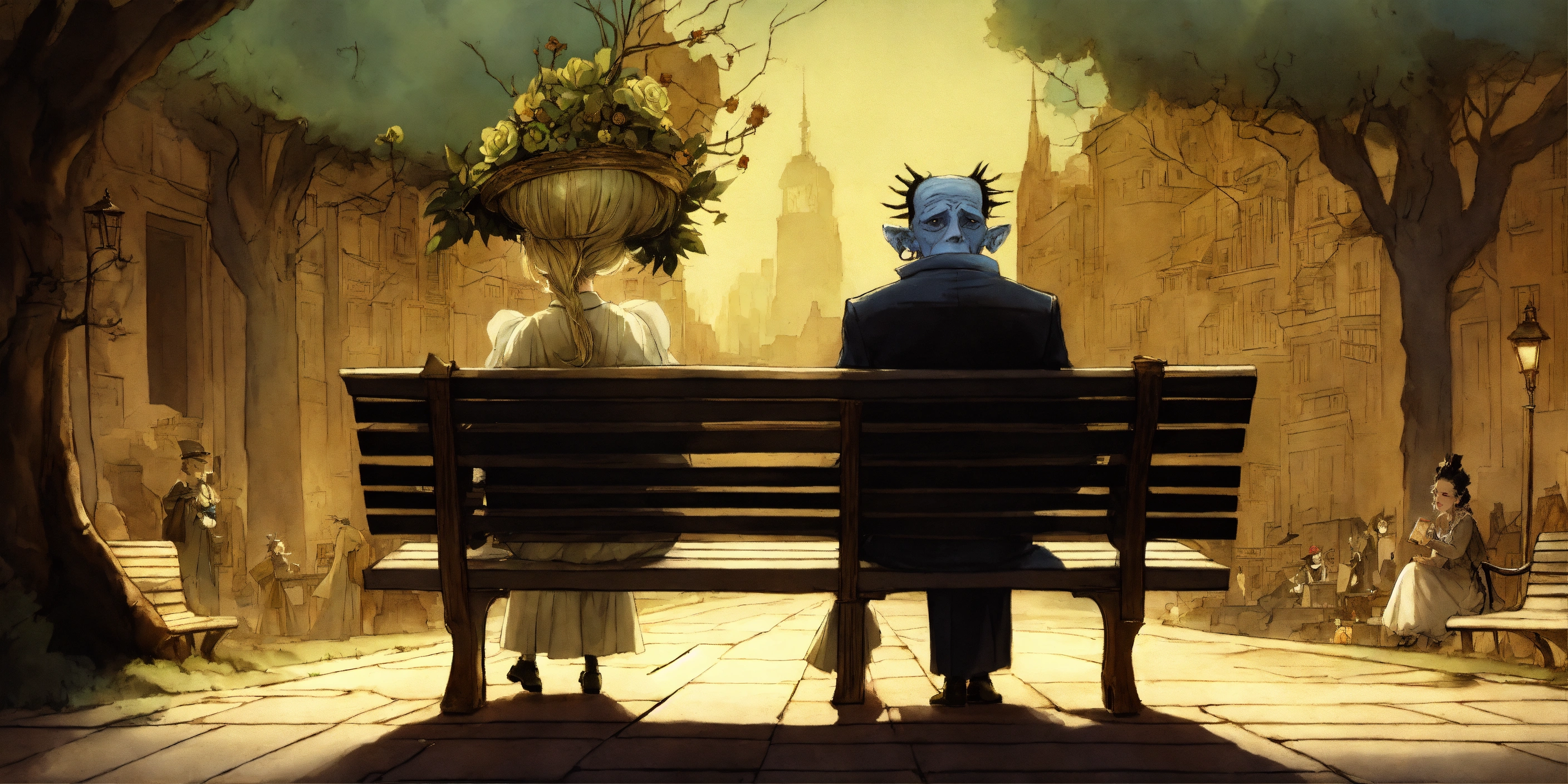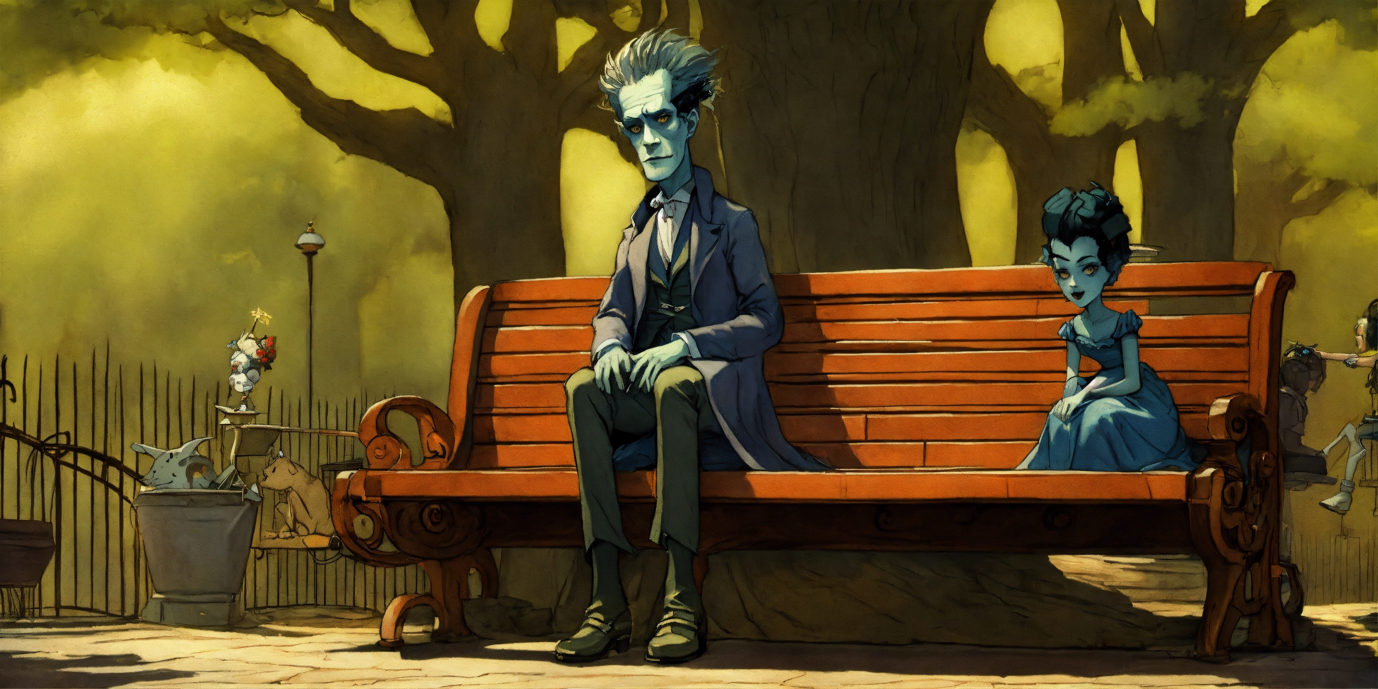 By gris grimly, maurice sendak, frankenstein and bride of frankenstein sitting on a park bench, in the style of jean-baptiste monge, tim burton, remedios varo, juni ito, giorgio de chirico 8k resolution concept art trending on artstation hyperdetailed medium shot, vignette 8k resolution hyperdetailed intricate liminal eerie precisionism dslr filmic, cinematic, sharp focus, brightly lit.