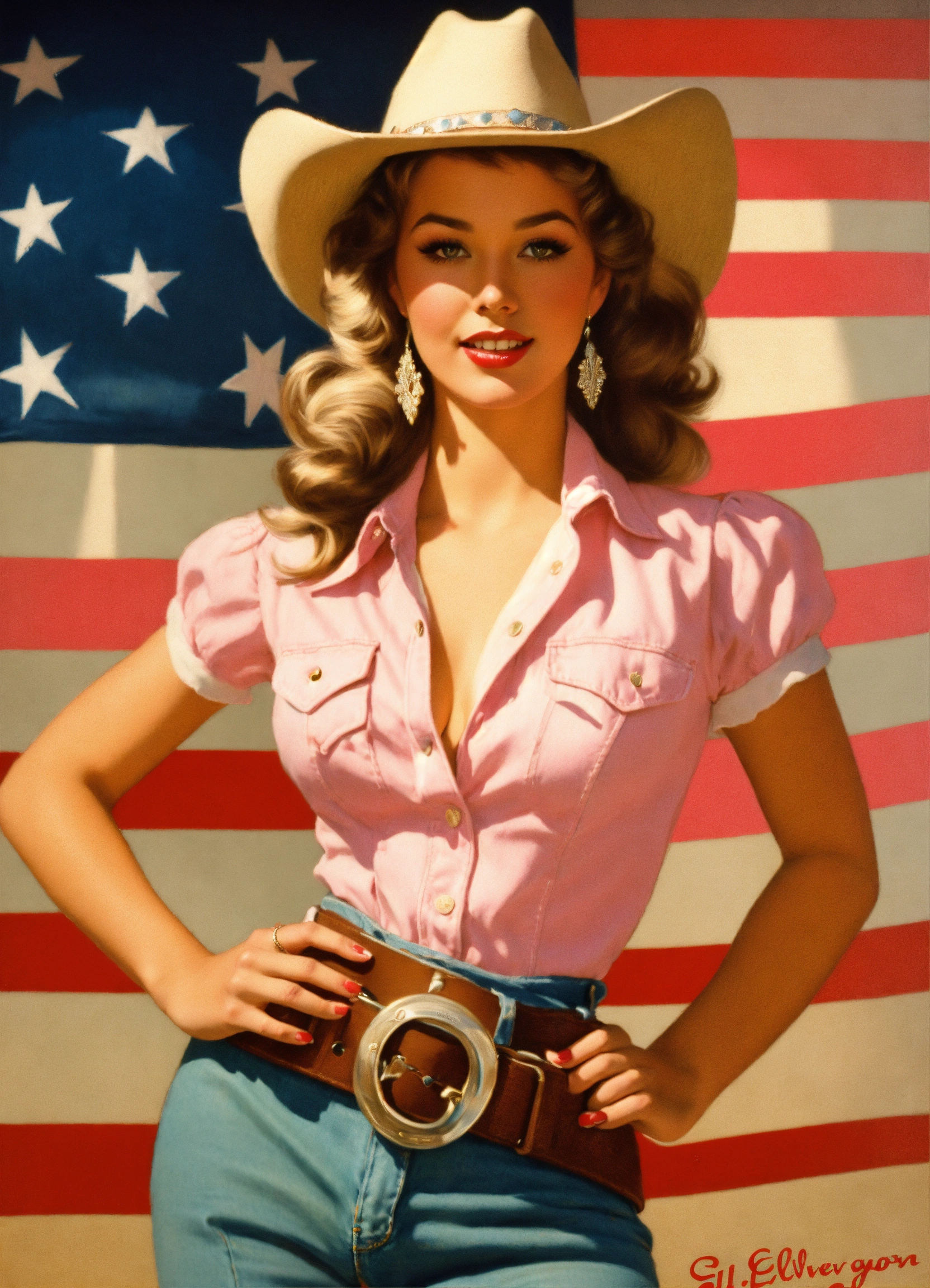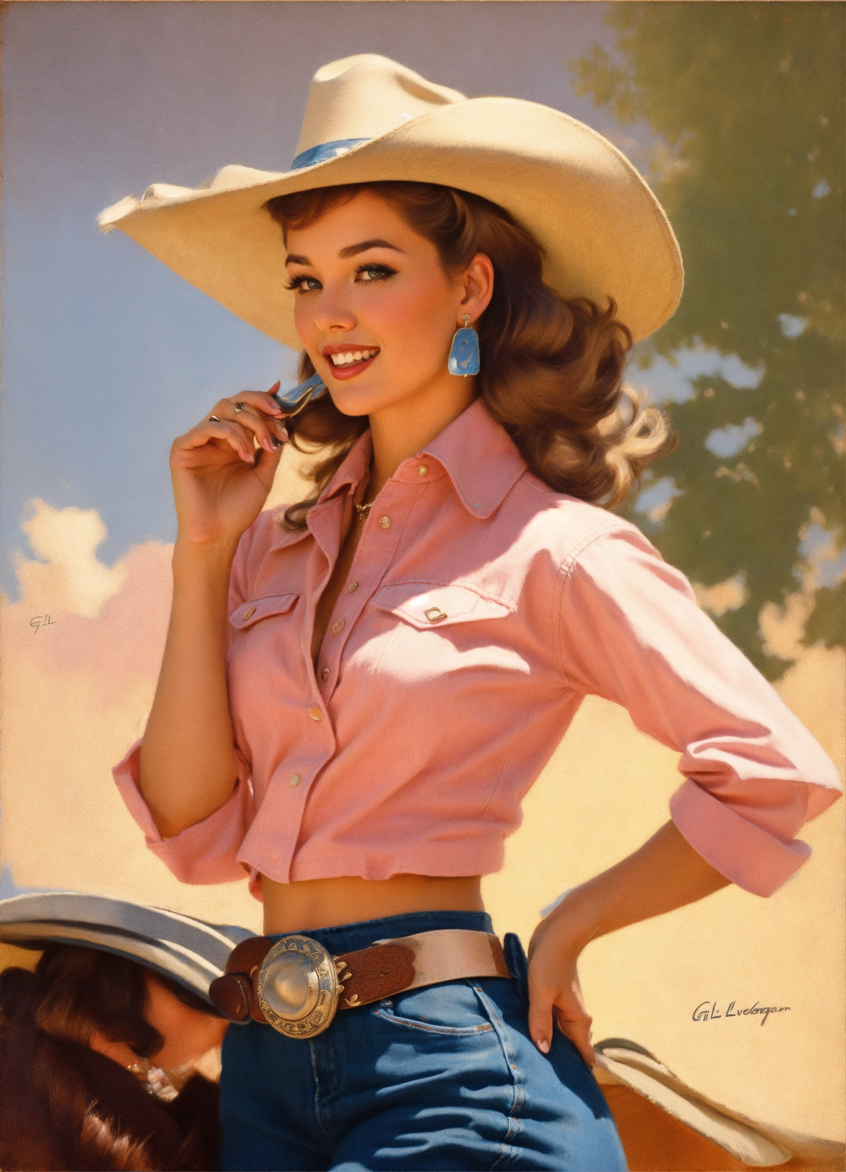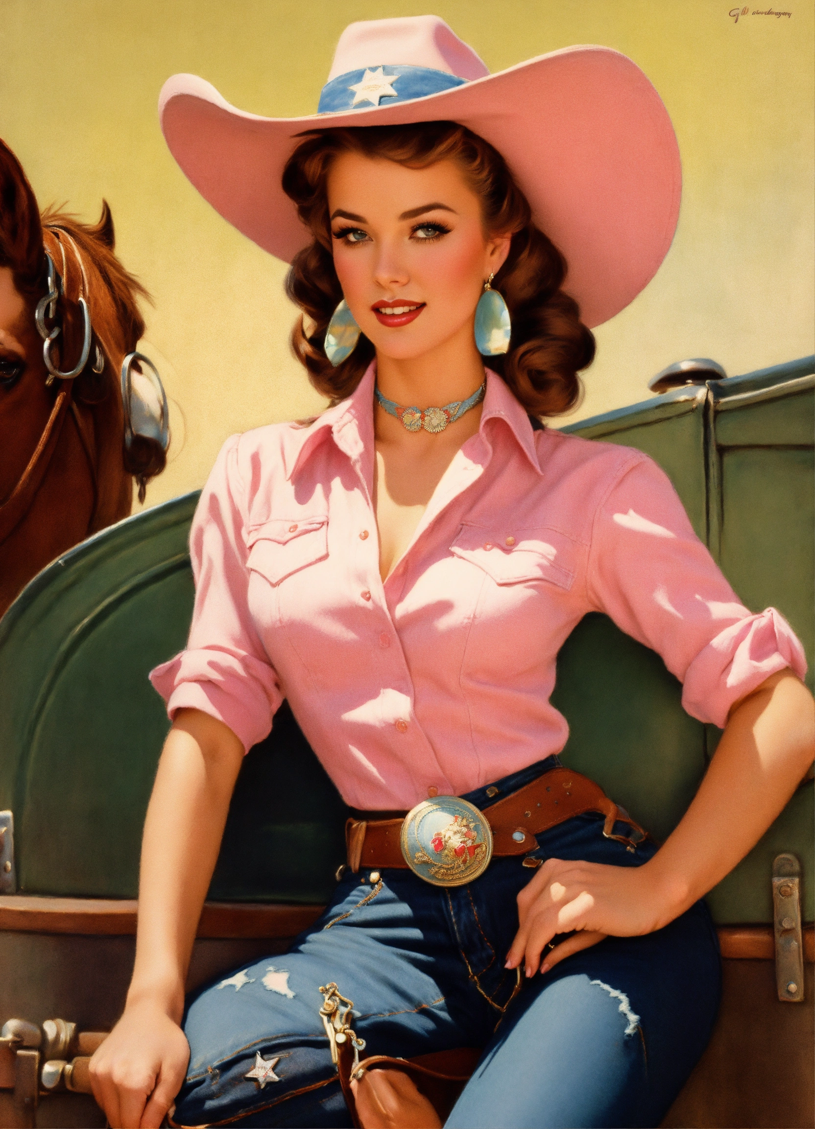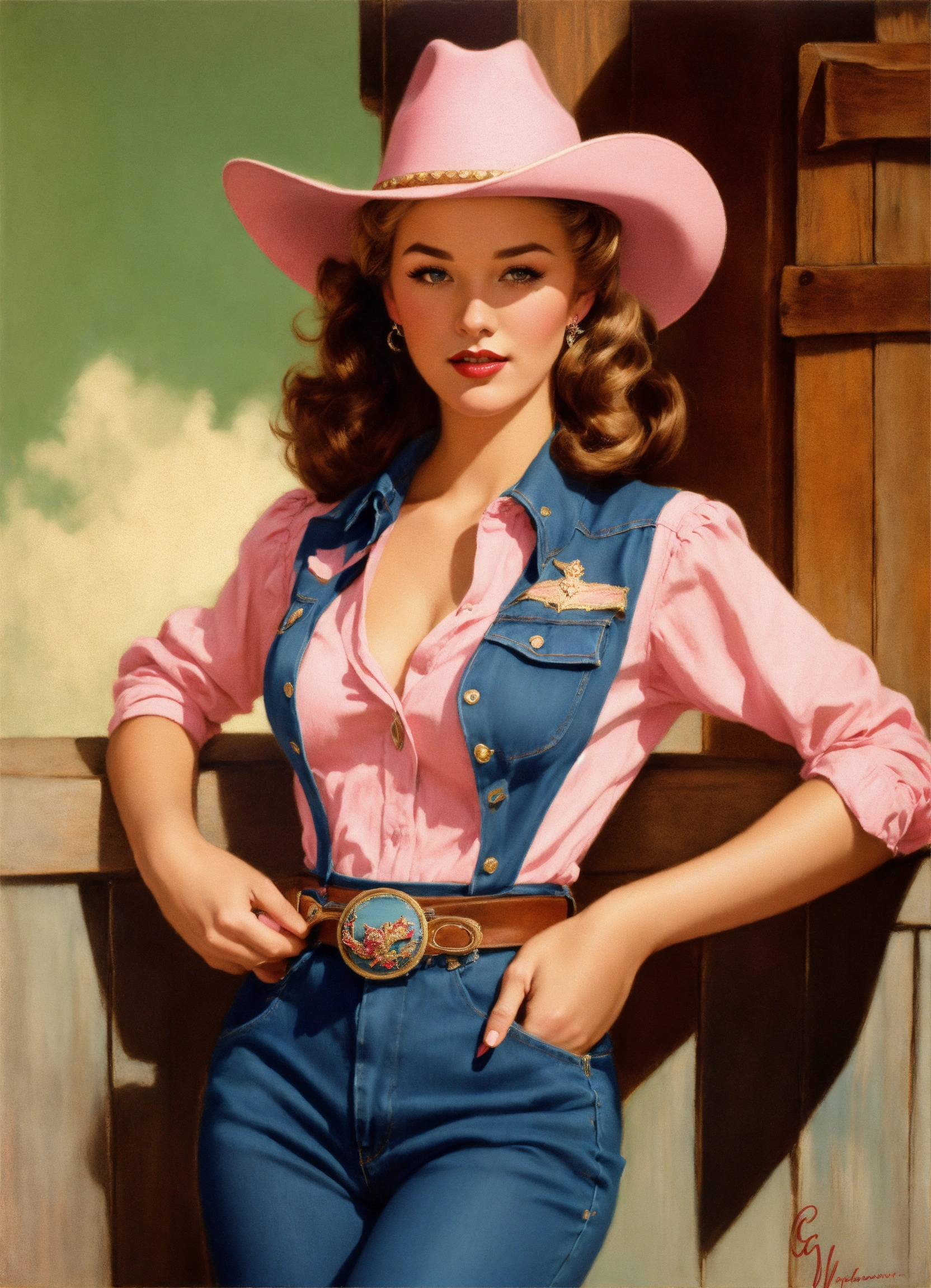 Gil elvgren art style of a southern beauty queen wearing a denim wild west outfit and pastel pink cowboy hat