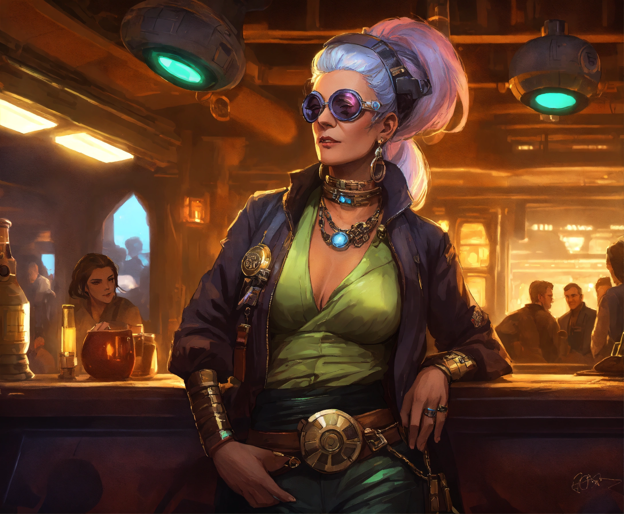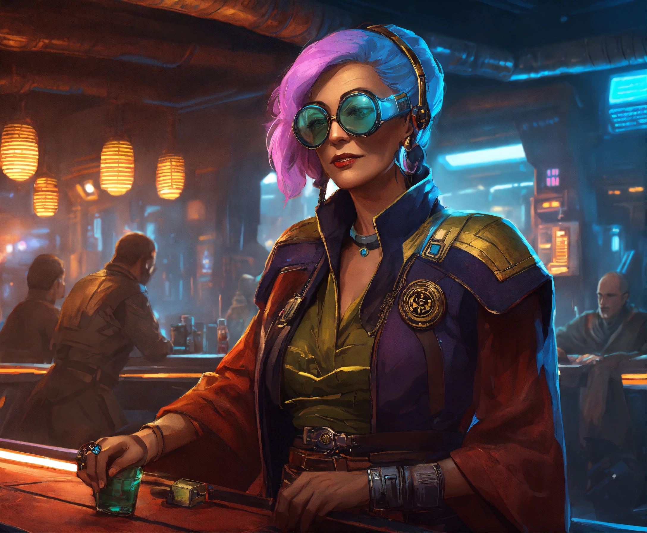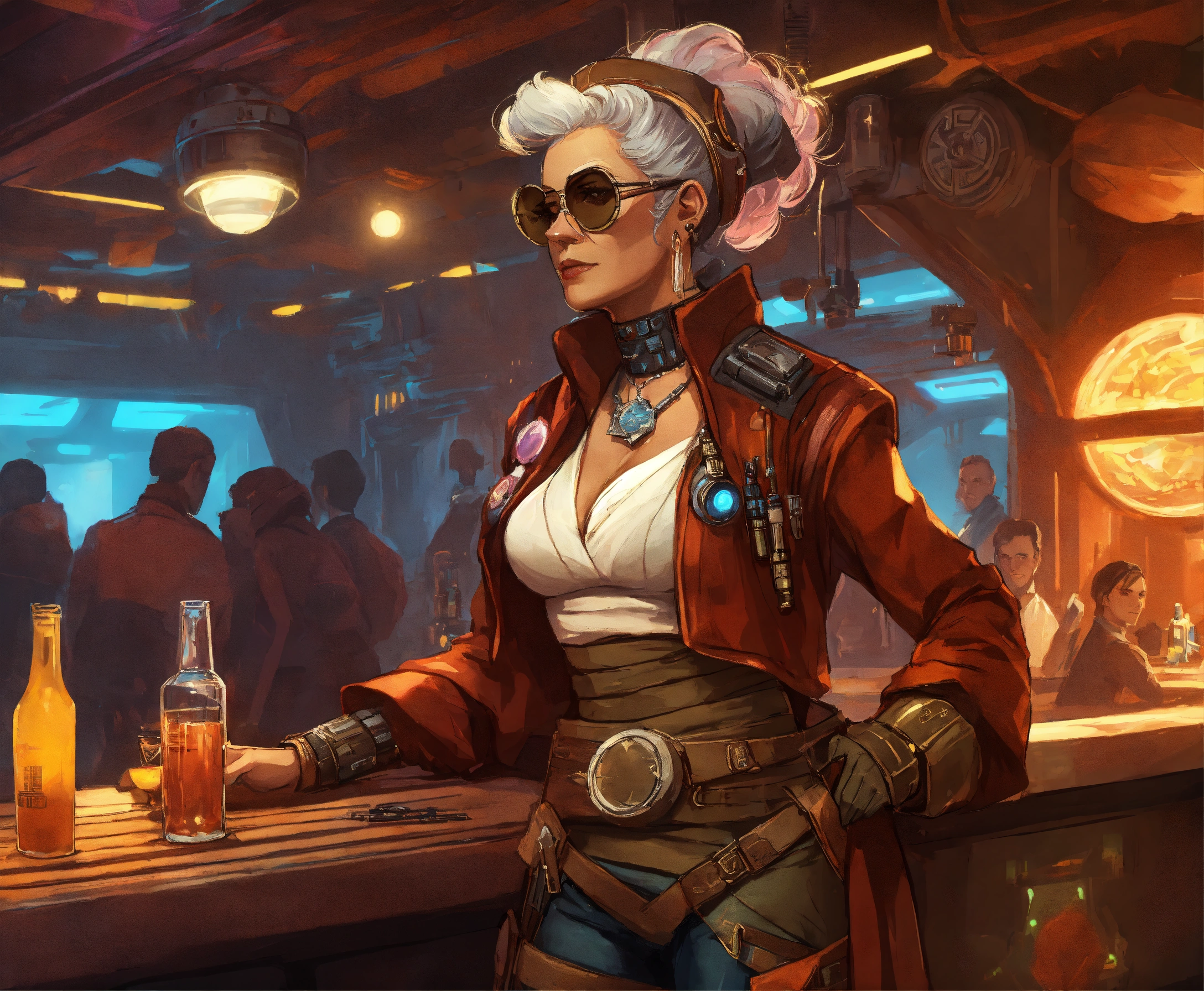 Character art of a fabulous old cyberpunk pirate woman in a star wars cantina