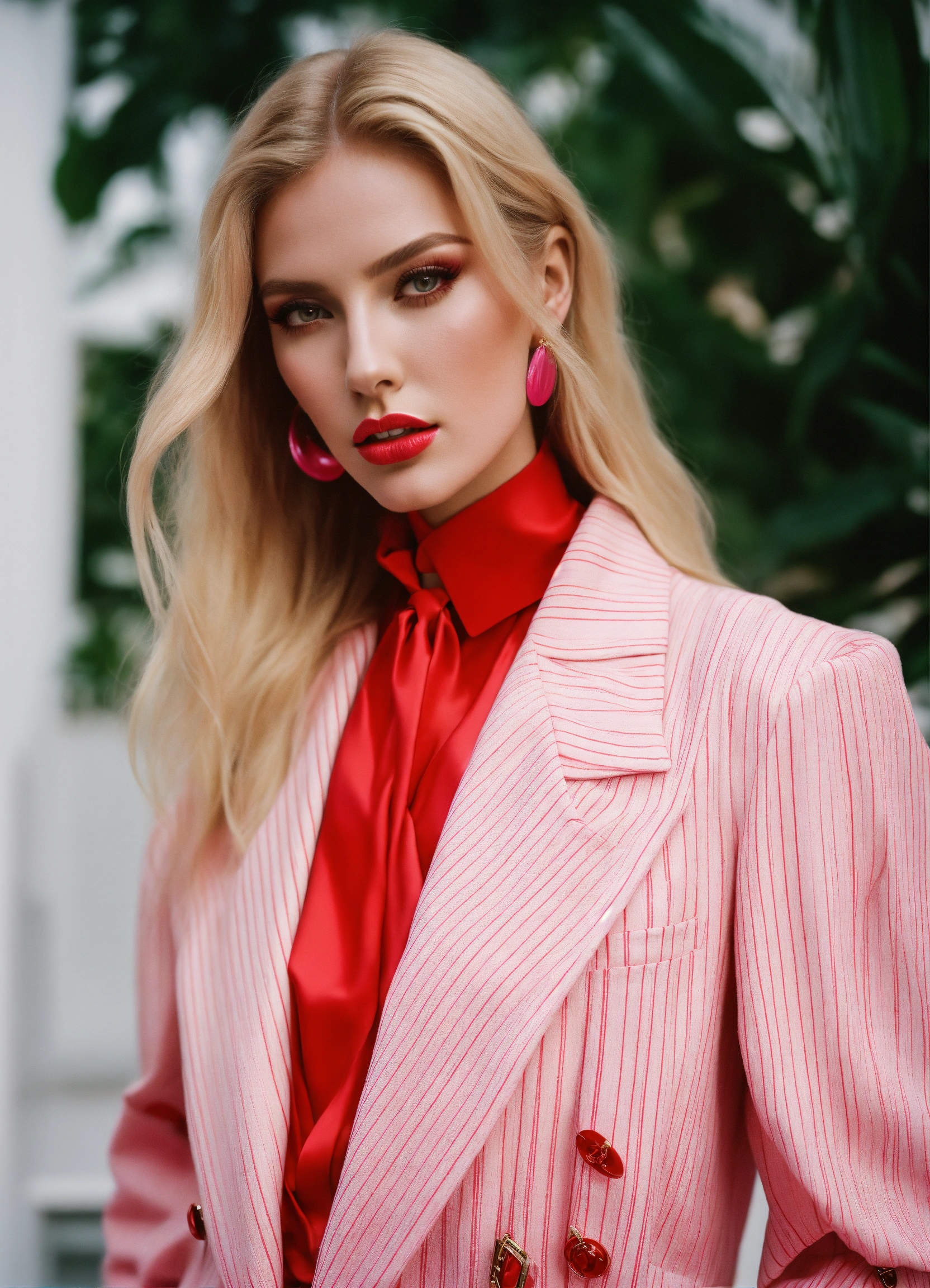 Portrait of haute couture beautiful russian fashion model editorial, structured outfit, high heeled stiletto shoes, iso 400, surrealistic, 8k, full frame, landscape, architecture, 80's retro pink and red striped extra oversized wide shoulders boyfriend blazer, ysl vibes, 80's aesthetics, white background backdrop studio photos, natural makeup, long blonde hair