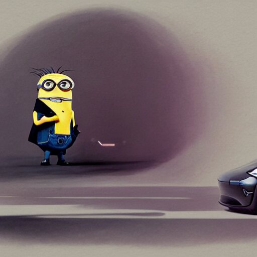 An epic painting minion looking like elon musk presenting new tesla, pencil drawing, perfect composition, golden ratio, beautiful detailed, photorealistic, digital painting, concept art, smooth, sharp focus, illustration, artstation trending, octane render, unreal engine