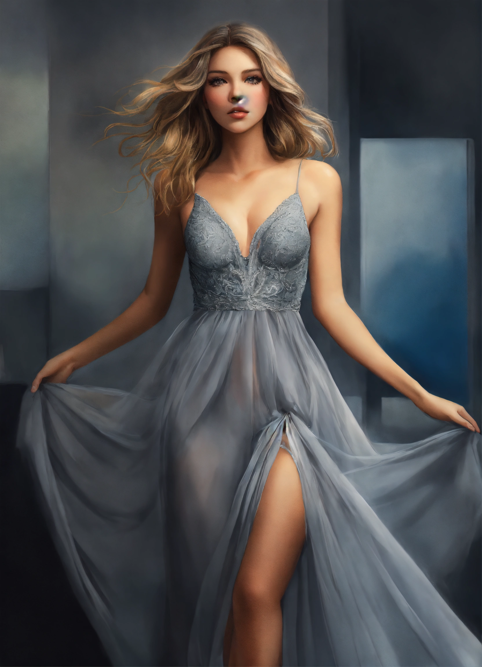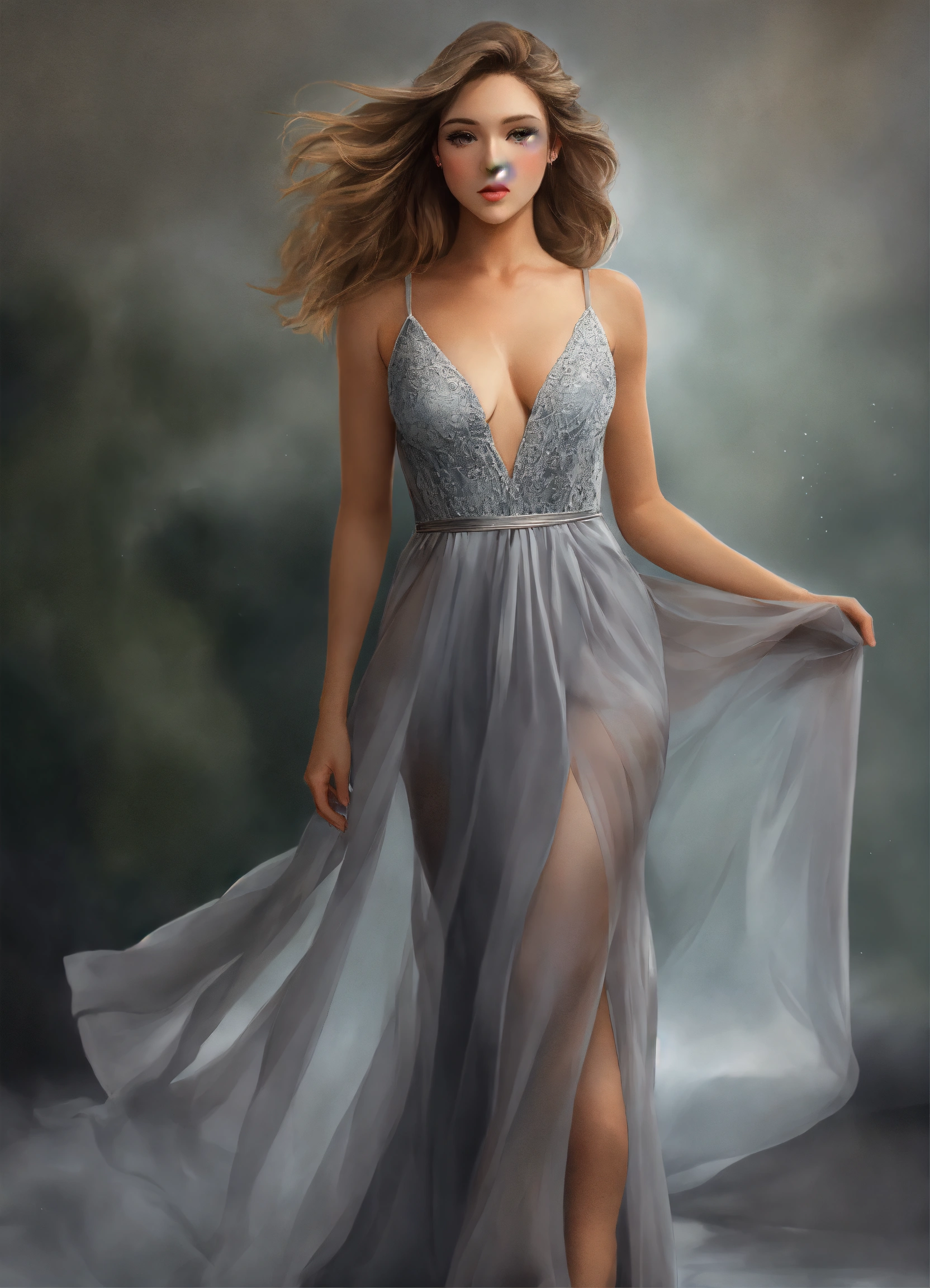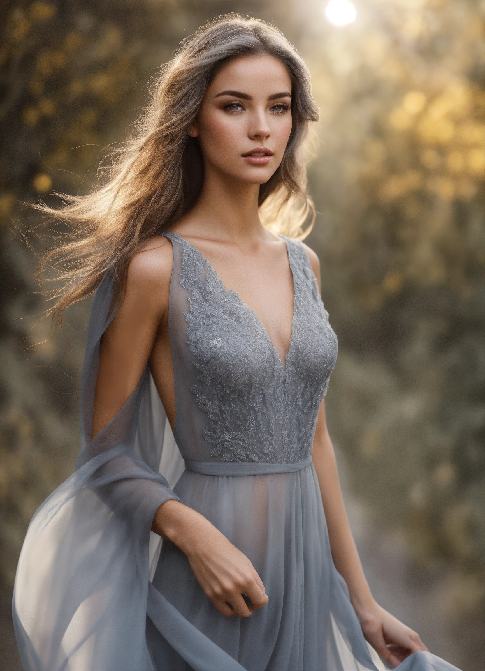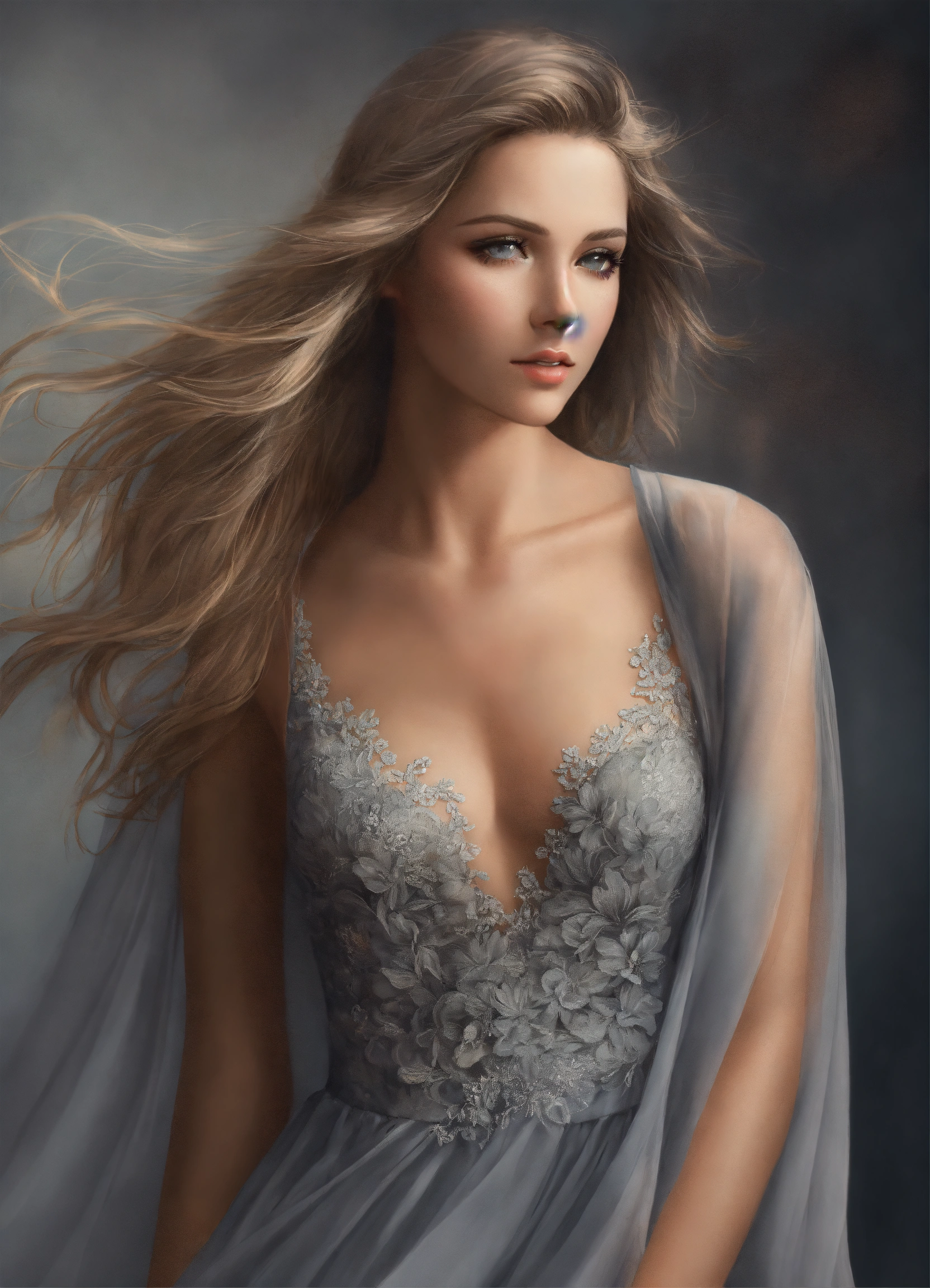 Fotorealista ilustración, preciosa mujer de cuerpo entero con cabello rubio en dos tonalidades y ojos grises, vestido gris con hombros descubiertos, capa transparente cubriendo los hombros gris, vestido largo con vuelo