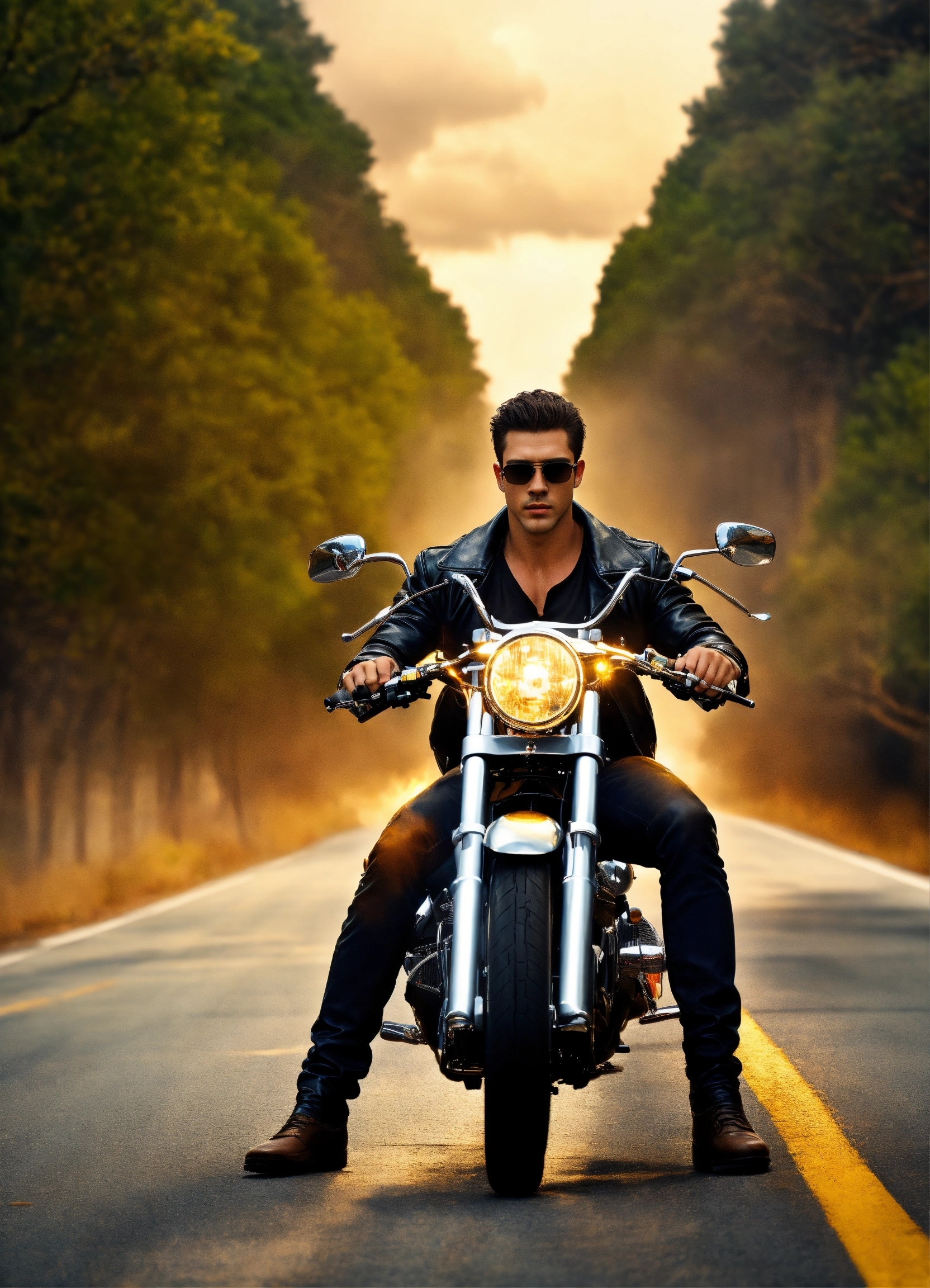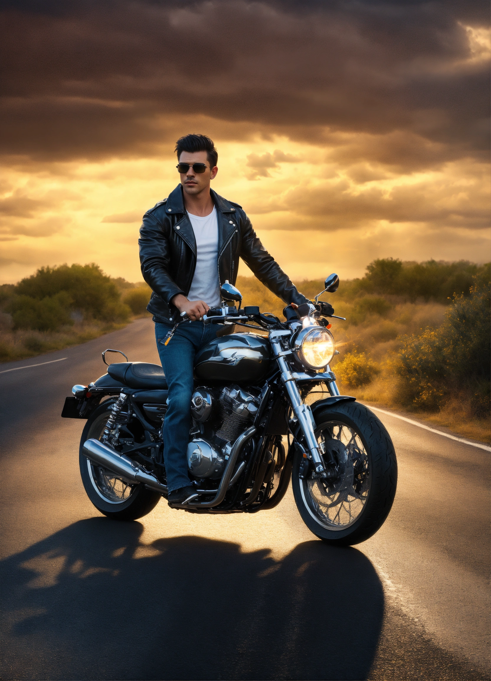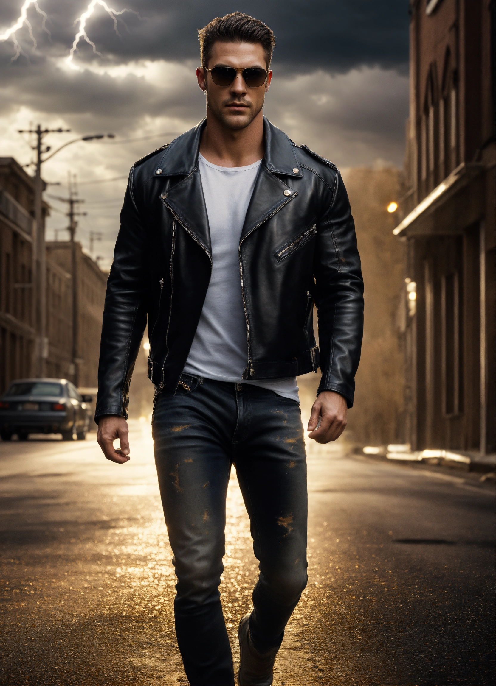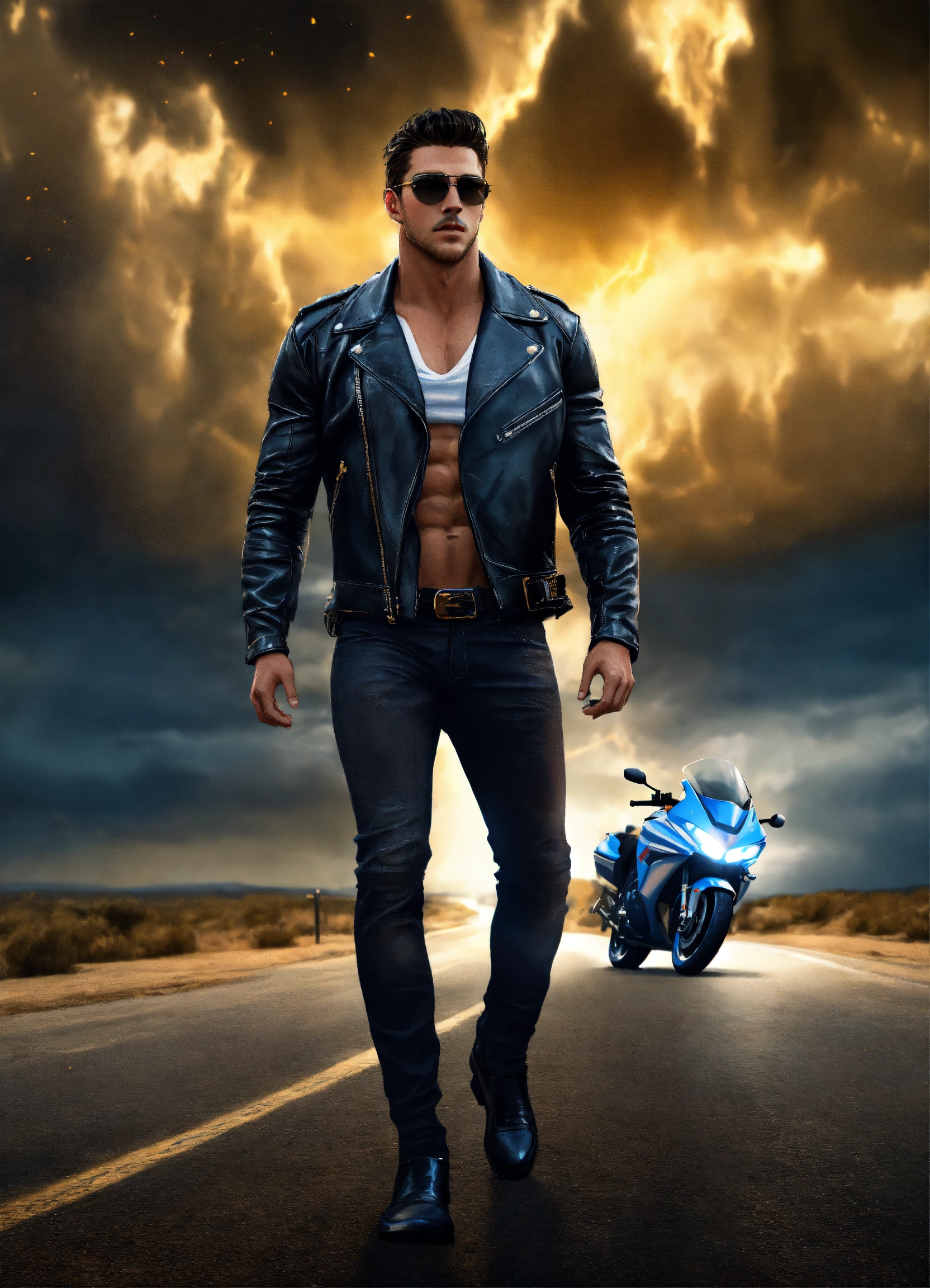Hyperrealistic full handsome big strong muscular young white god, muscular strong big handsome young white man with short dark hair, fully clothed black leather jacket, white t-shirt and jeans and sunglasses, he's walking down a lonely road with gold lightning a motorcycle and dark clouds behind him, high detail, realistic photo, high detail, digital painting, cinematic, stunning, hyper-realistic, sharp focus, high resolution 8k, insanely detailed