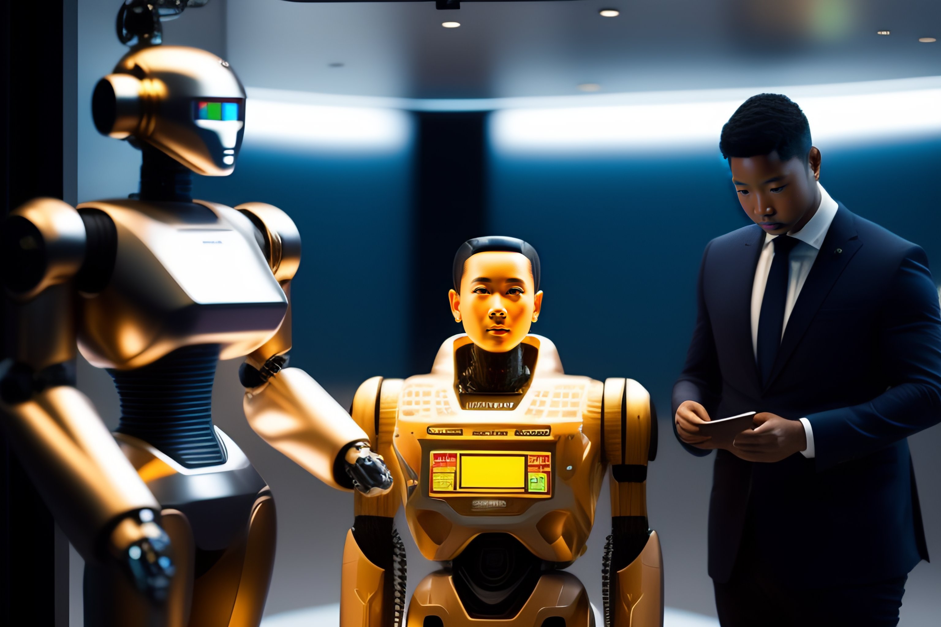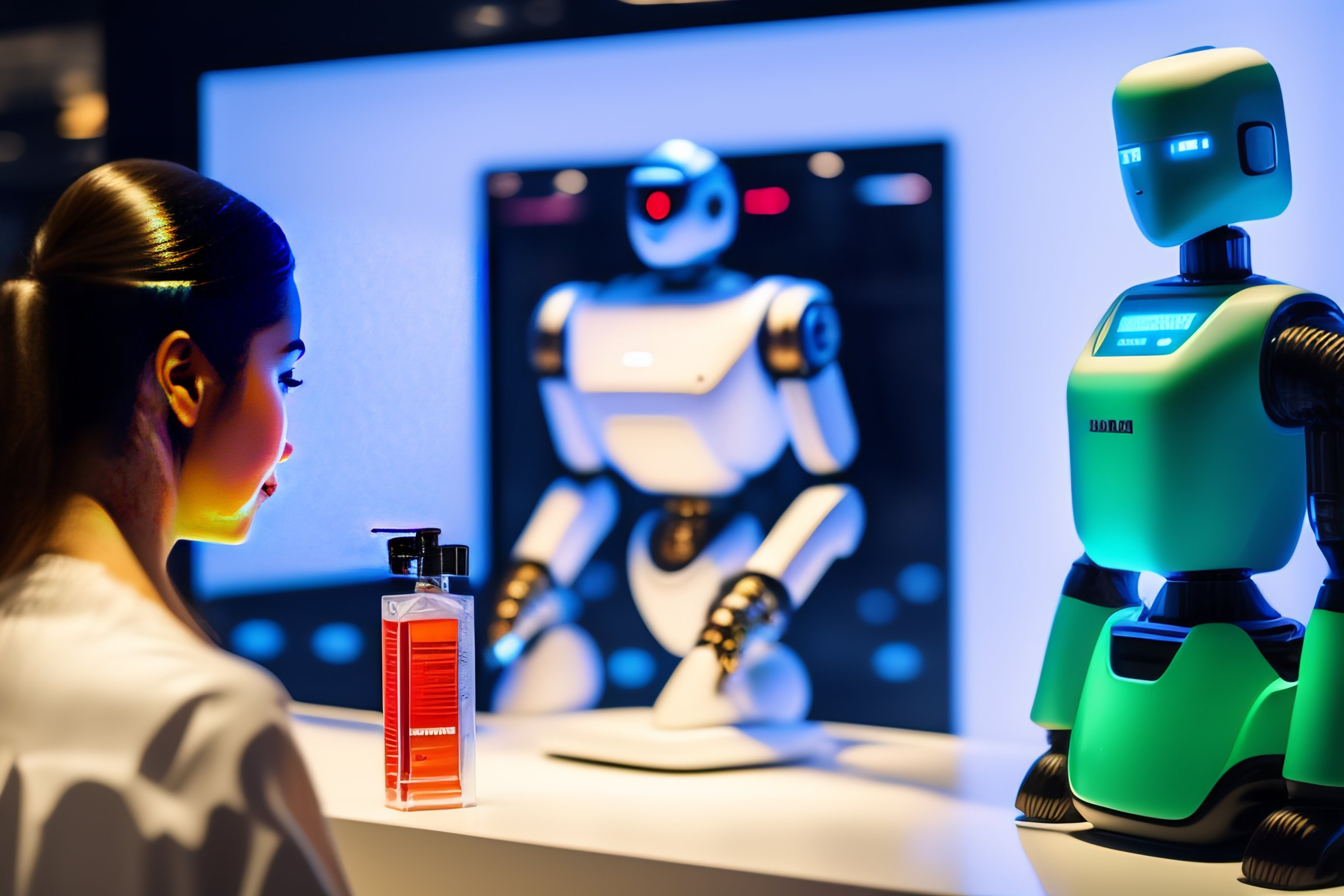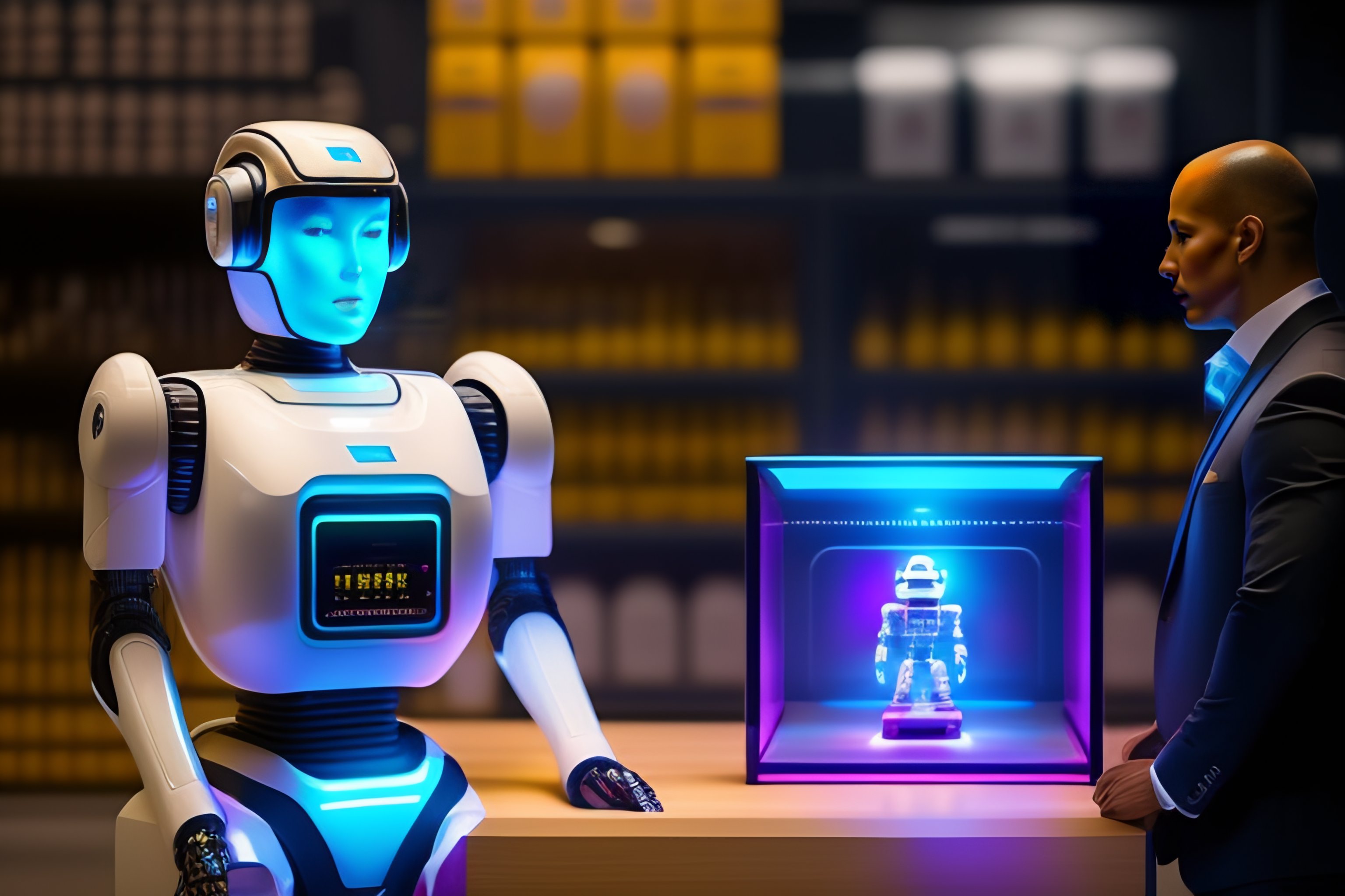 Human hologram, gives instructions to the robot, the robot does not look like a human, in the background a shop with products