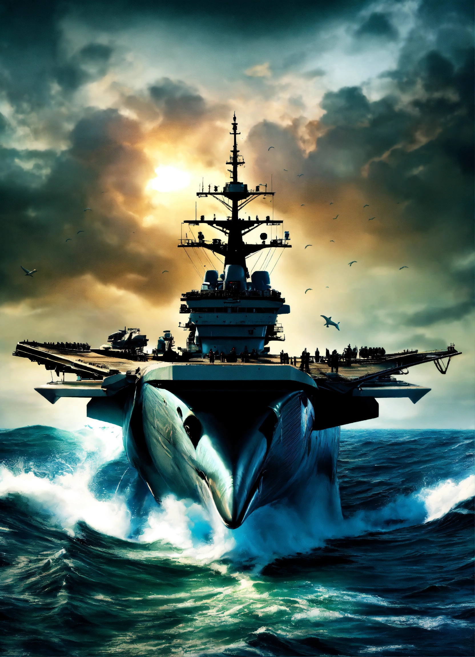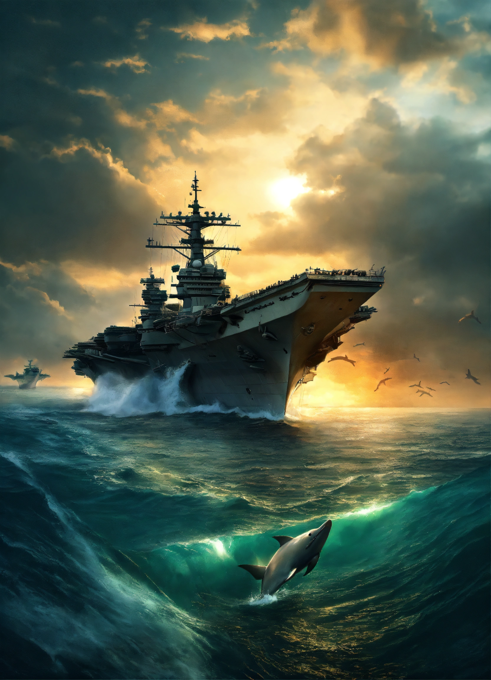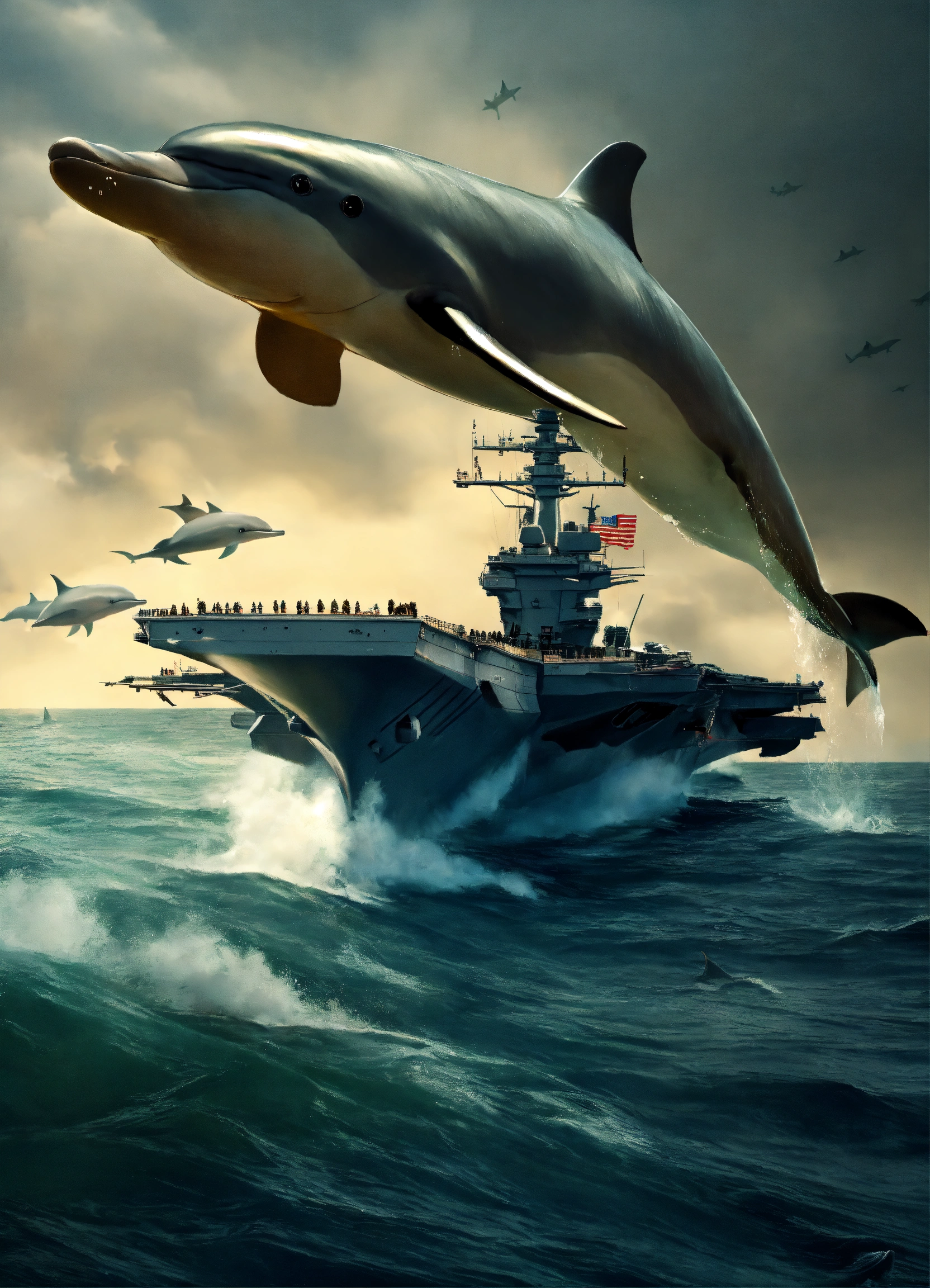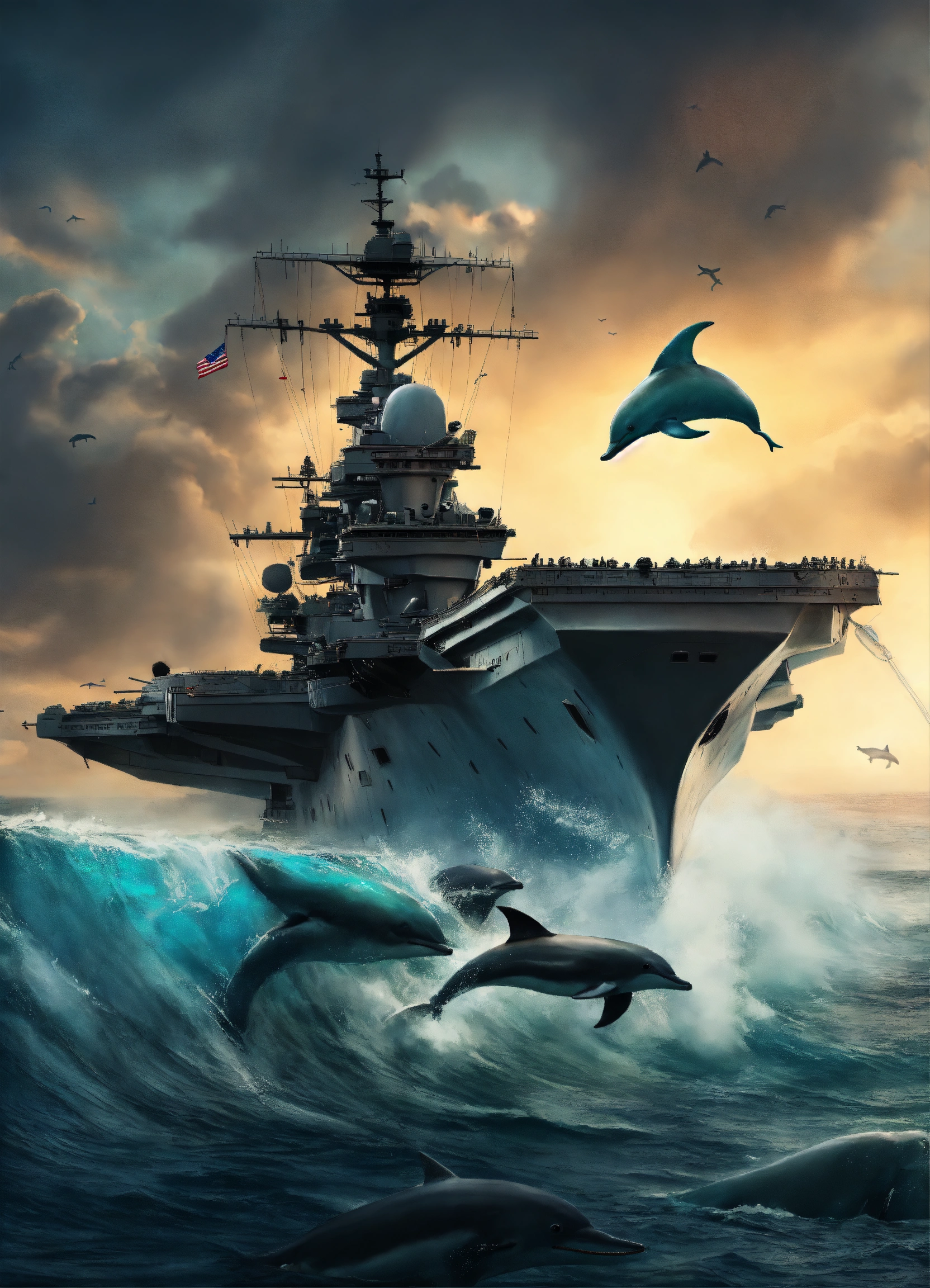 American aircraft carrier hits a school of dolphins with a sound wave high quality dark fantasy