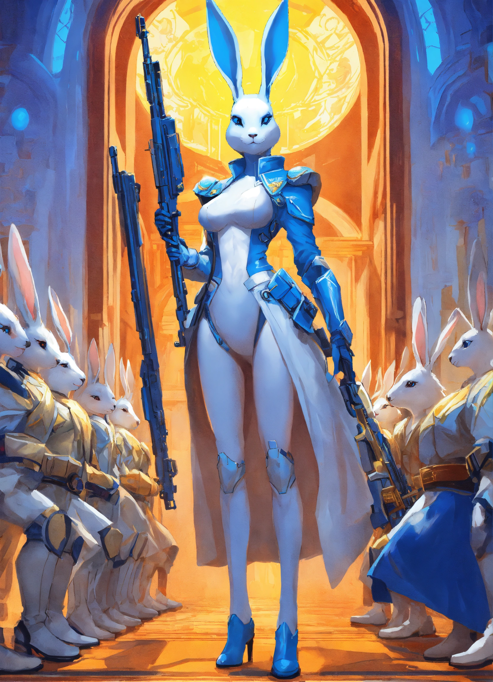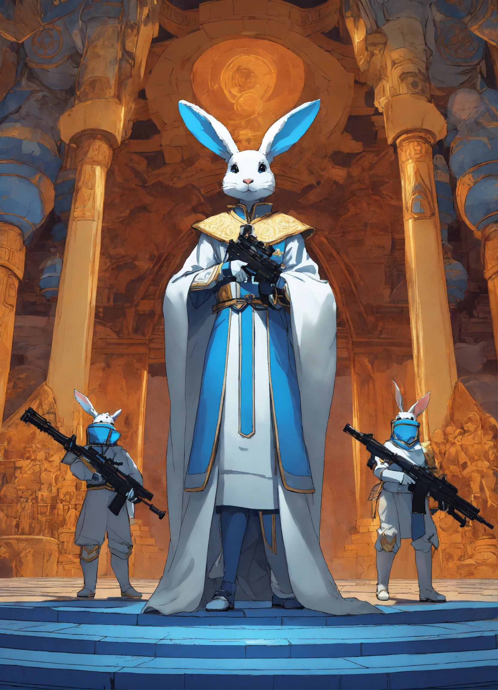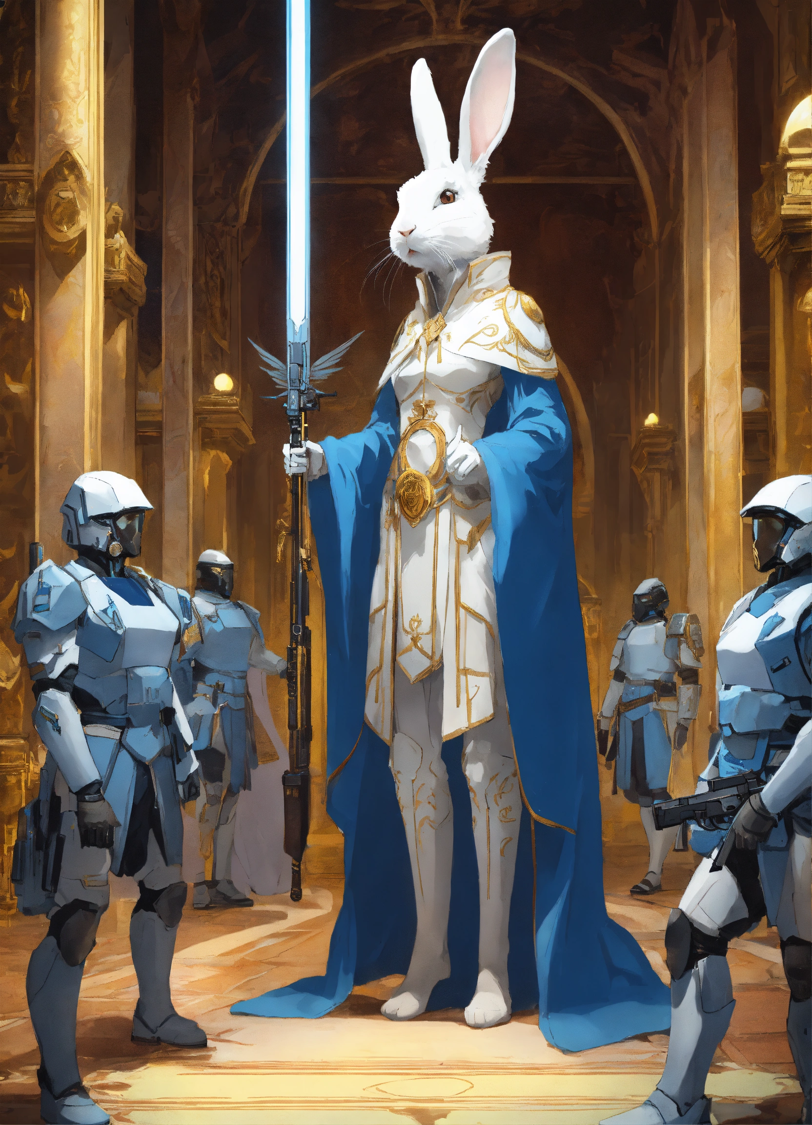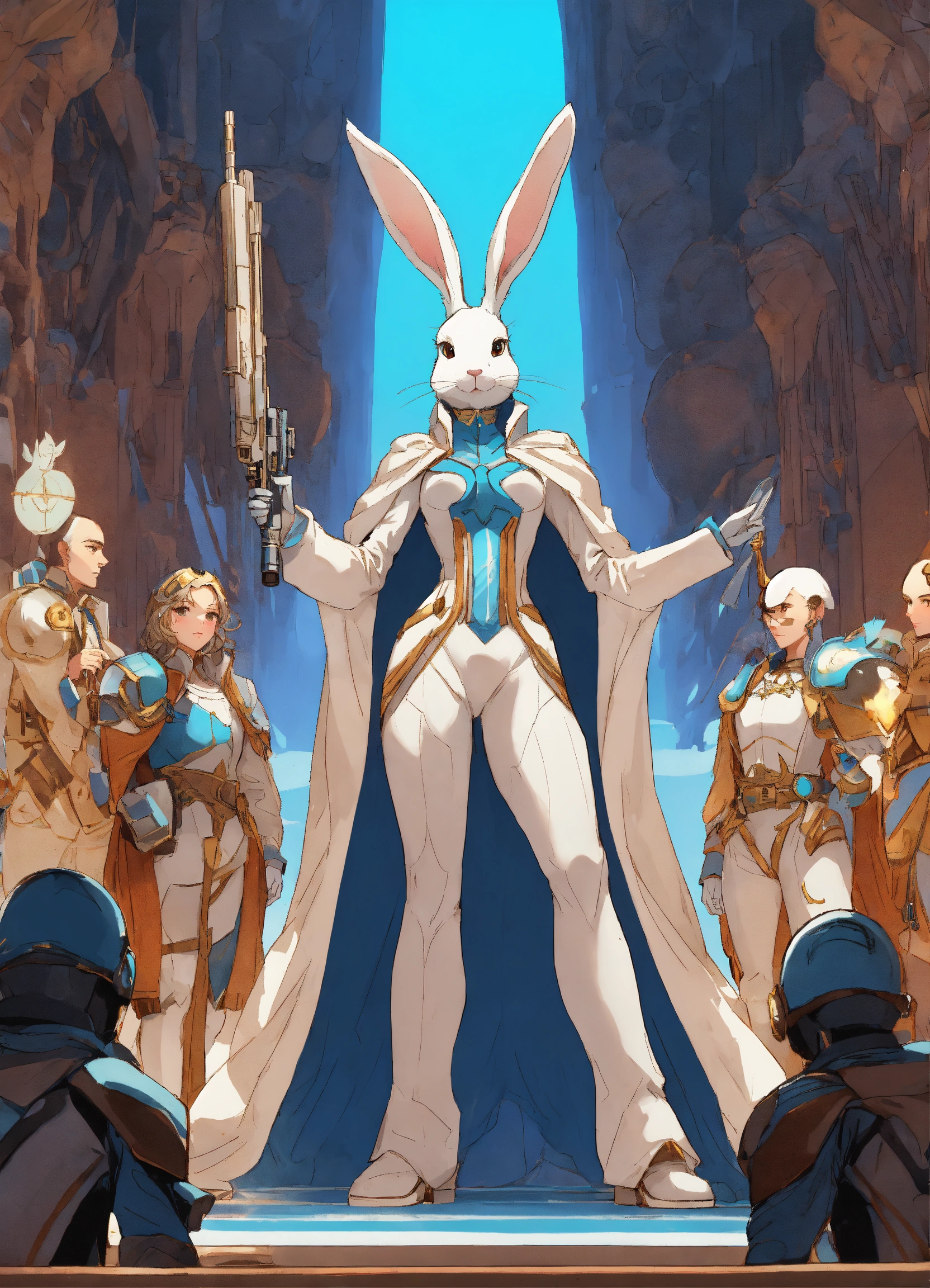 One foot tall white humanoid rabbit queen wearing a blue robe with her retinue white are armed with pulse rifles looking up at a tall fit human male