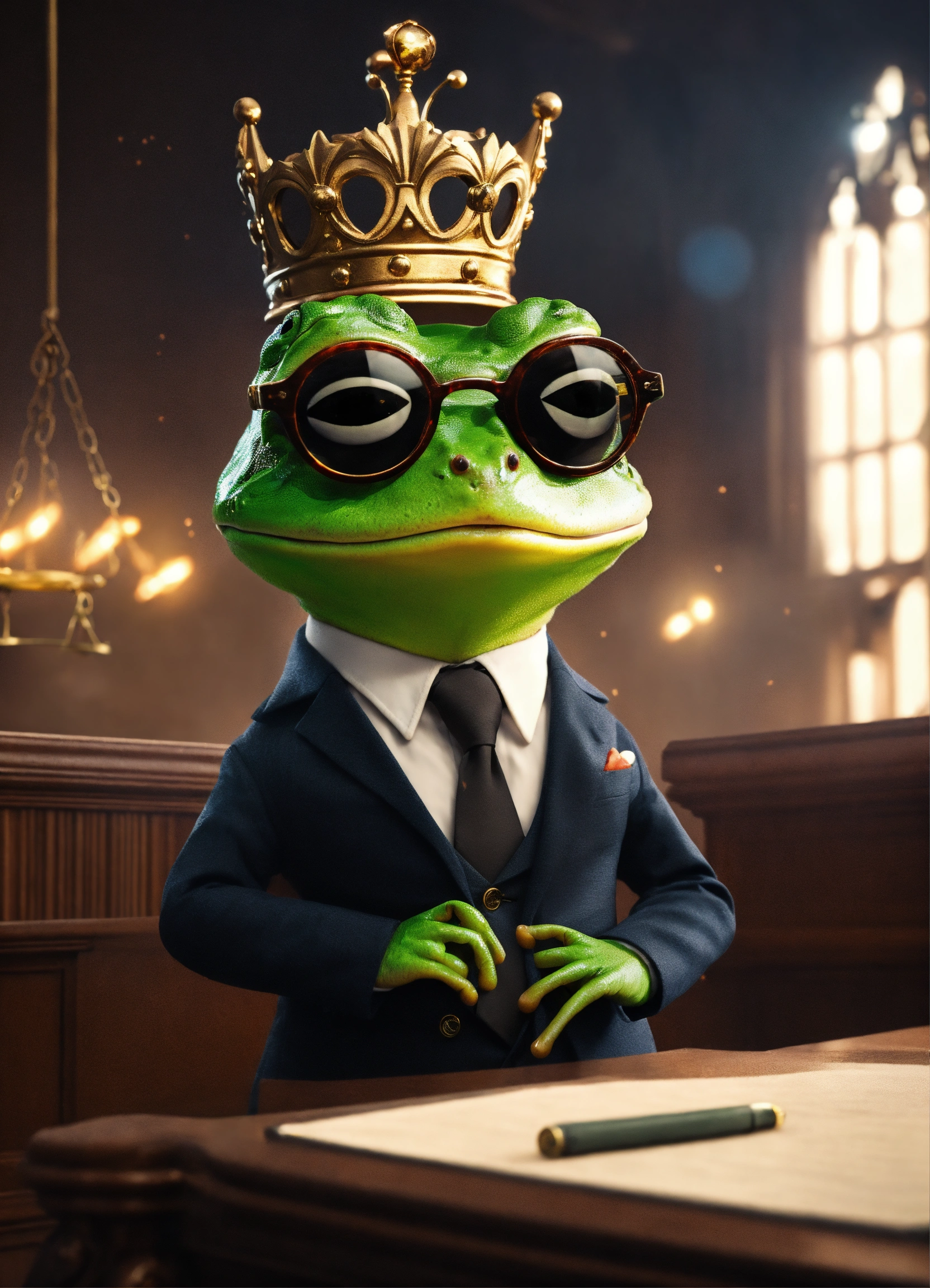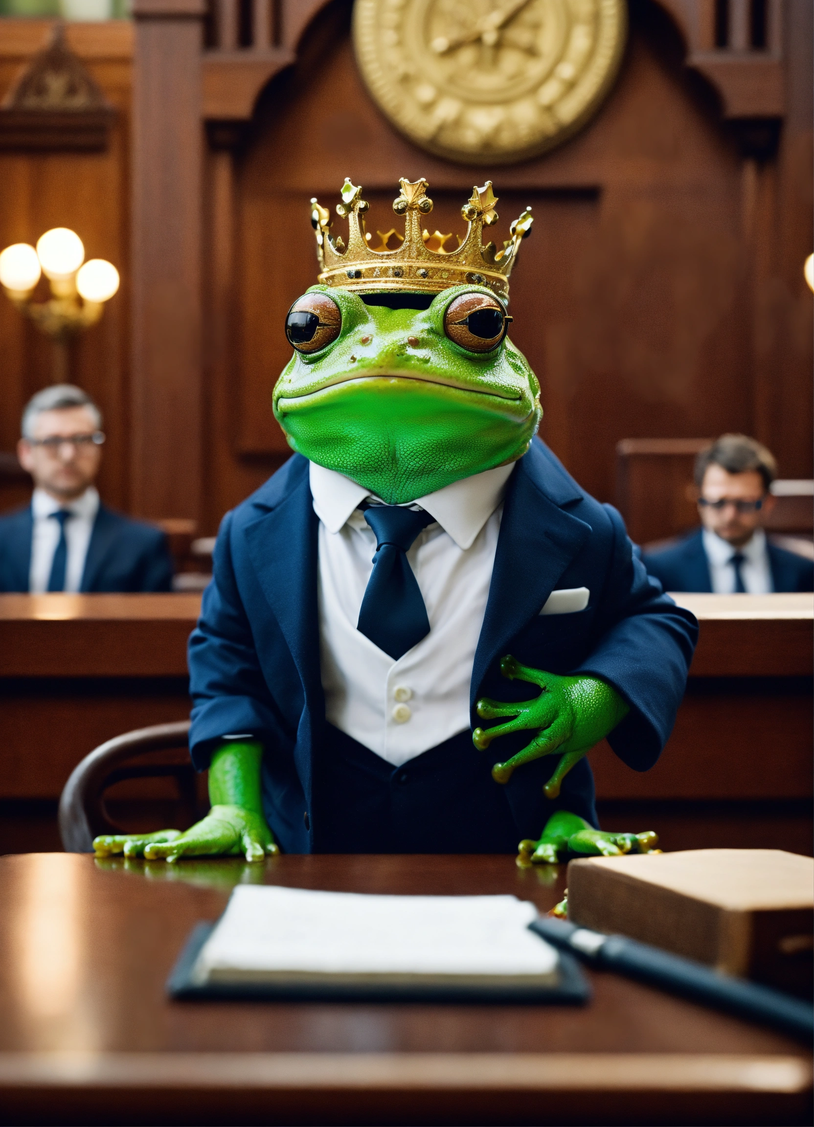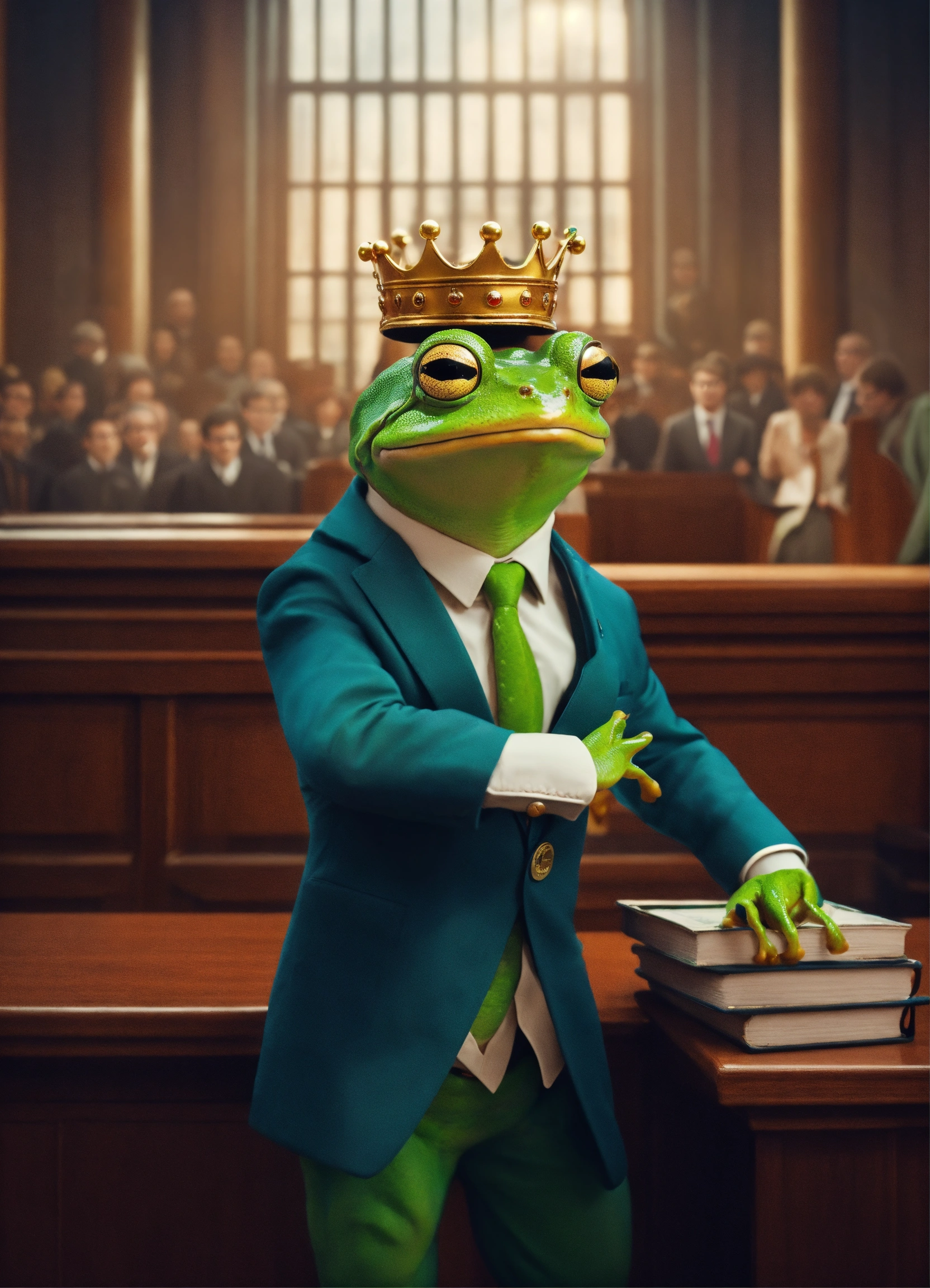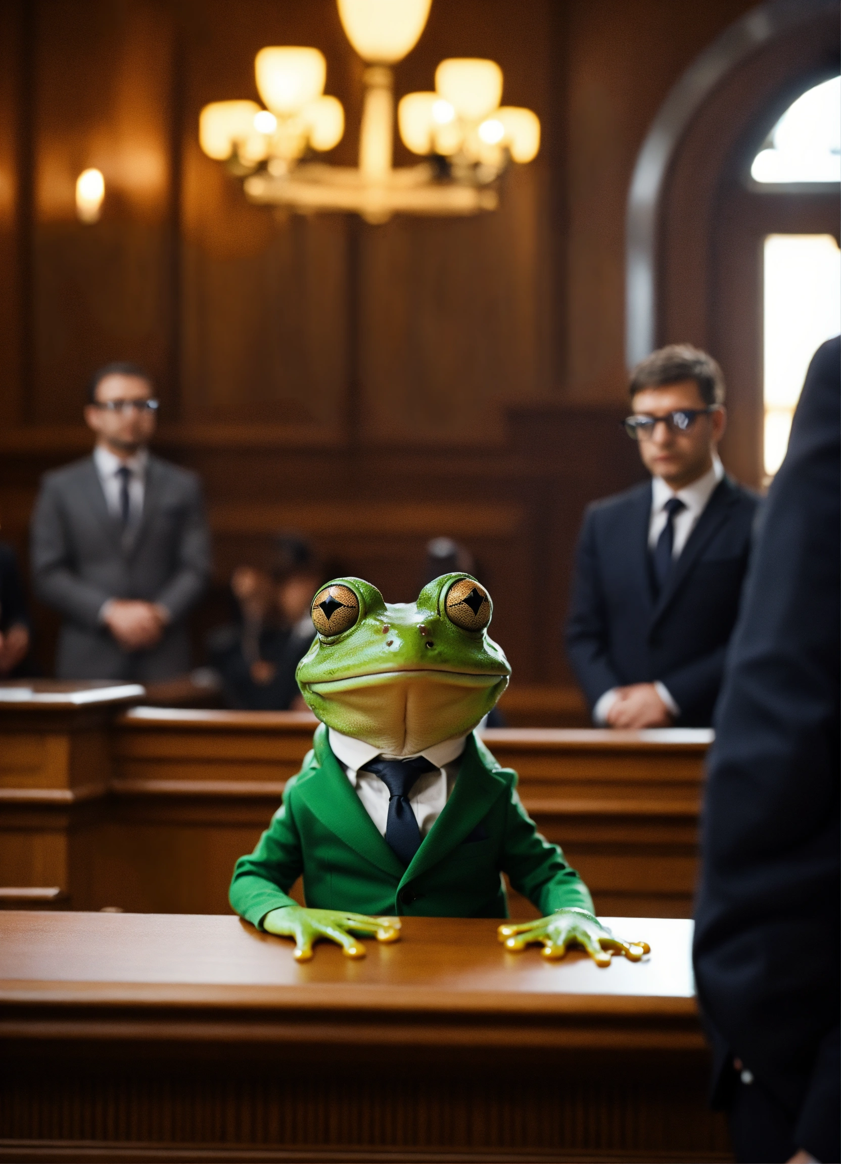 Cute frog in suit and glasses in crown court defending warm in in front of judge in cinematic environment