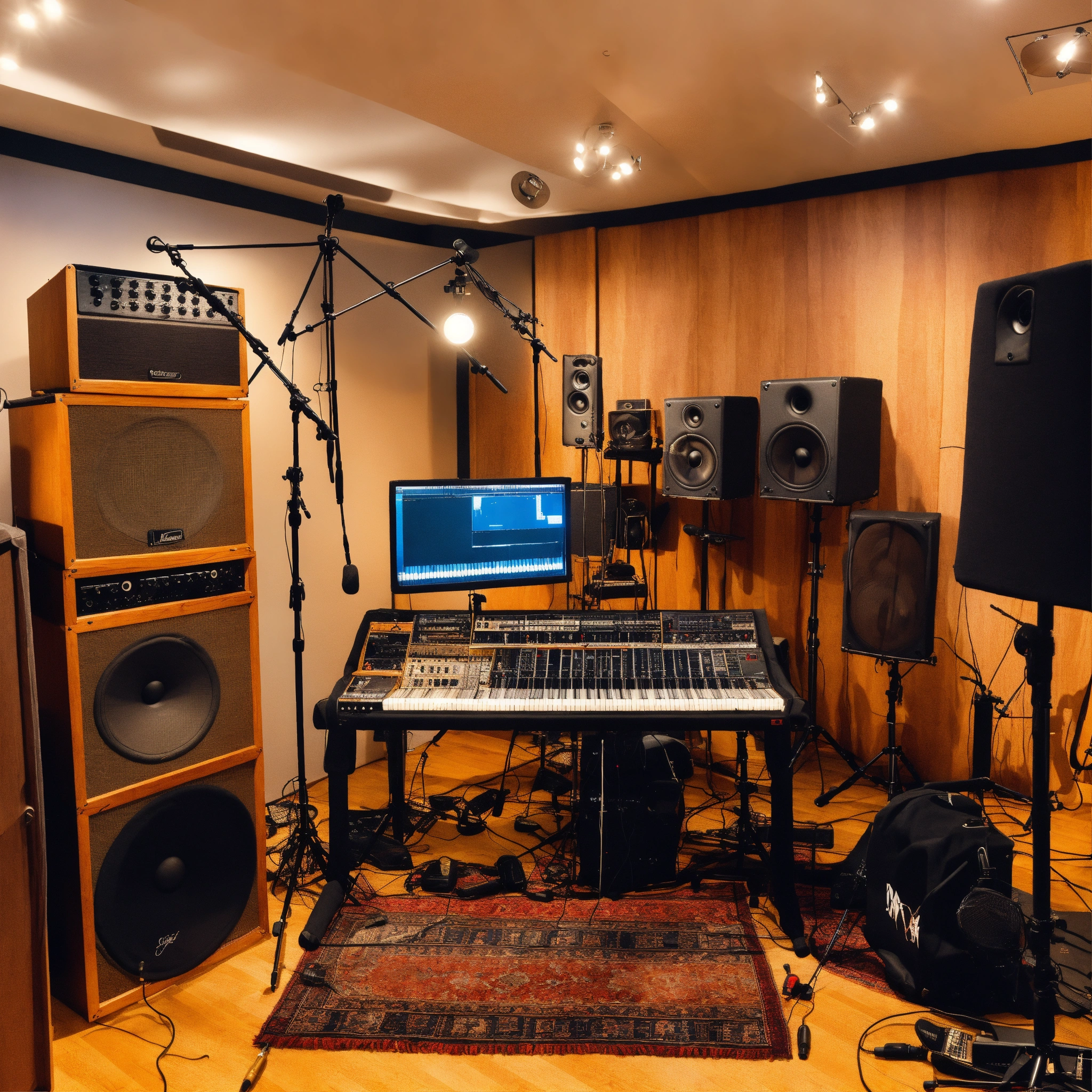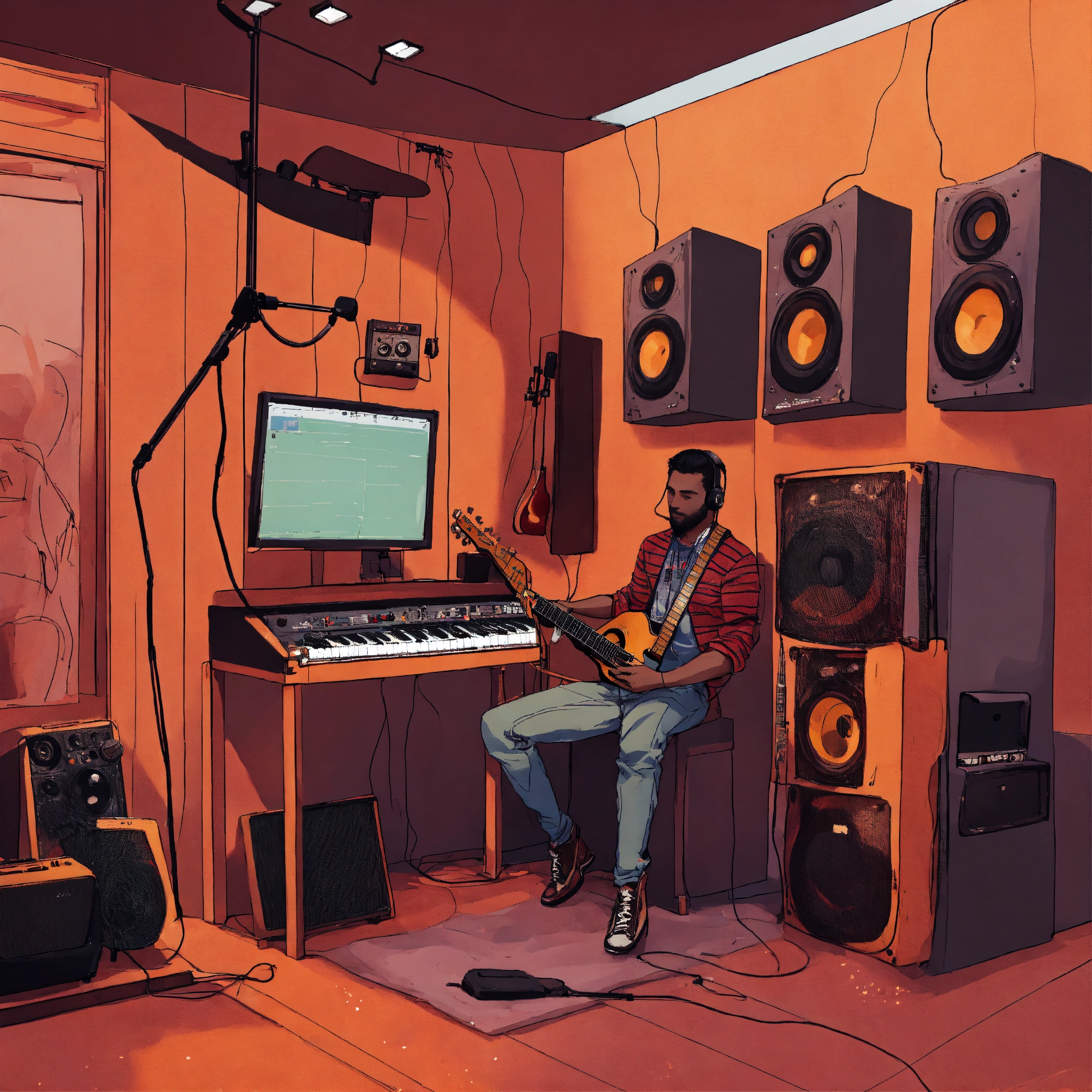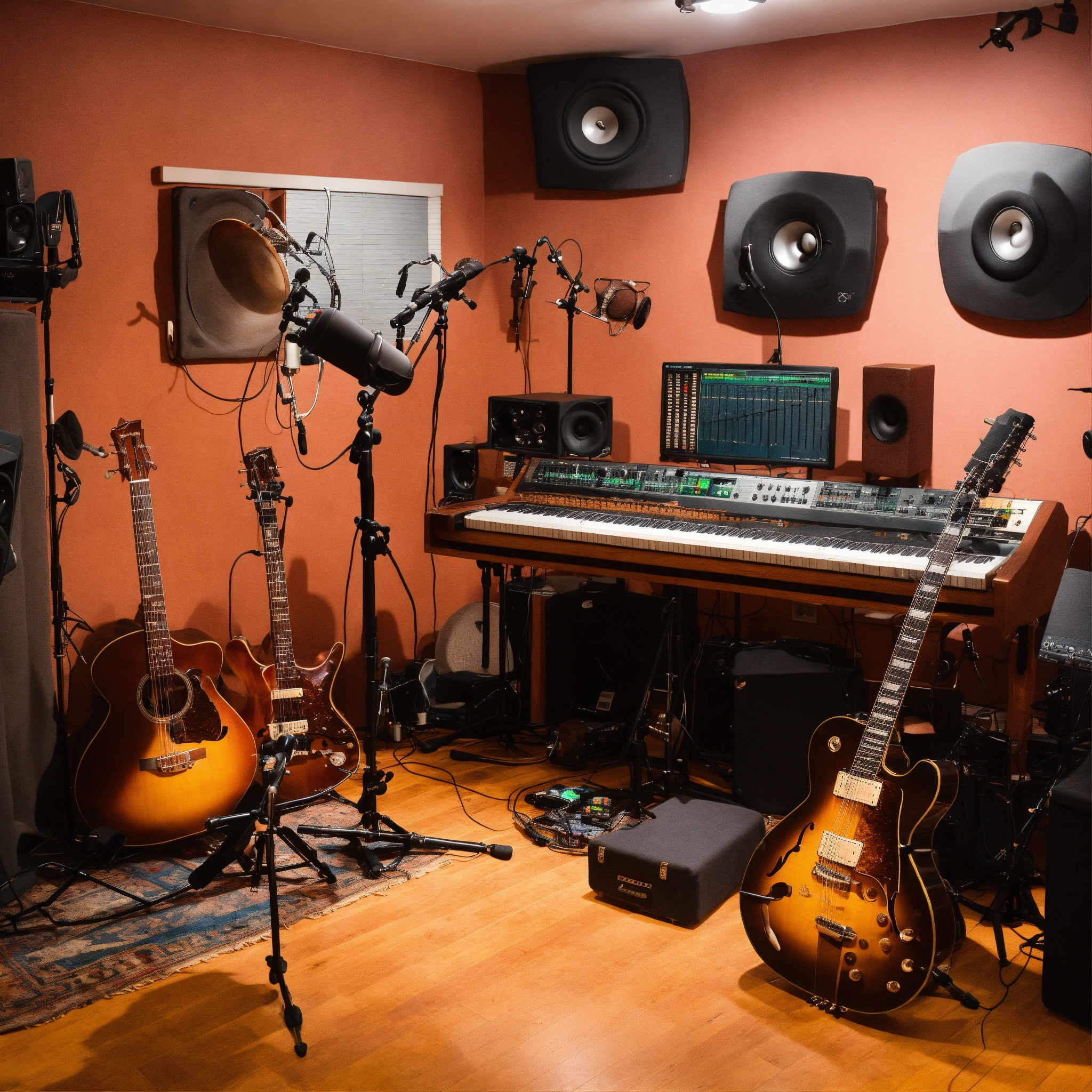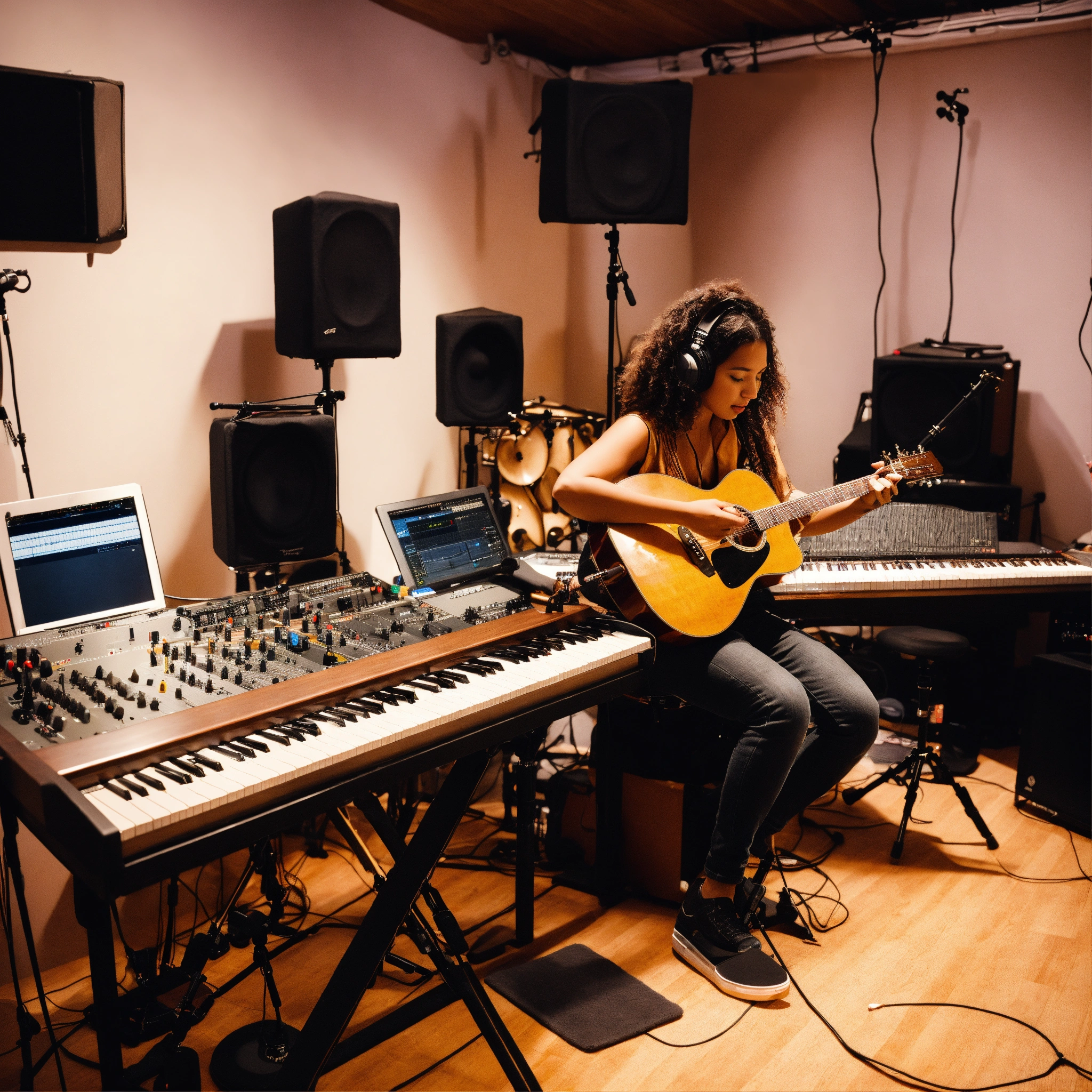 Musicians men and women making music in small home recording studios with simple equipment, guitars, keyboards