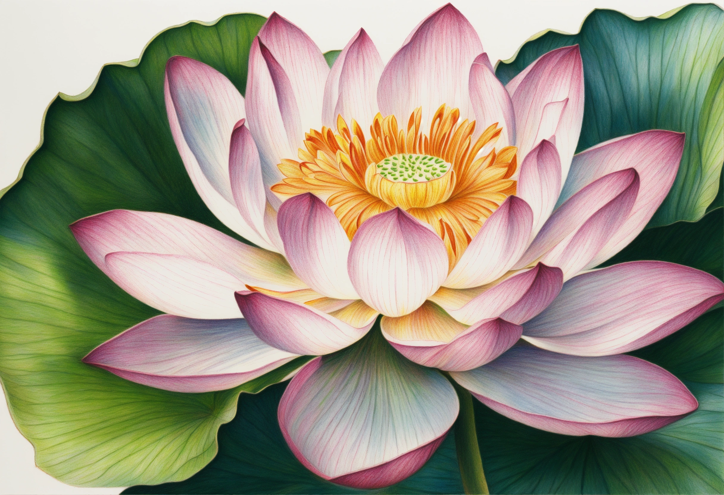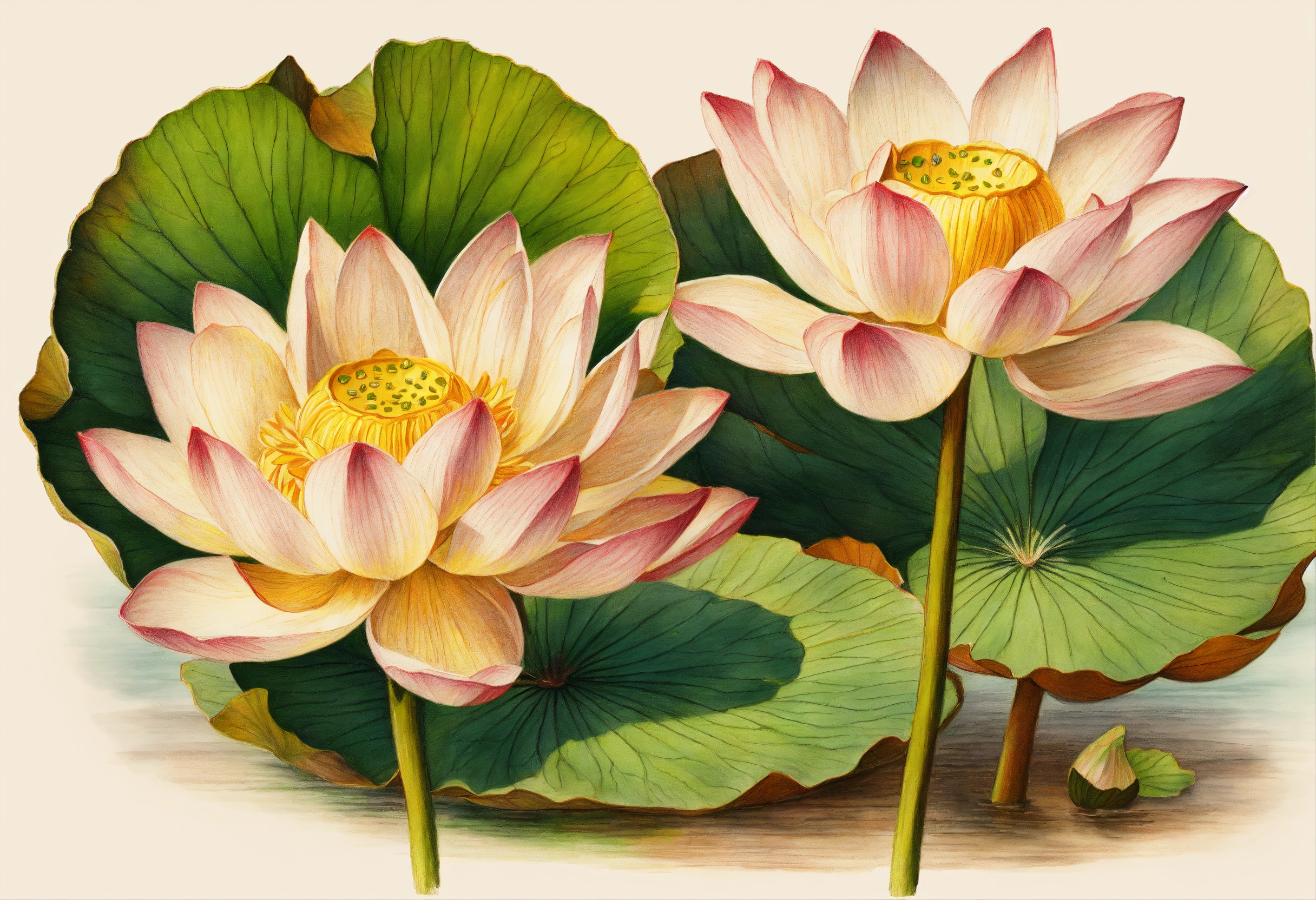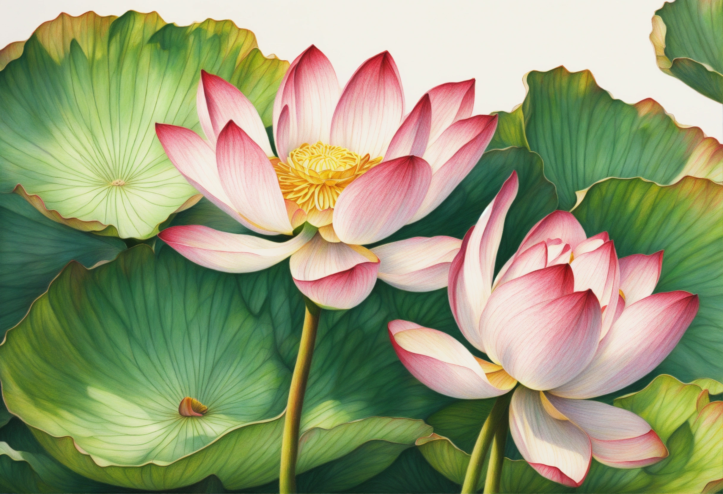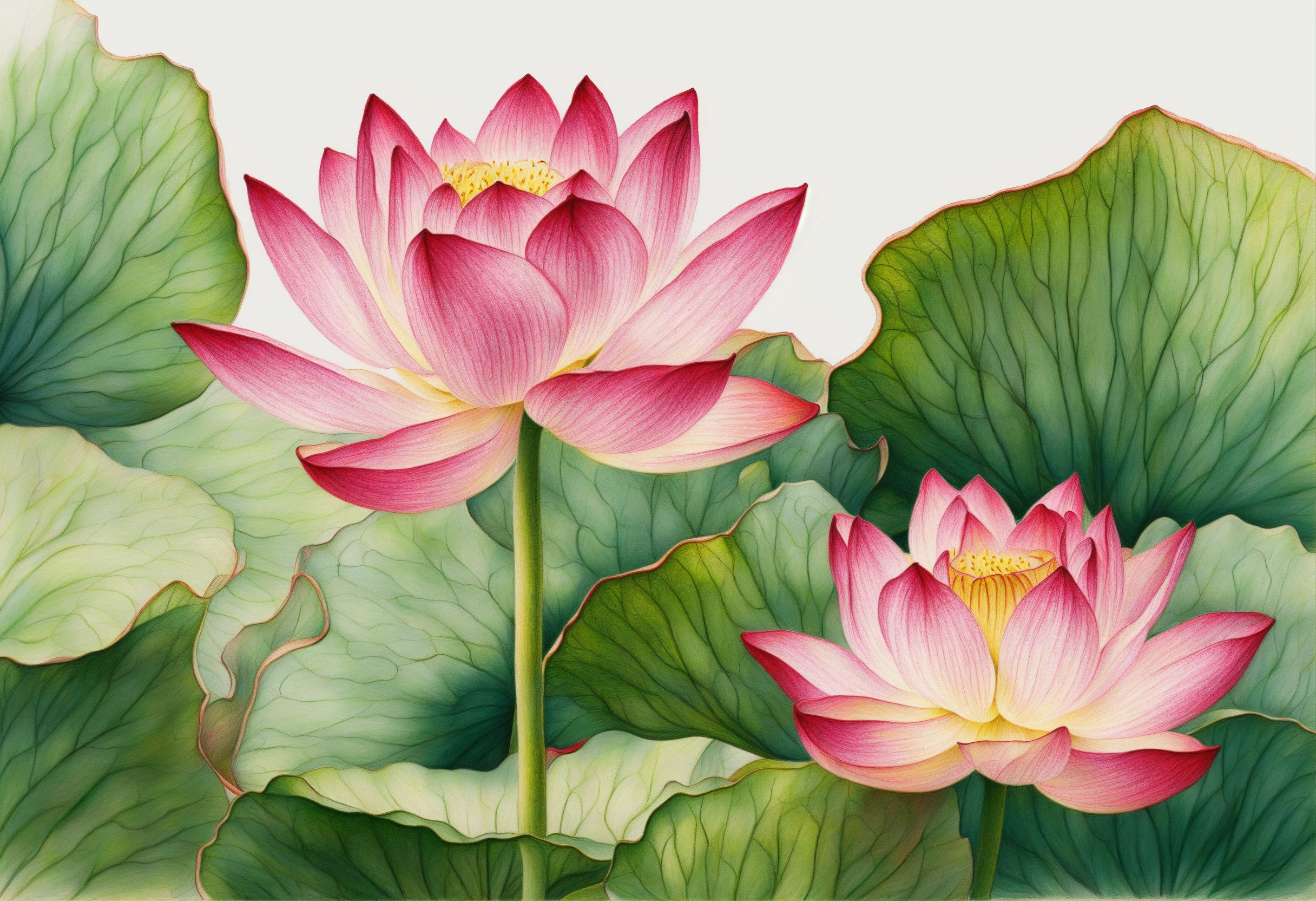 Beautiful lotus flowers, excellent, vintage style detailed colored pencil drawing, 8k, simple drawing, thin color line shading, white background.