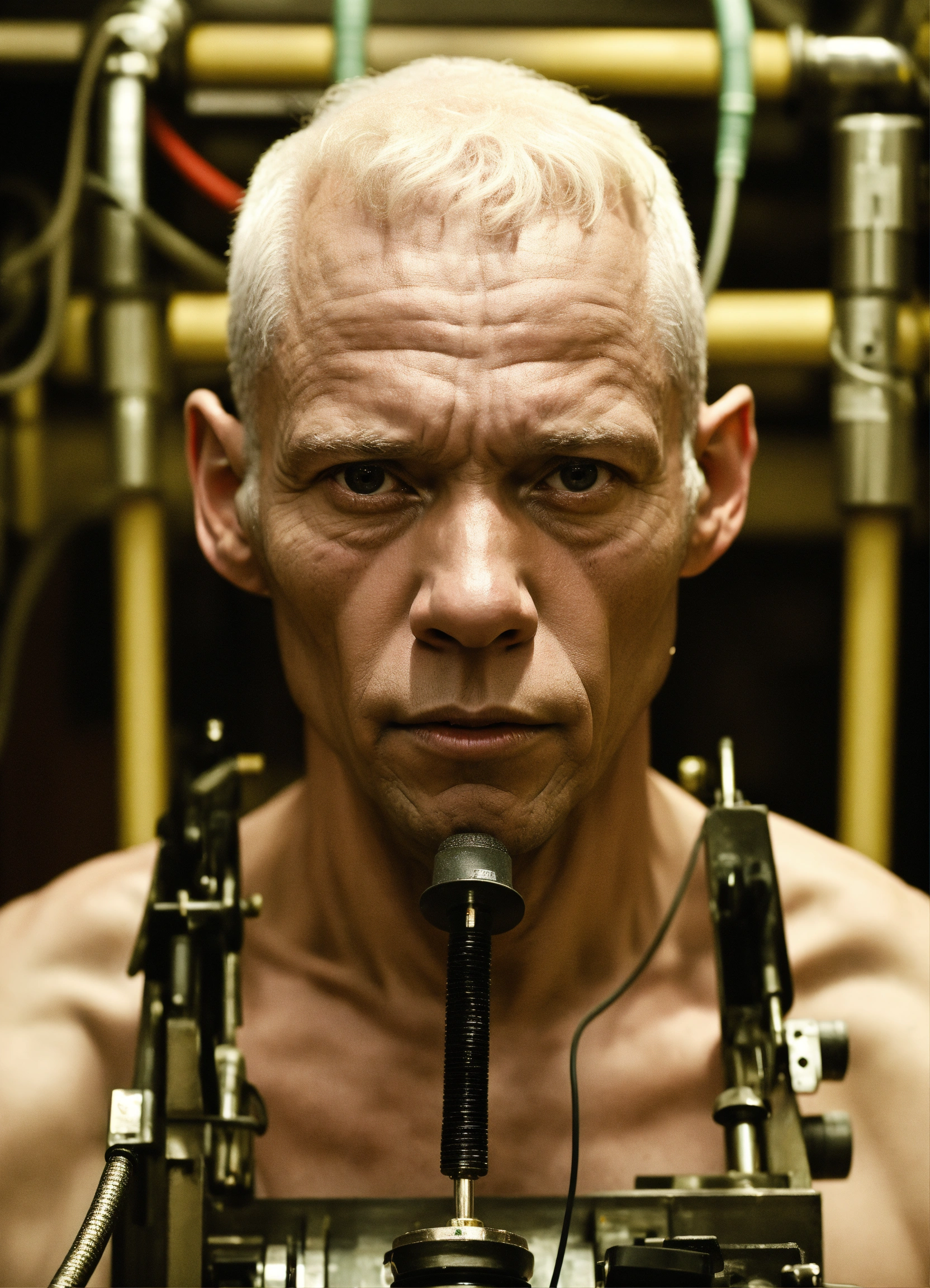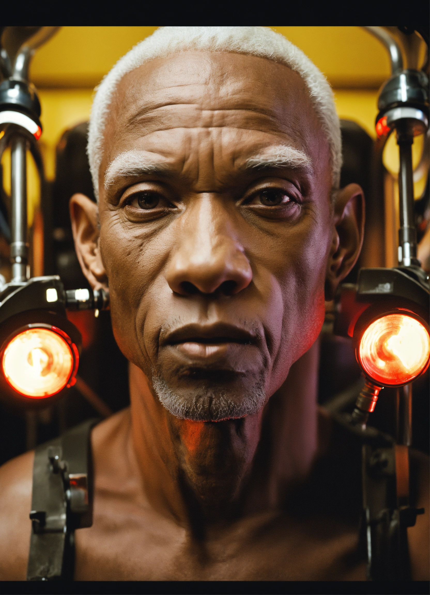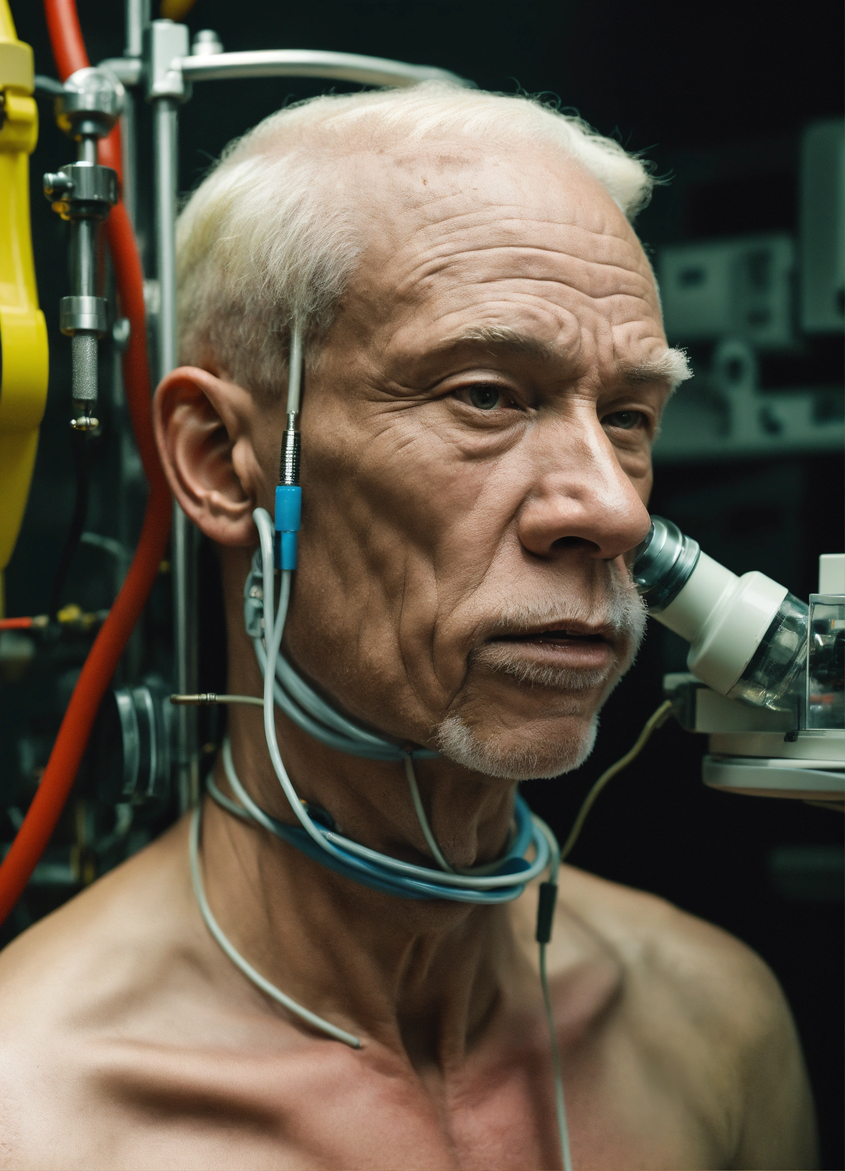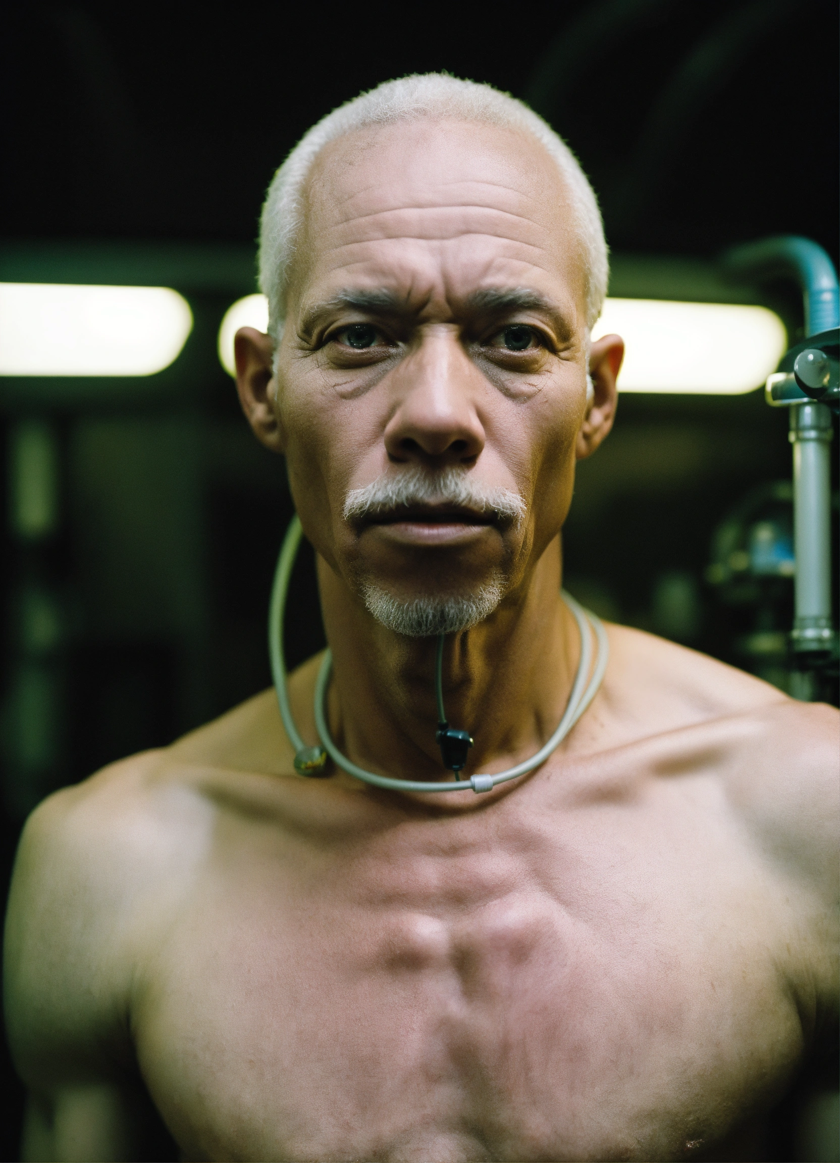 A close-up of a slender muscular old albino african man with a black nose hooked up to a machine with tubes in him, facing front