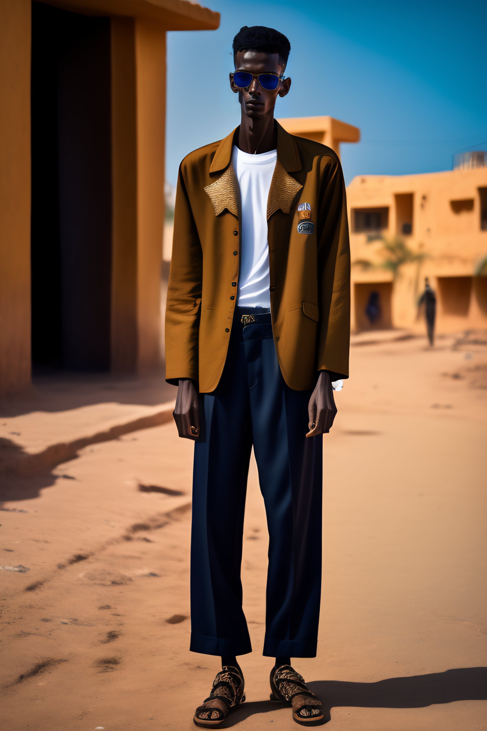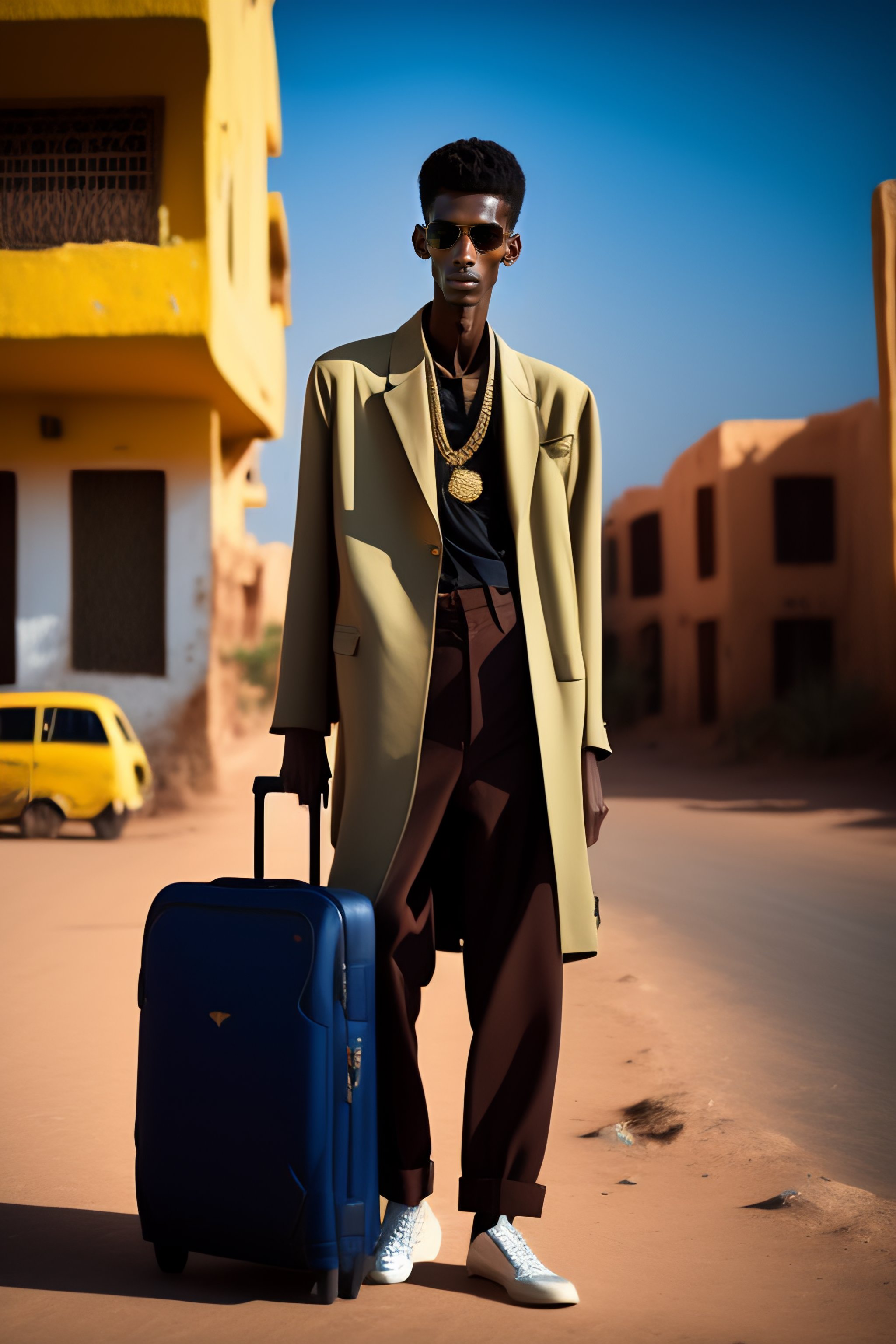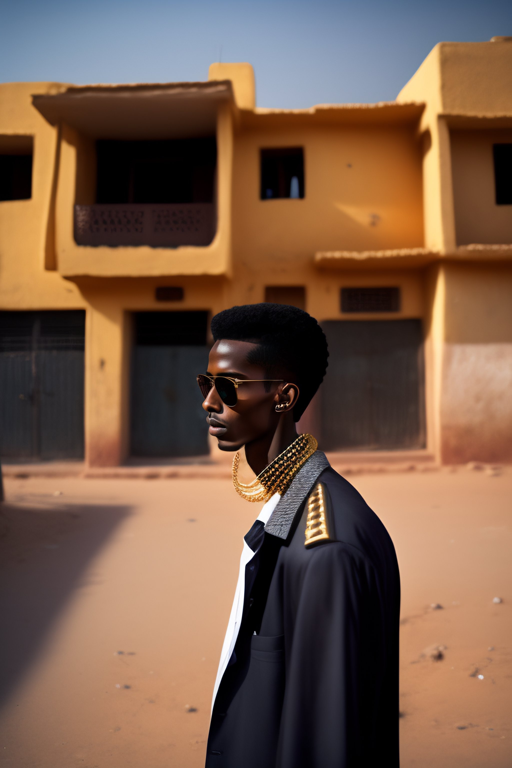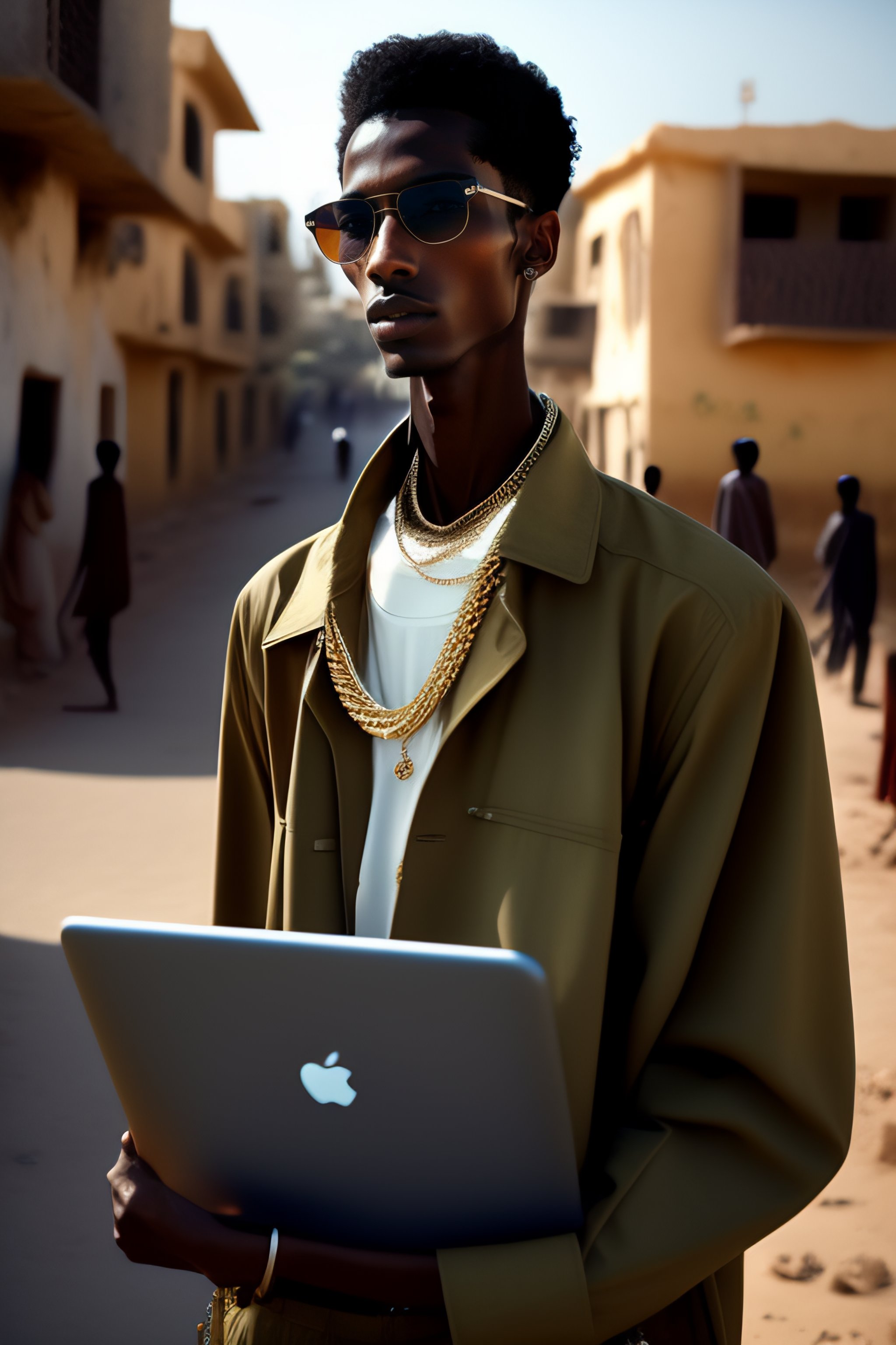 Tall and skinny somali hacker who is 18 years old. he holding up his laptop in his hand as looks at the screen and walks through the streets of mogadishu. he is wearing american clothes, gold chains and sunglasses. the image is in the style of noir films.