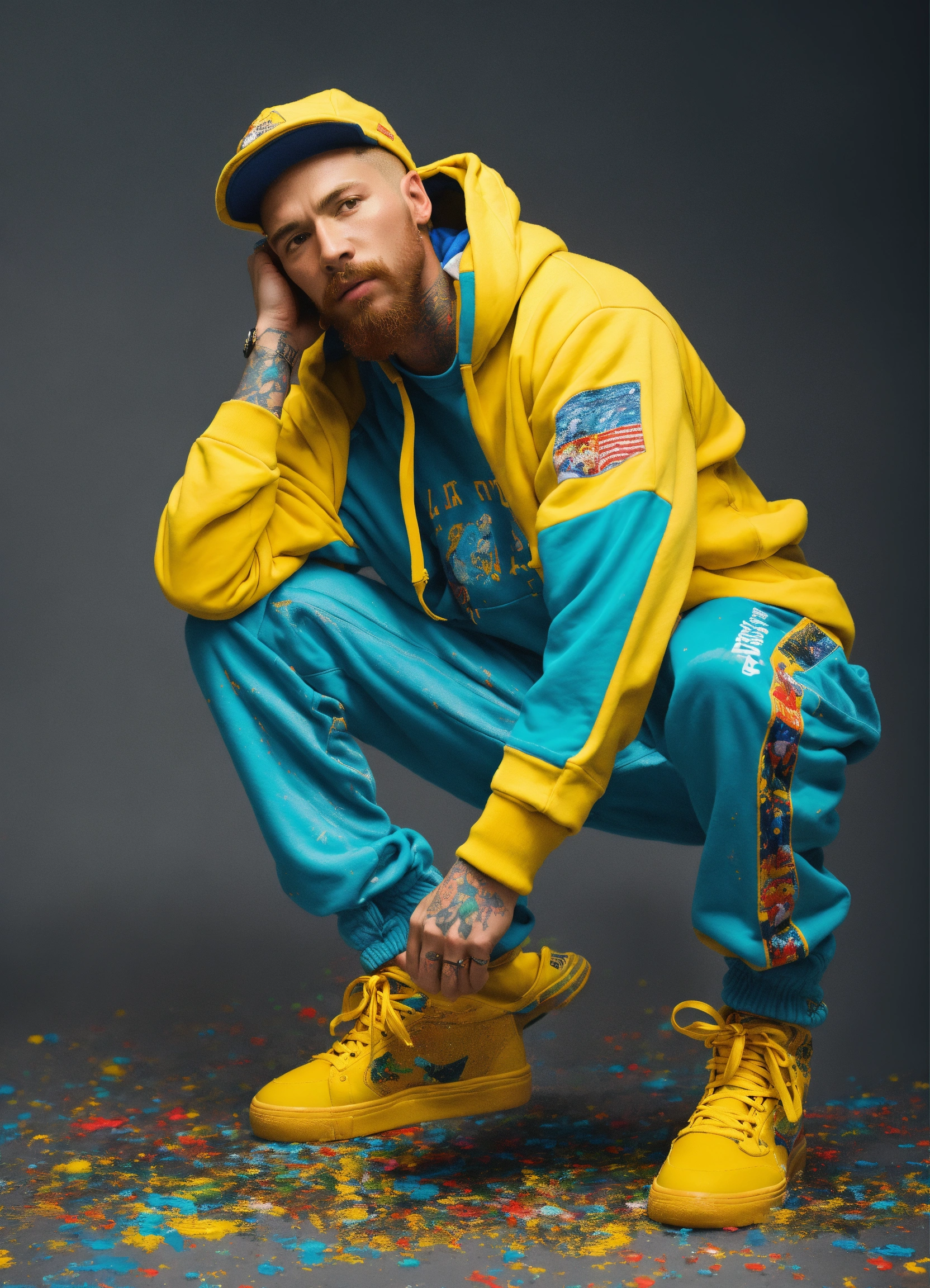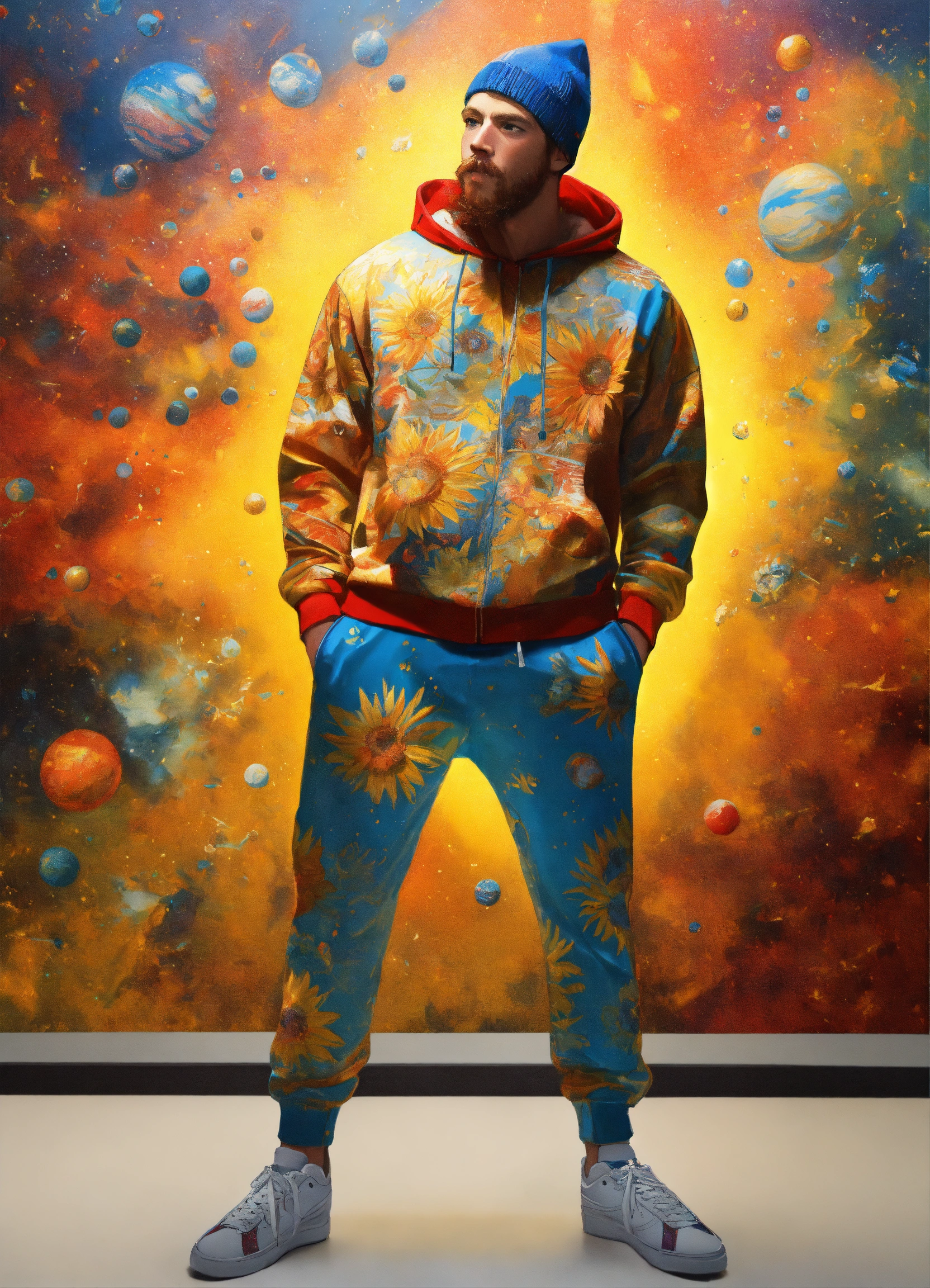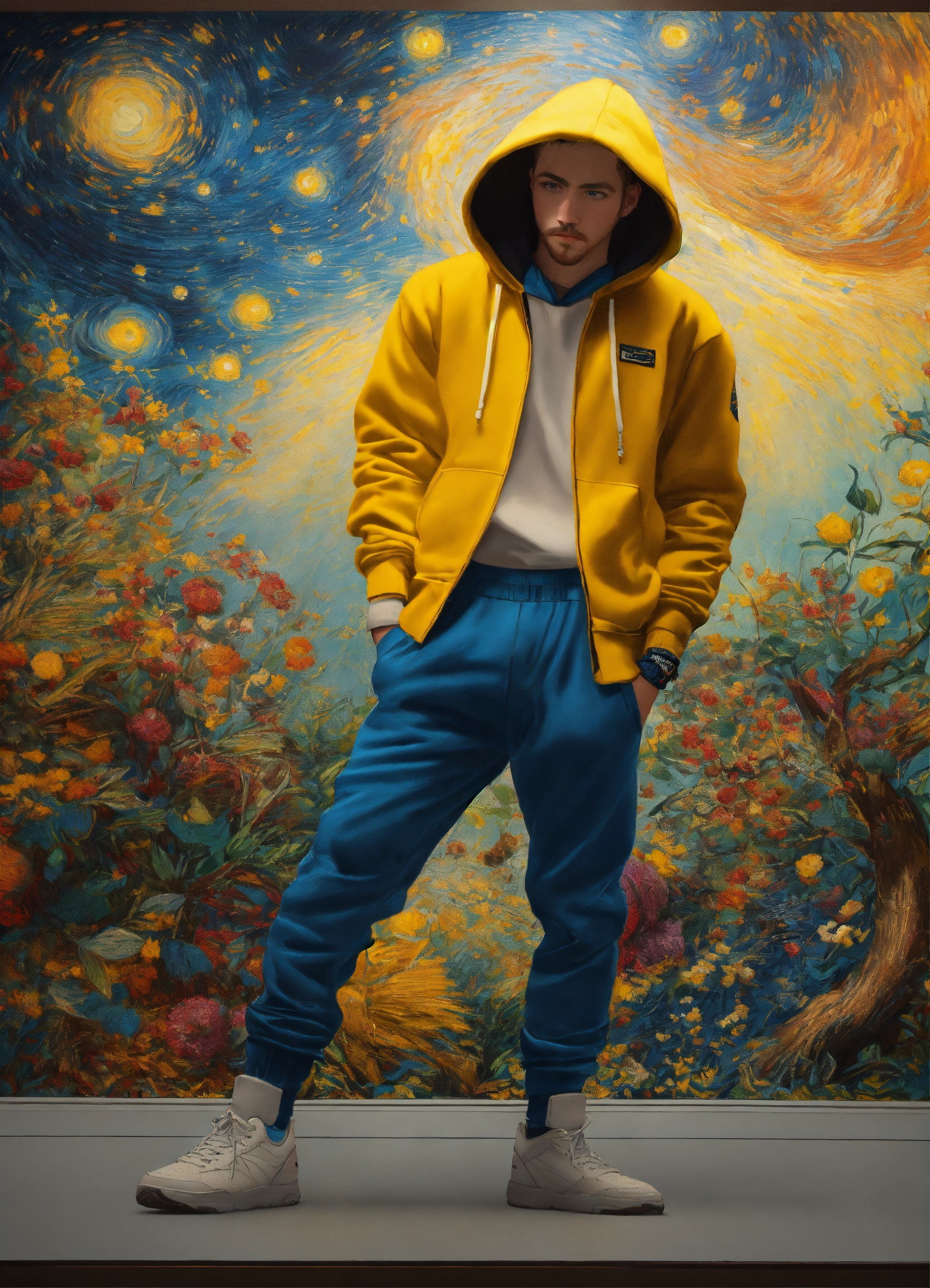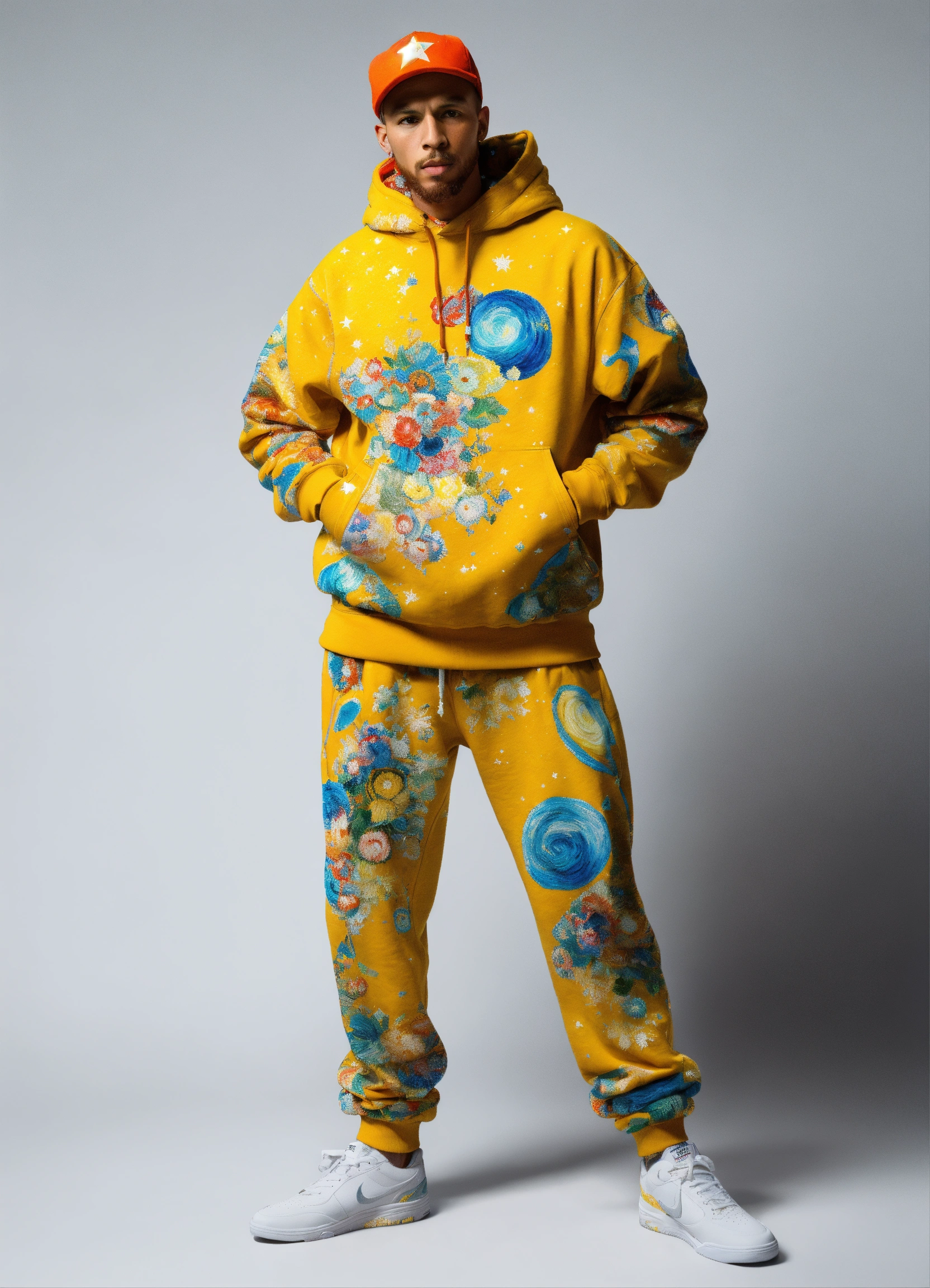 Plain white background, solid white back ground, highly detailed representation of an anatomically correct, full body length portrait, full length image, color realistic image of an animated, artist vincent van gogh dressed like a modern rapper, wearing starry night decorated color painted sweat pants and hoodie set. break dancing, art by greg rutowski and norman rockwell, white background, ultra hd, realistic, vivid colors, highly detailed, uhd drawing, pen and ink, perfect composition, beautiful detailed intricate insanely detailed octane render trending on artstation, 8k artistic photography, photorealistic concept art. soft natural volumetric cinematic perfect light