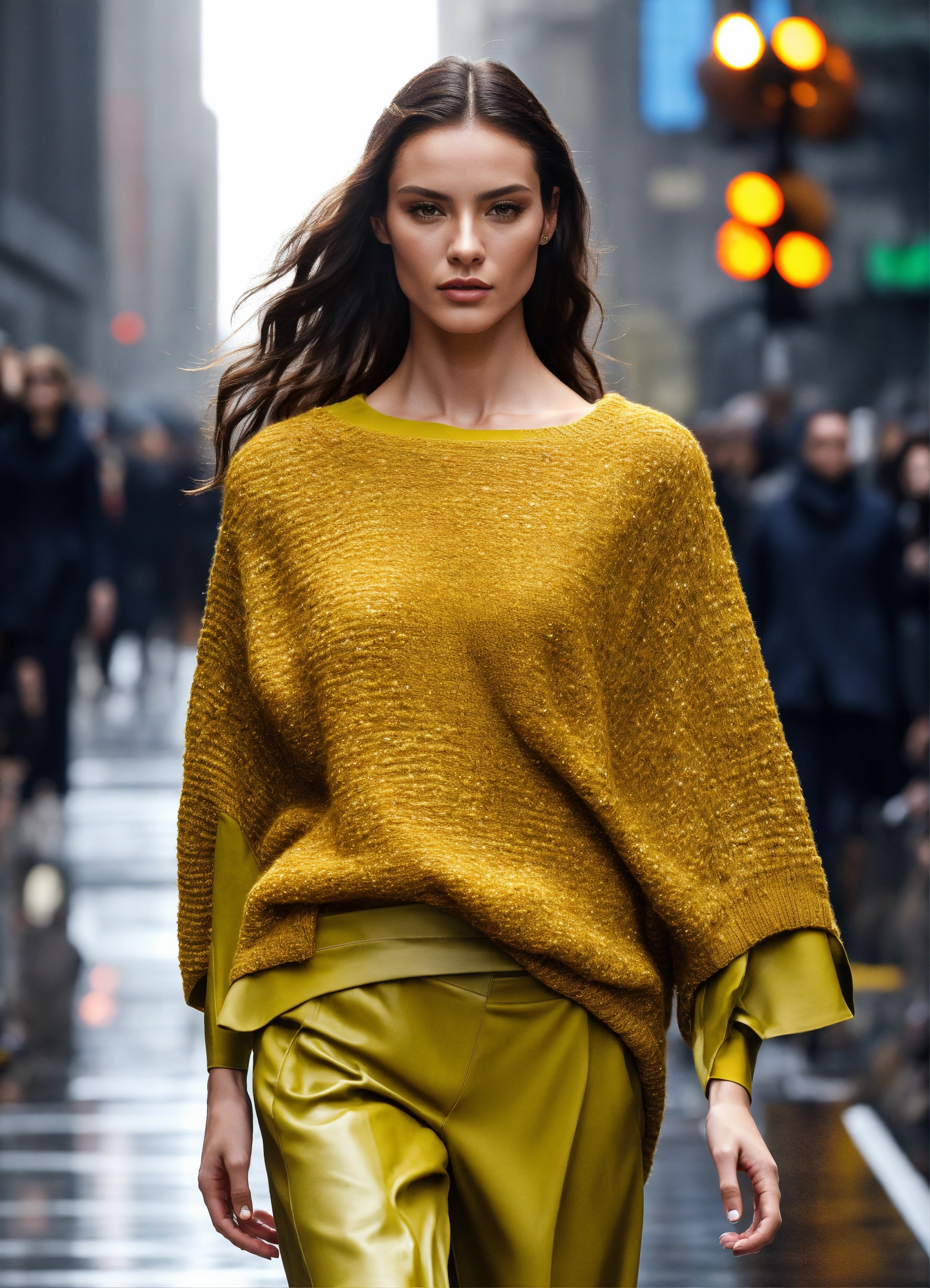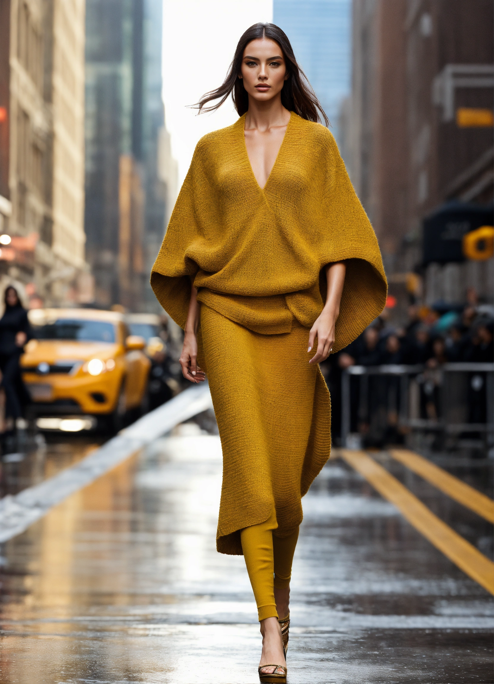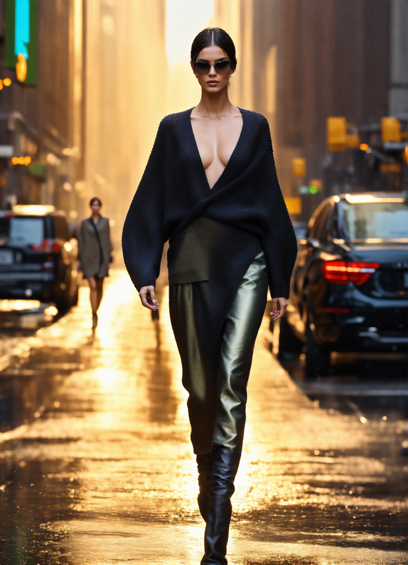 3d realistic photo of fierce italian model wearing dolman sleeve donna karan upscale fashion in luxury knit walking a runway in new york in the sunshine and rain
