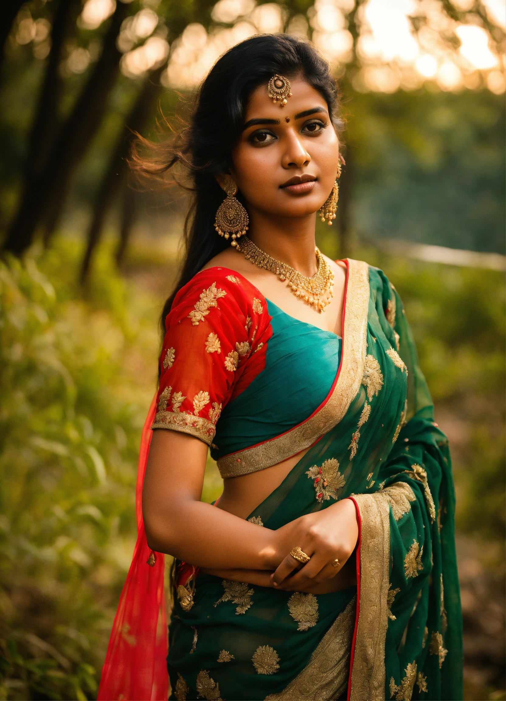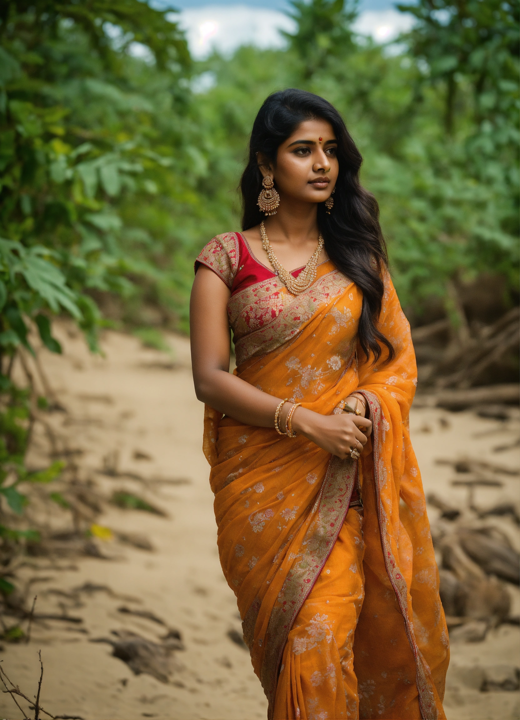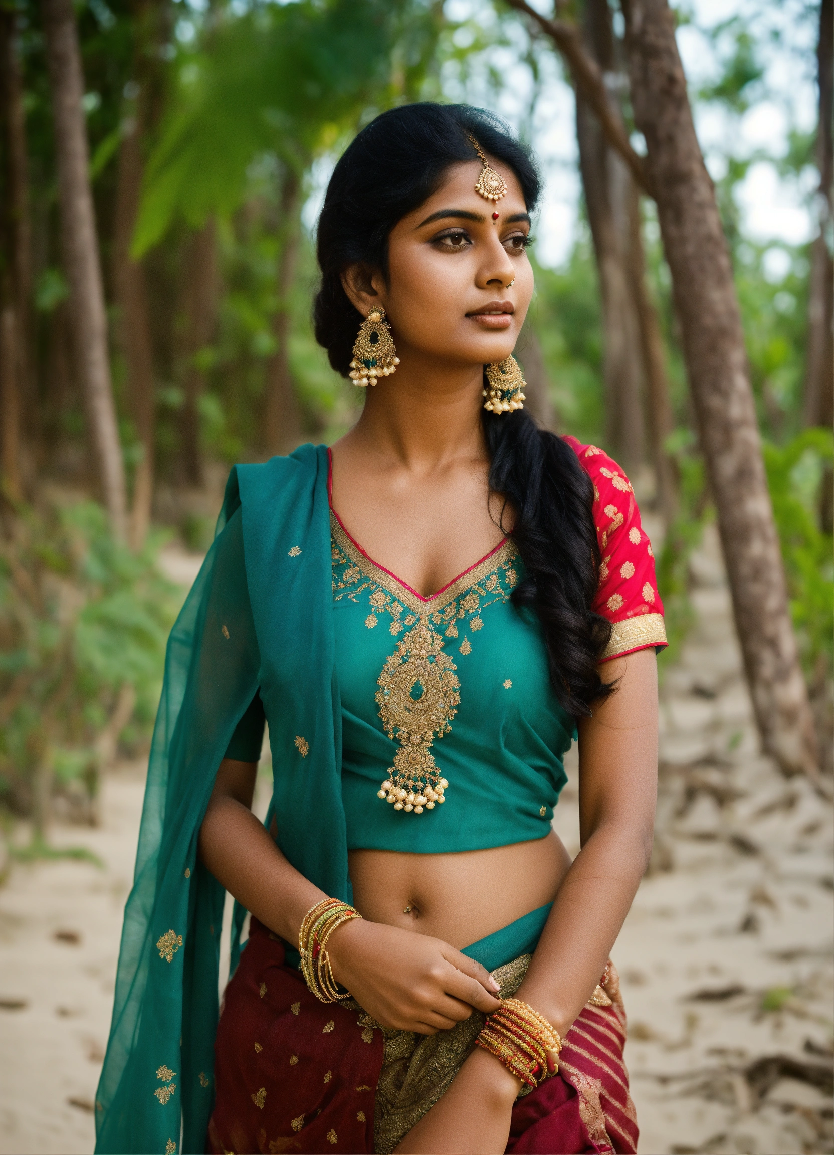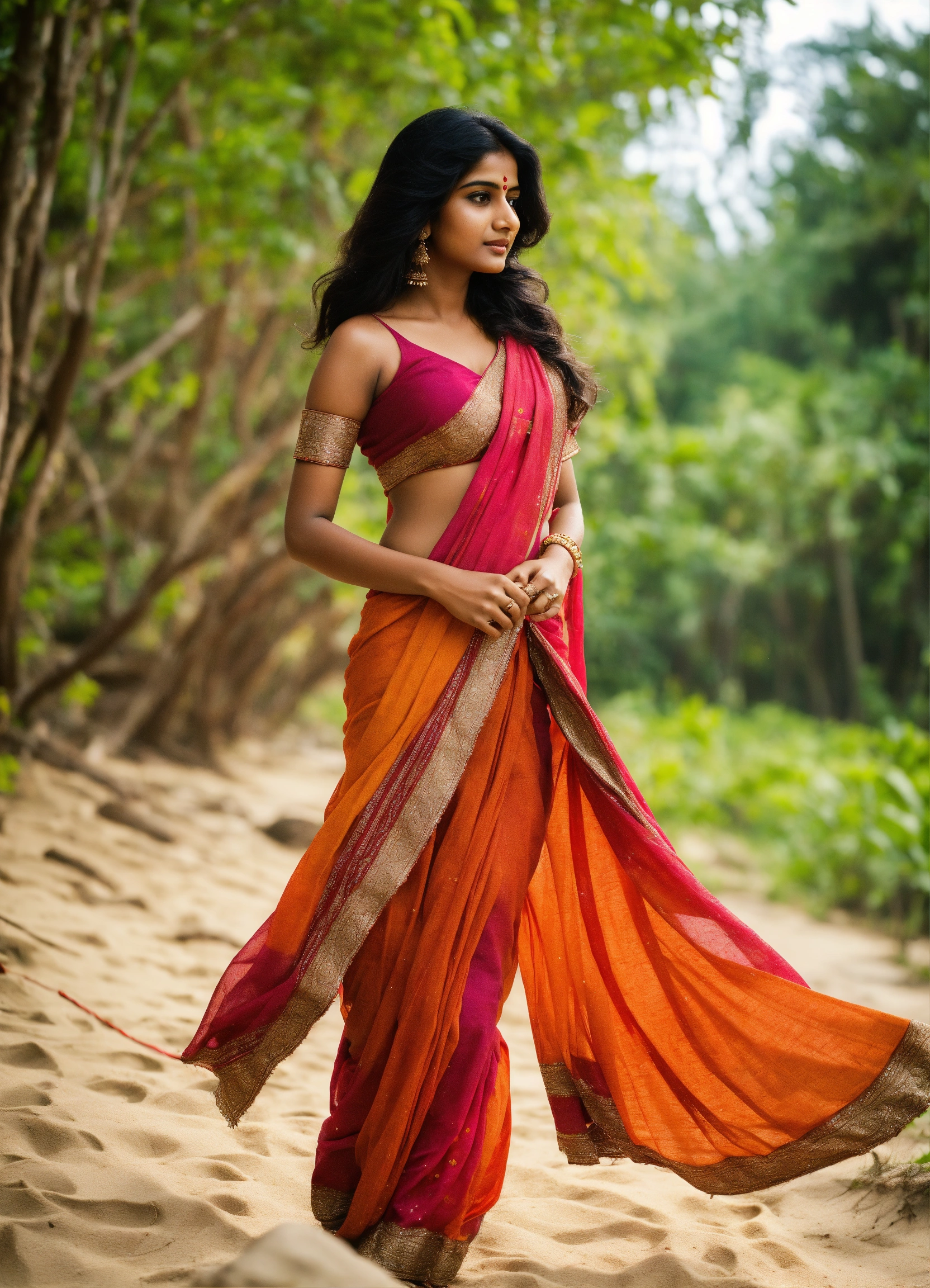 A beautiful indian girl walking on the beach in a sari blouse near the forest