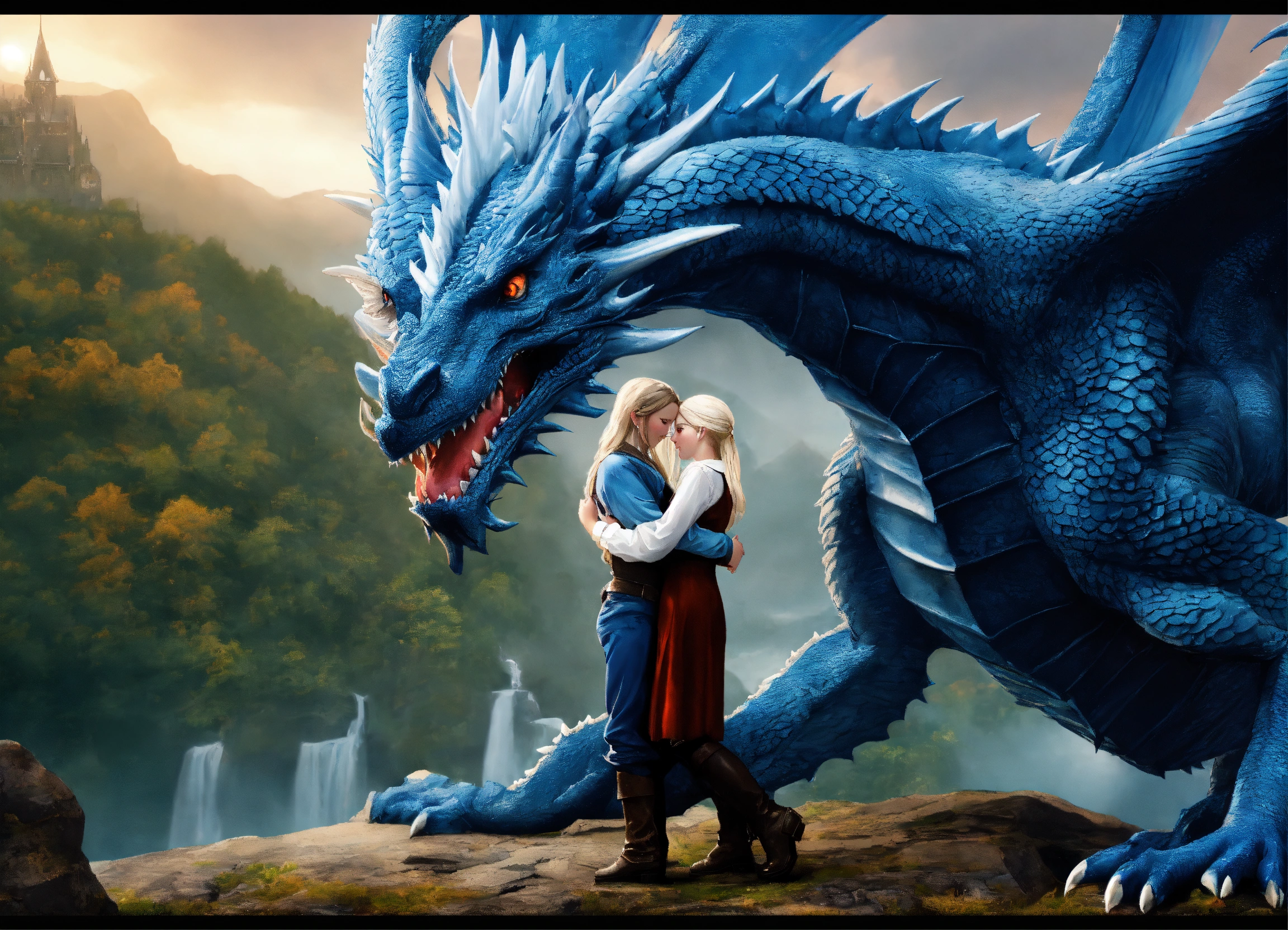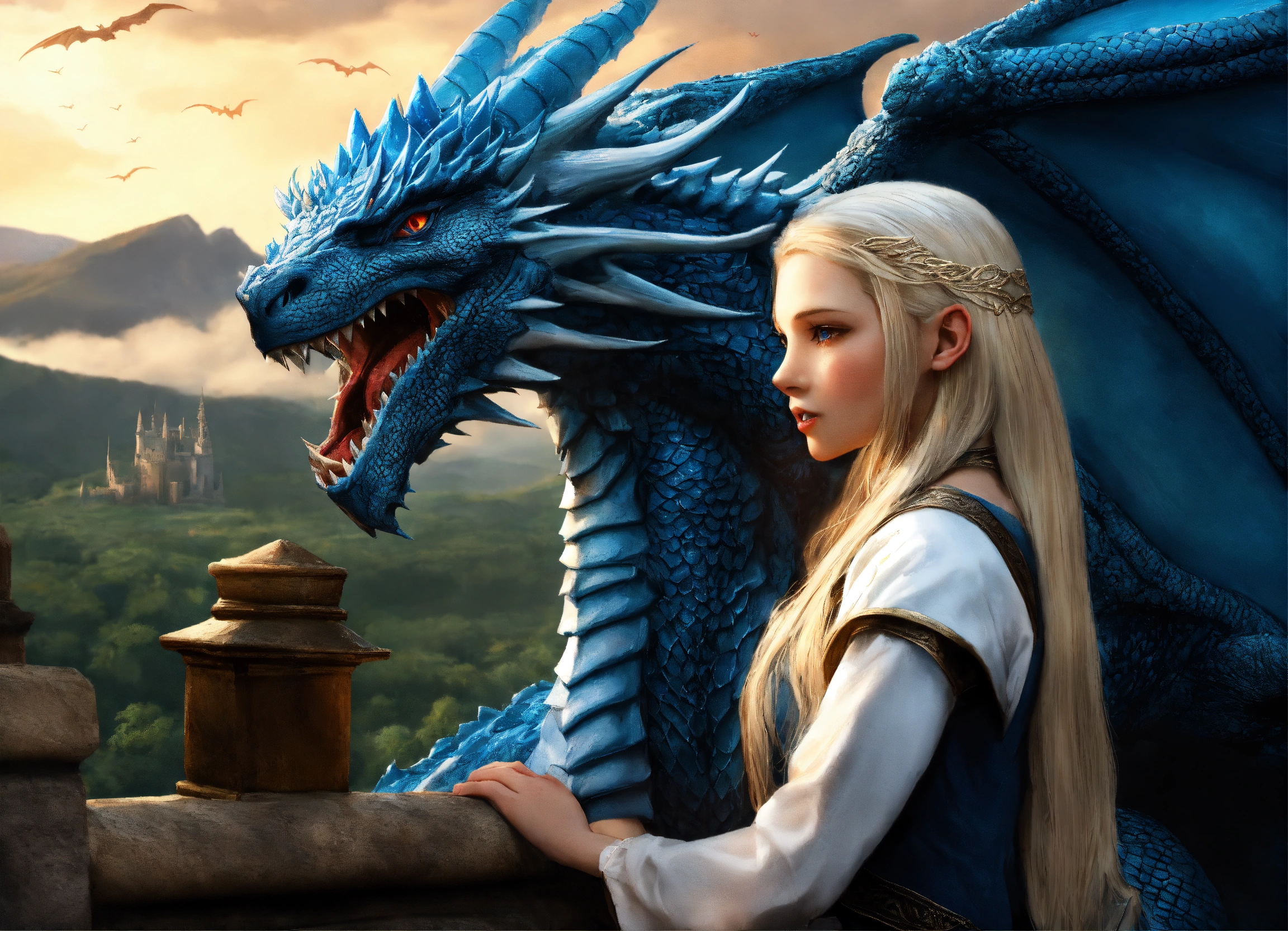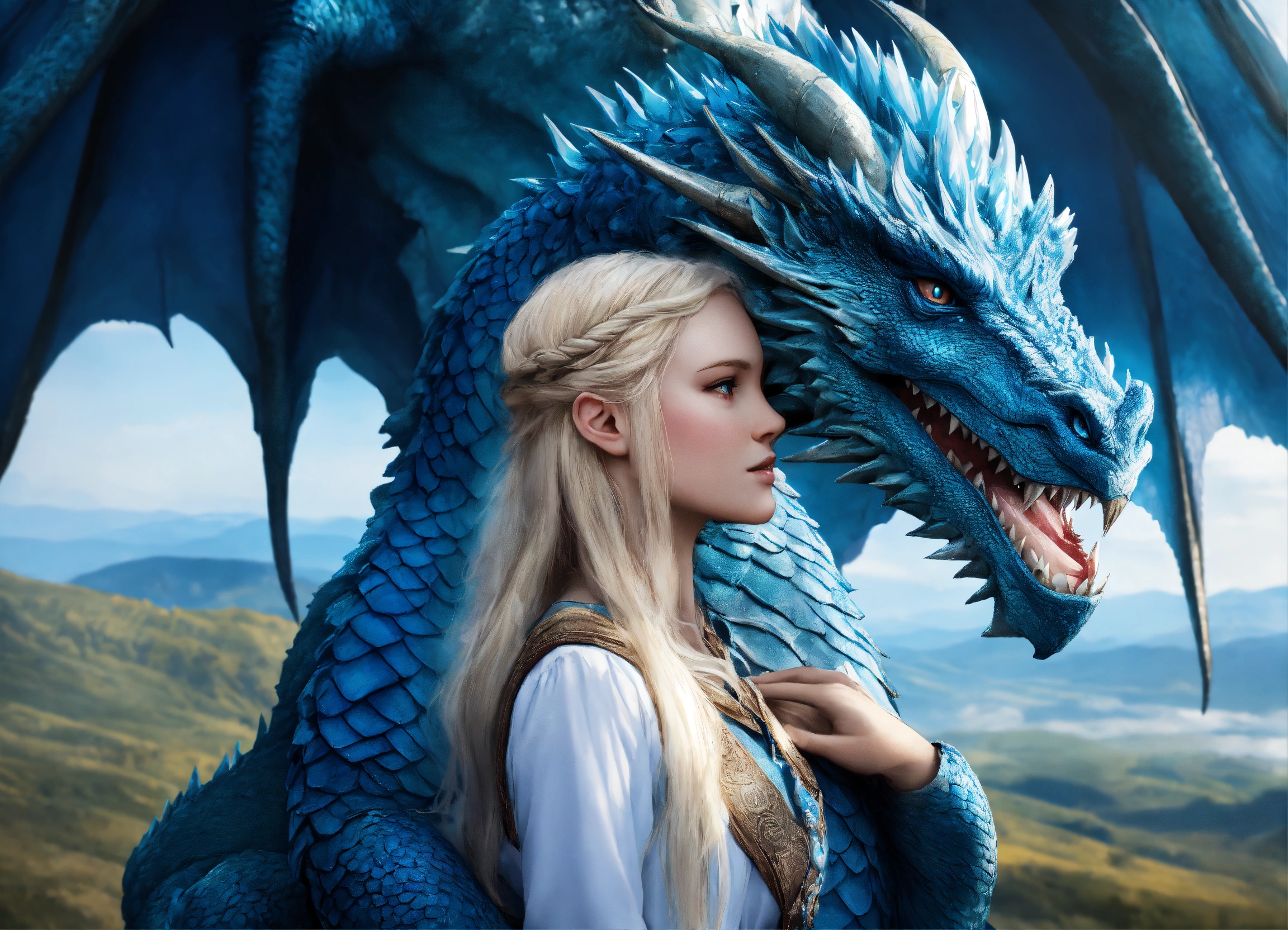 Terrifying giant blue dragon with a beautiful 15 year old whiteblond elvish girl which is hugging the dragons head, the dragon's head is as big as the entire girl, innocent, ultra detailled, ultra realistic, medieval setting