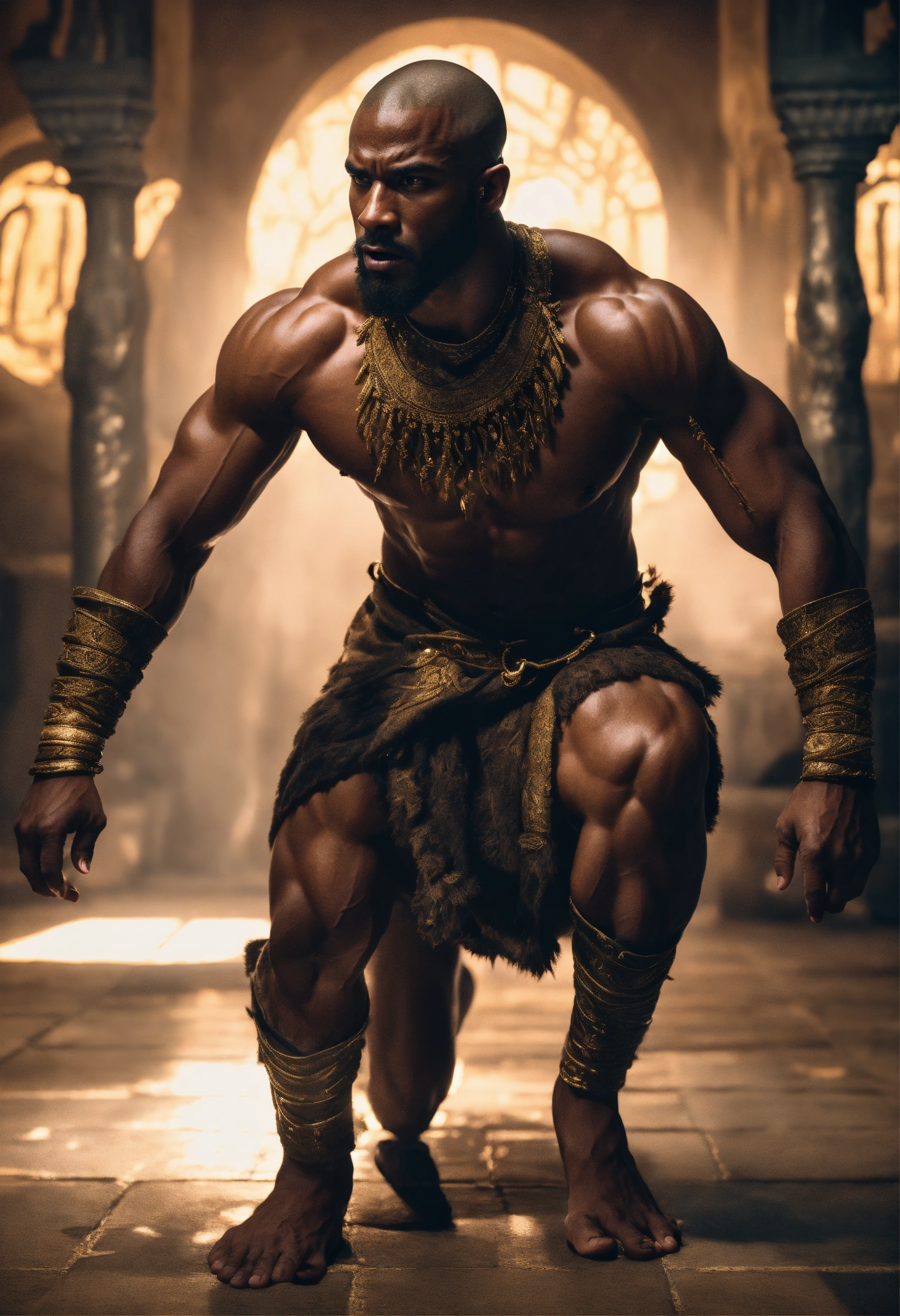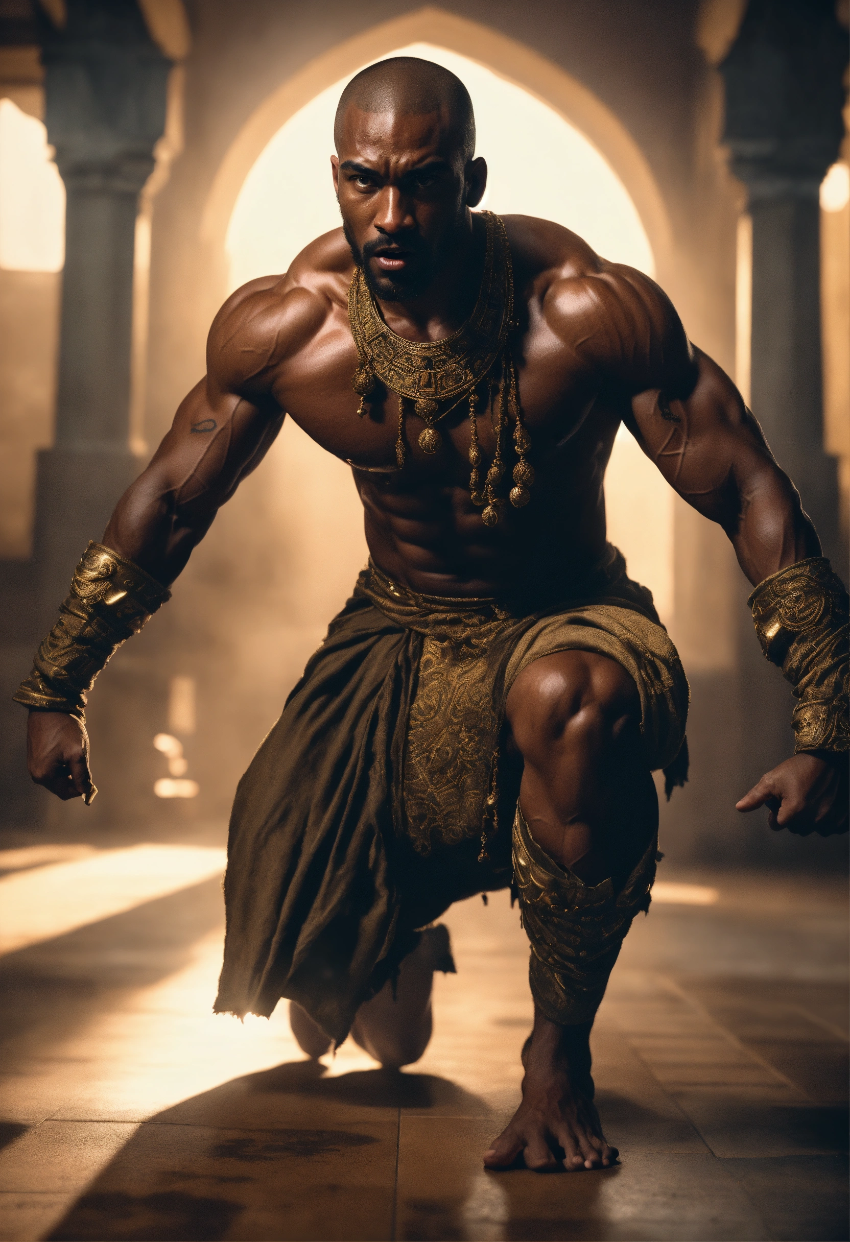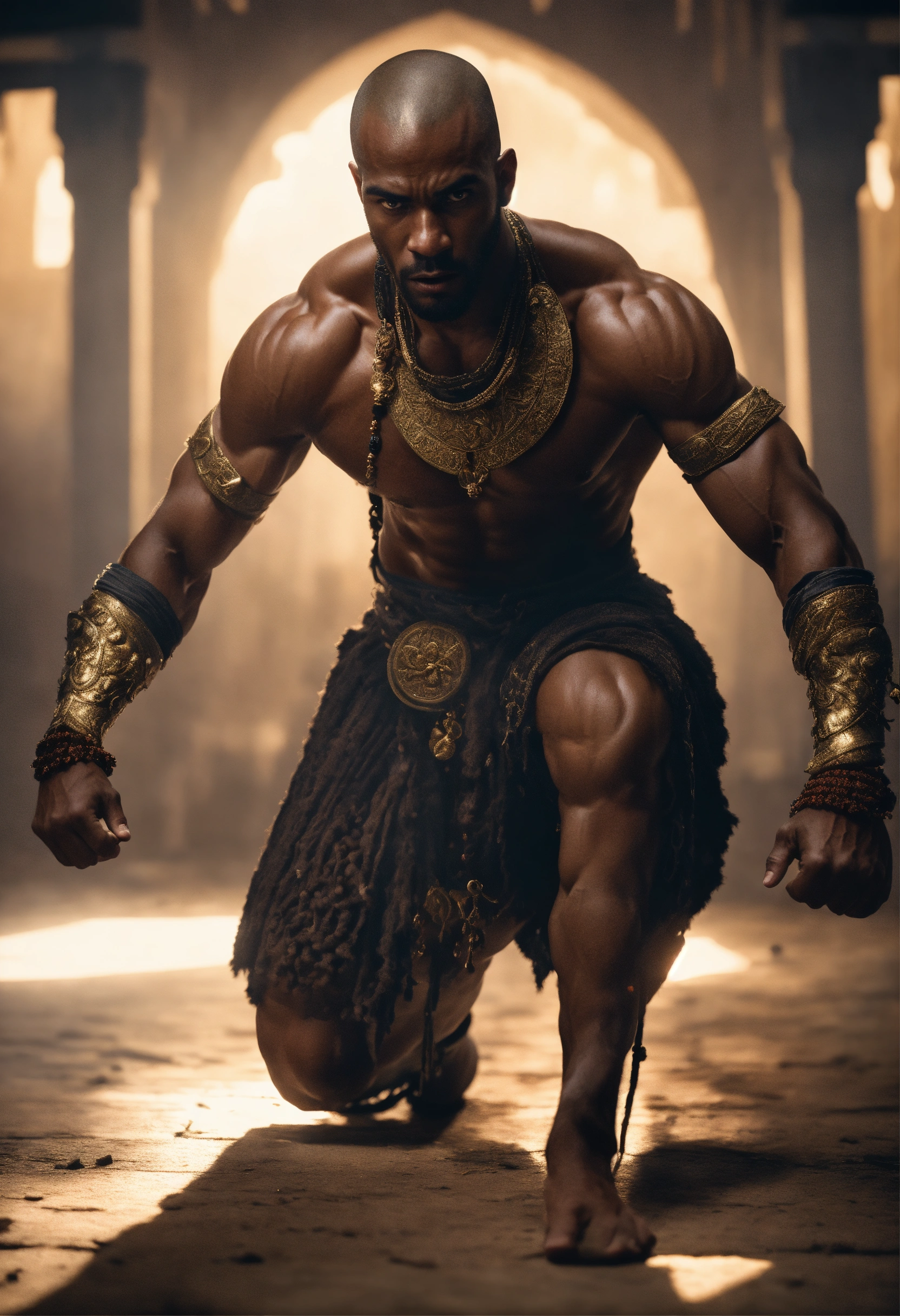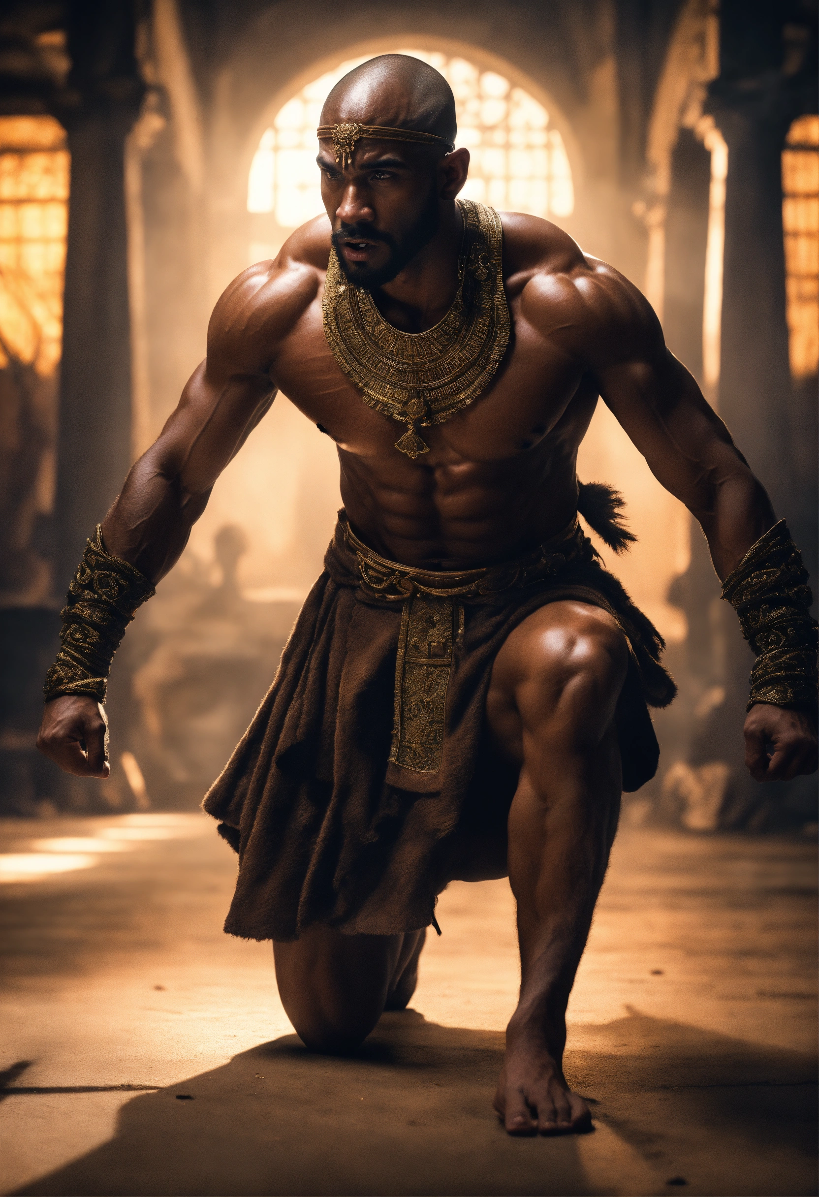 An epic fantasy scene featuring a muscular ancient nubian male with frighten look, fell on his knees on the floor, arms outstretched in fear, highly-detailed, full motion, high expression, shaved head, photo realistic, beautiful, moody lighting, best quality, realistic, close side view, intricate details, depth of field, raw photo, 8k uhd, film grain