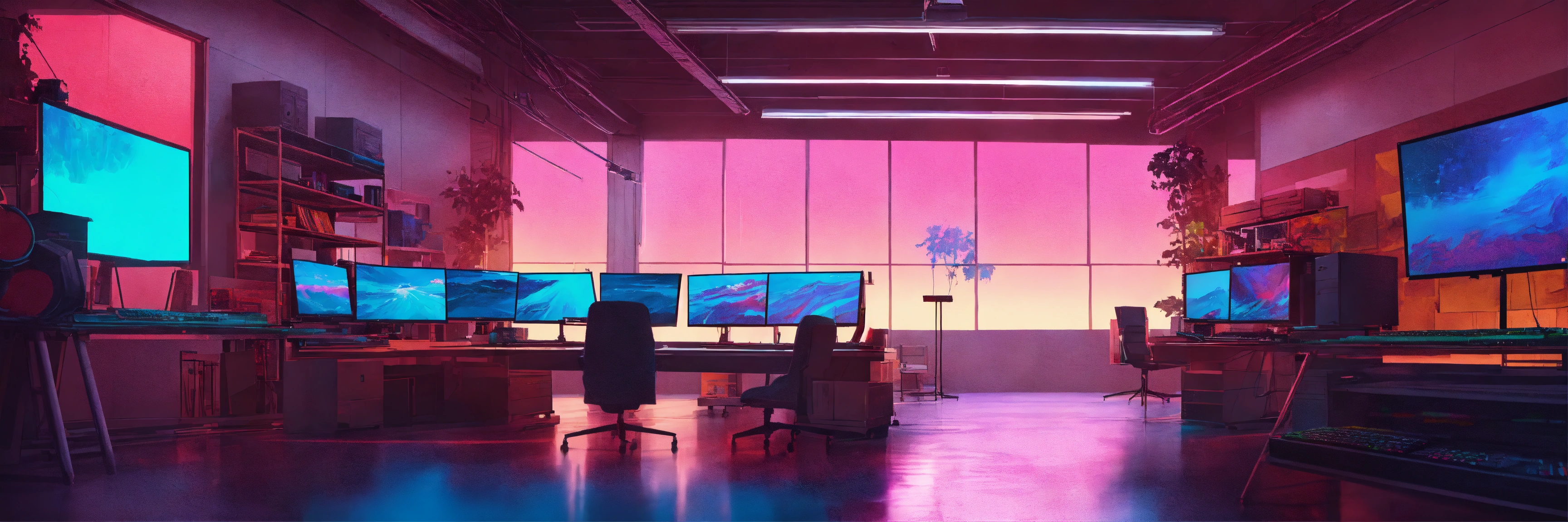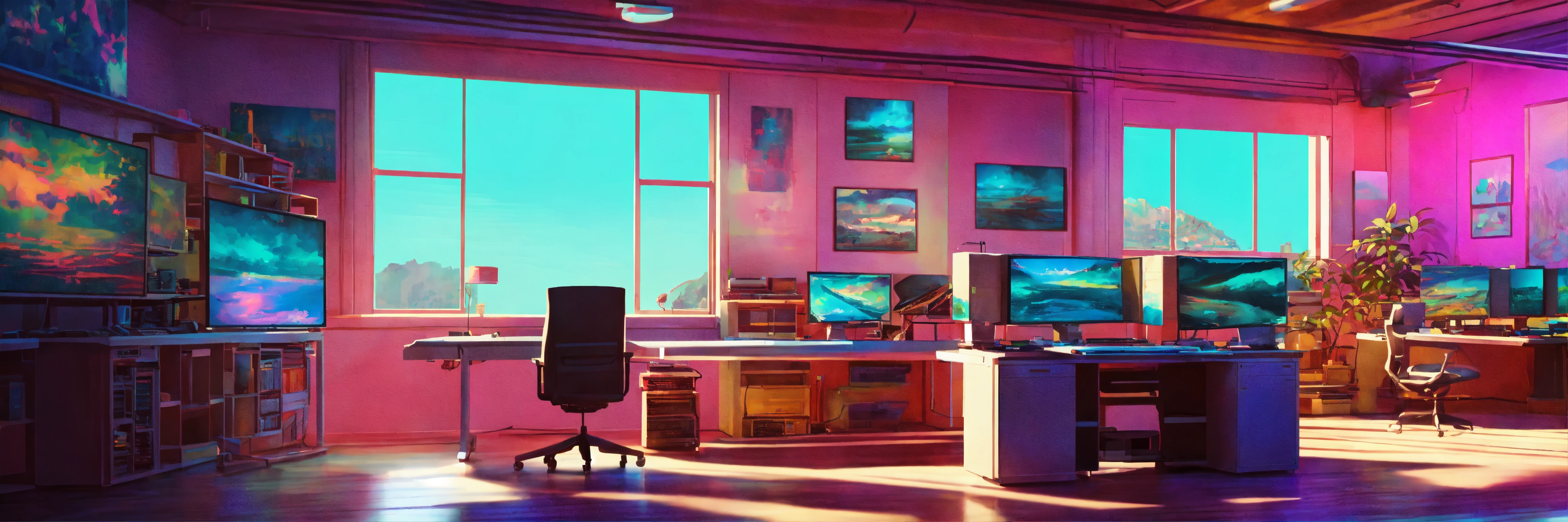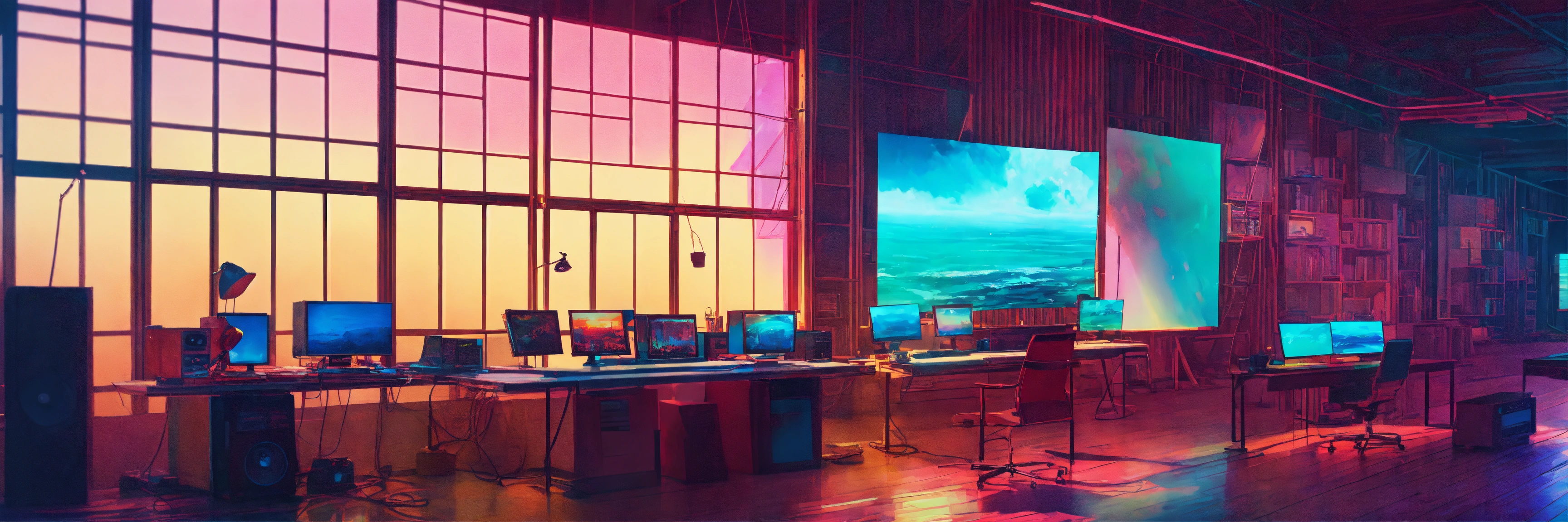 A beautiful, sharp focus, high ceiling artist studio. there are large paintings on the wall. there is a huge artist desk with old computers on. there are shelves in the background with old computer screens.. wide angle. vaporwave ombre rendering. by chris moore. beeple colors. ambient occlusion. digital painting.