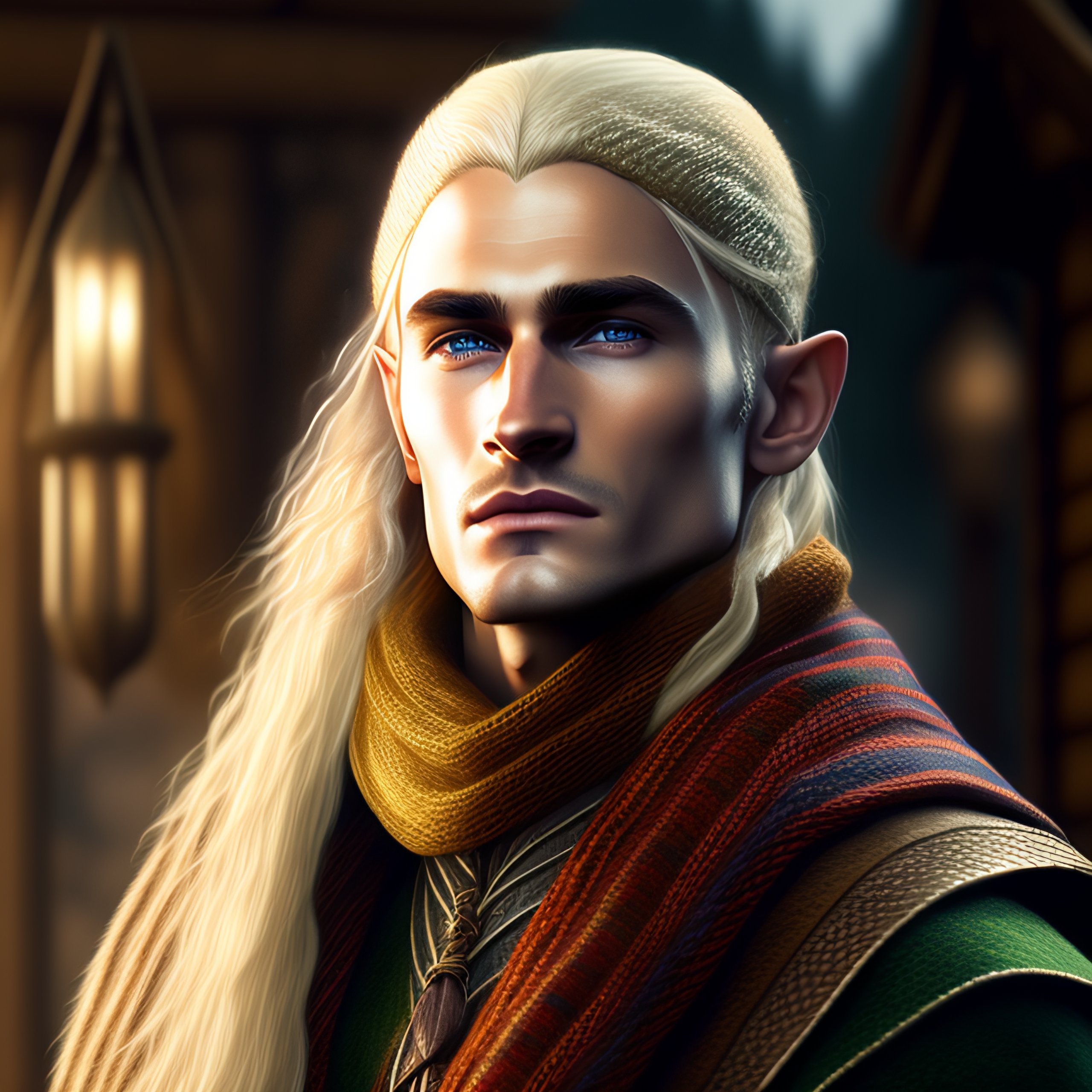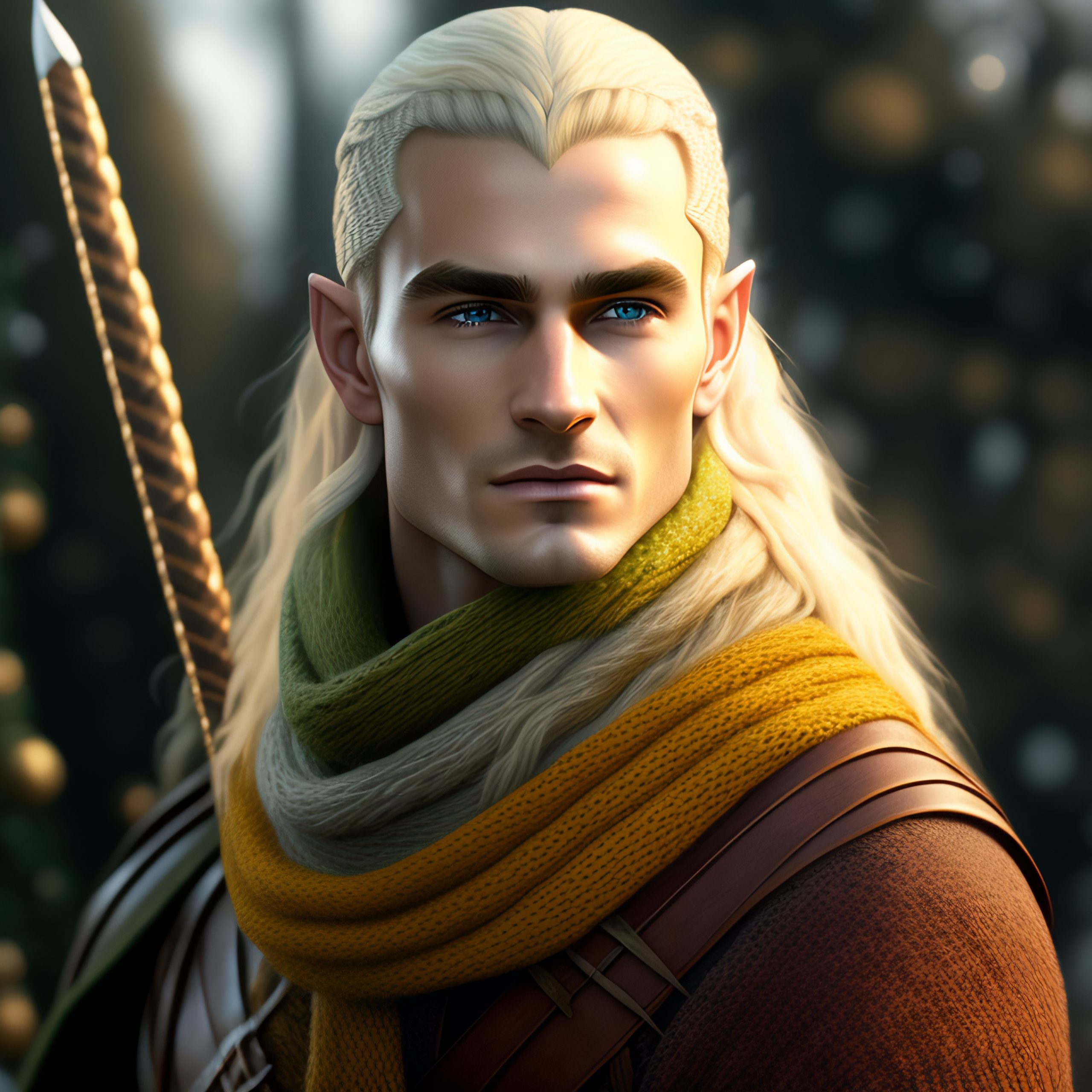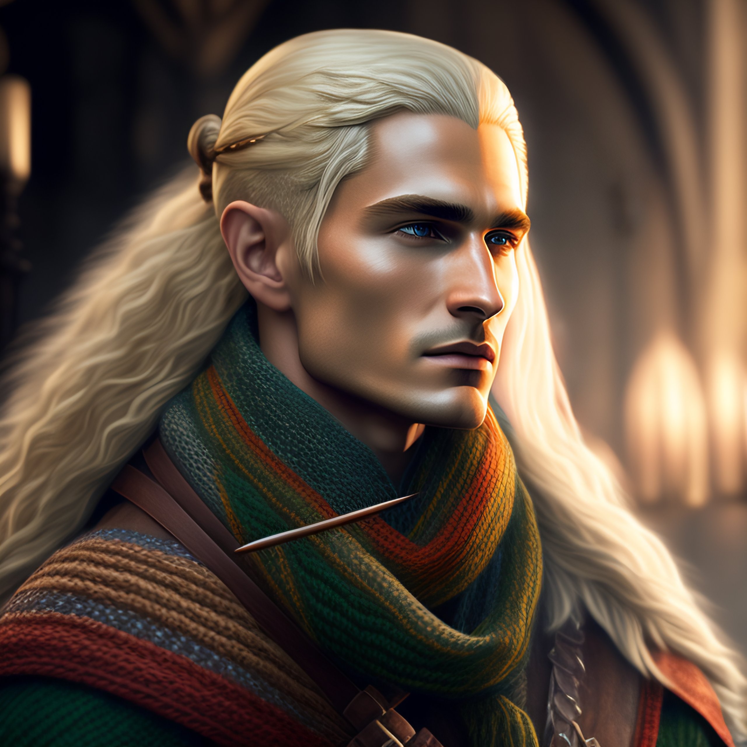 Legolas knitting, male elf with blonde hair knits a scarf, lord of the rings, photorealistic, 4k render
