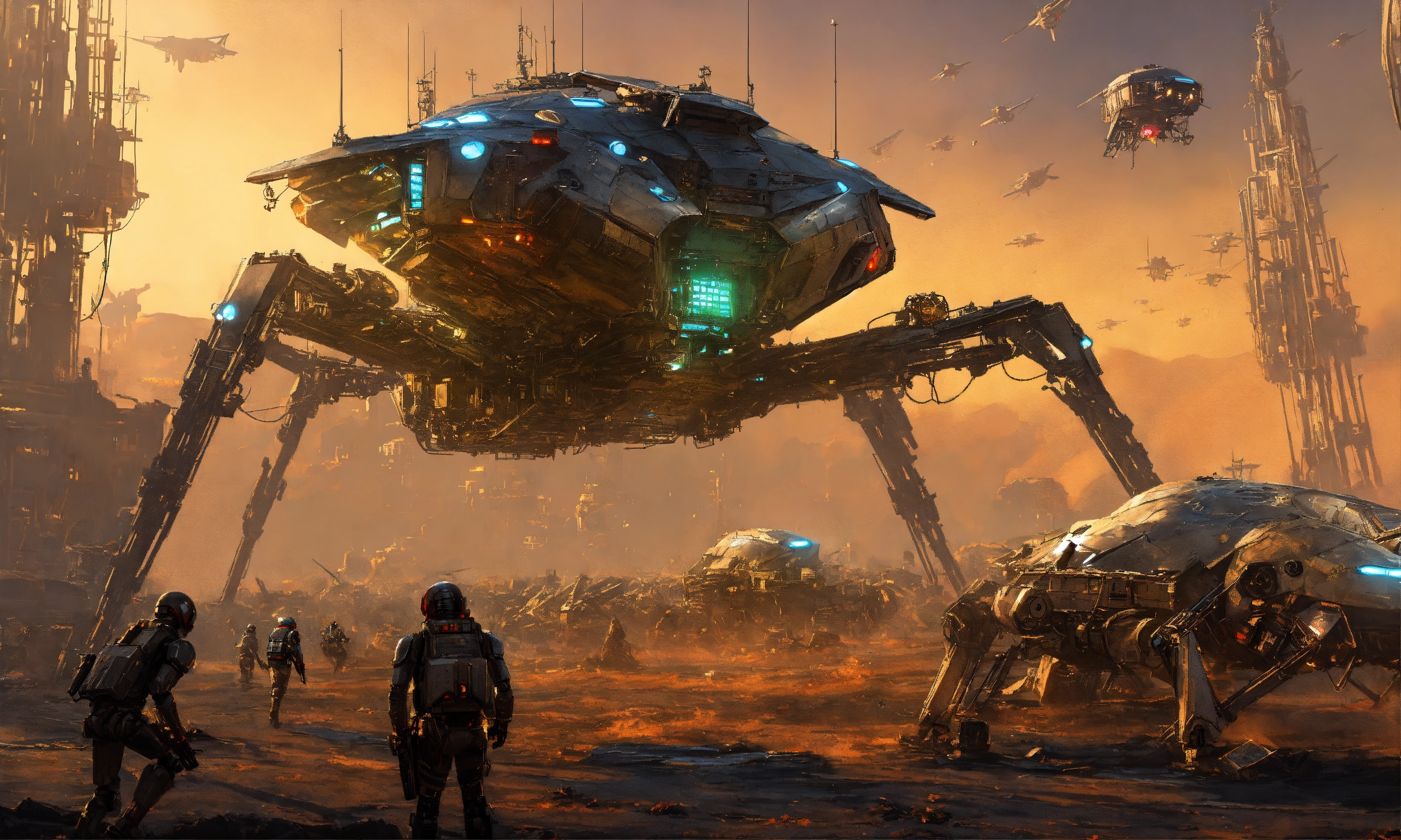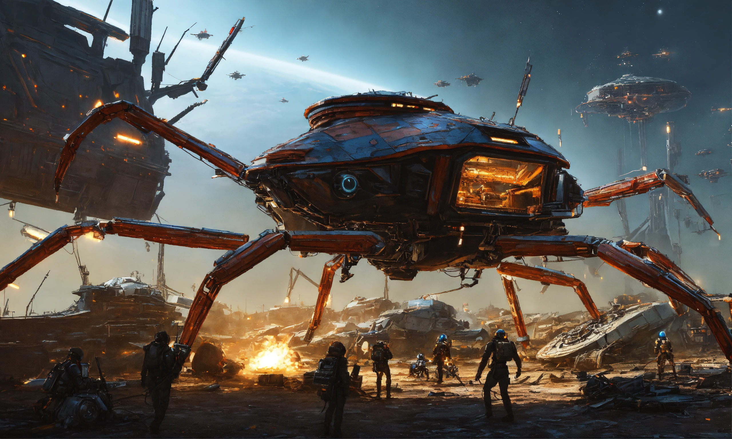 Rebel ships fighting swarms of robotic spider creatures futuristic, space ship junkyard, alien technology graveyard, quantum mechanics