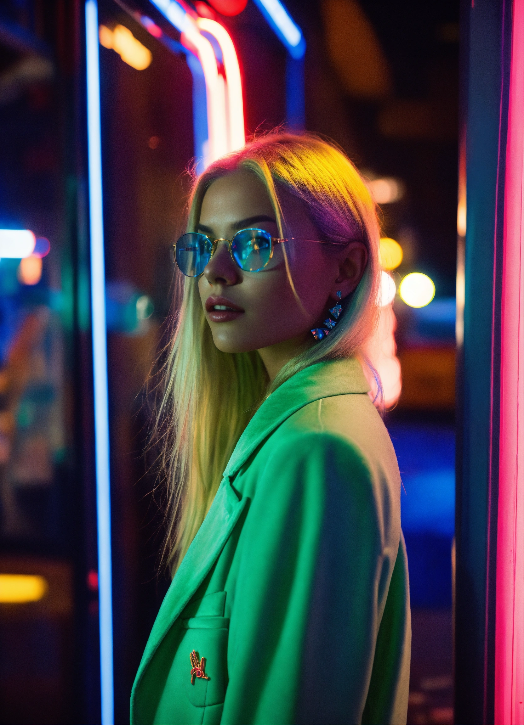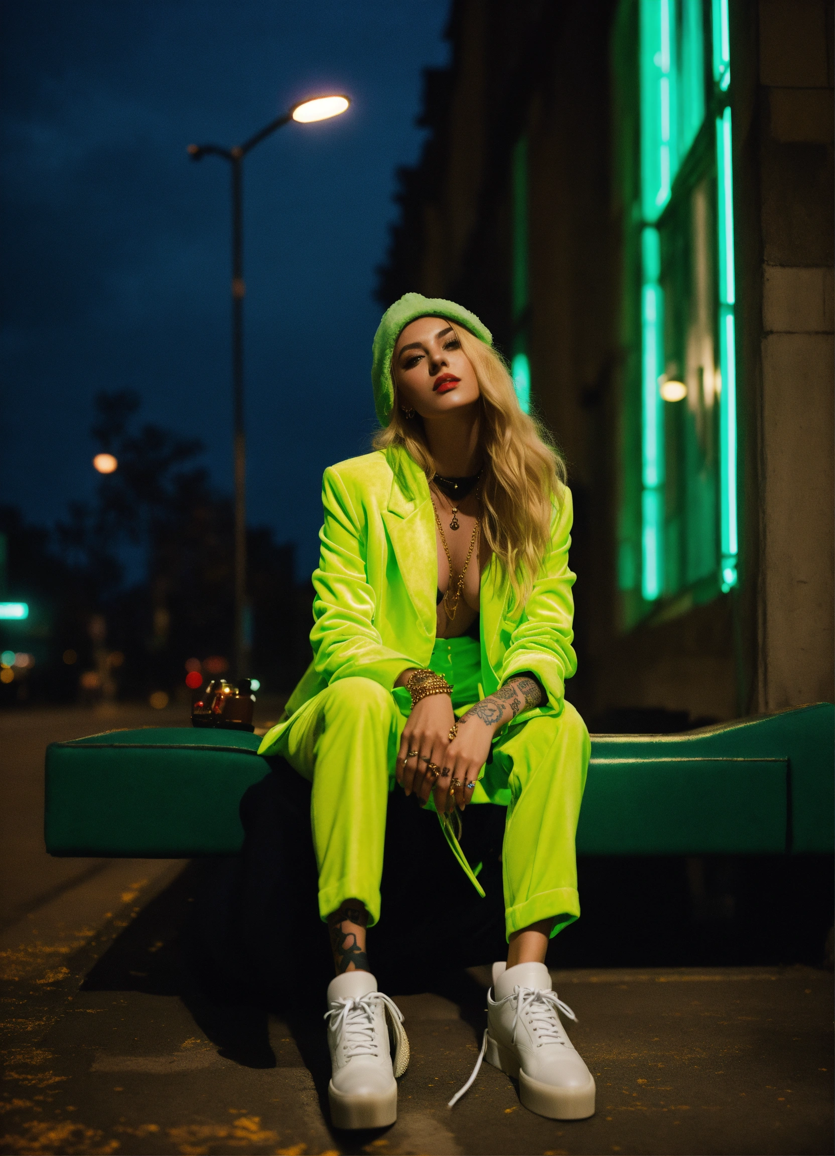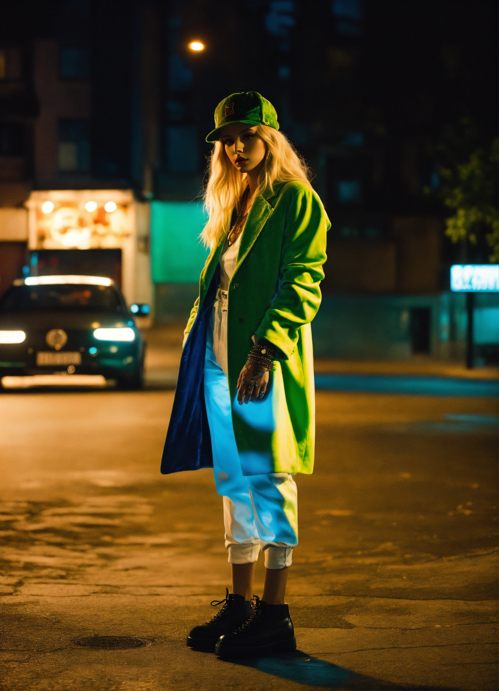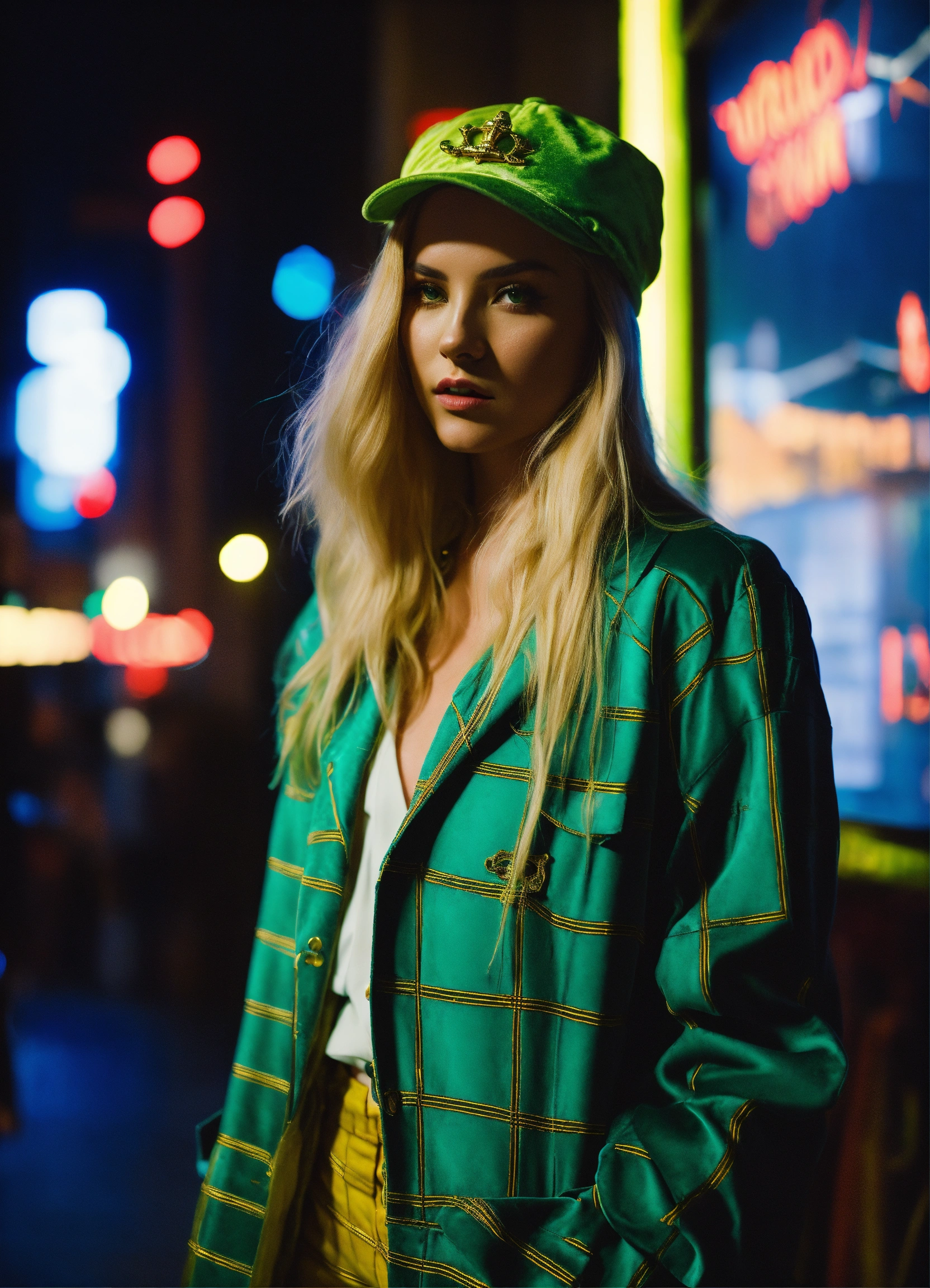 Meaningful surreal amateur fashion at night photoshoot of a beautiful blonde girl gangster influencer with really long hair, and lenses that emit a faint neon light from her eyes, crouching, wearing a blue cap, green velvet long blazer, a white shirt, brown and yellow checkered pants, wearing white and gold louboutin snakers with spikes, photo shoot, cinematic still shot, magazine photography, 35mm, film look, a tattoo on her hand, neon nights in a futuristic paris