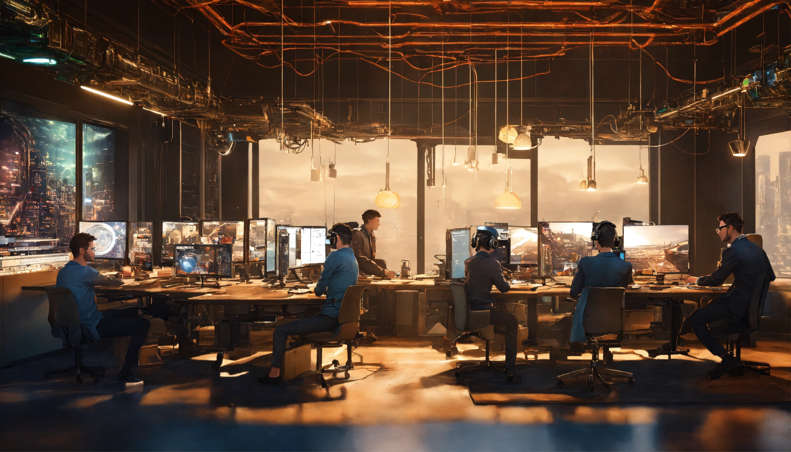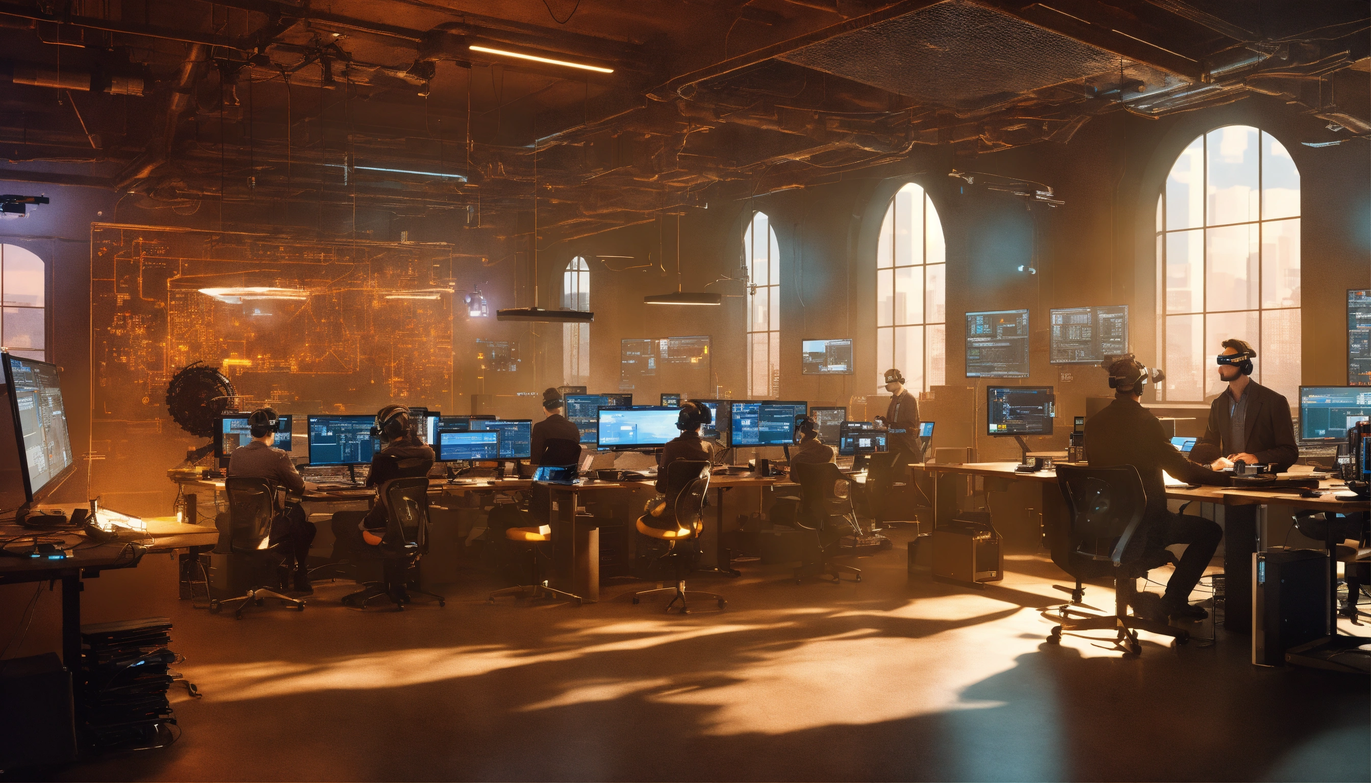In this picture, a group of developers is shown in a futuristic workspace, surrounded by state-of-the-art technology and virtual reality interfaces. they are engaged in pair programming, collaborating closely and leveraging modern tools and techniques to write clean and efficient code. this image represents the adoption of modern software development practices, emphasizing collaboration, code quality, and cutting-edge technologies. in steampunk drawing format