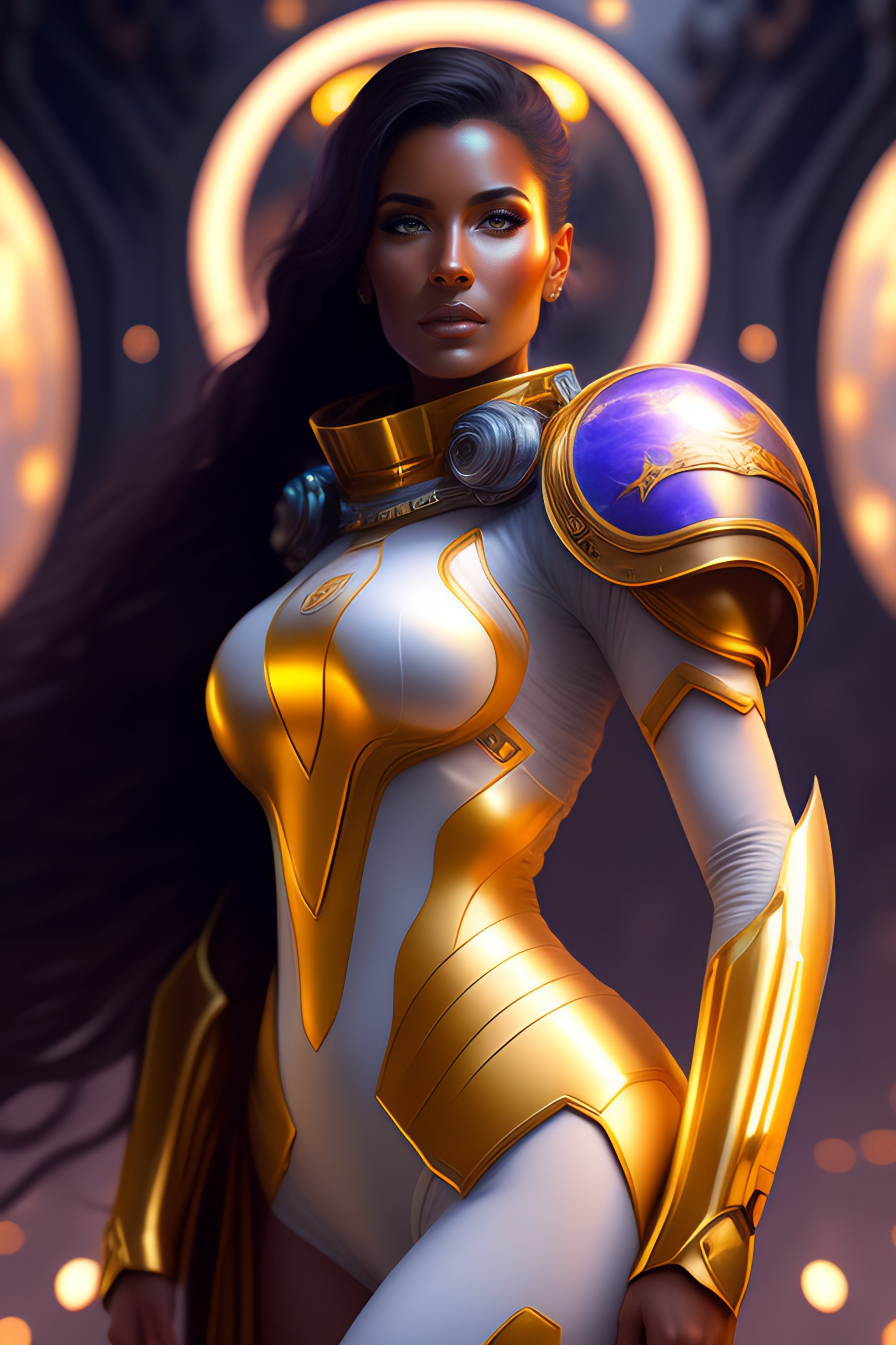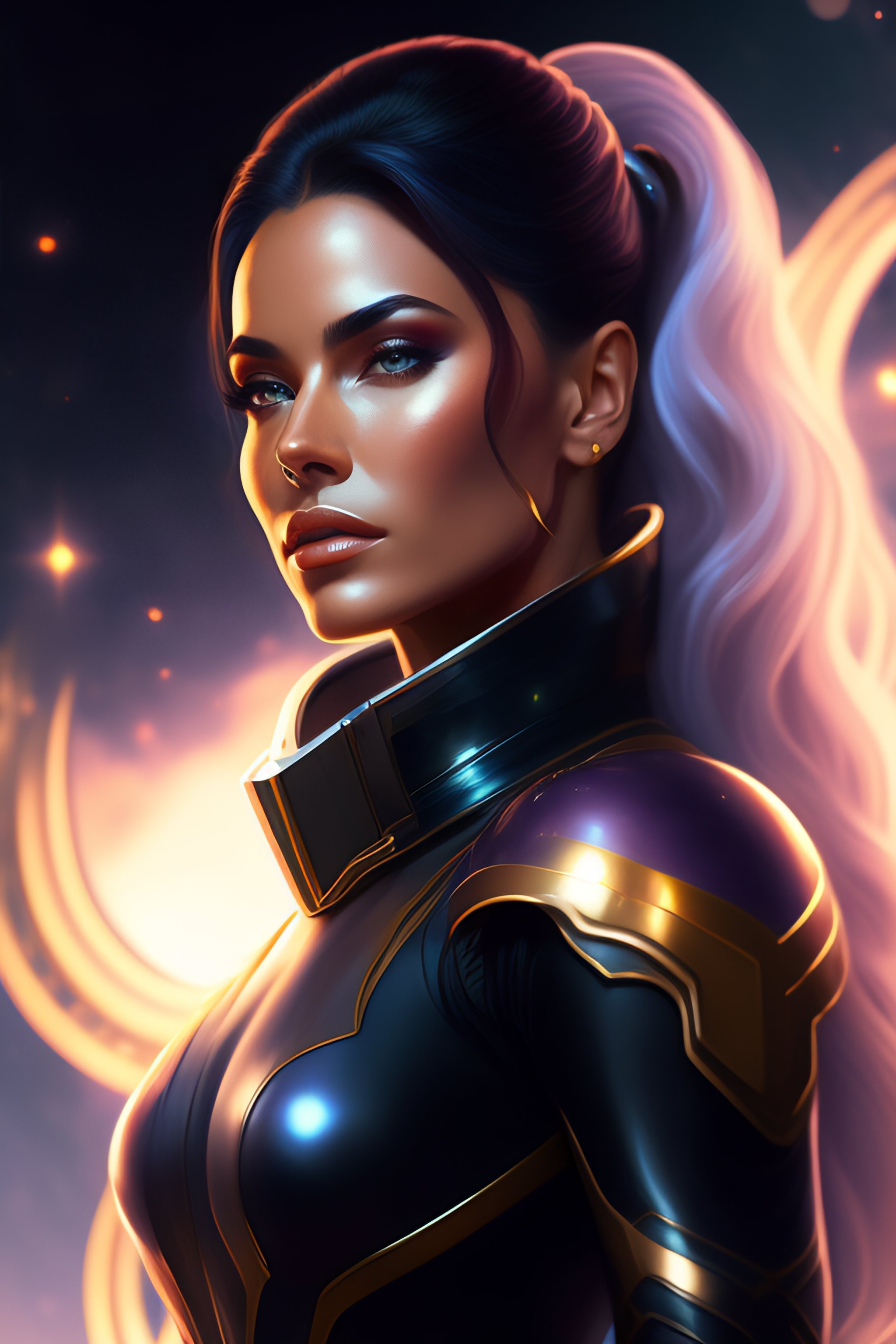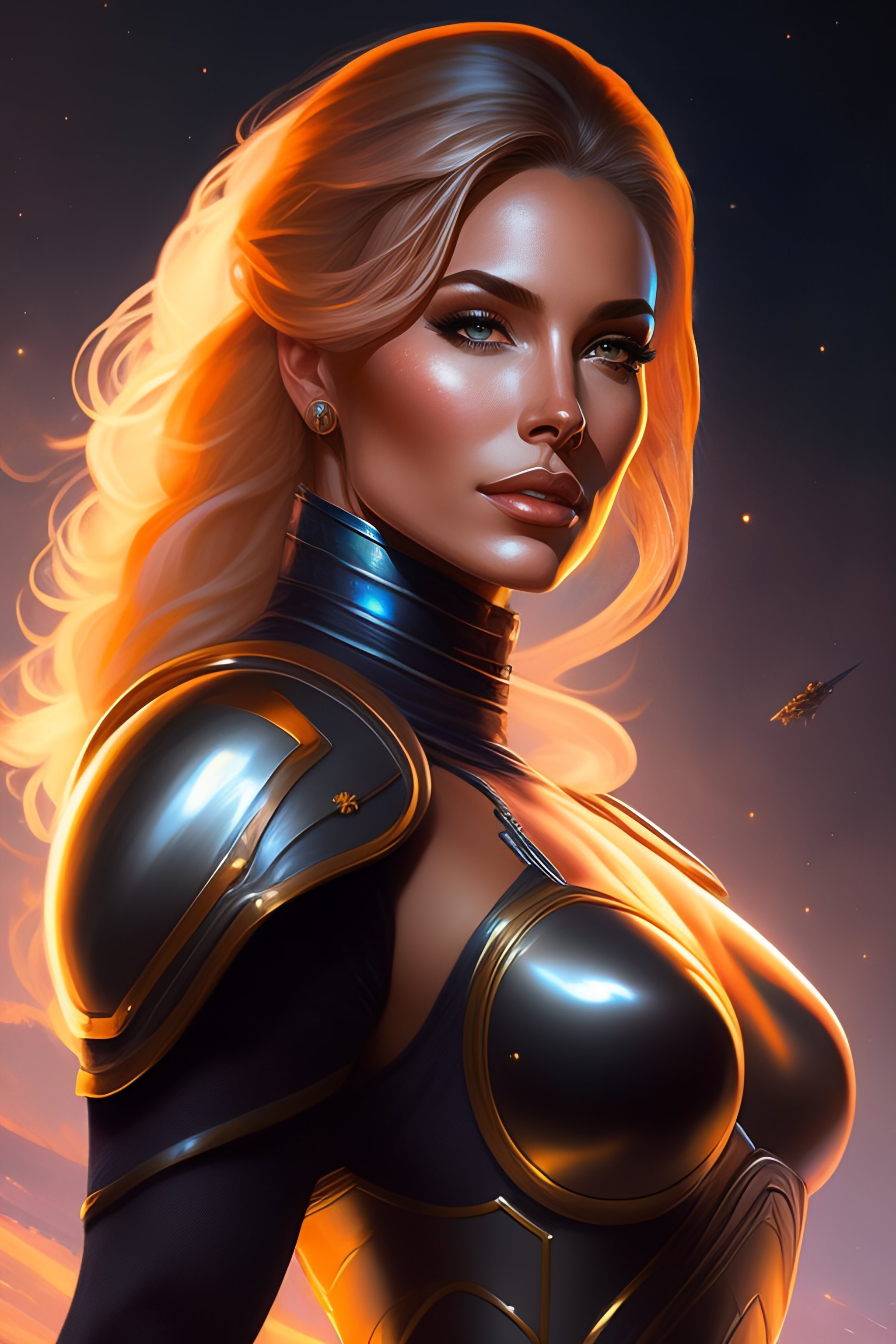 Portrait of a beautiful full body female space captain default pose, d & d, fantasy, front light, intricate, muscular, highly detailed, digital painting, artstation, concept art, smooth, sharp focus, illustration, art by simon bisley and greg rutkowski and alphonse mucha, 8 k, spaceship bridge on background