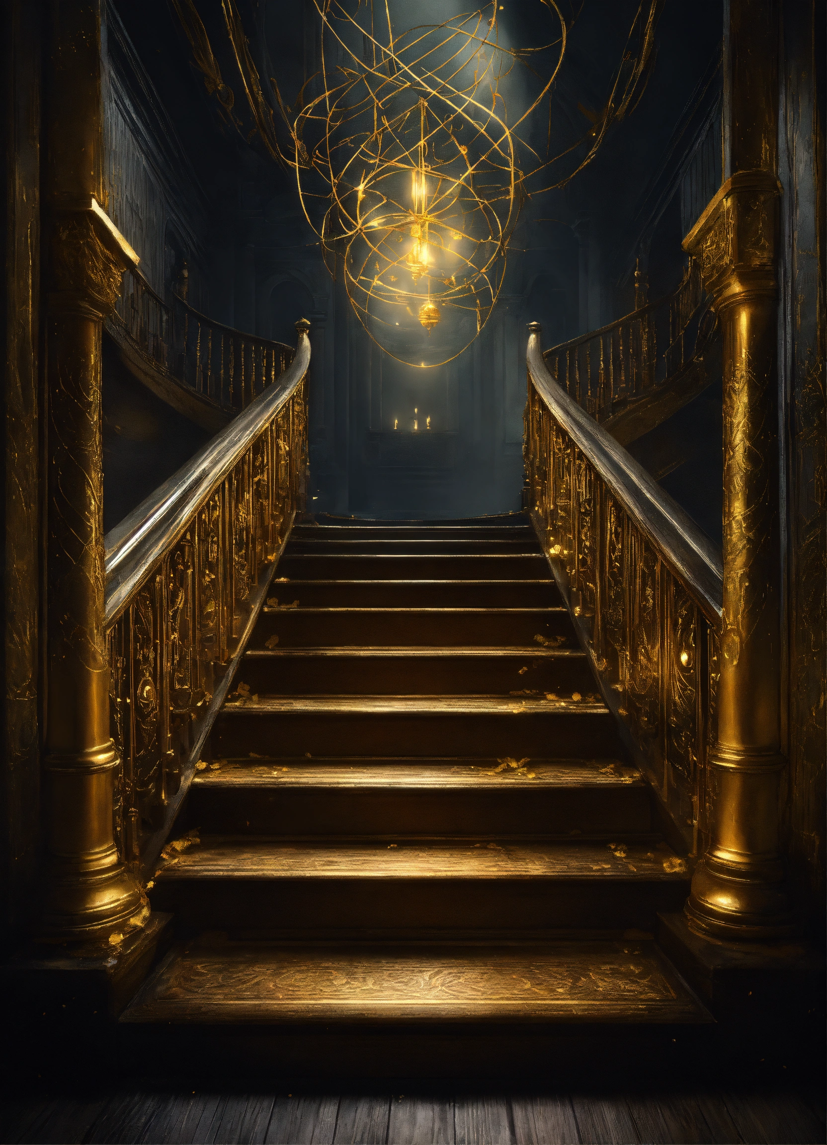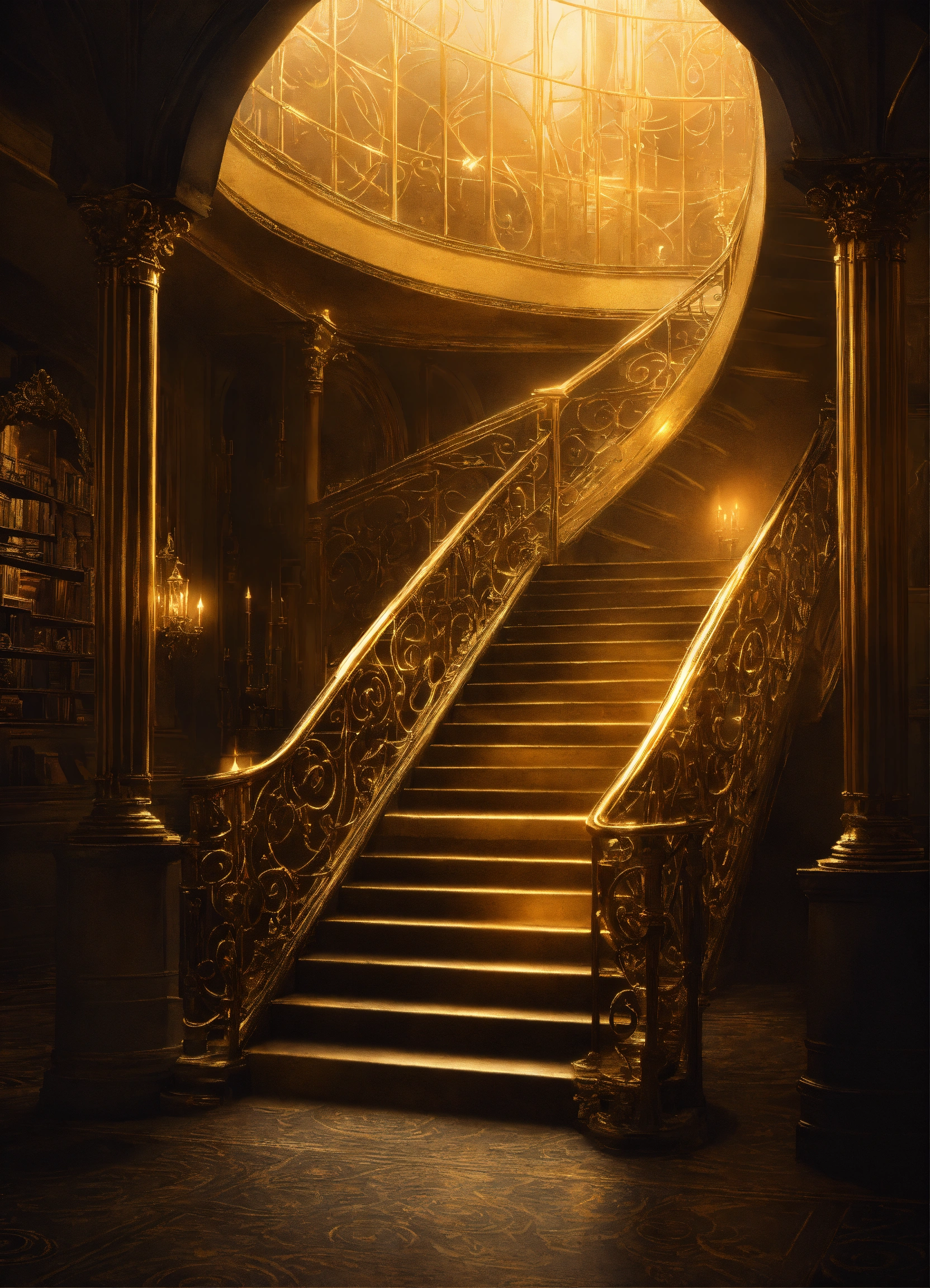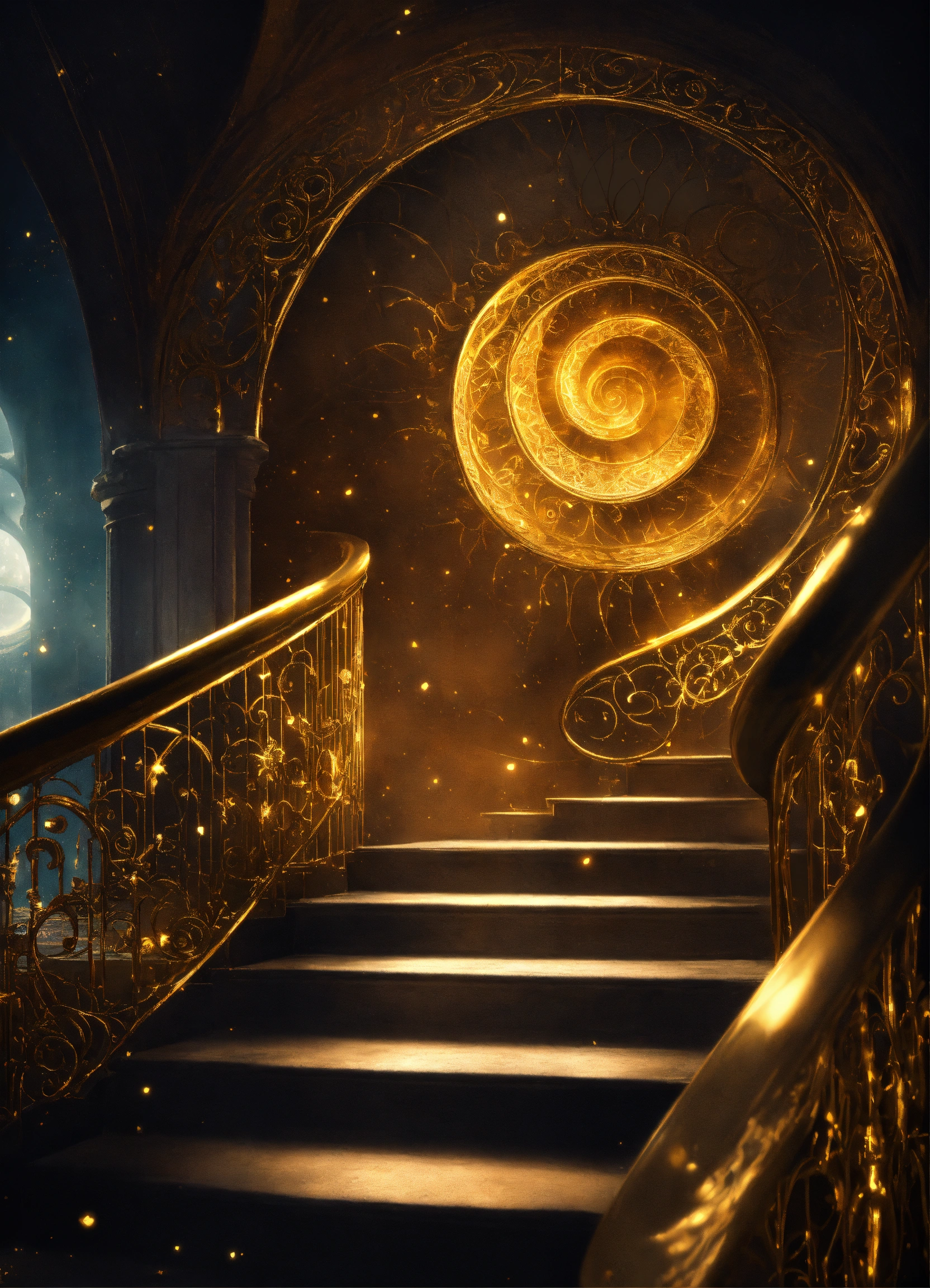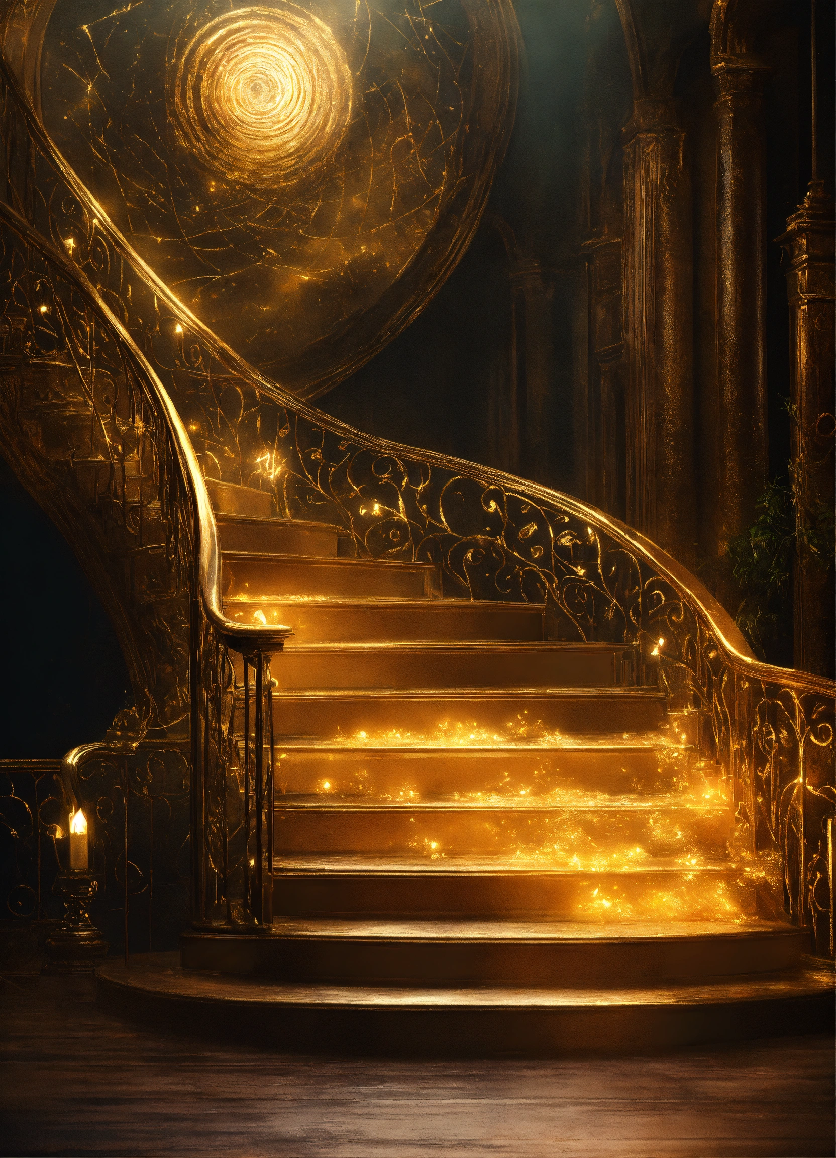 Create a captivating book cover design that conveys the theme of moody, ethereal, mystical. ideally i would like a black background with a golden spiral staircase and/or a golden haze over the staircase. i favor simple, clean lines rather than a highly detailed picture of any of the items.
