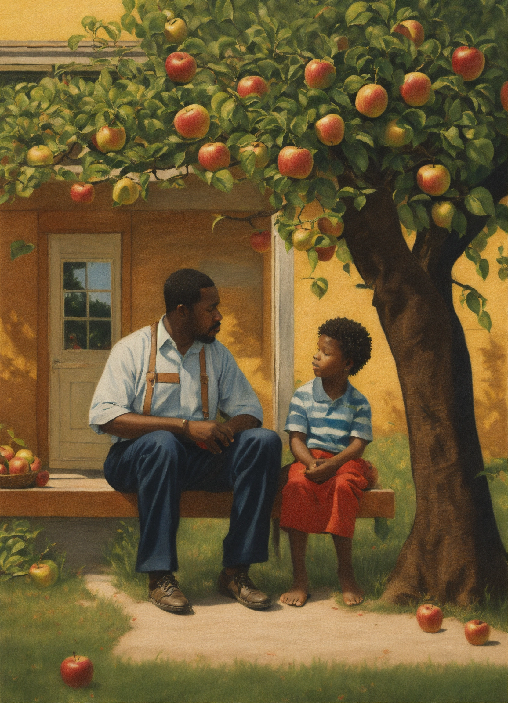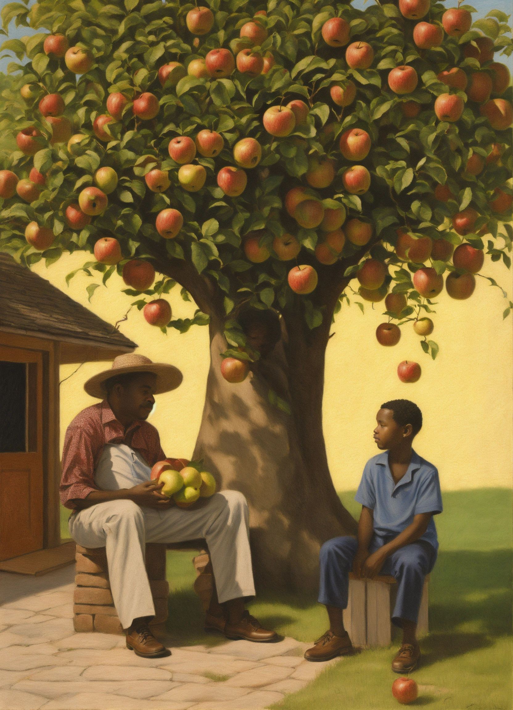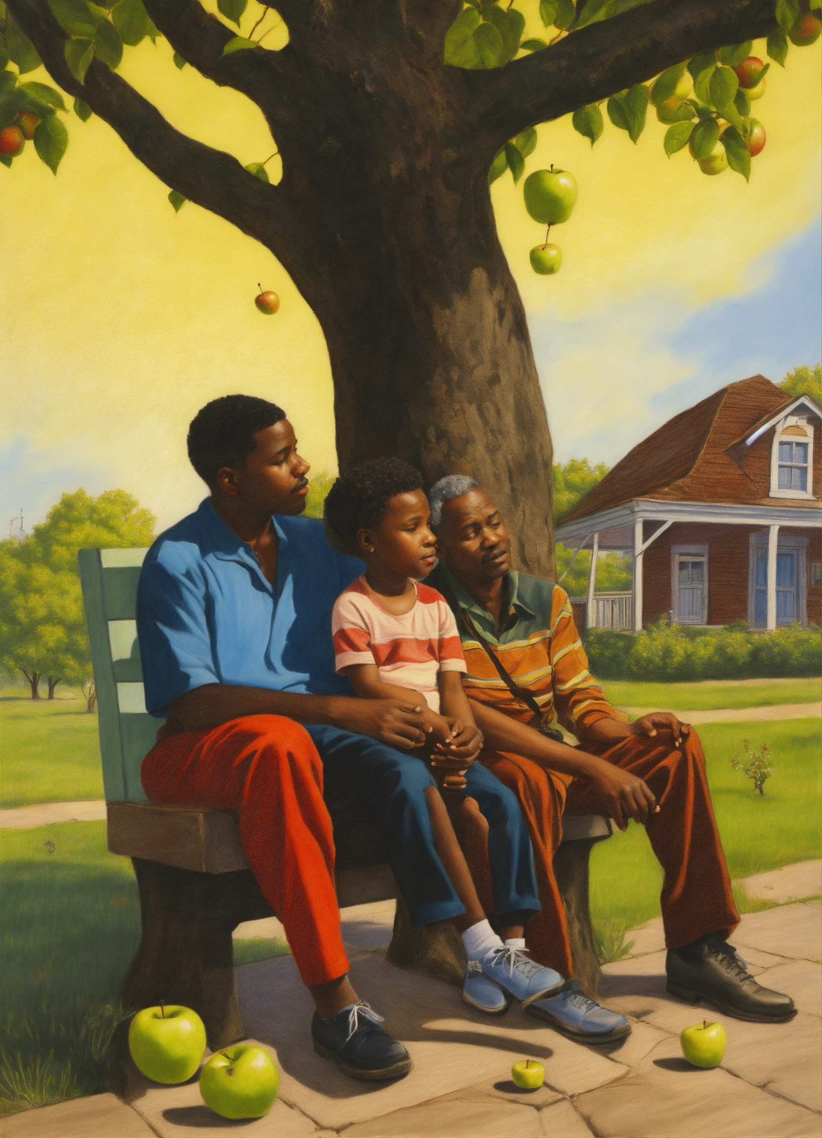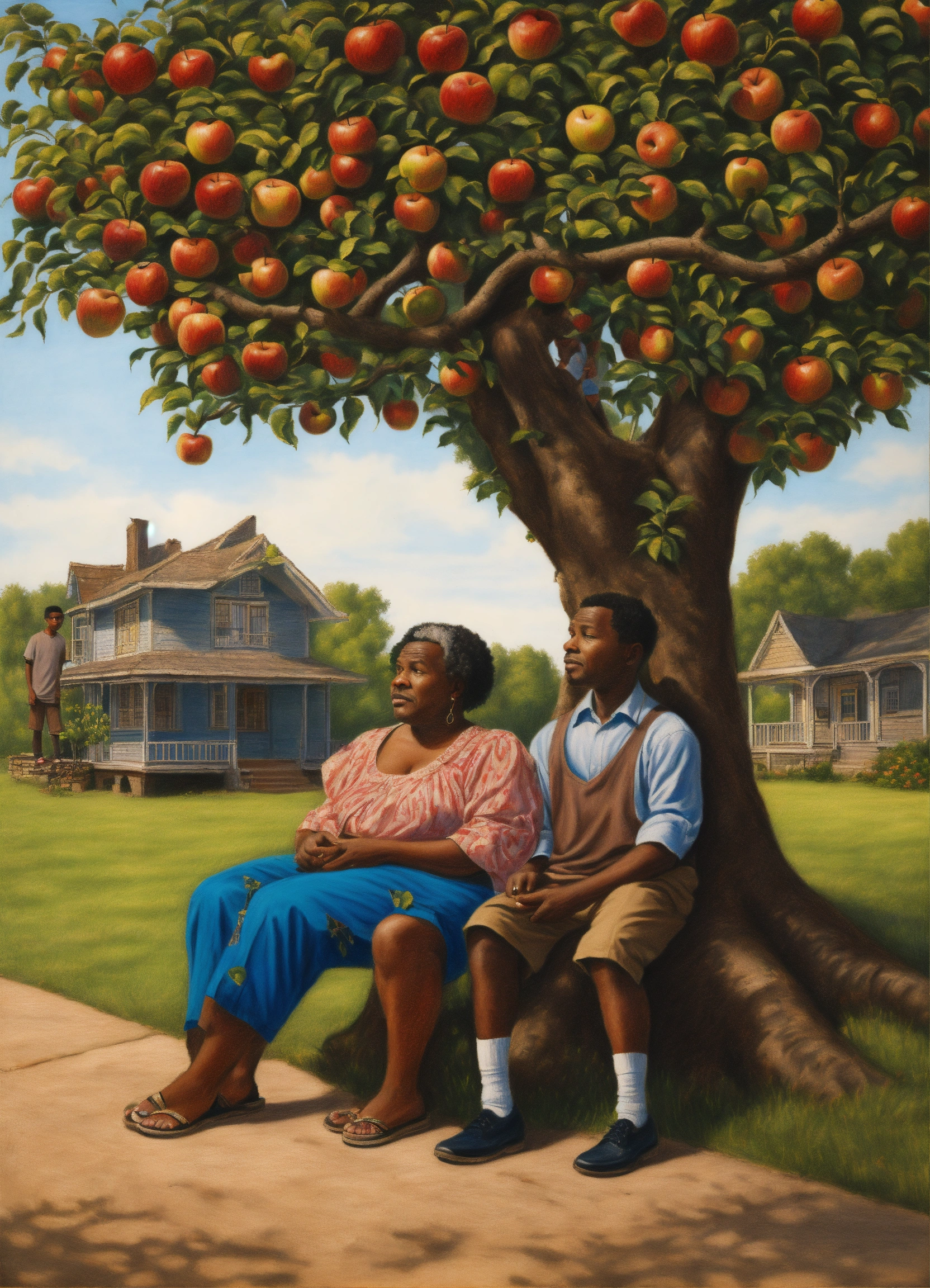 Surrealism drawing. outside, on the porch, a six-year-old black boy sits on a 50 year old black woman's lap. a 25-year old black man stands under an apple tree, and talks to 50 year old man.