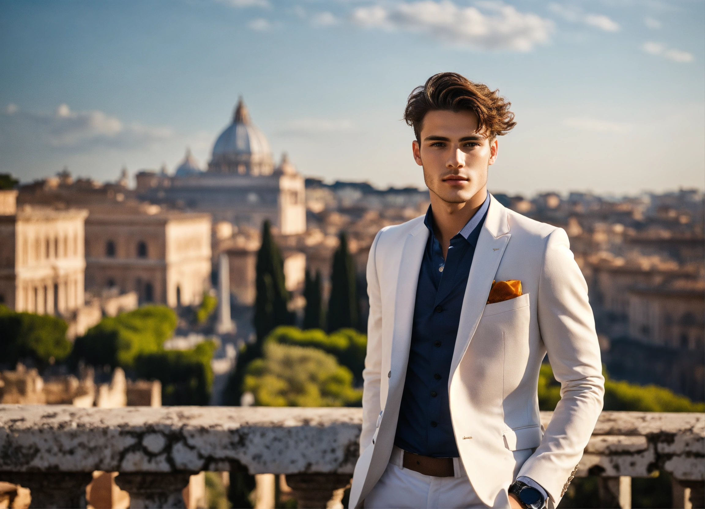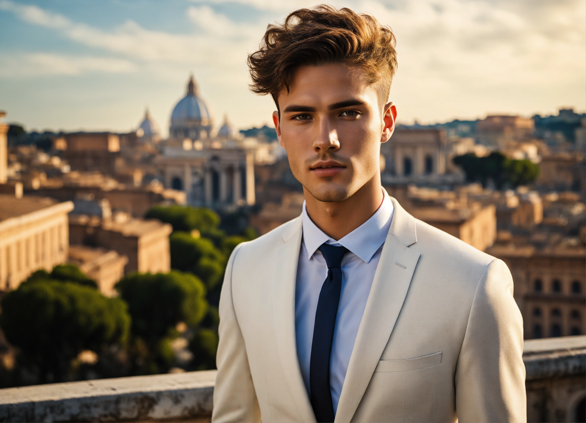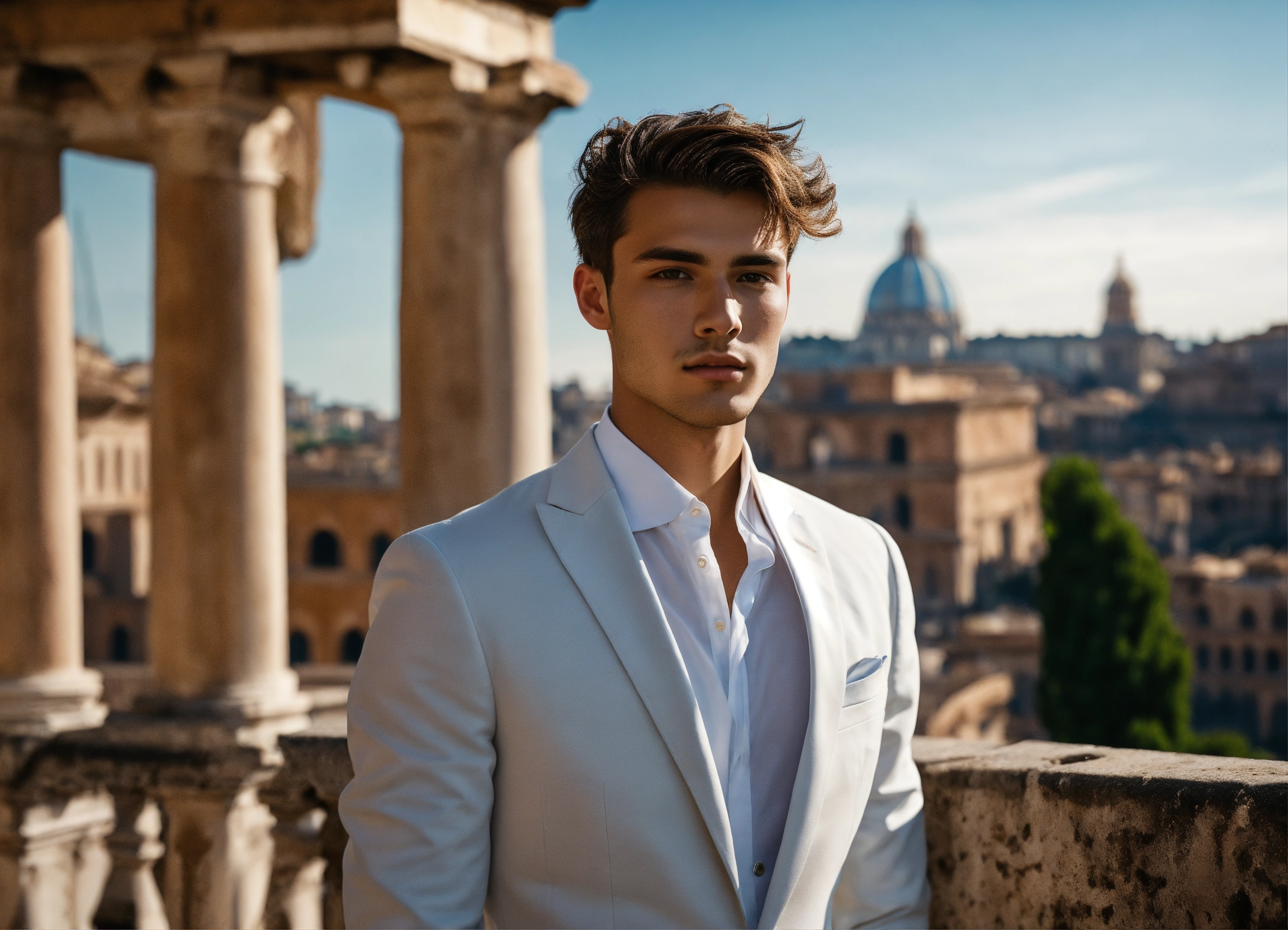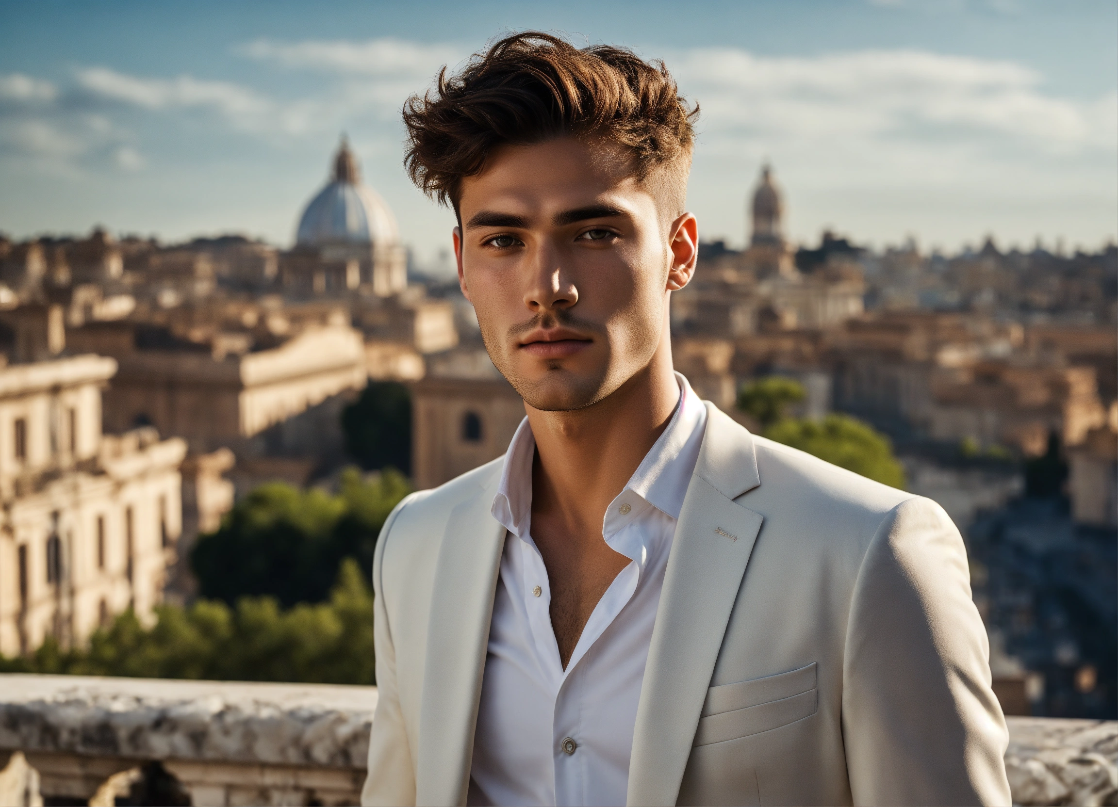 Photo of one young male model in whiteclothes looking to the camera, in front of the skyline of rome of rome, sunny day, not painted, very realistic and detailed faces, skin with pores, 4k, dark suit, skin not smoothed, looking into the camera
