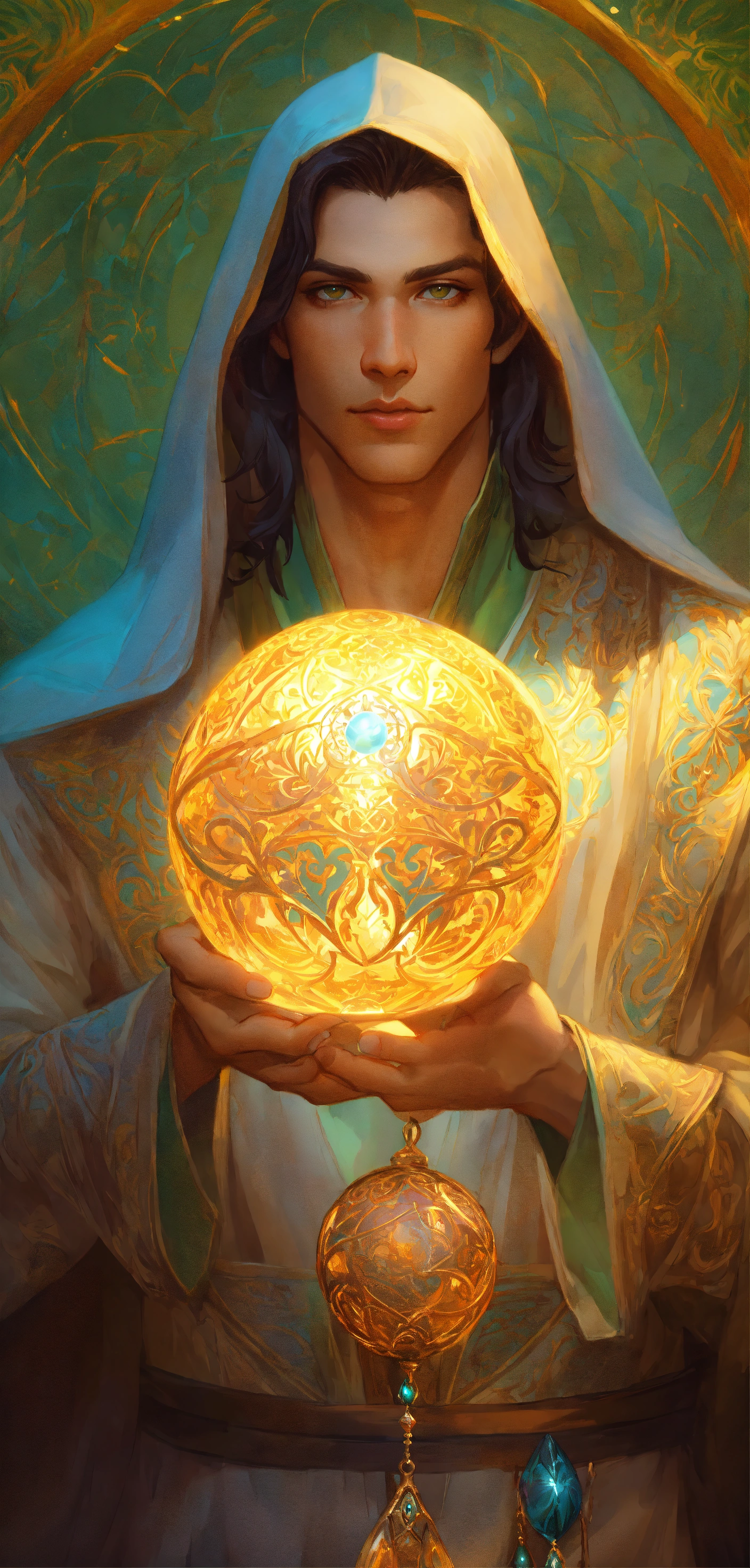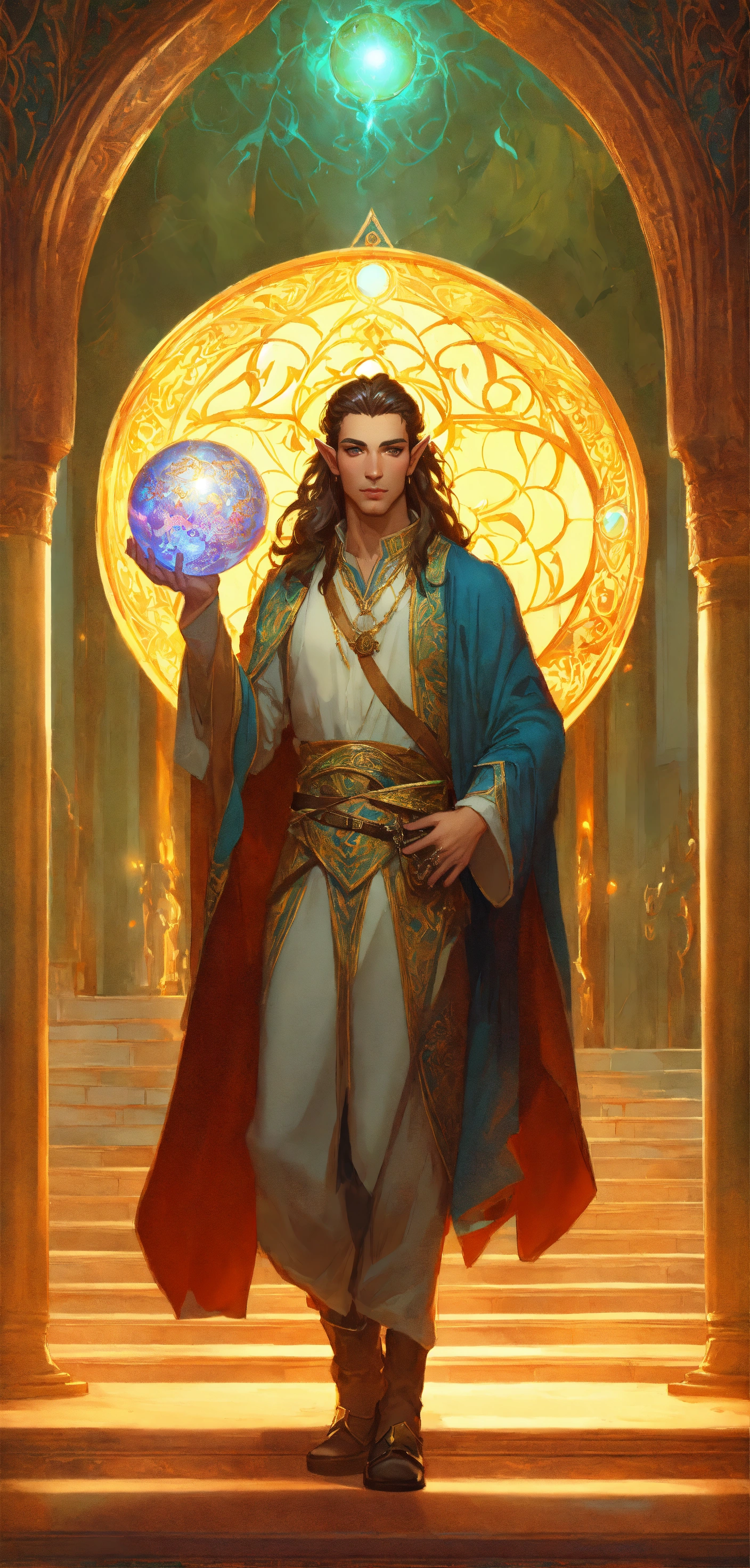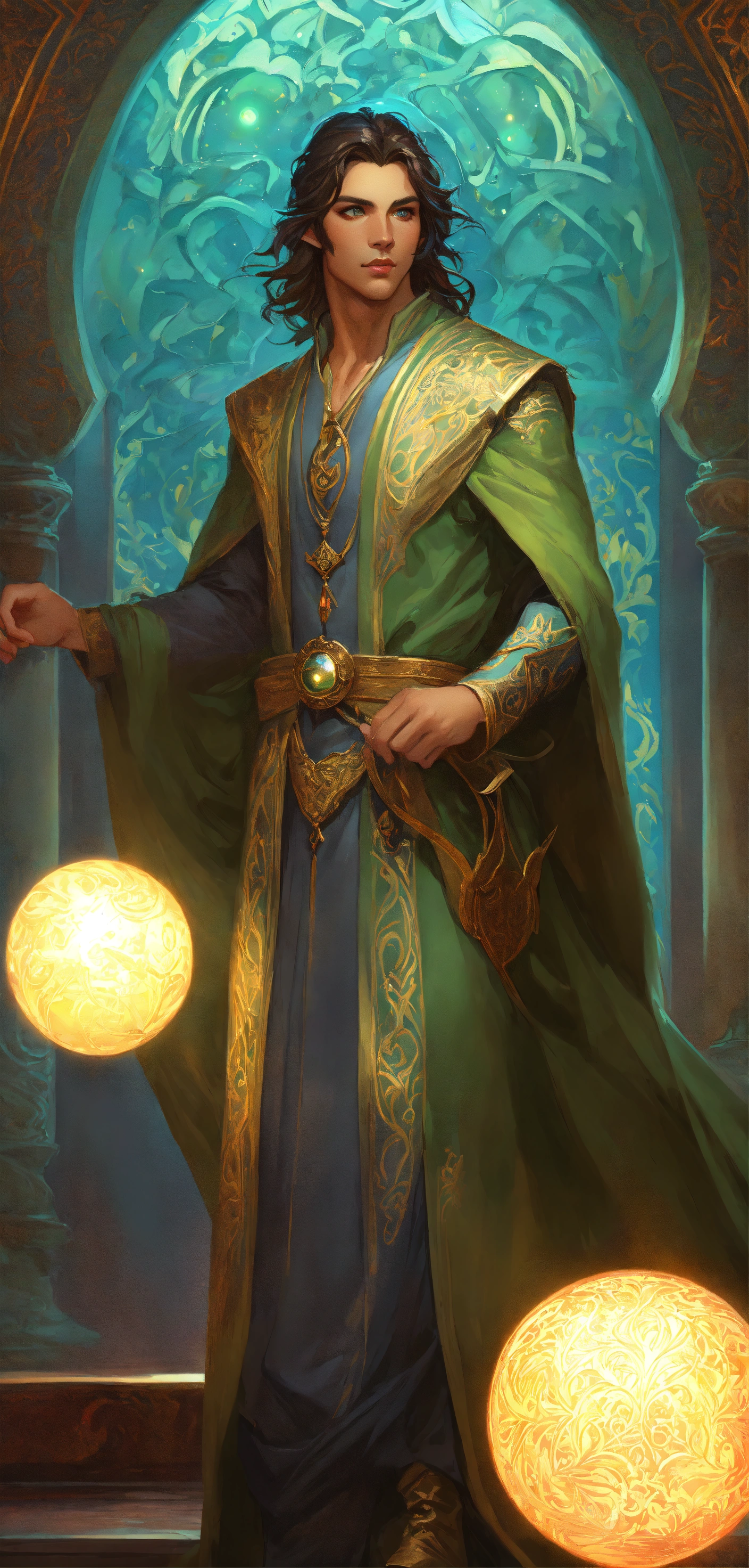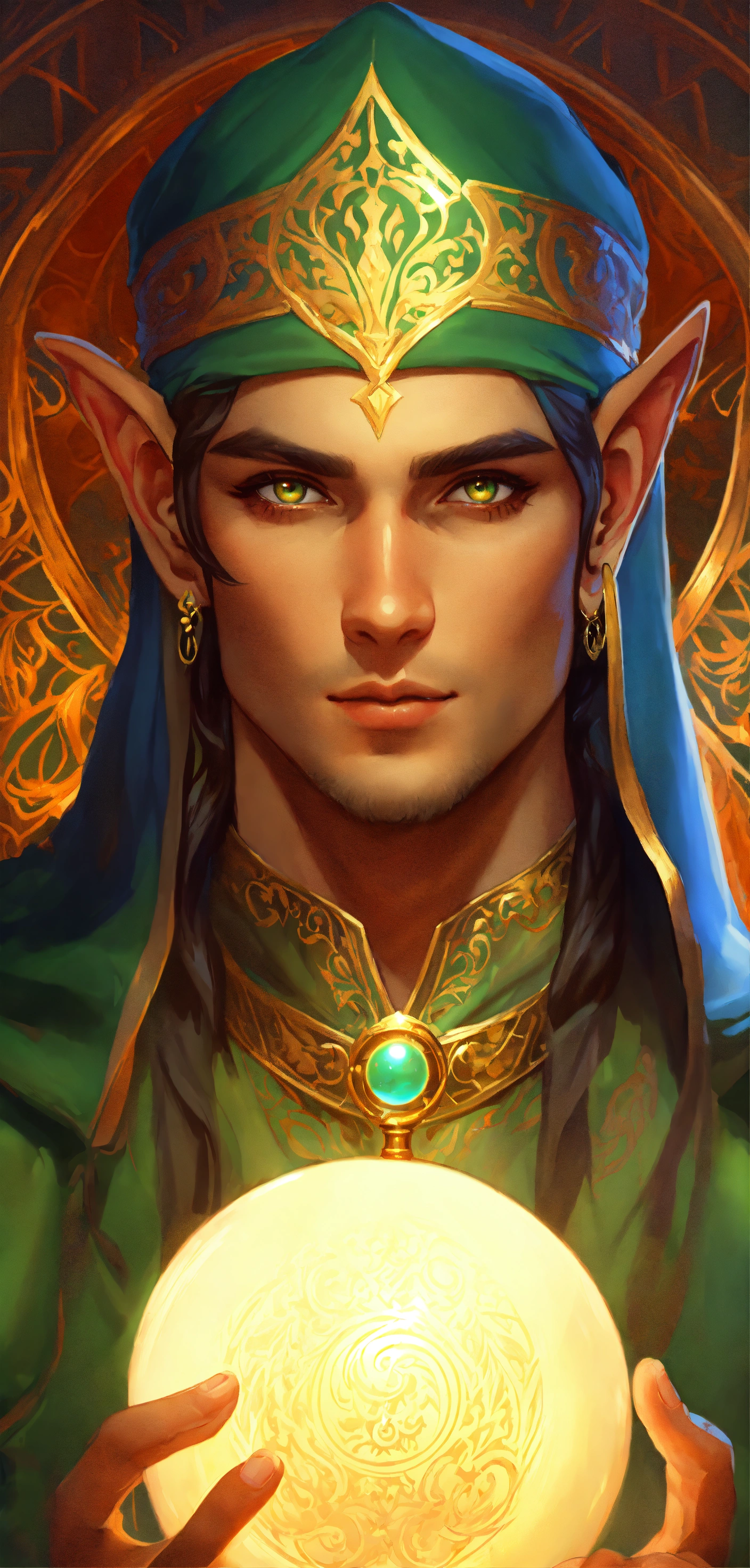 Handsome persian male elf wizard with glowing magical orb, high cheekbones, full body, long hair, hazel green eyes, samarkand background, highly detailed, digital painting, artstation, concept art, smooth, sharp focus, illustration, art by artgerm and greg rutkowski and alphonse mucha, erte, 8 k