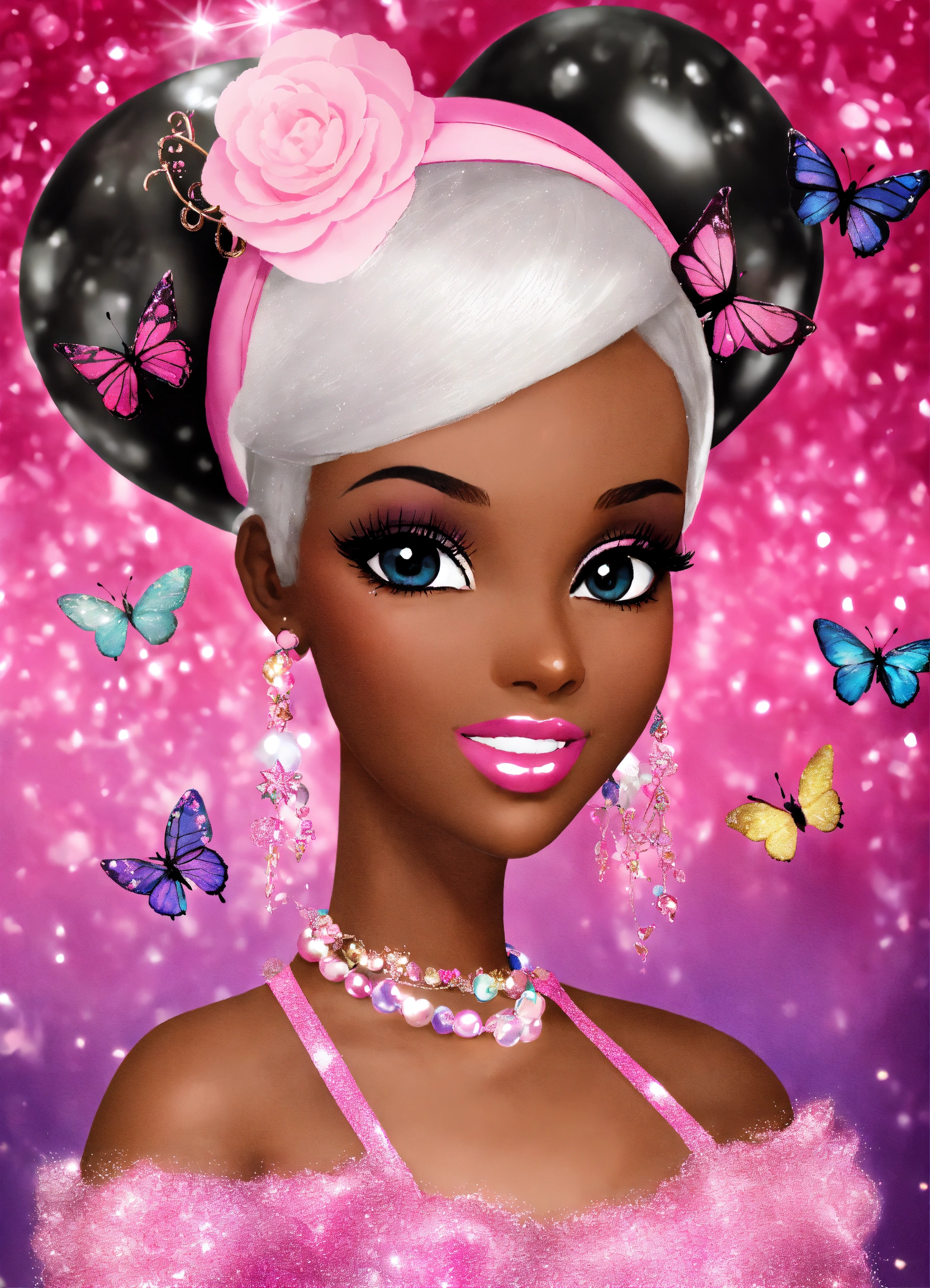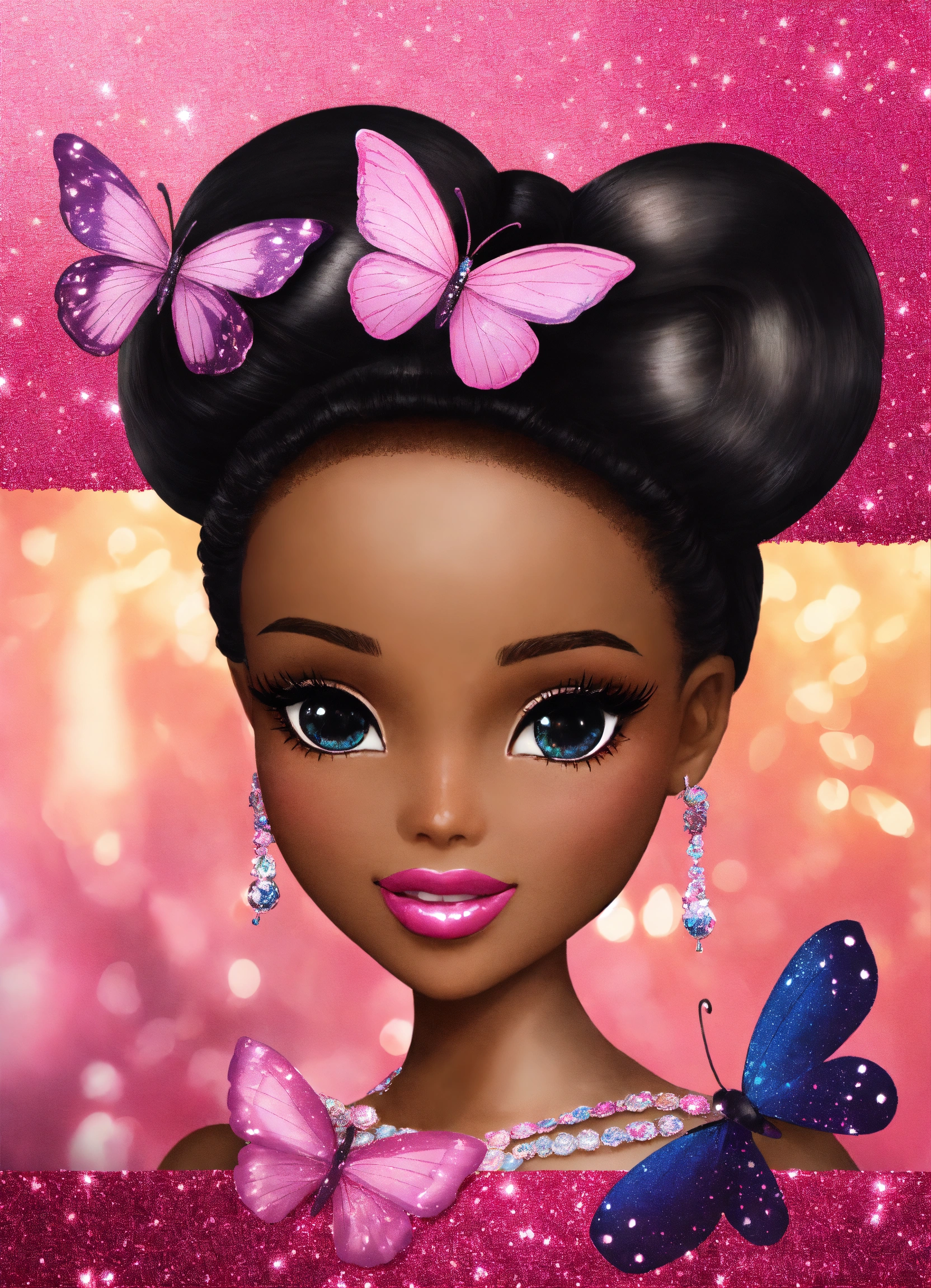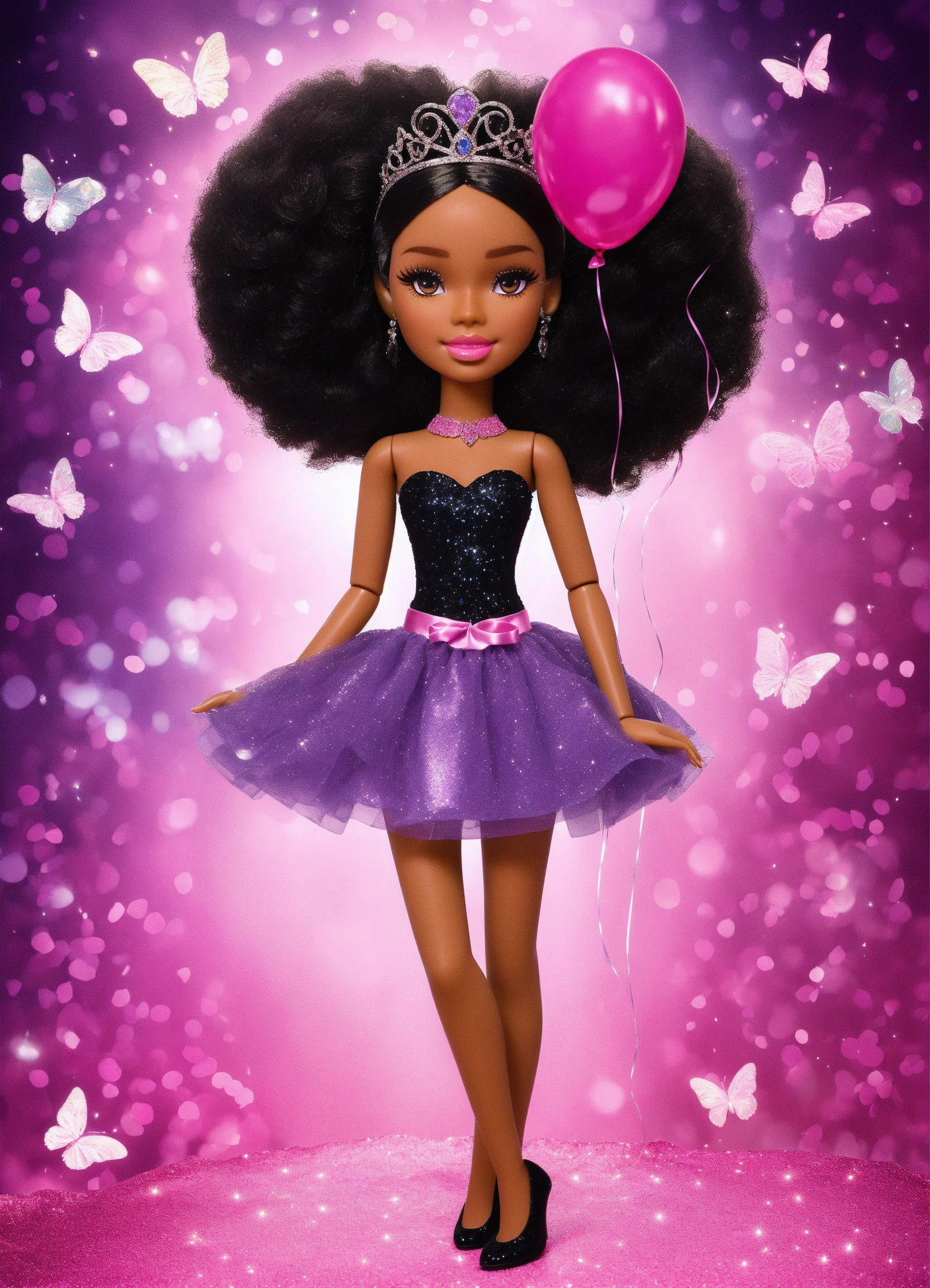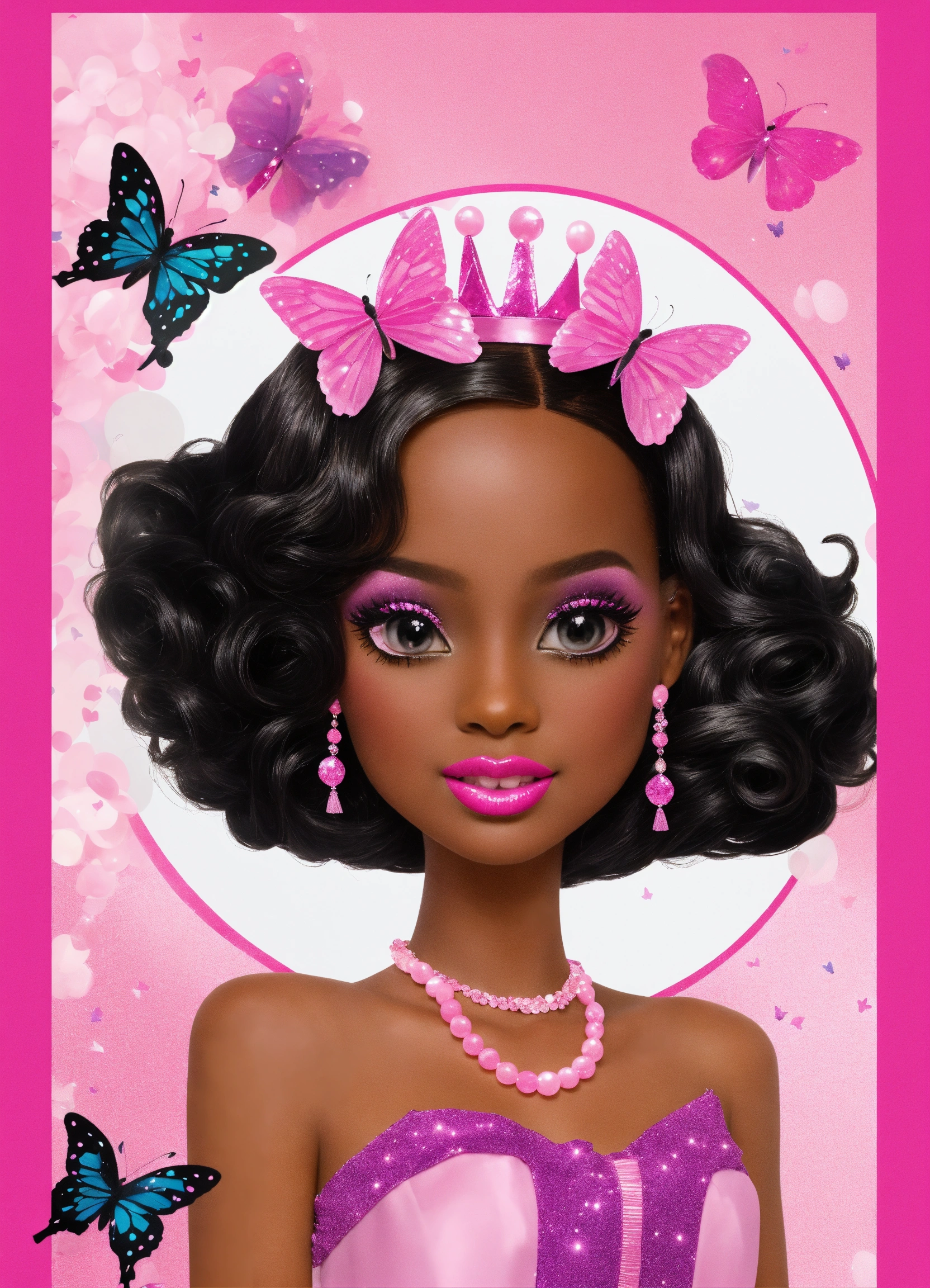 Develop a design concept for a 3-8 year old princess themed birthday party blank invitation inspired by the 'glittery glam barbie birthday bash.' the theme should continue to revolve around a black barbie doll, pink glittery background, elements, and varying shades of pink glitter and purple glitter drip this time, focus on incorporating the idea of a fairytale glam, magical, fantasy, balloons, where black girl barbie is surrounded by pink glittery butterflies, and other enchanting garden-themed decor. the invitation should exude an air of elegance, charm, and whimsy. please ensure the design remains cute, unique, fun, and functional, with an emphasis on creating a visually stunning and unforgettable invitation.