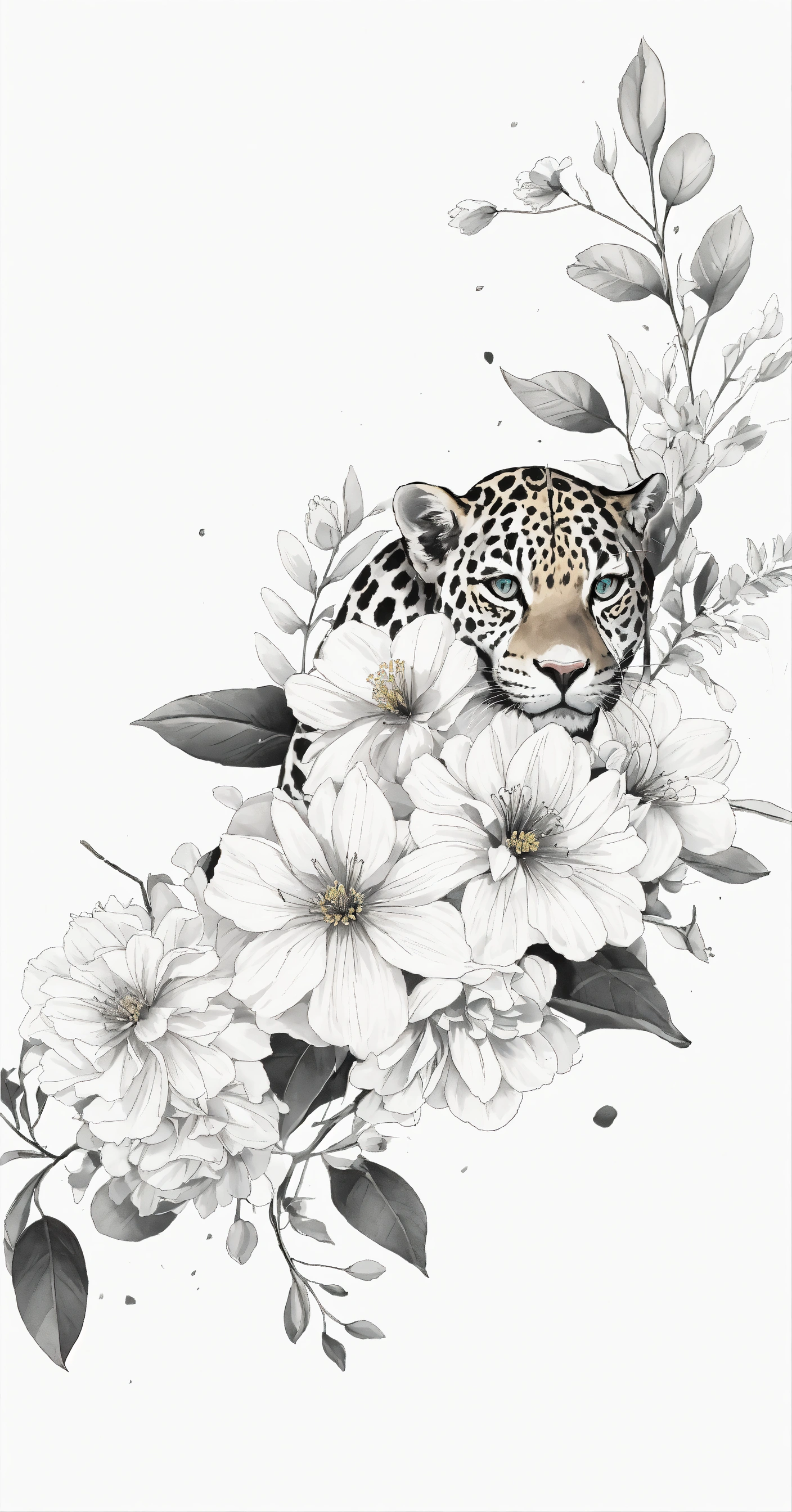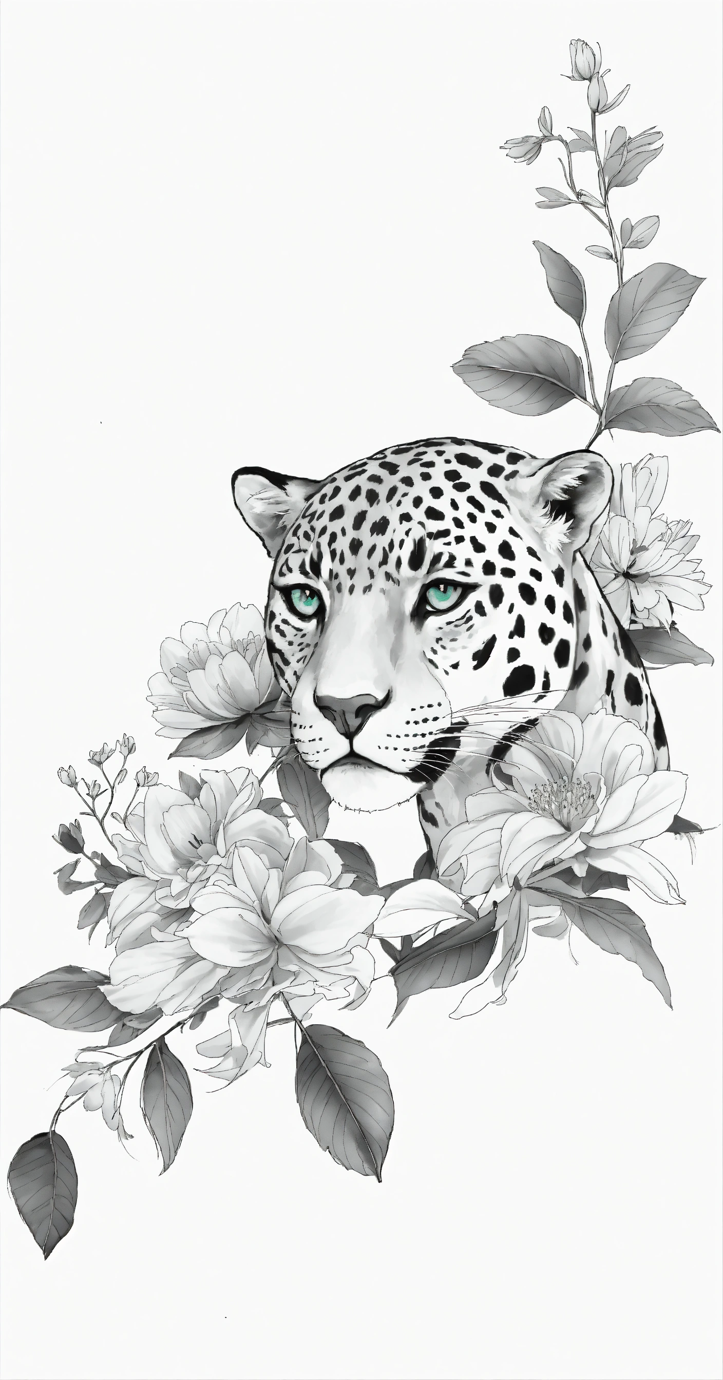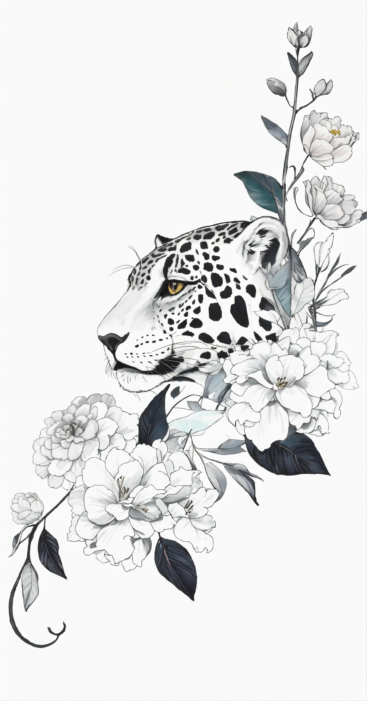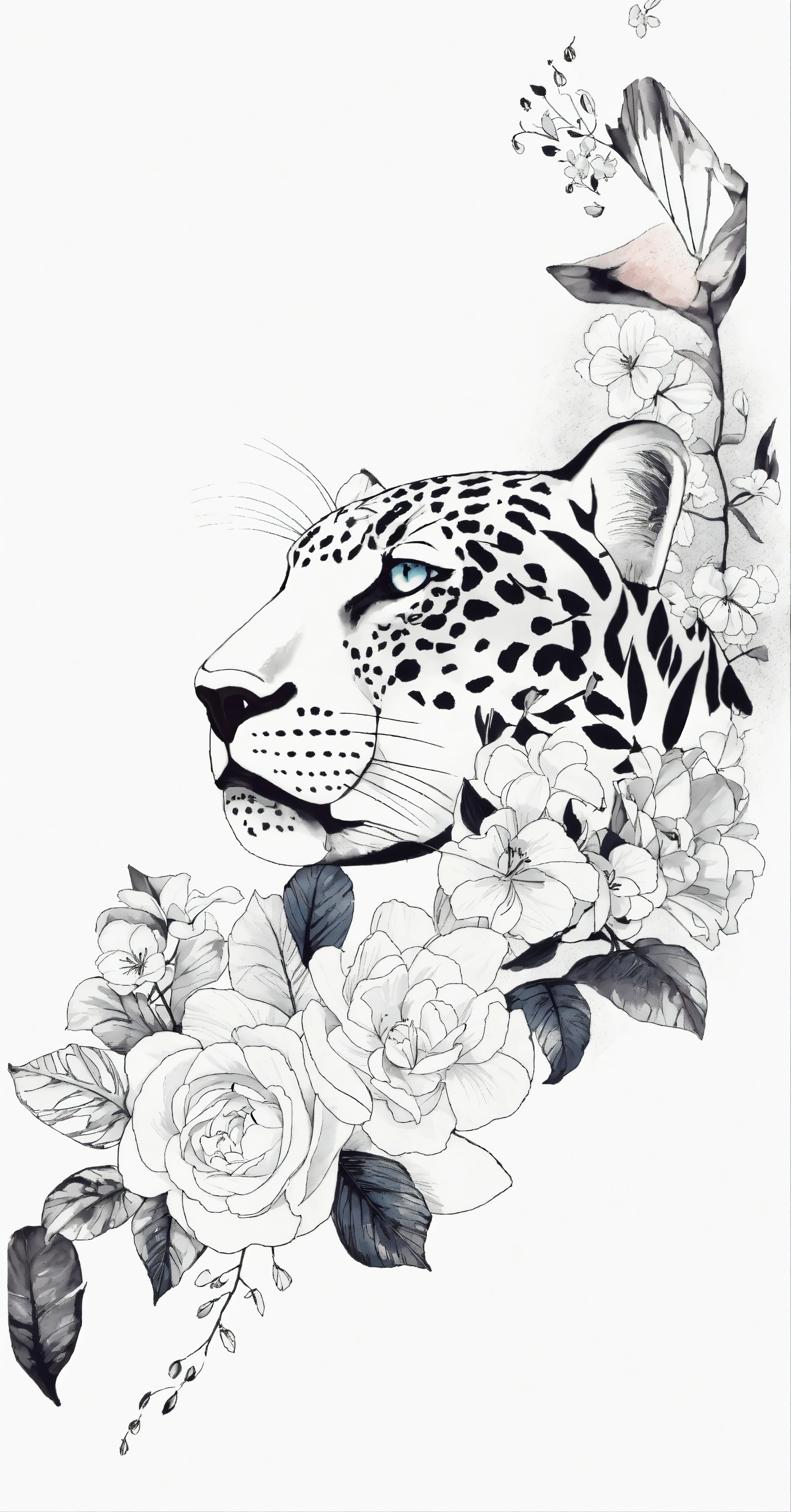 A beautiful jaguar in the background and beautiful flowers in the front, tattoo on the side of the female leg